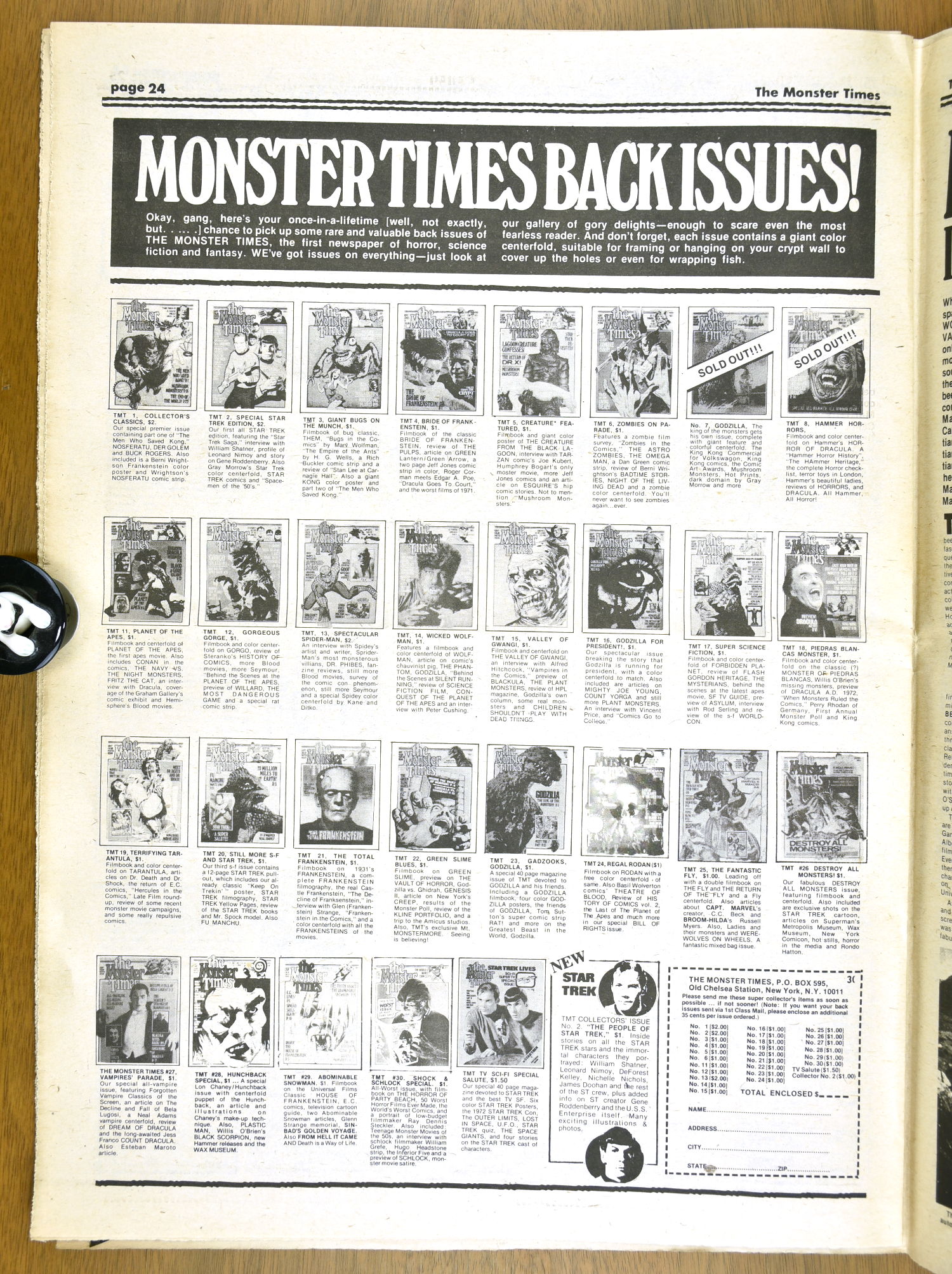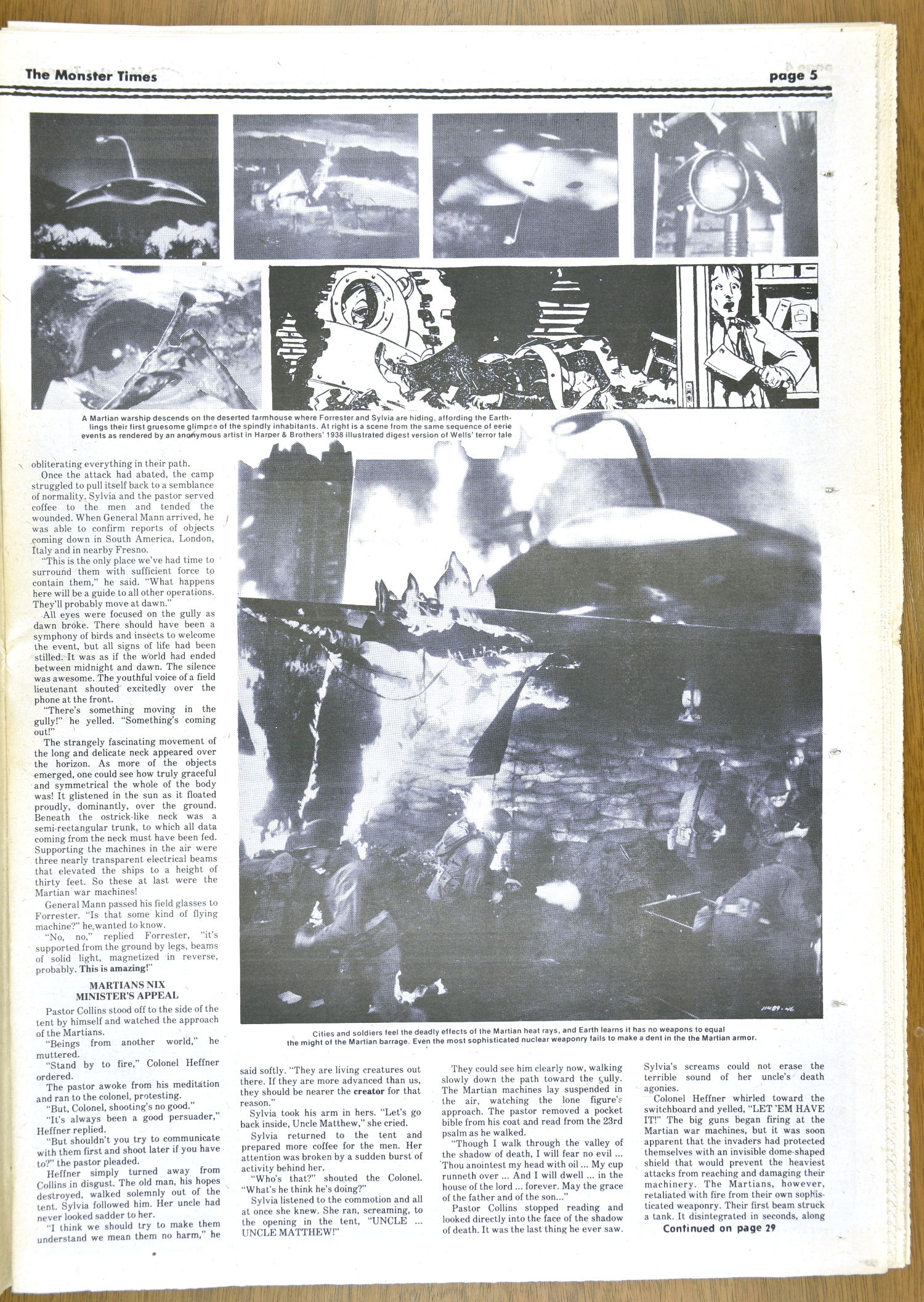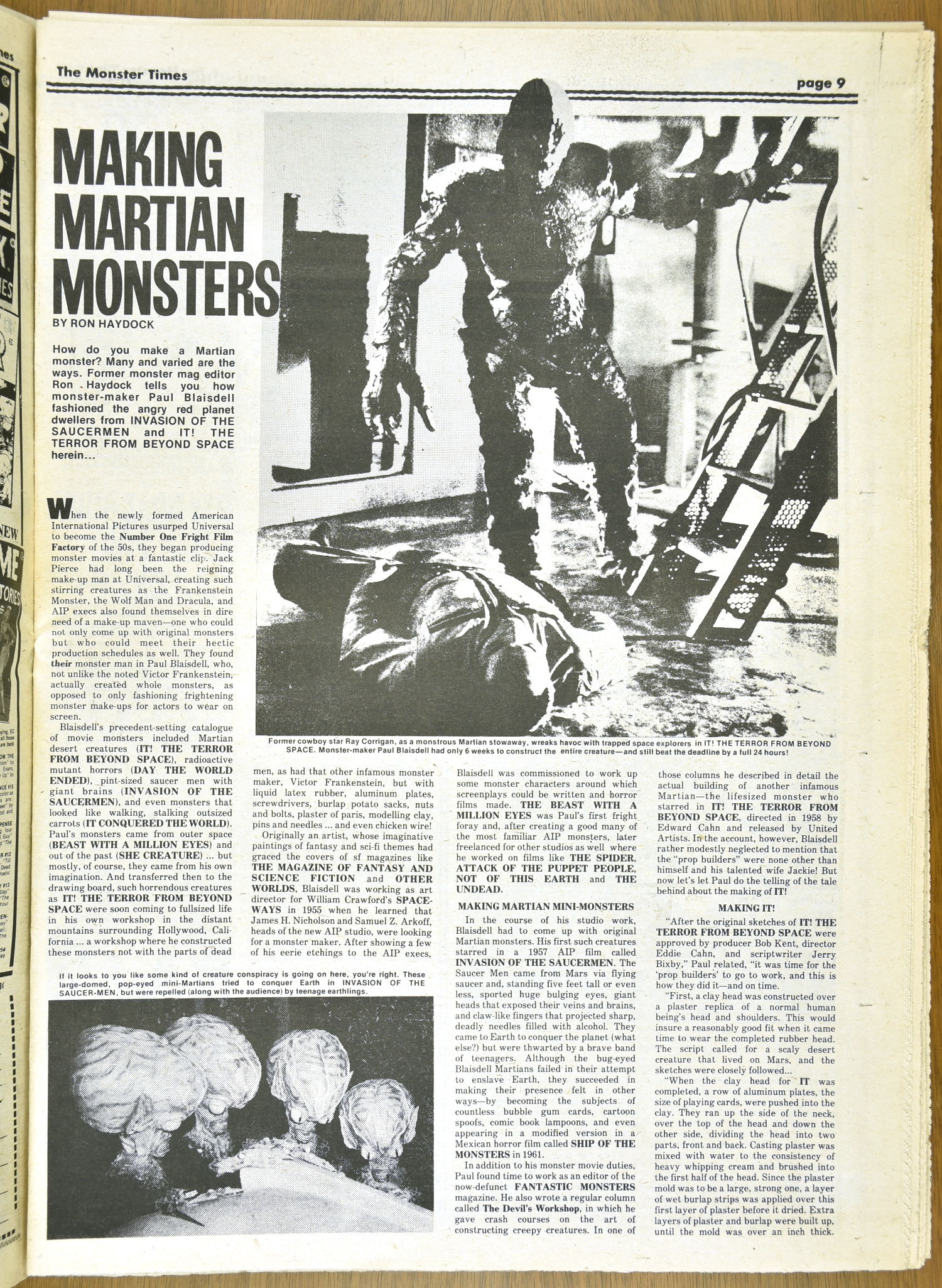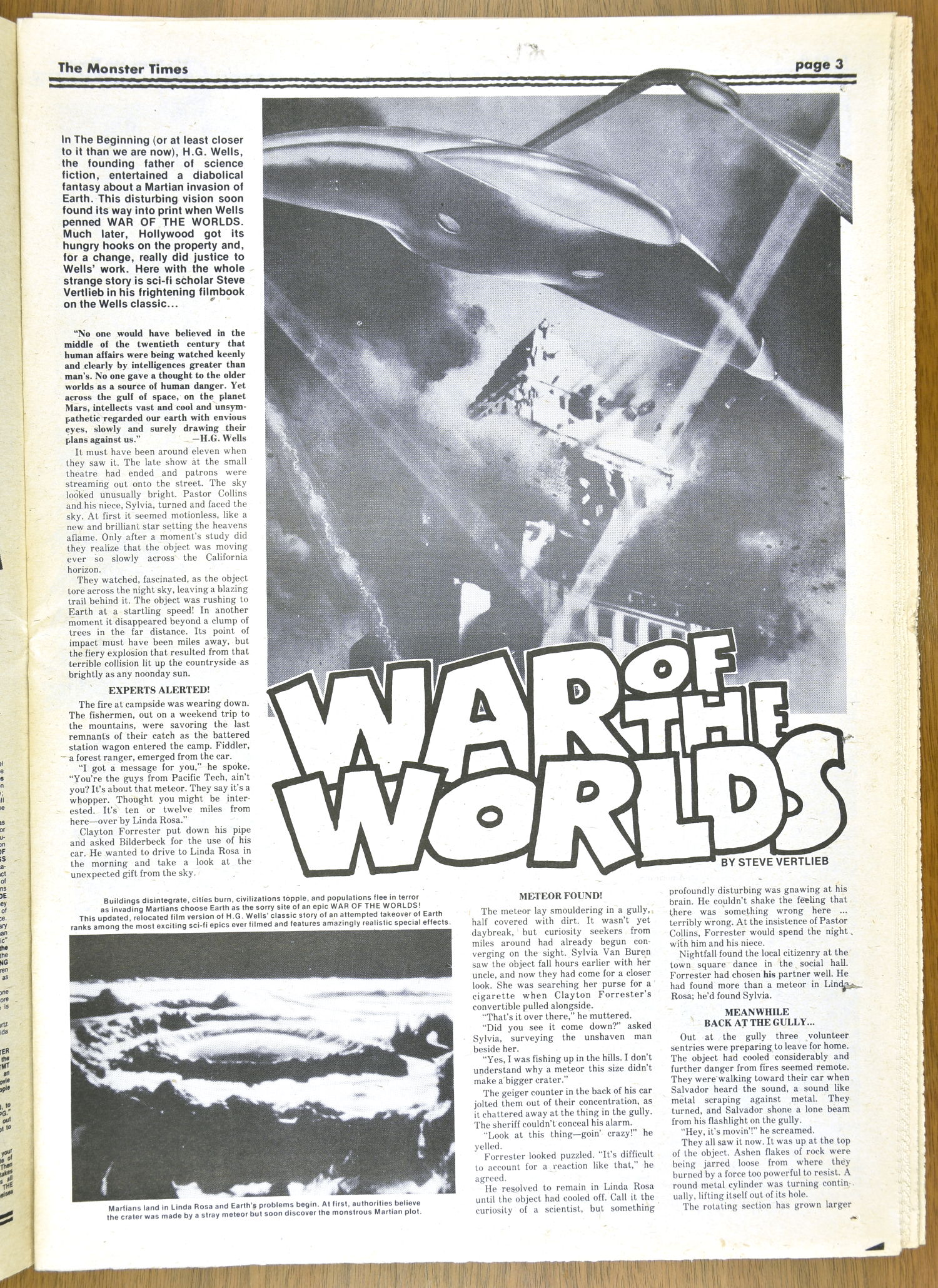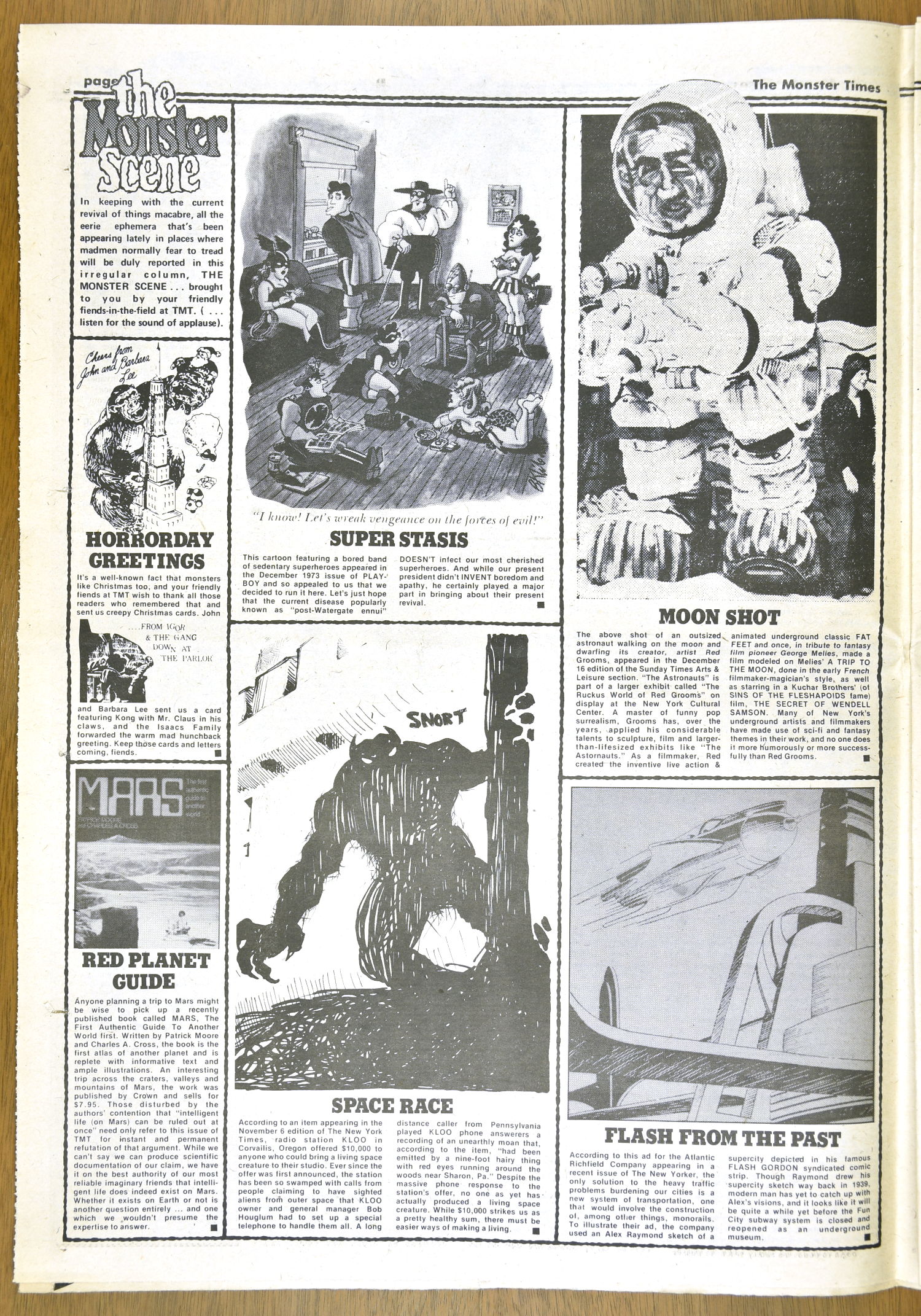 Martians invade this issue of The Monster Times. With an interview with Ray Bradbury, Martian movies covered, Orson Welles terrifying radio version of War of the Worlds, and Martians in the Movies as well as Martians in the Comics, you'll go out of this world.