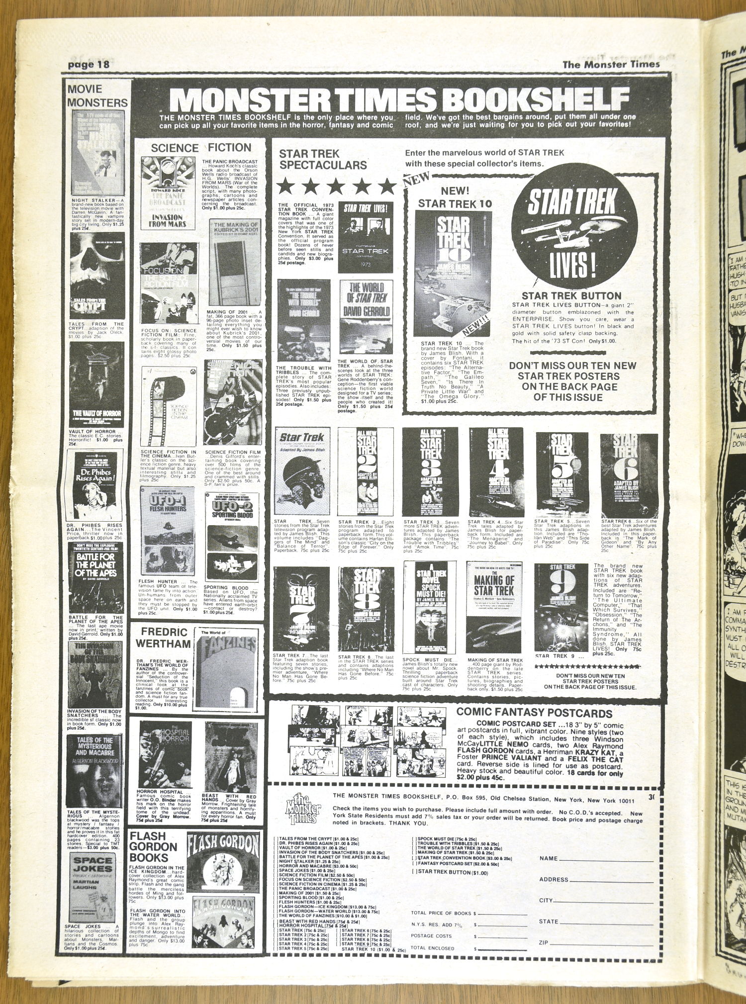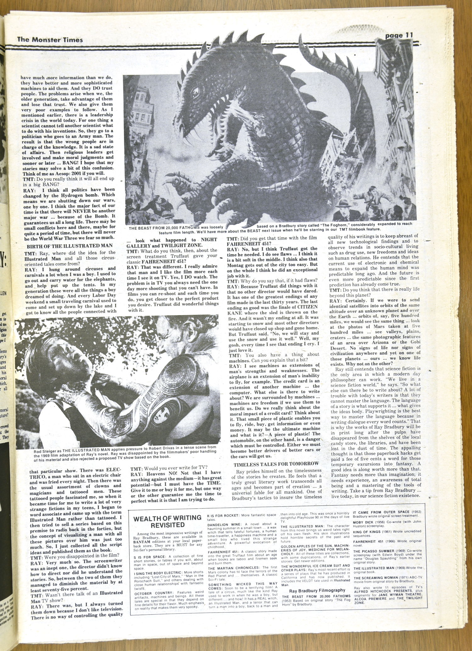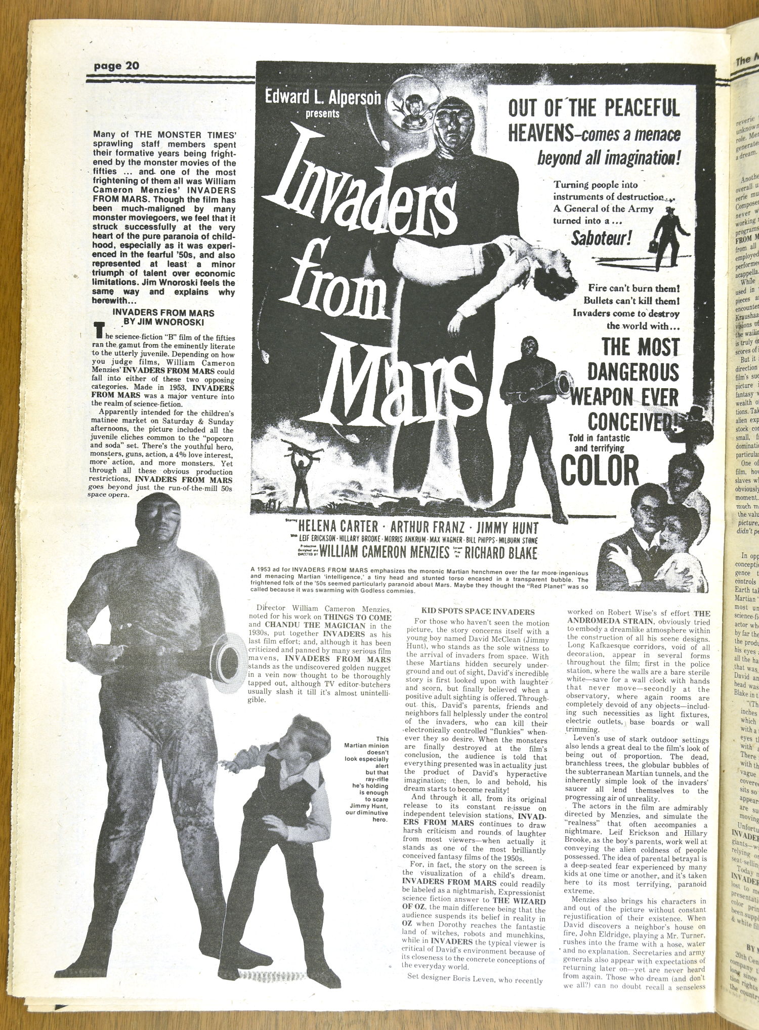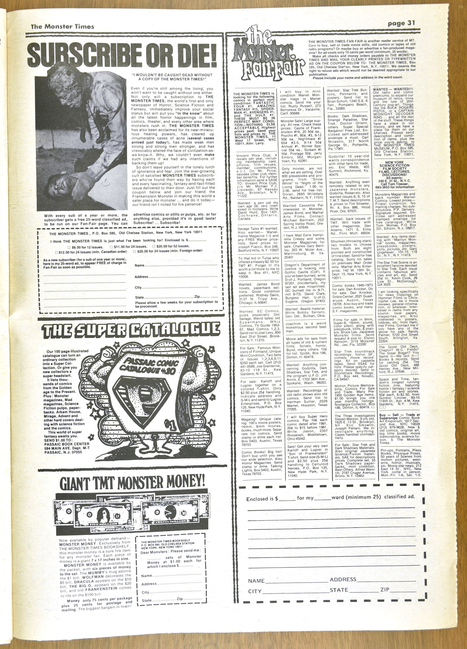 Martians invade this issue of The Monster Times. With an interview with Ray Bradbury, Martian movies covered, Orson Welles terrifying radio version of War of the Worlds, and Martians in the Movies as well as Martians in the Comics, you'll go out of this world.