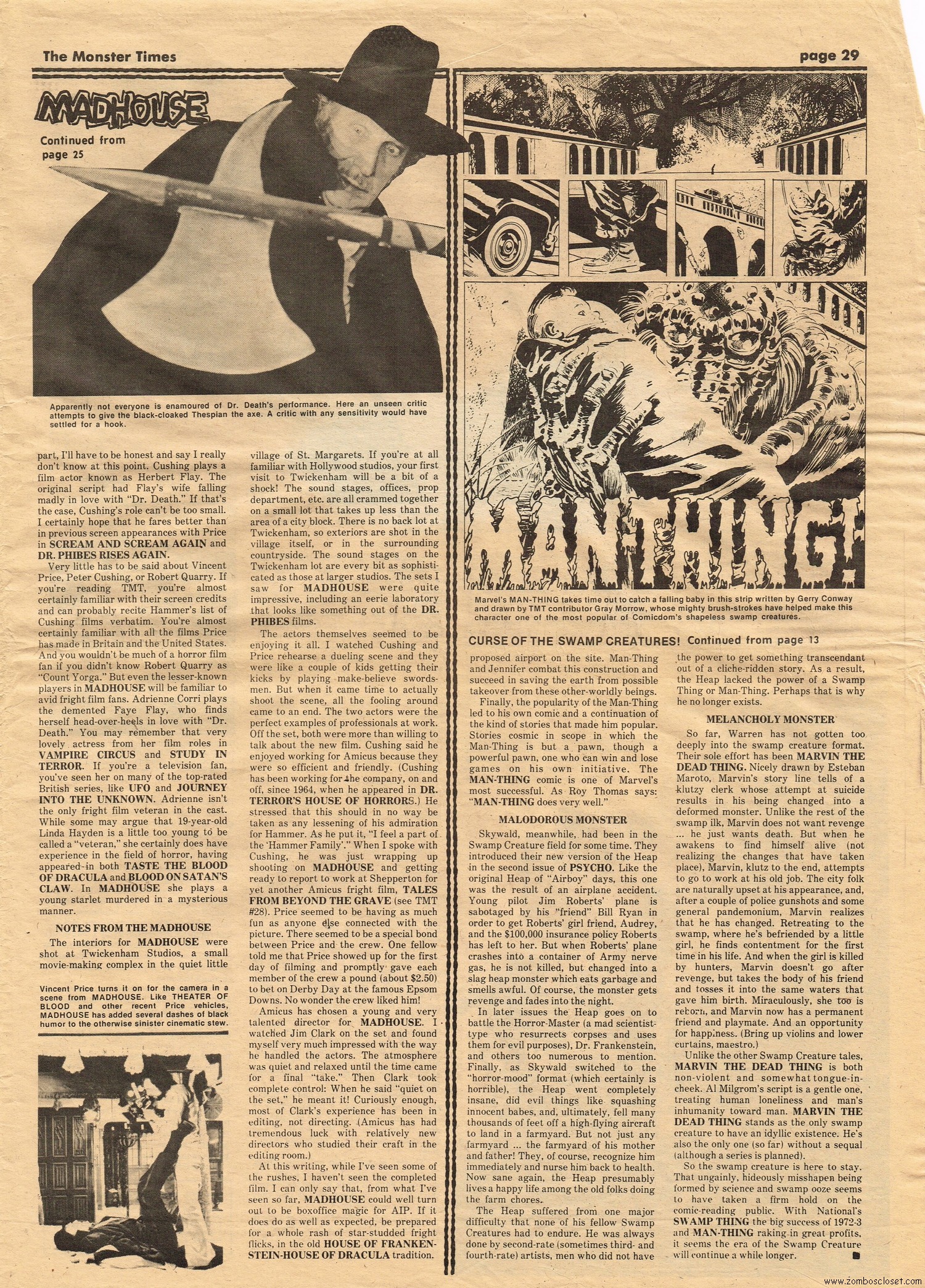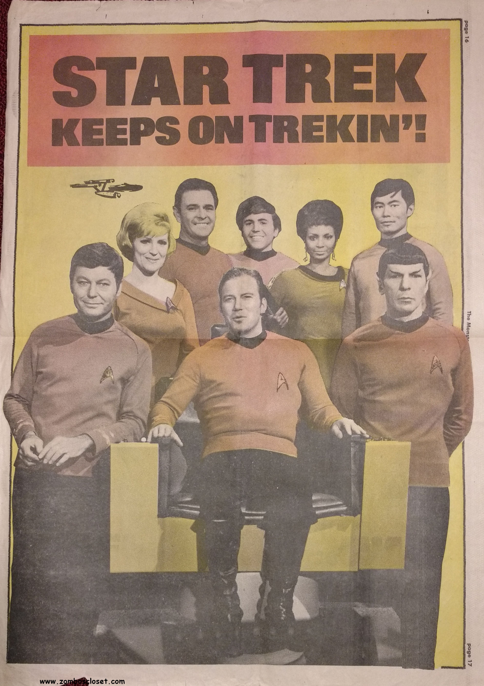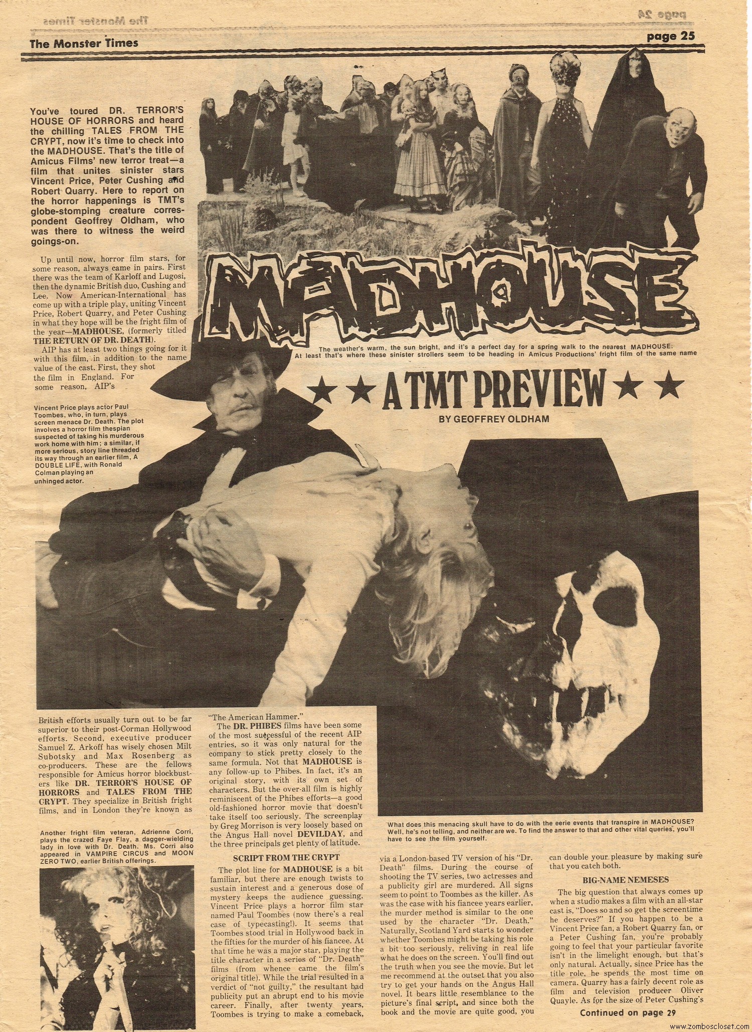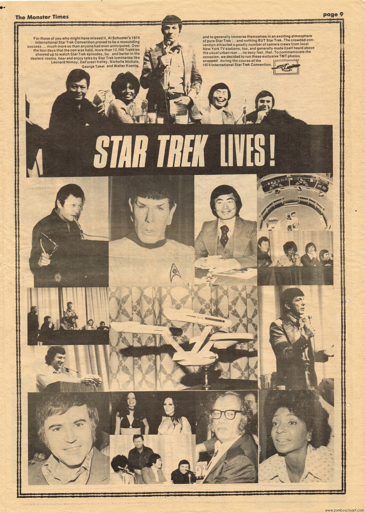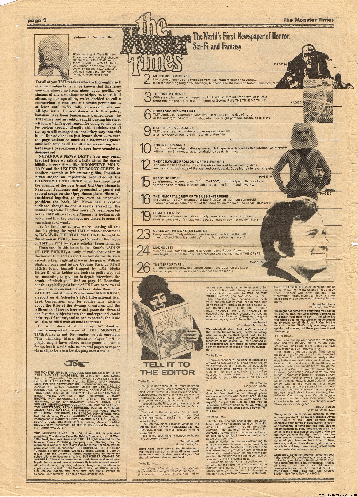 The Time Machine kicks off issue 34 of The Monster Times, with It Came From Out of the Underground (comix, that is), and Star Trek Lives! By 1979, Star Trek fandom would get their fix with Star Trek the Motion Picture (well, okay, sort of), and more ST to follow on the big screen. William Shatner also gives TMT a lengthy interview, too. Doug Murray pours over the slimy monsters to be found in comics, and a pondering over Zardoz ponders some more. Ladies of Fright explores female terrors in film beginning with Freaks, but of course needs to be added to by now, and a preview of Madhouse with Vincent Price is tossed in for good measure. Of special nostalgic and historical interest, you’ll find on page 27, a half-page rundown on all the cool happenings planned for the 1974 New York Comic Art Convention, where fans mingled with the greats. Sadly, I didn’t take pictures when I attended–I know, how stupid of me! But I was there, although my memories are more foggy than clear about the whole thing, but I swear, I wasn’t doing drugs. I wasn’t!