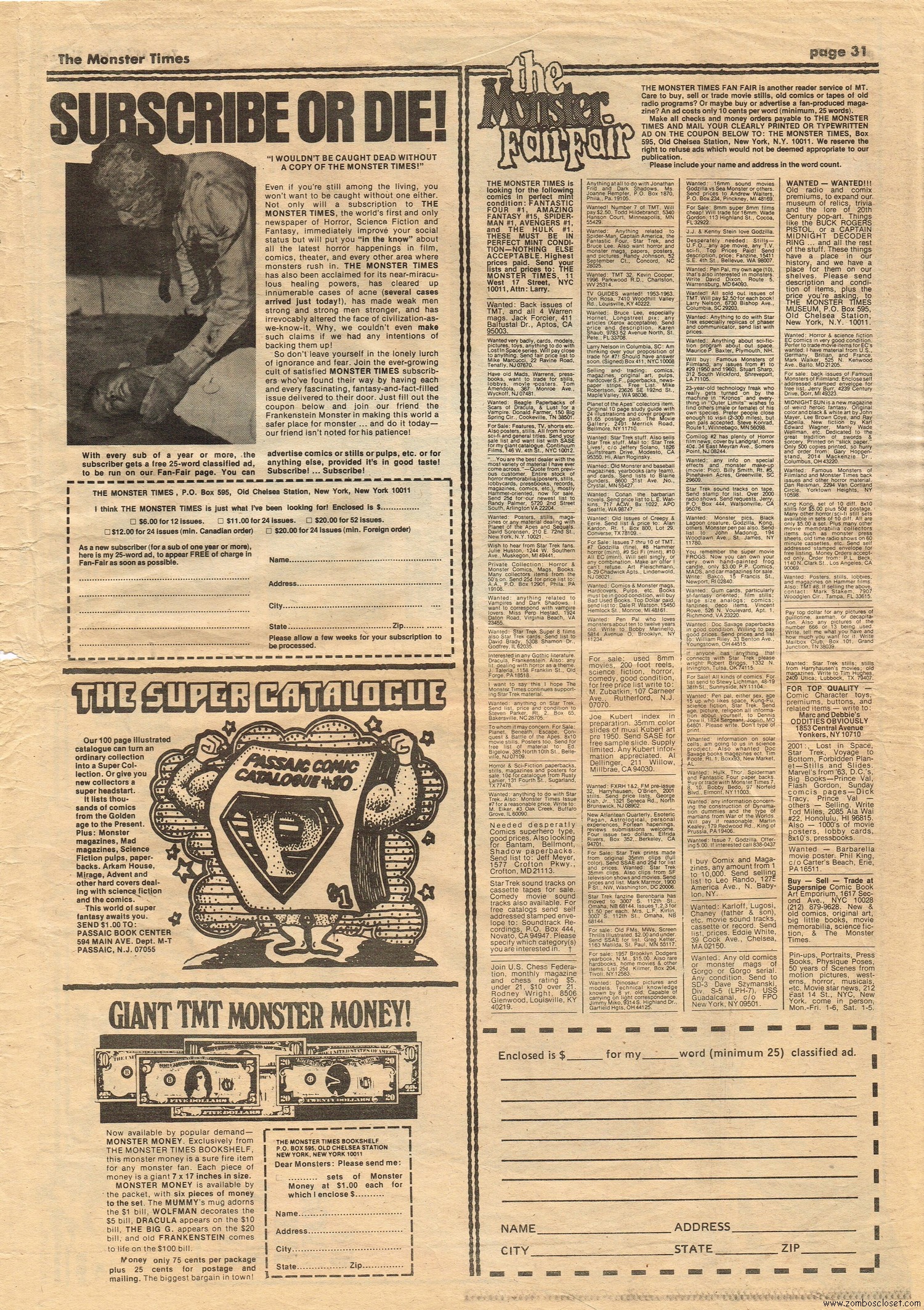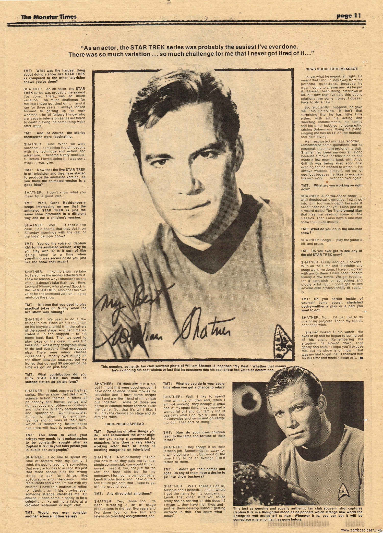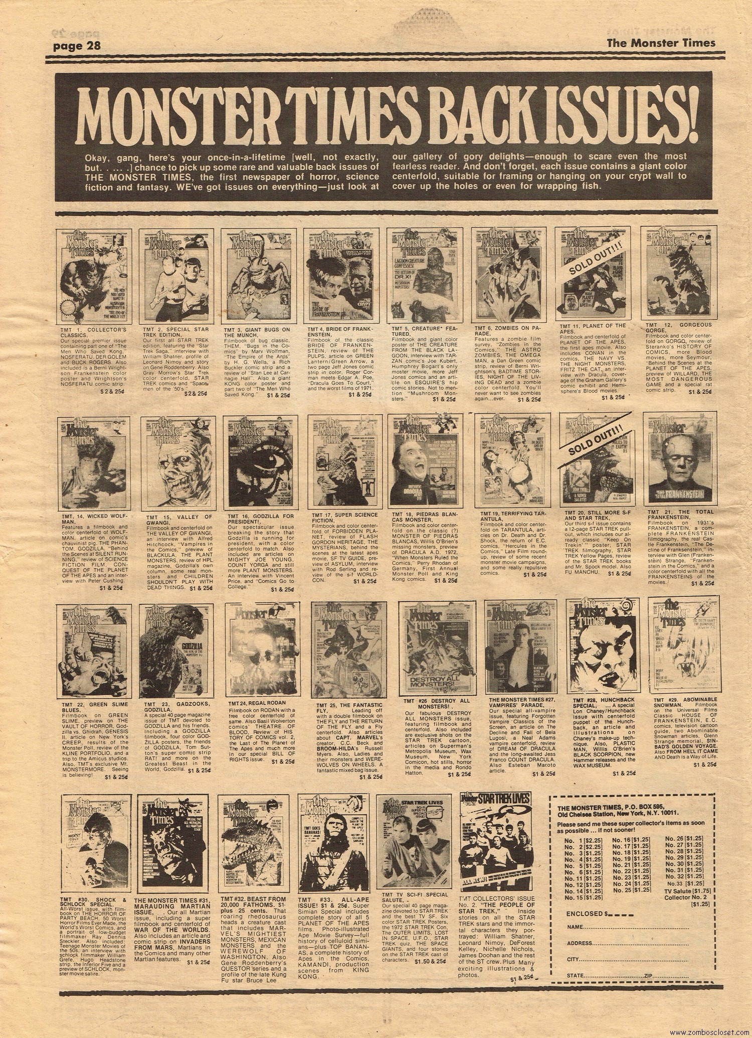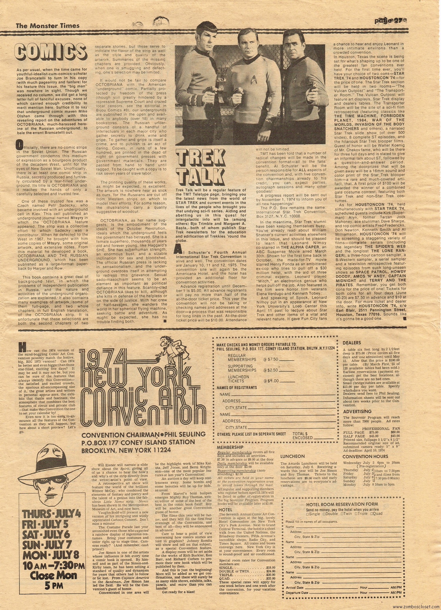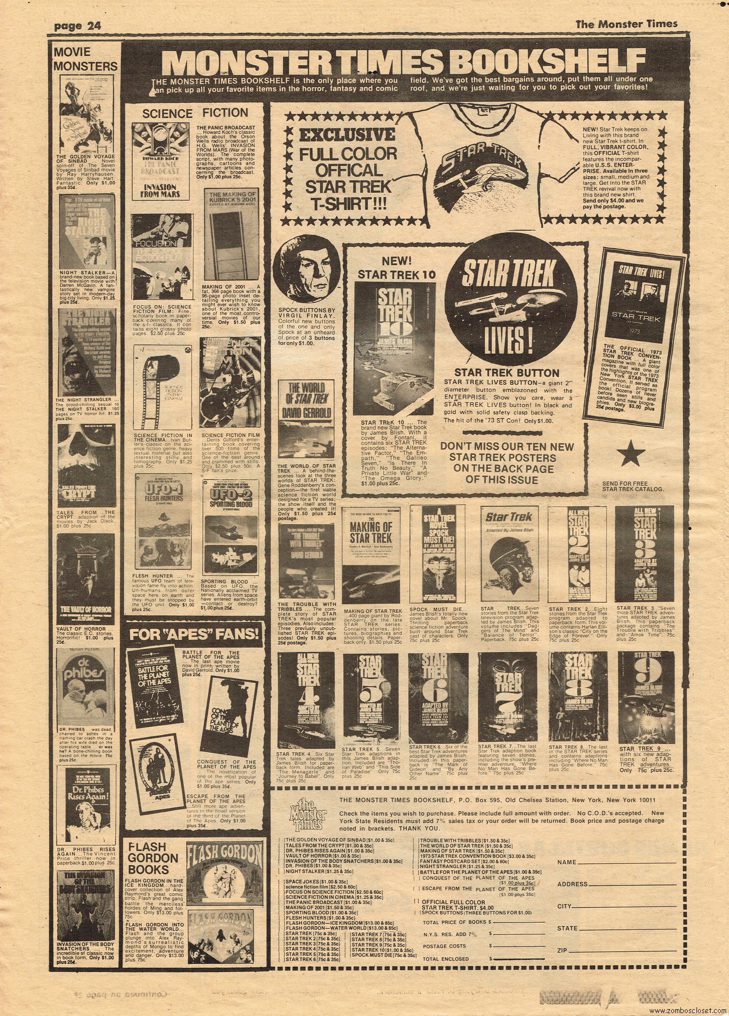 The Time Machine kicks off issue 34 of The Monster Times, with It Came From Out of the Underground (comix, that is), and Star Trek Lives! By 1979, Star Trek fandom would get their fix with Star Trek the Motion Picture (well, okay, sort of), and more ST to follow on the big screen. William Shatner also gives TMT a lengthy interview, too. Doug Murray pours over the slimy monsters to be found in comics, and a pondering over Zardoz ponders some more. Ladies of Fright explores female terrors in film beginning with Freaks, but of course needs to be added to by now, and a preview of Madhouse with Vincent Price is tossed in for good measure. Of special nostalgic and historical interest, you’ll find on page 27, a half-page rundown on all the cool happenings planned for the 1974 New York Comic Art Convention, where fans mingled with the greats. Sadly, I didn’t take pictures when I attended–I know, how stupid of me! But I was there, although my memories are more foggy than clear about the whole thing, but I swear, I wasn’t doing drugs. I wasn’t!