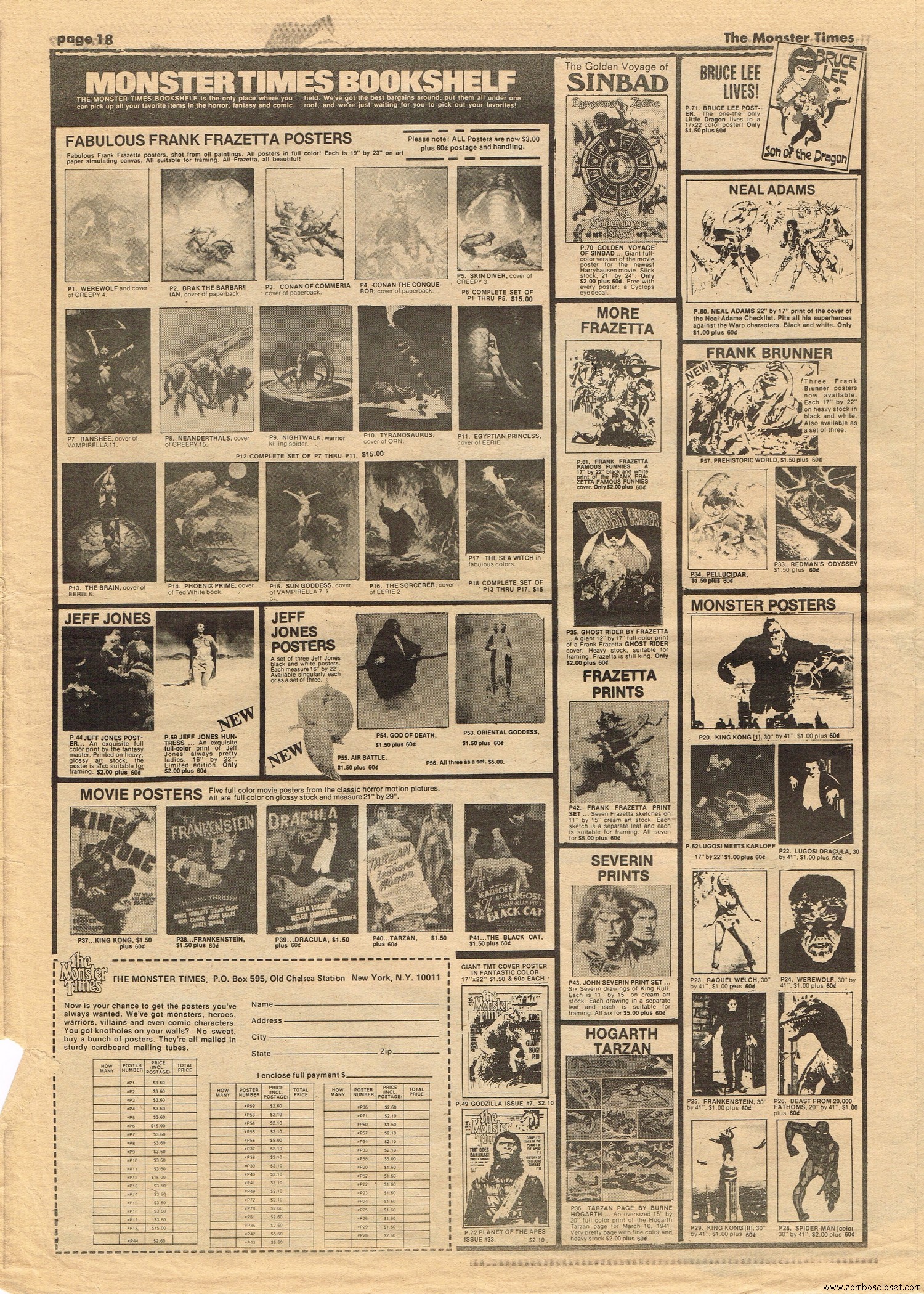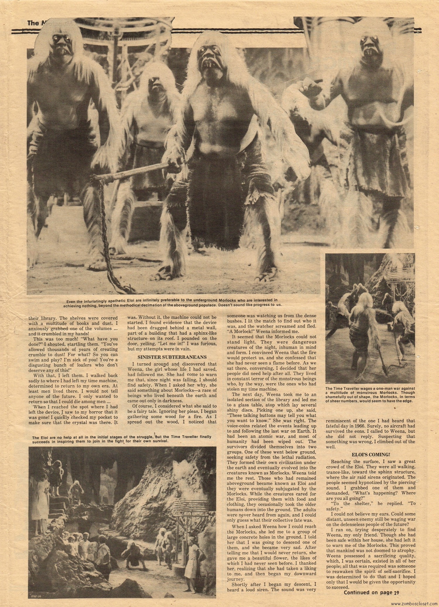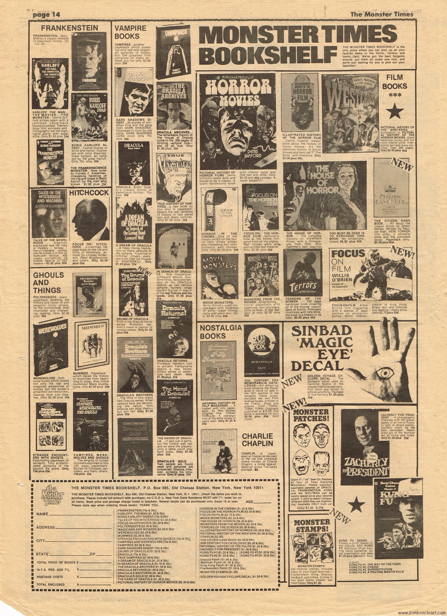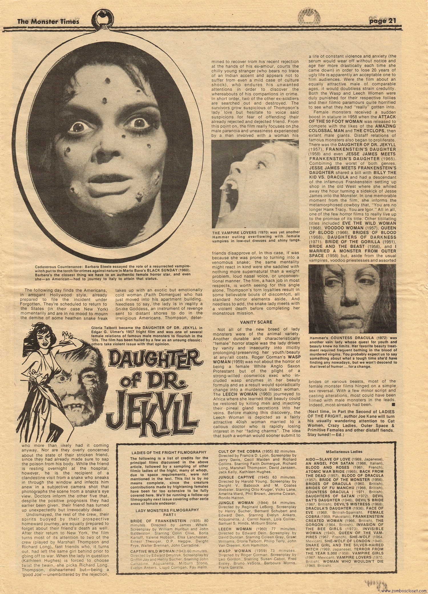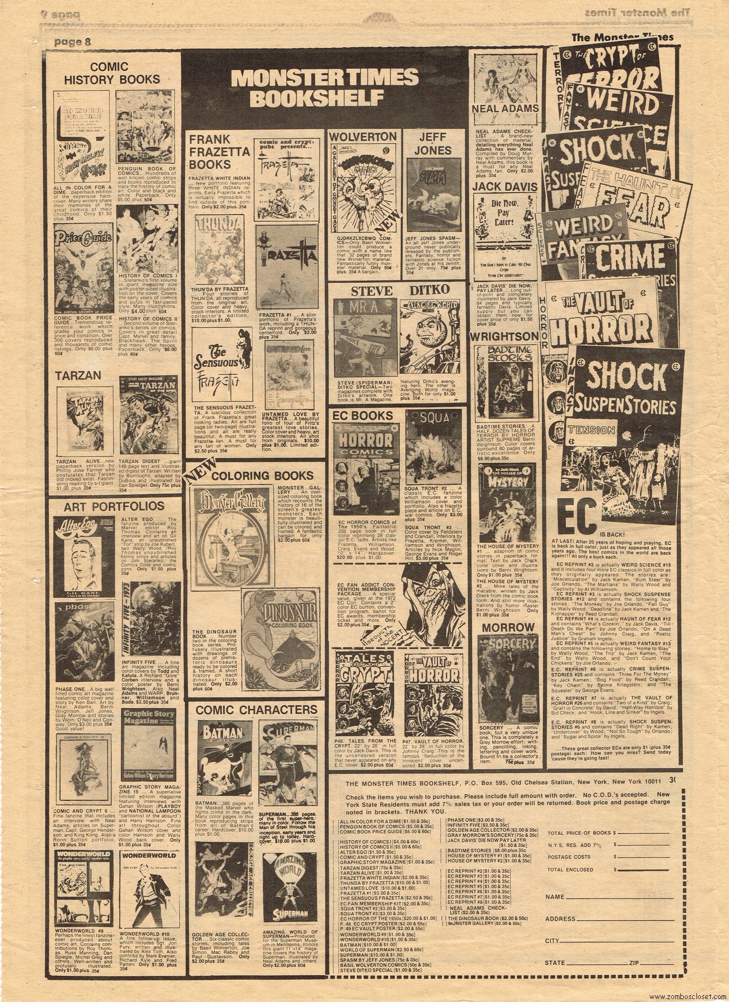 The Time Machine kicks off issue 34 of The Monster Times, with It Came From Out of the Underground (comix, that is), and Star Trek Lives! By 1979, Star Trek fandom would get their fix with Star Trek the Motion Picture (well, okay, sort of), and more ST to follow on the big screen. William Shatner also gives TMT a lengthy interview, too. Doug Murray pours over the slimy monsters to be found in comics, and a pondering over Zardoz ponders some more. Ladies of Fright explores female terrors in film beginning with Freaks, but of course needs to be added to by now, and a preview of Madhouse with Vincent Price is tossed in for good measure. Of special nostalgic and historical interest, you’ll find on page 27, a half-page rundown on all the cool happenings planned for the 1974 New York Comic Art Convention, where fans mingled with the greats. Sadly, I didn’t take pictures when I attended–I know, how stupid of me! But I was there, although my memories are more foggy than clear about the whole thing, but I swear, I wasn’t doing drugs. I wasn’t!