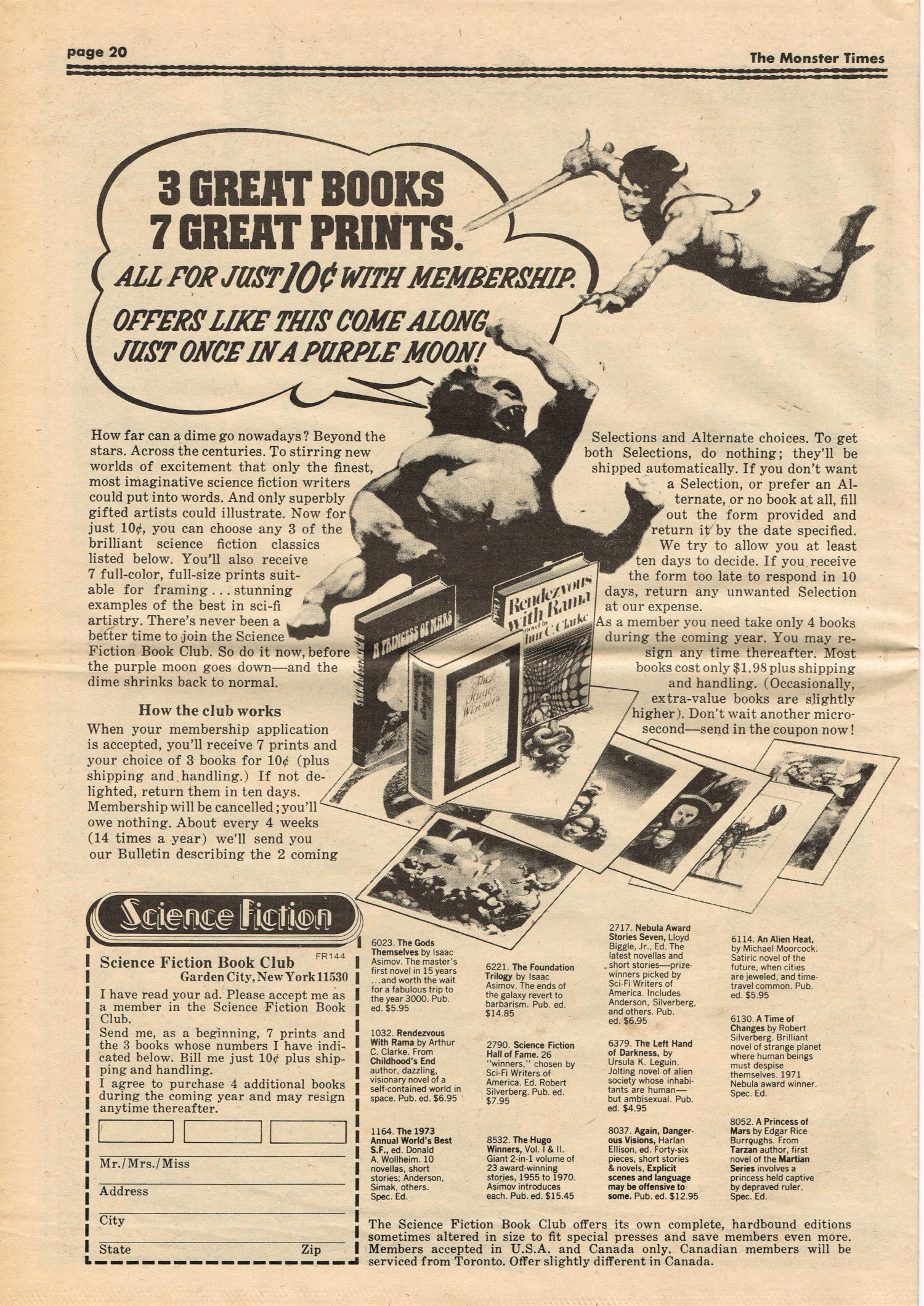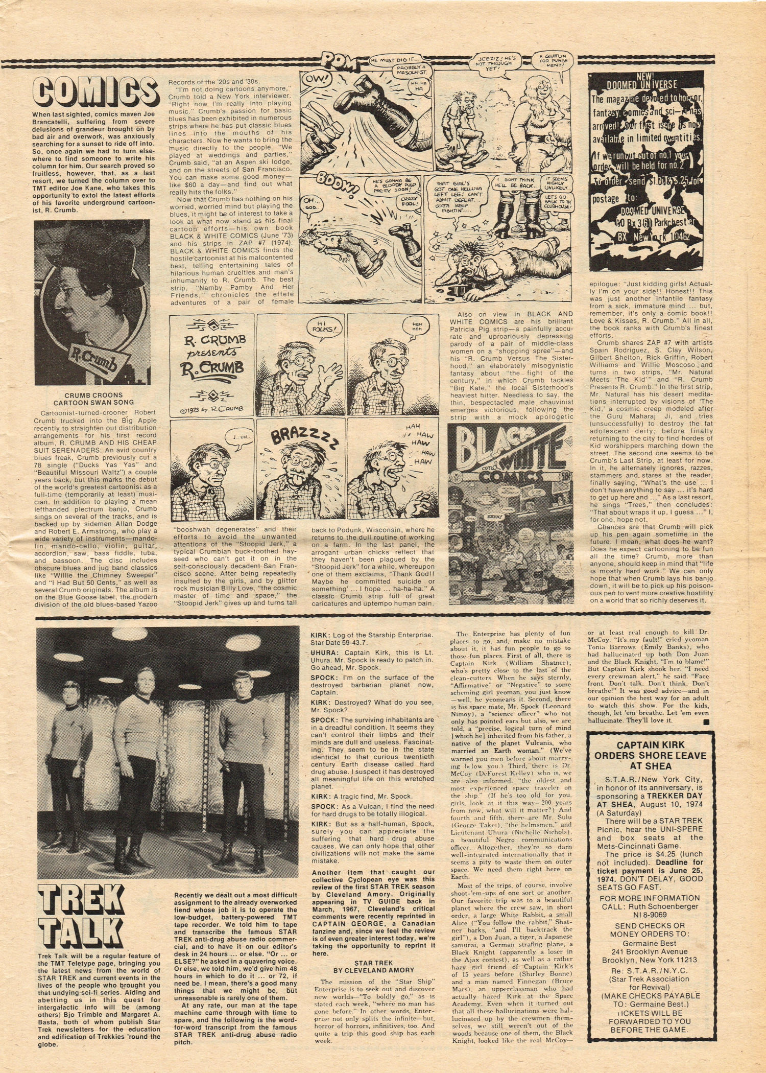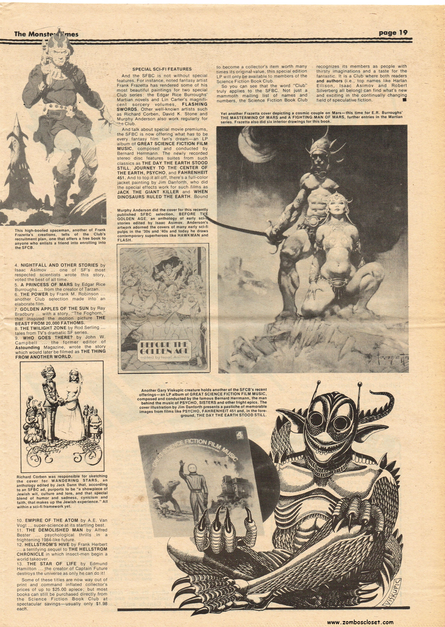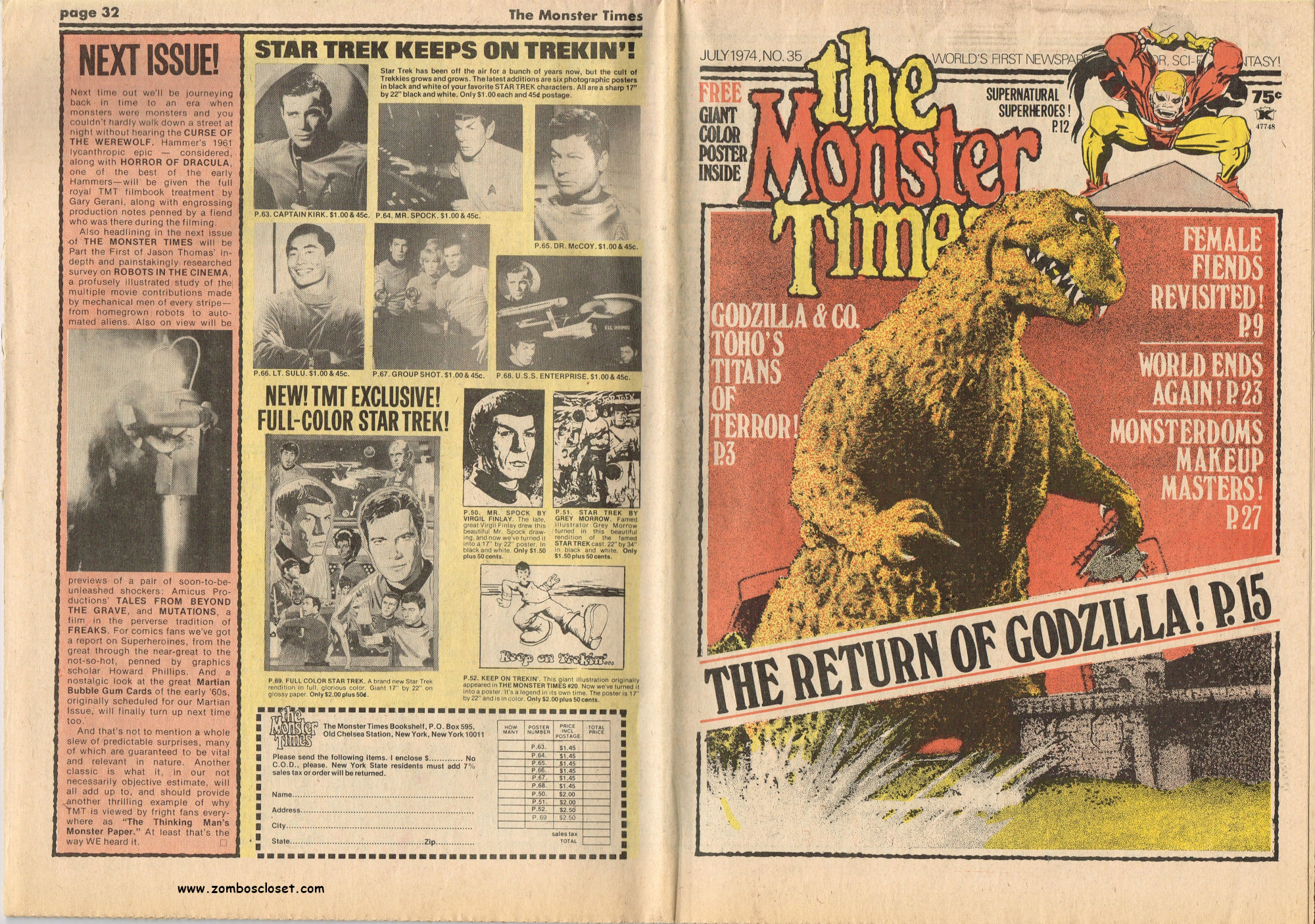 Here’s a monster timely issue for Godzilla fans. Issue 35 of The Monster Times covers Tokyo’s eternal monster problem with a nifty rundown on the big nasties across the movies (up until 1974, of course). Howard Phillips (um, yeah) provides an overview of Supernatural Horrors in the comics, and the Science Fiction Book Club (gee, I was a member!) gets a shout-out in Bargains From Beyond. Not surprisingly, there’s a full-page ad for the Science Fiction Book Club, too. Back then, the club was the best way to get your hands on copious genre reading material. John Tibbets provides an academic lecture on horror and Chosen Survivors gets a “worth seeing” review. Also noteworthy, Trek Talk provides Cleveland Amory’s review of Star Trek, which originally appeared in TV Guide‘s 1967 issue.
