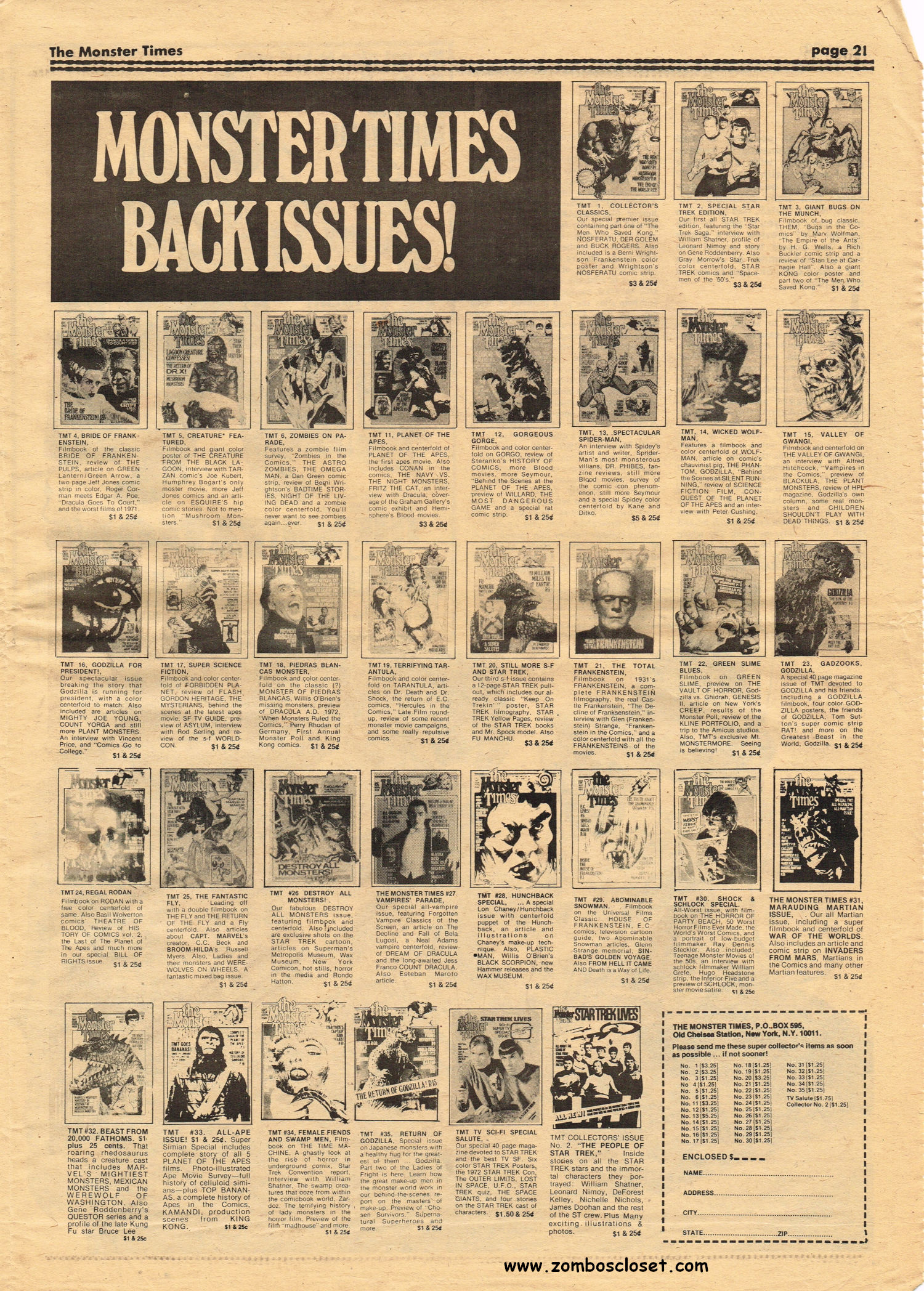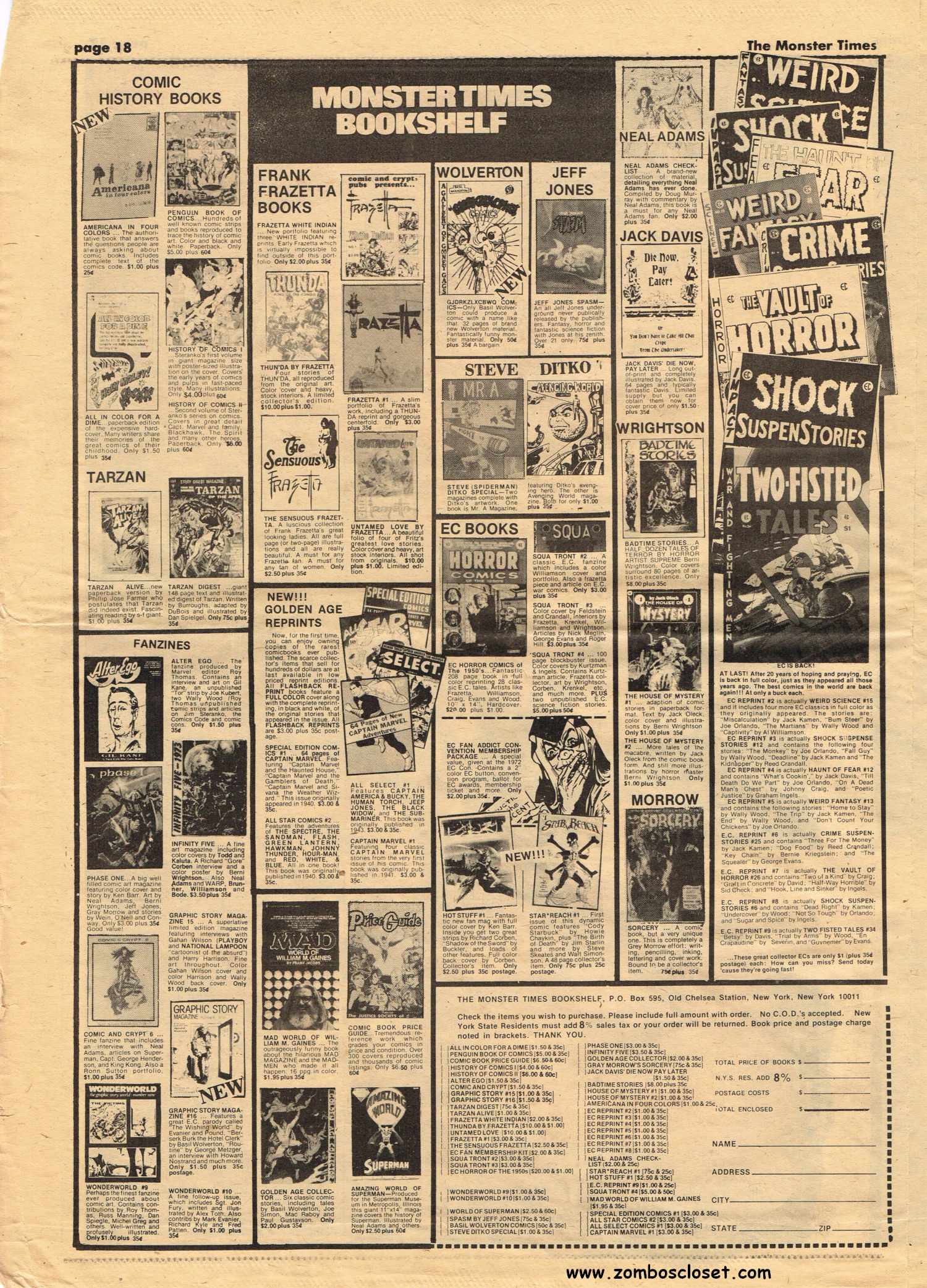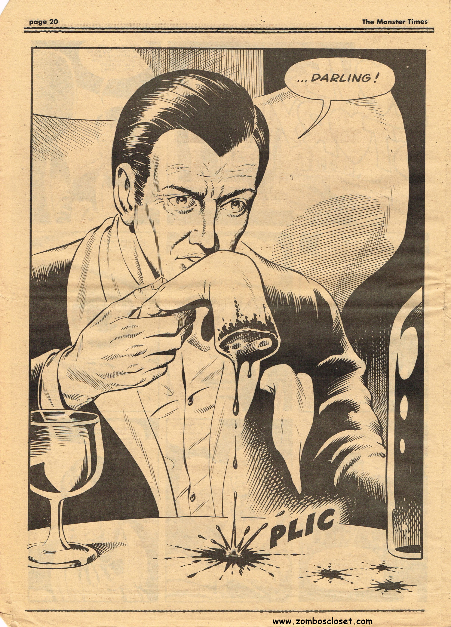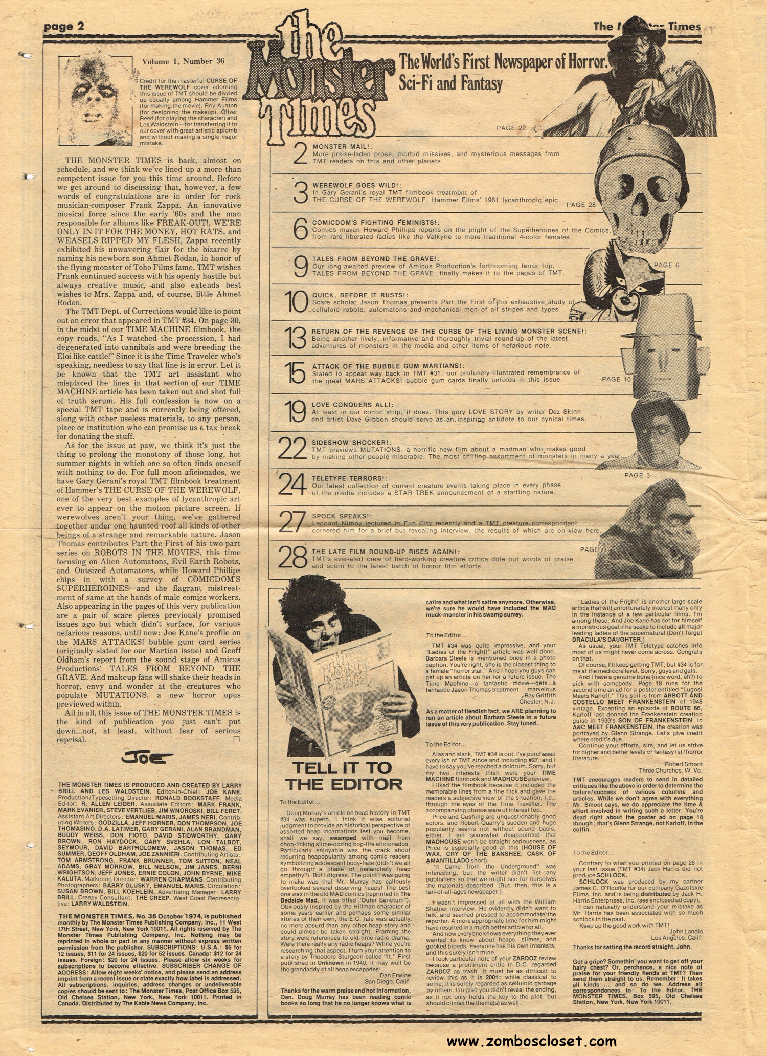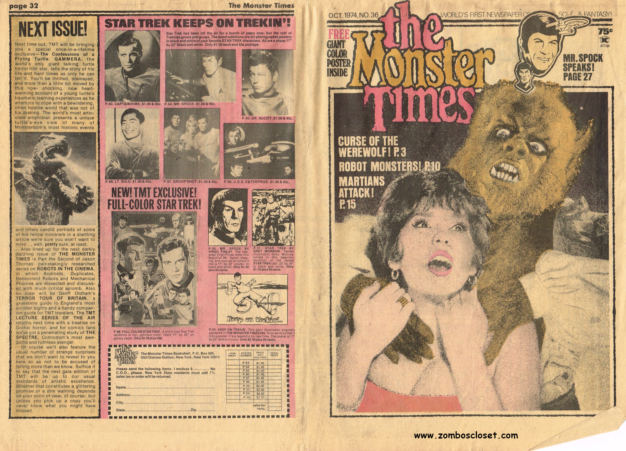 Here’s another jam-packed issue for The Monster Times, issue 36. I get goosebumps when I read news blurbs like the one you’ll find on page 25, in Trek Talk. A bloody sweet tw0-pager by Dez Skinn and Dave Gibbons provides the comic relief, and Jason Thomas brings us part 1 of Robots in the Cinema. The mysterious Howard Philips asks Why Super-Heroines Leave Home, and the monster movies are gravely covered with Tales From Beyond the Grave and, one of my favorite Donald Pleasence movies, The Mutations. Lots more to read, so I won’t keep you any longer: jump right in!