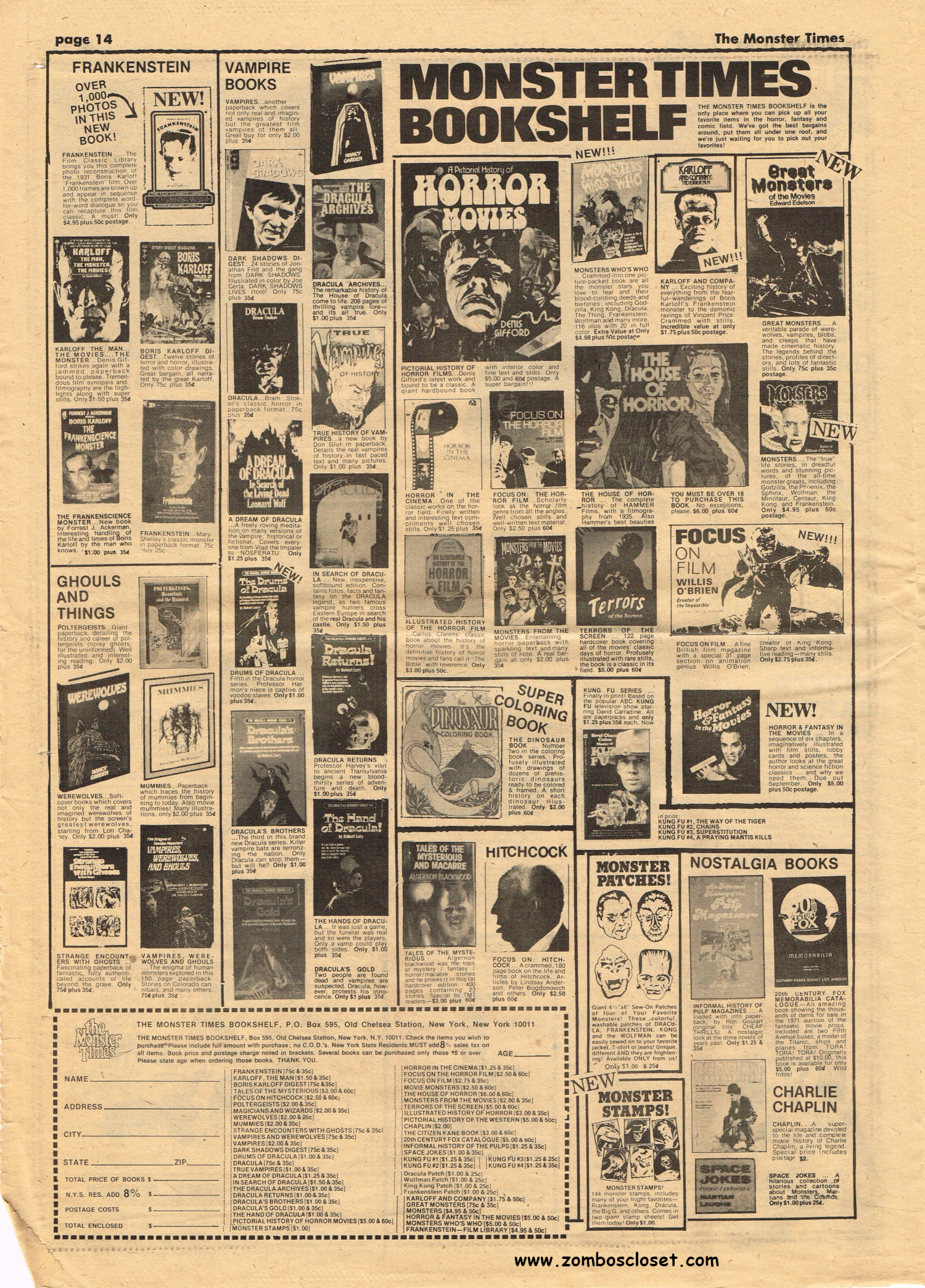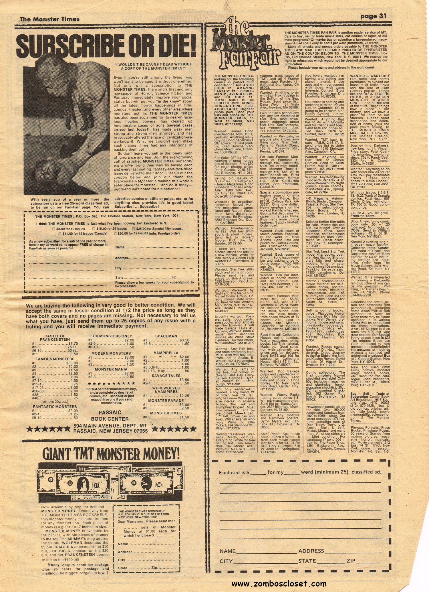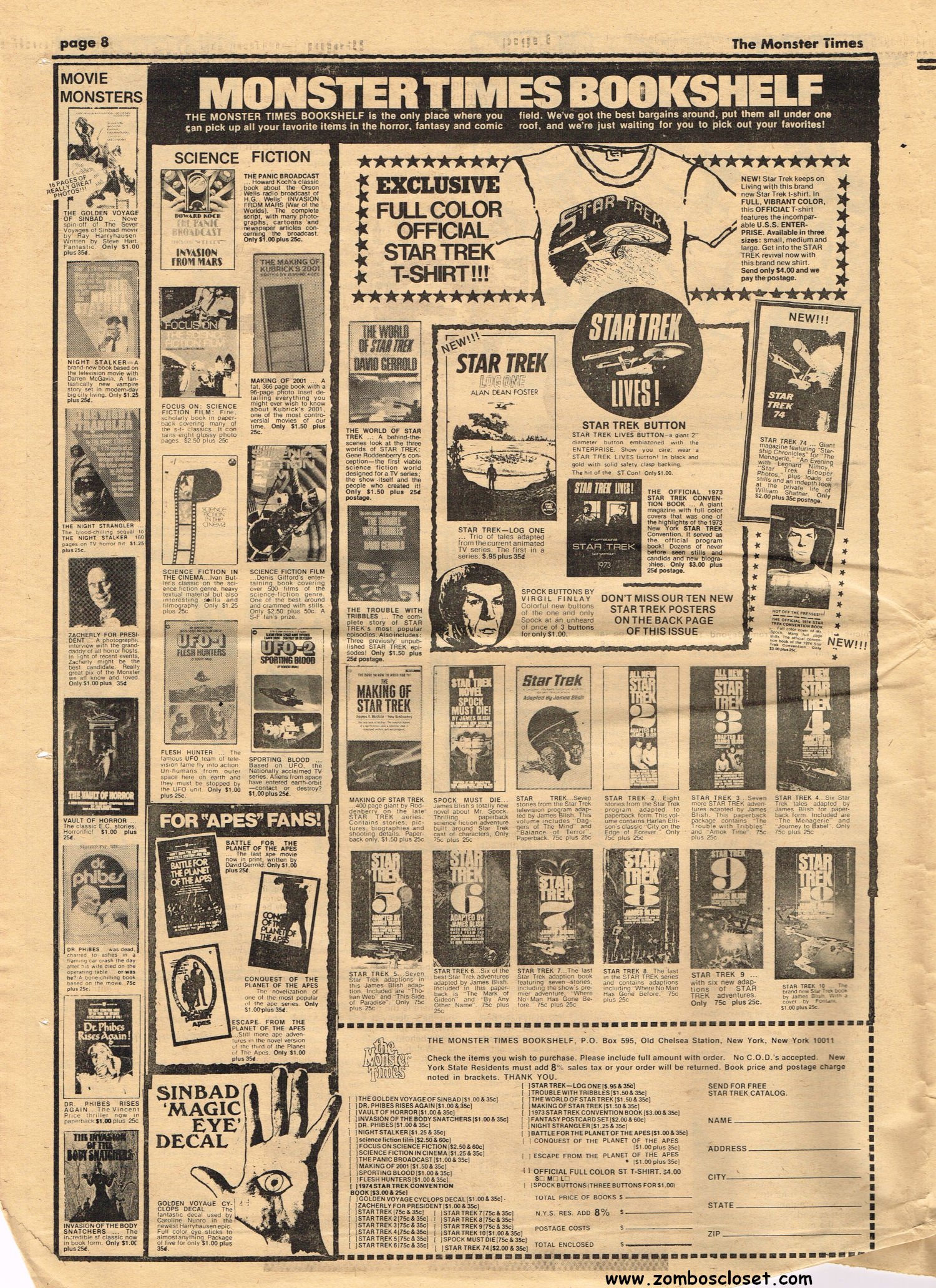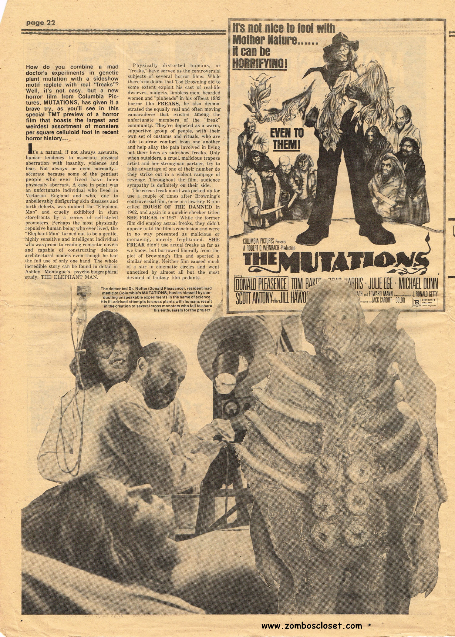 Here’s another jam-packed issue for The Monster Times, issue 36. I get goosebumps when I read news blurbs like the one you’ll find on page 25, in Trek Talk. A bloody sweet tw0-pager by Dez Skinn and Dave Gibbons provides the comic relief, and Jason Thomas brings us part 1 of Robots in the Cinema. The mysterious Howard Philips asks Why Super-Heroines Leave Home, and the monster movies are gravely covered with Tales From Beyond the Grave and, one of my favorite Donald Pleasence movies, The Mutations. Lots more to read, so I won’t keep you any longer: jump right in!