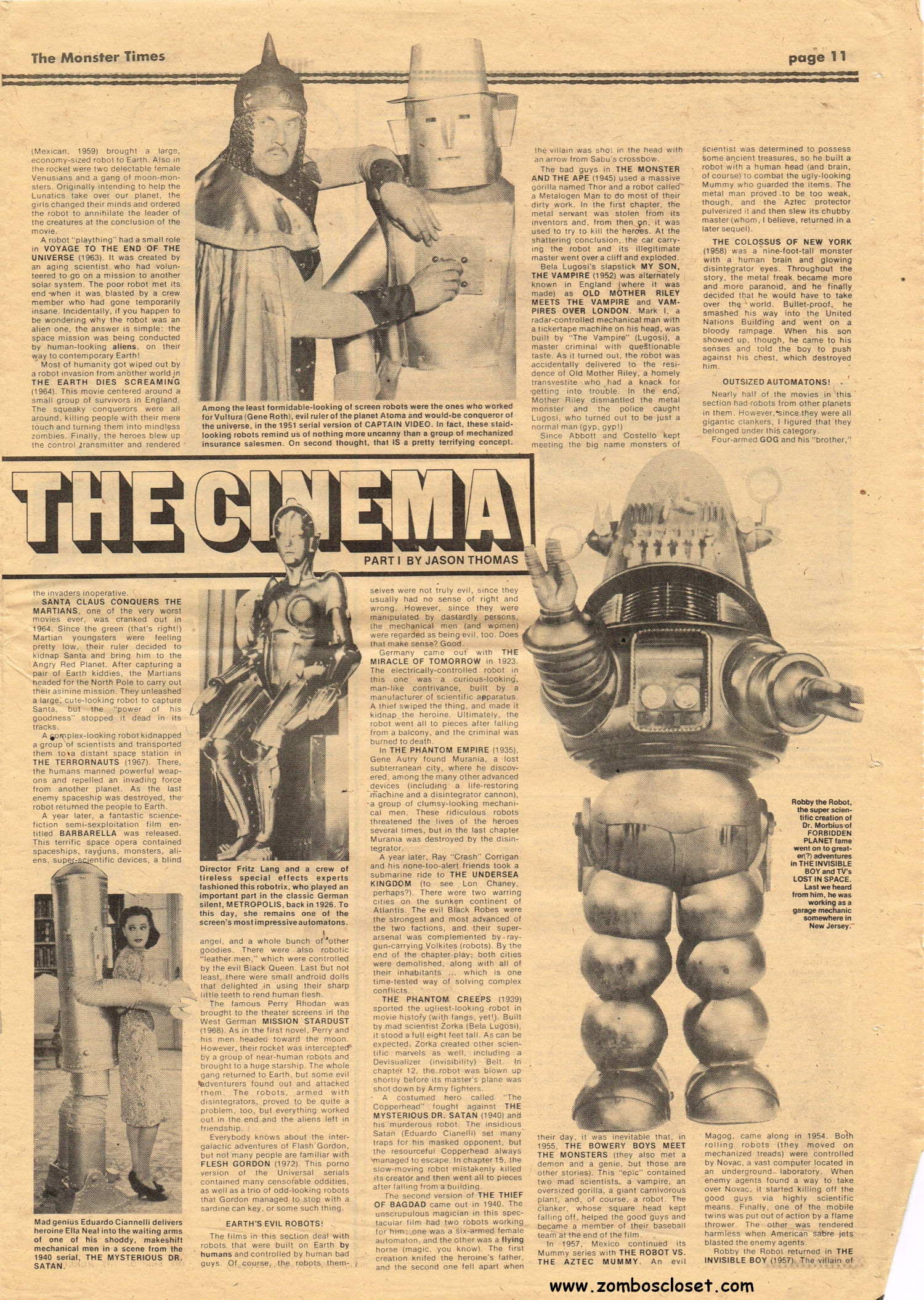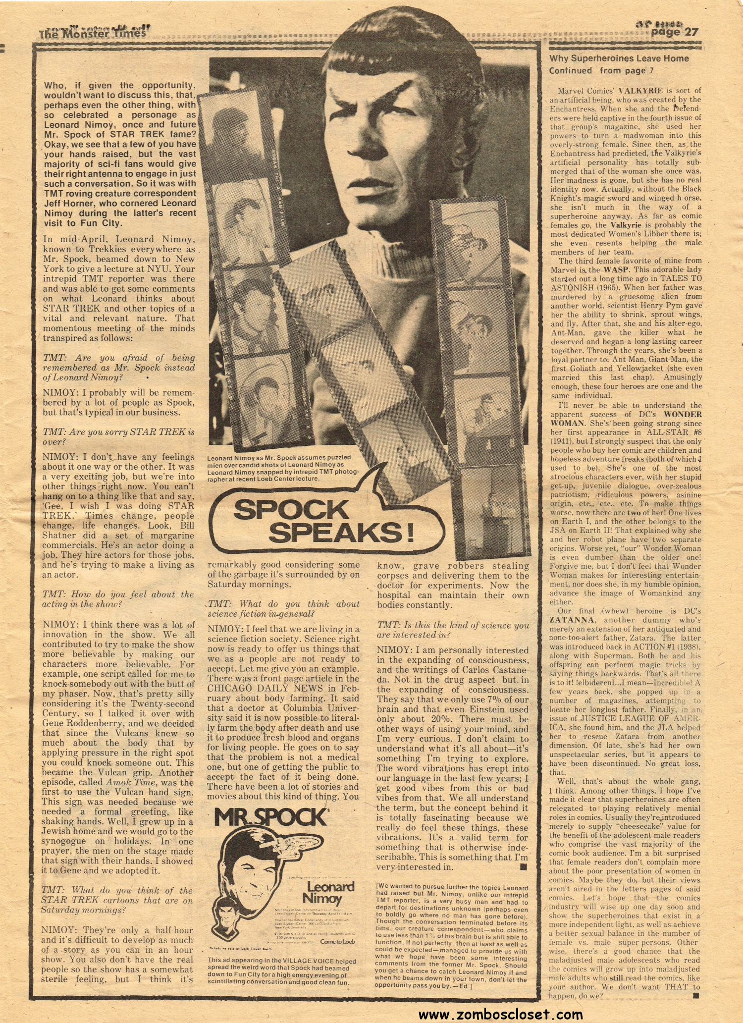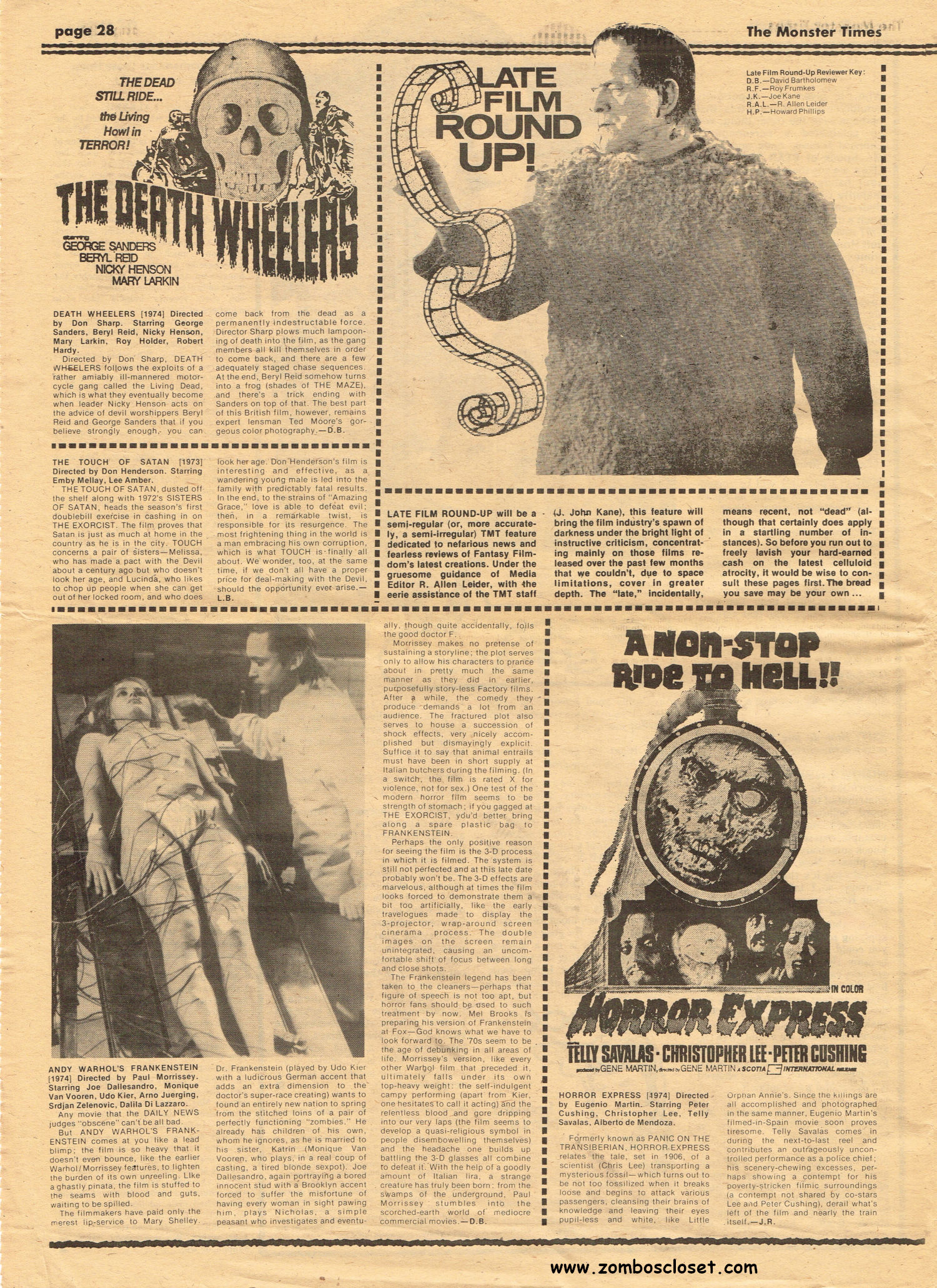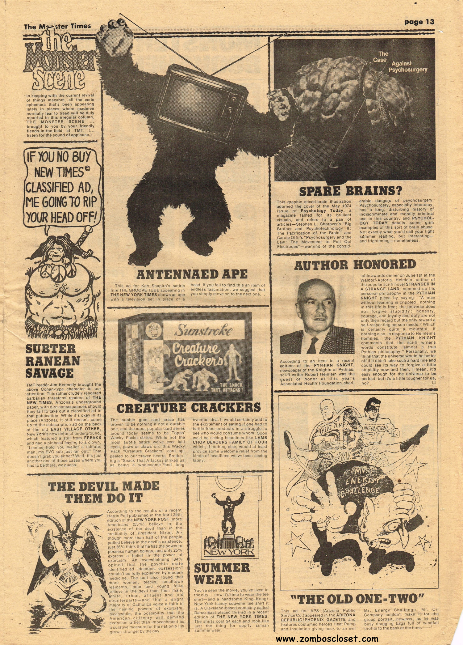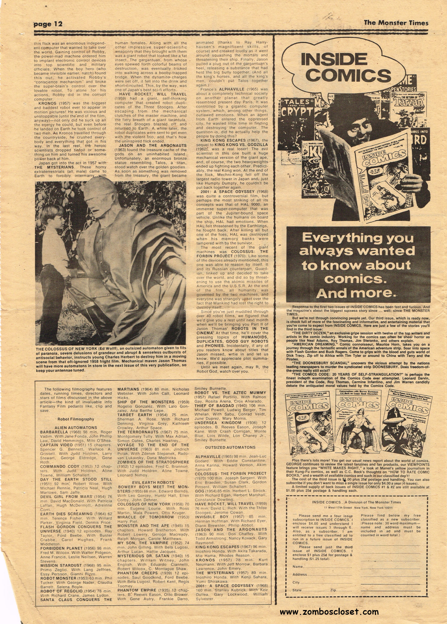 Here’s another jam-packed issue for The Monster Times, issue 36. I get goosebumps when I read news blurbs like the one you’ll find on page 25, in Trek Talk. A bloody sweet tw0-pager by Dez Skinn and Dave Gibbons provides the comic relief, and Jason Thomas brings us part 1 of Robots in the Cinema. The mysterious Howard Philips asks Why Super-Heroines Leave Home, and the monster movies are gravely covered with Tales From Beyond the Grave and, one of my favorite Donald Pleasence movies, The Mutations. Lots more to read, so I won’t keep you any longer: jump right in!