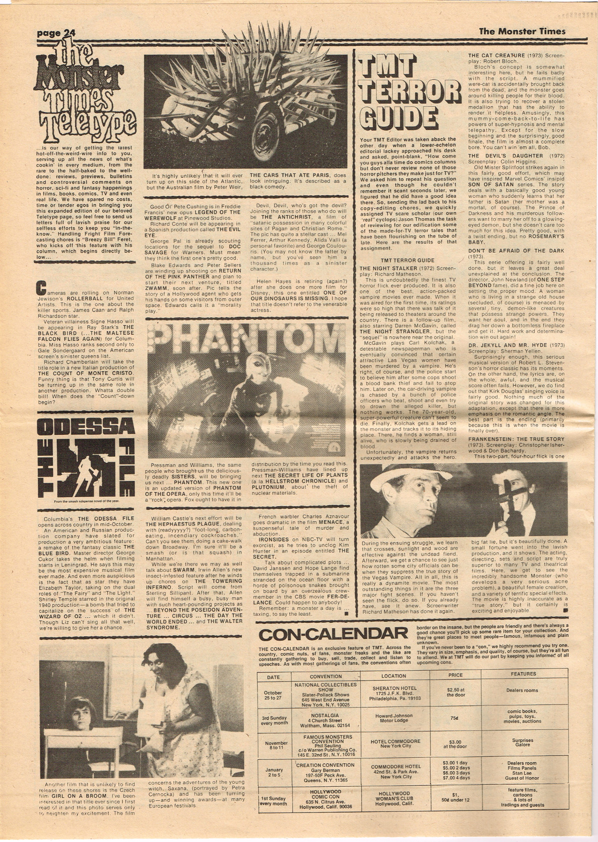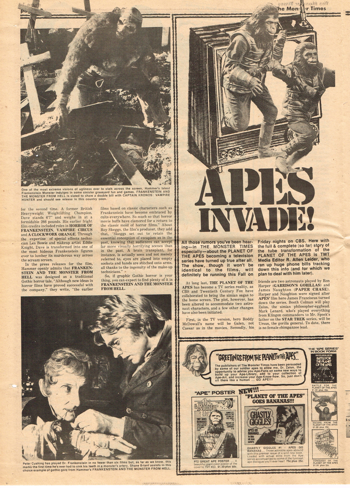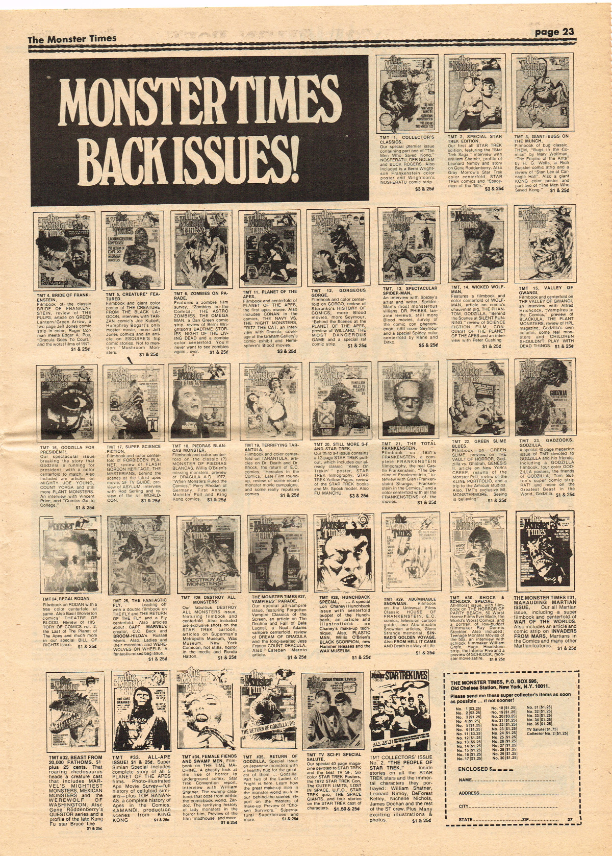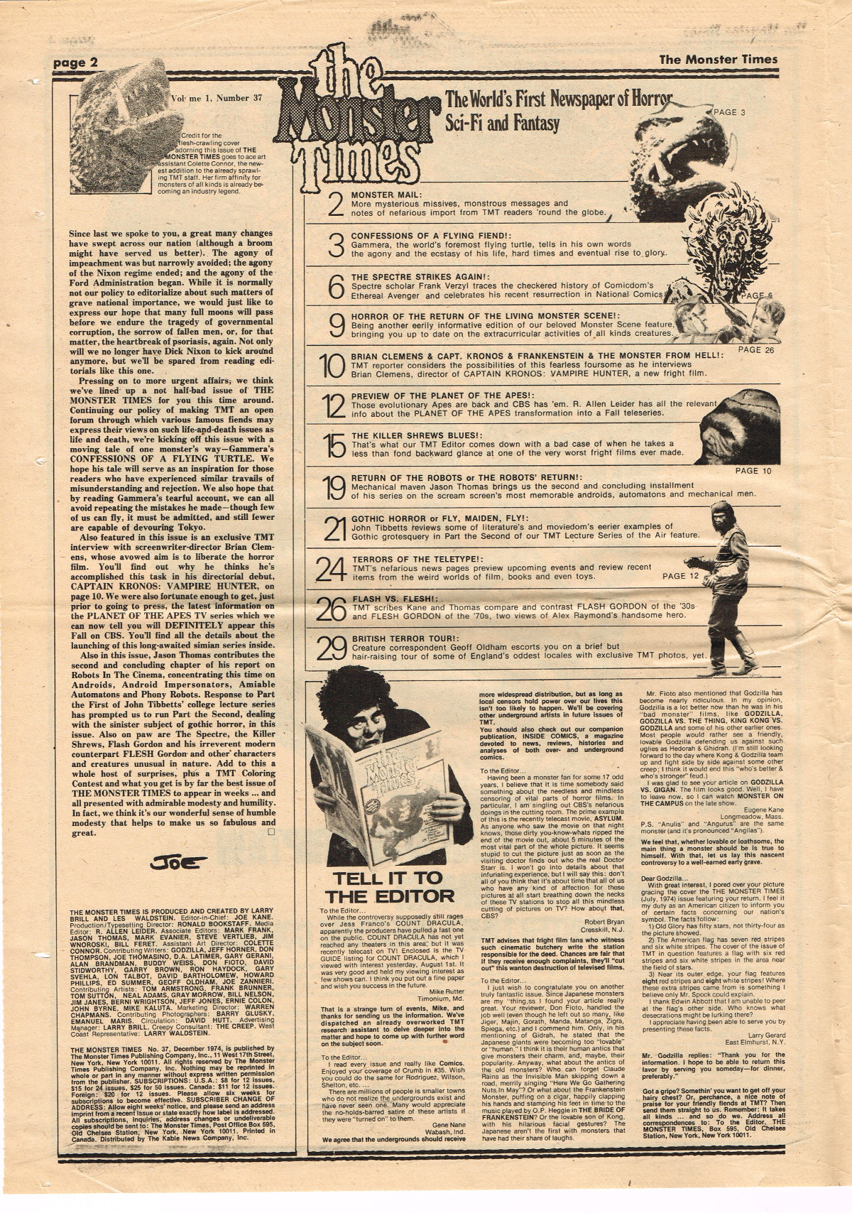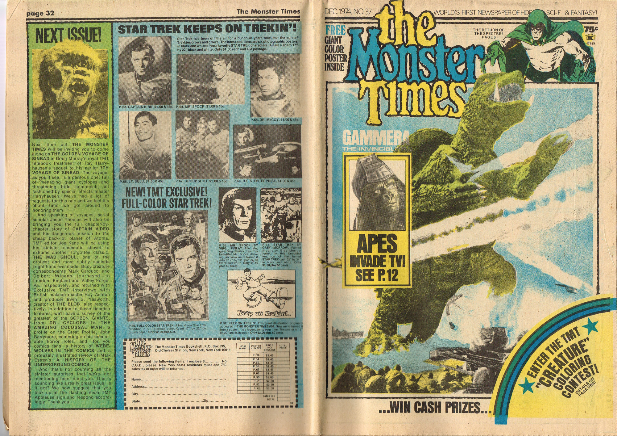 Gammera the Invincible kicks off this issue 37 of The Monster Times, while the Planet of the Apes television series is given due attention, as well as the X-rated Flesh Gordon, that naughty version of our favorite planet-tripping serial hero. I recall seeing this oddity in a somewhat scrubby looking theater. Ah, the 1970s! Oh, and director Brian Clemens is interviewed. On the comics-side, The Spectre Returns, and there's the nifty Con-Calendar giving the rundown on upcoming conventions ("As with most gatherings of fans, the conventions often border on the insane, but the people are friendly and there's always a good chance you'll pick up some rare item for your collection."). In the Lousy Film Department is The Killer Shrews. Articles like Robots in the Cinema and part 2 of The Gothic Tradition in Film by Professor John Tibett make this issue a class act (in spite of the Flesh Gordon blasting all over the Universe coverage, of course).