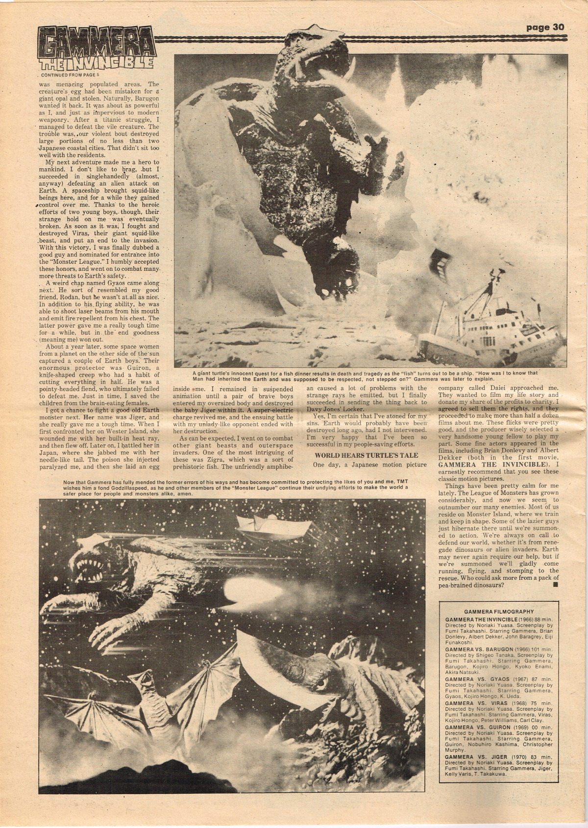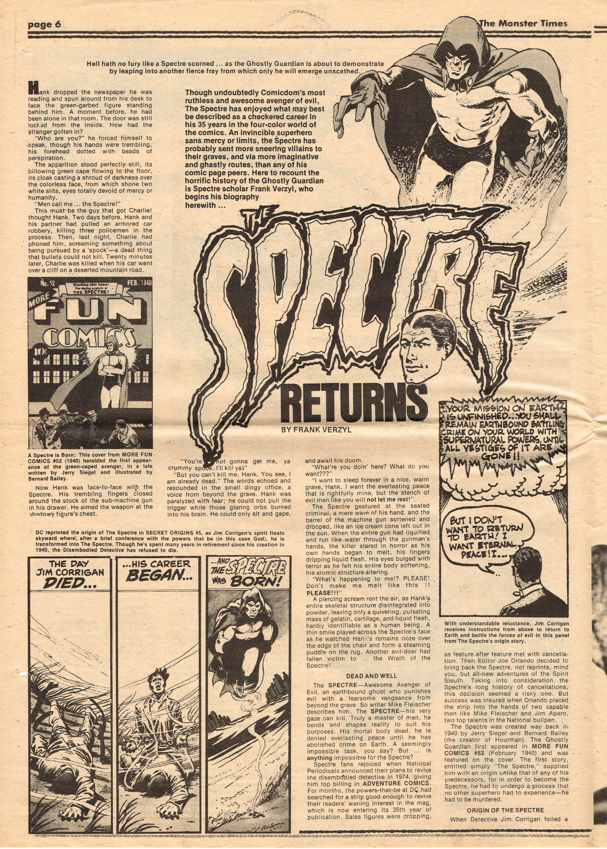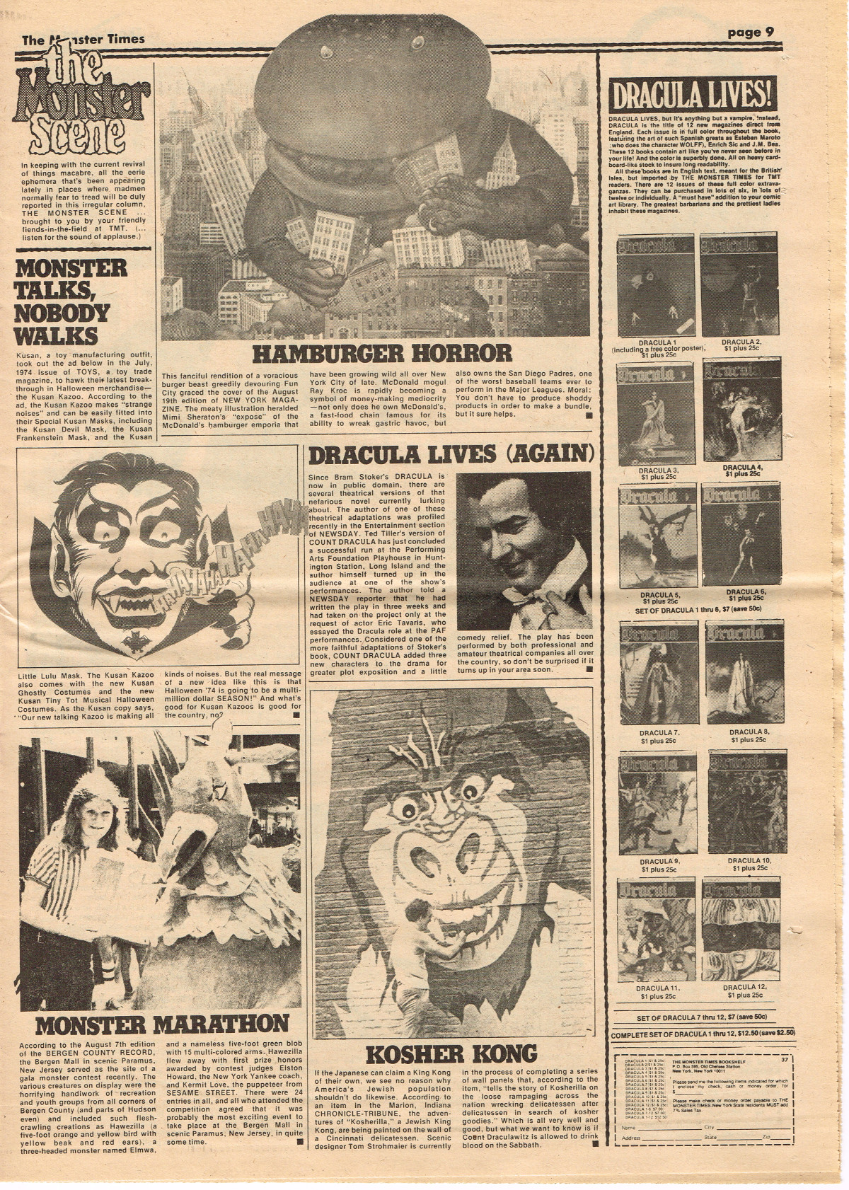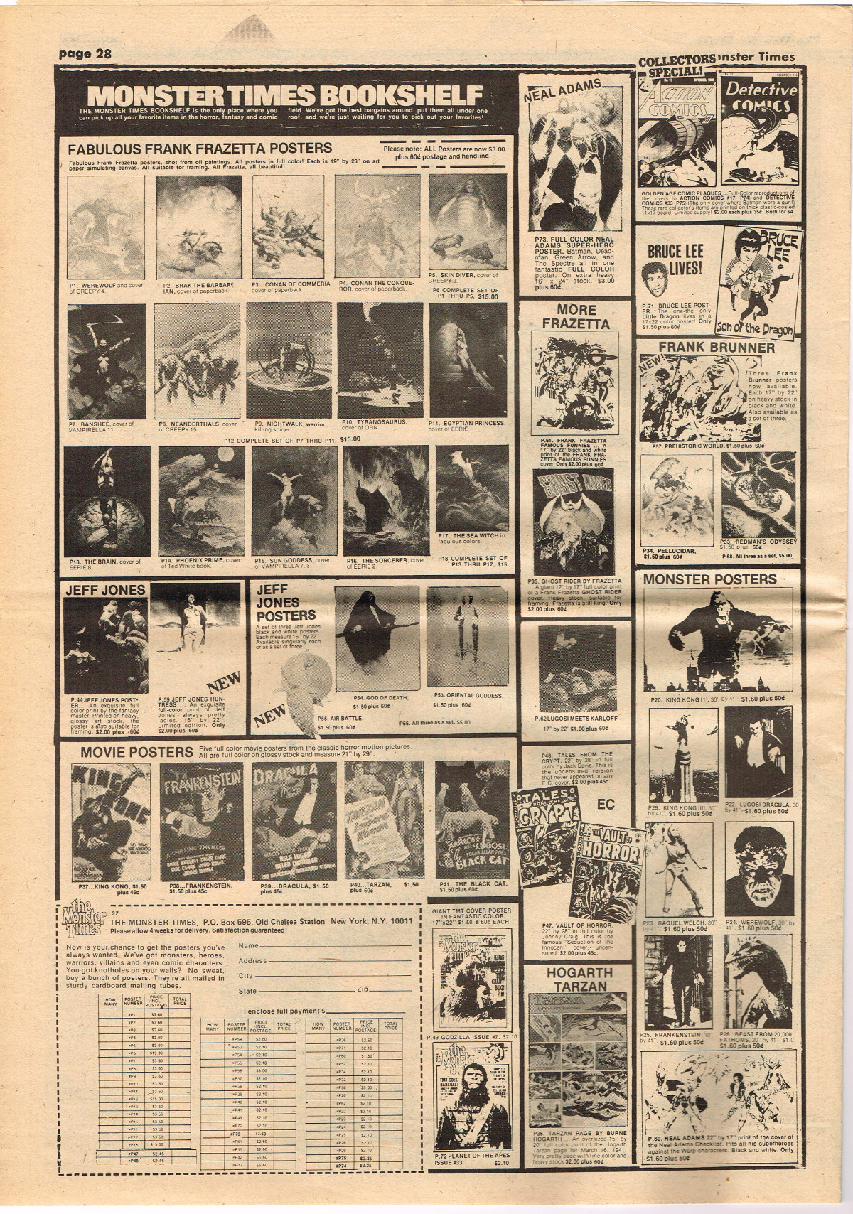 Gammera the Invincible kicks off this issue 37 of The Monster Times, while the Planet of the Apes television series is given due attention, as well as the X-rated Flesh Gordon, that naughty version of our favorite planet-tripping serial hero. I recall seeing this oddity in a somewhat scrubby looking theater. Ah, the 1970s! Oh, and director Brian Clemens is interviewed. On the comics-side, The Spectre Returns, and there's the nifty Con-Calendar giving the rundown on upcoming conventions ("As with most gatherings of fans, the conventions often border on the insane, but the people are friendly and there's always a good chance you'll pick up some rare item for your collection."). In the Lousy Film Department is The Killer Shrews. Articles like Robots in the Cinema and part 2 of The Gothic Tradition in Film by Professor John Tibett make this issue a class act (in spite of the Flesh Gordon blasting all over the Universe coverage, of course).