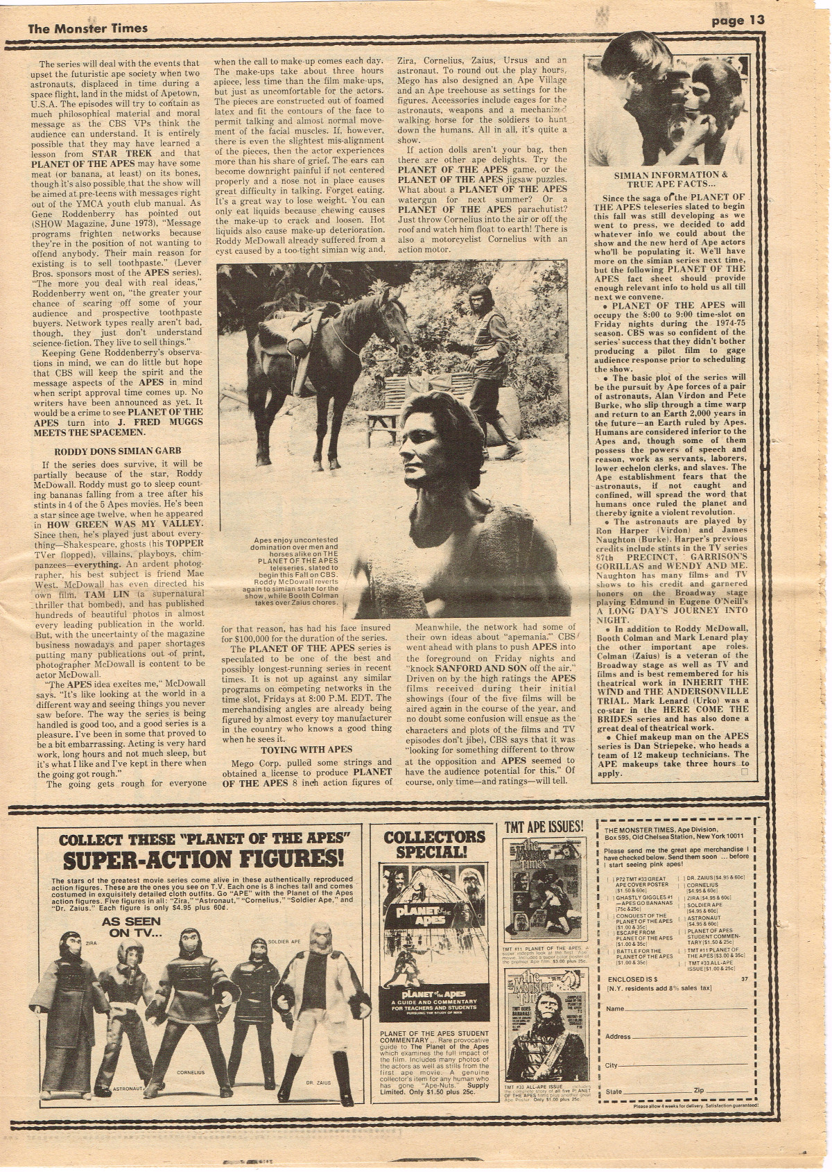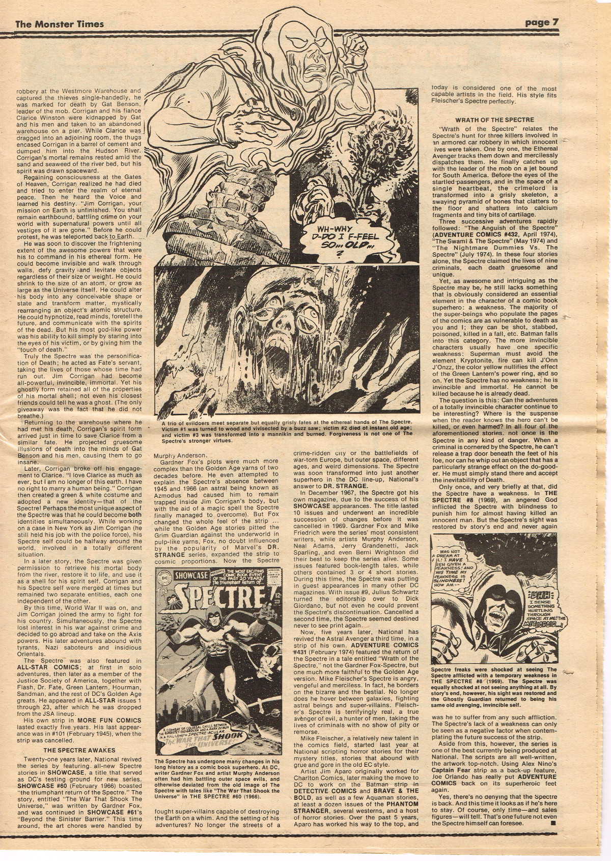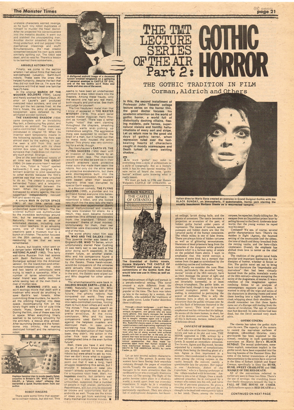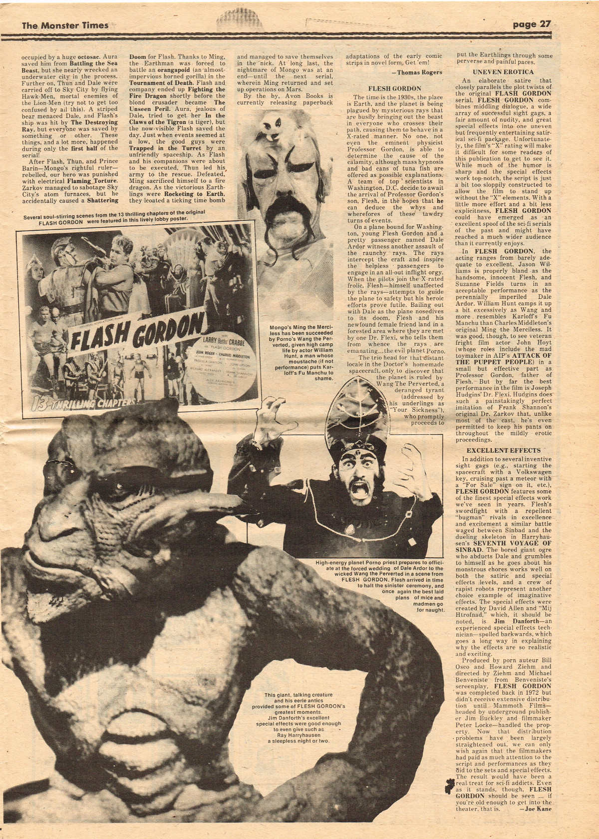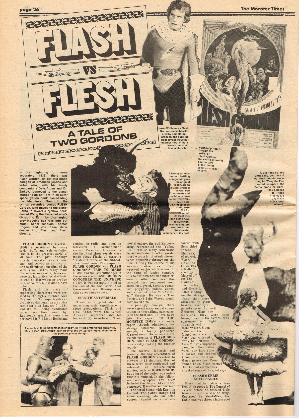 Gammera the Invincible kicks off this issue 37 of The Monster Times, while the Planet of the Apes television series is given due attention, as well as the X-rated Flesh Gordon, that naughty version of our favorite planet-tripping serial hero. I recall seeing this oddity in a somewhat scrubby looking theater. Ah, the 1970s! Oh, and director Brian Clemens is interviewed. On the comics-side, The Spectre Returns, and there's the nifty Con-Calendar giving the rundown on upcoming conventions ("As with most gatherings of fans, the conventions often border on the insane, but the people are friendly and there's always a good chance you'll pick up some rare item for your collection."). In the Lousy Film Department is The Killer Shrews. Articles like Robots in the Cinema and part 2 of The Gothic Tradition in Film by Professor John Tibett make this issue a class act (in spite of the Flesh Gordon blasting all over the Universe coverage, of course).