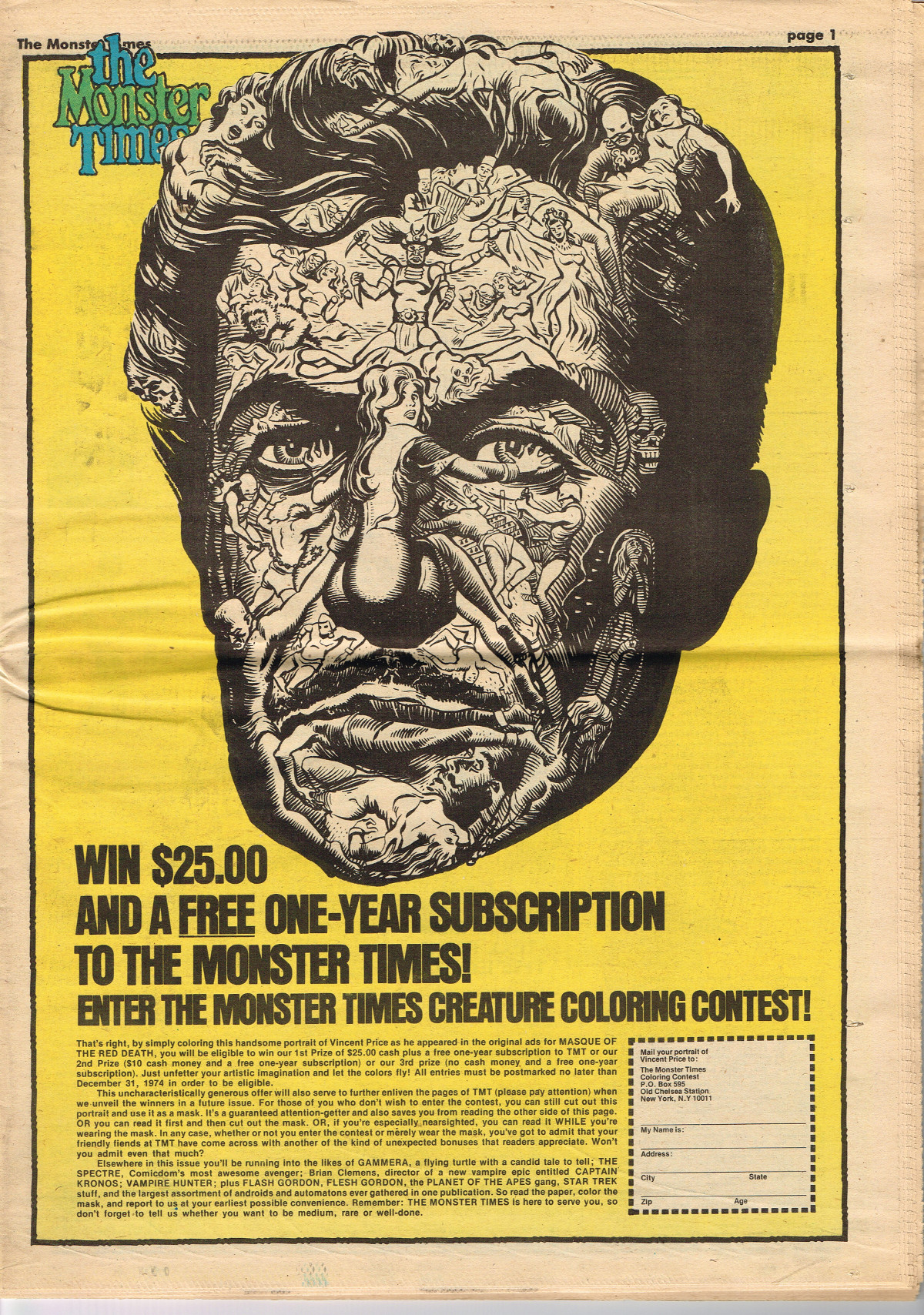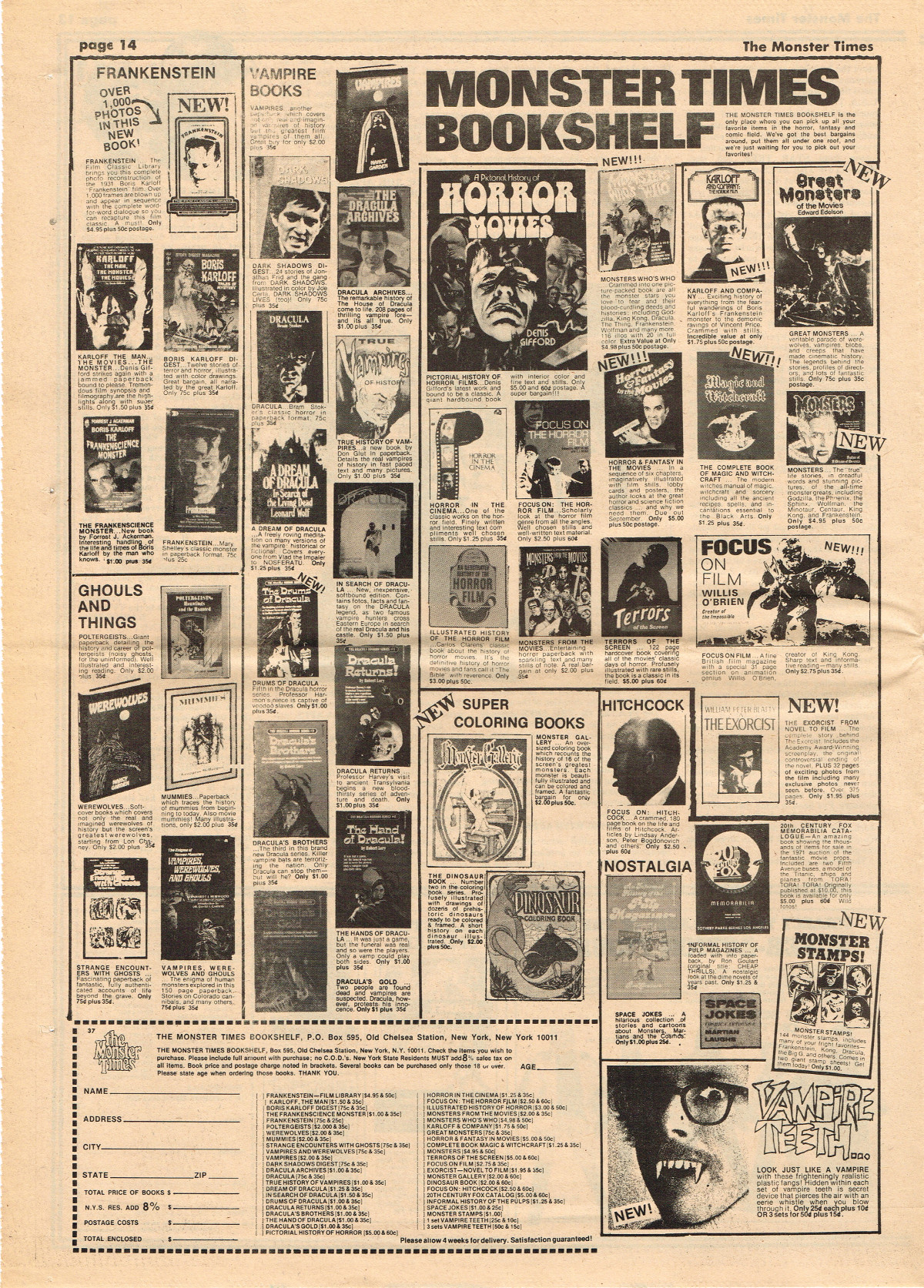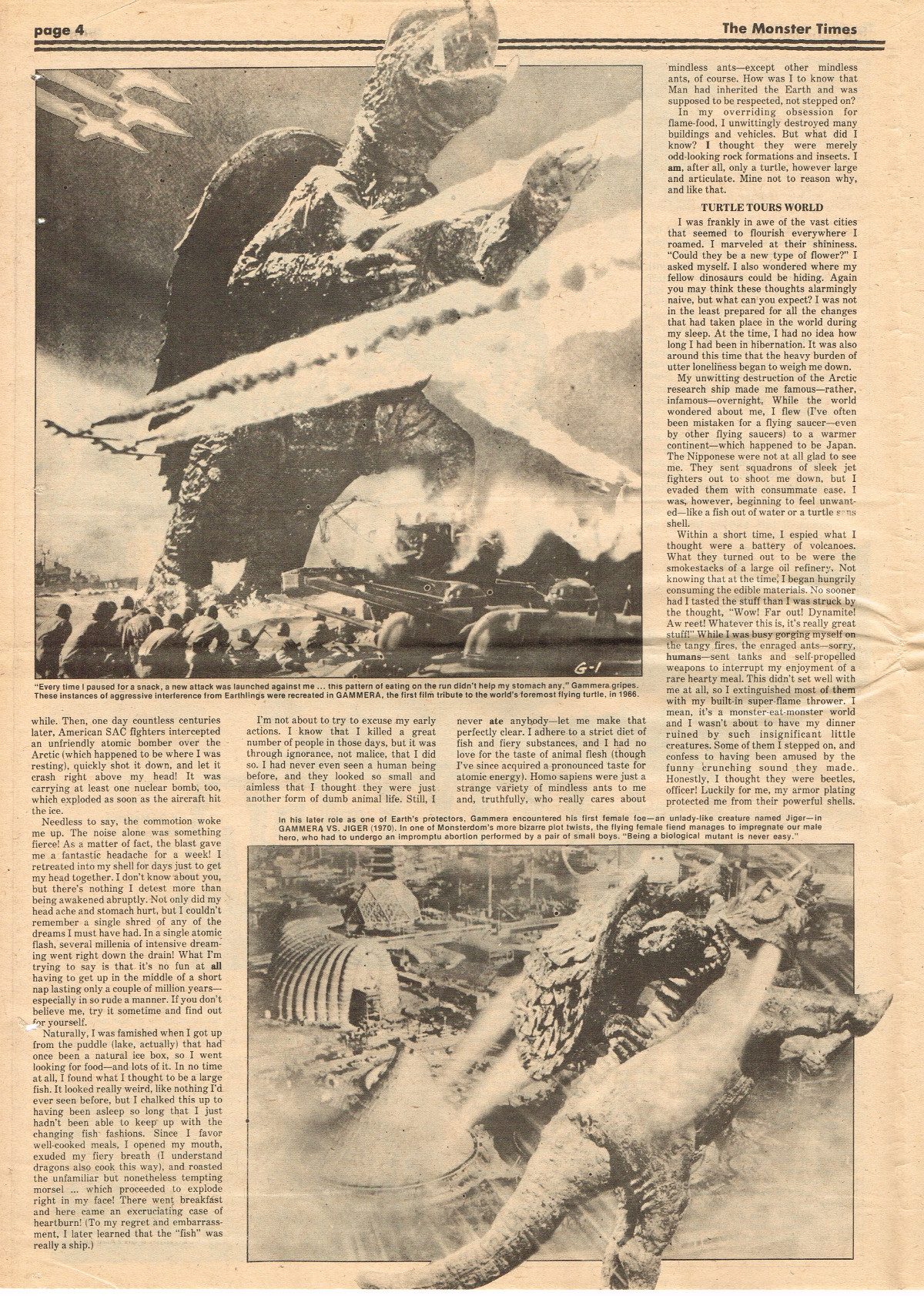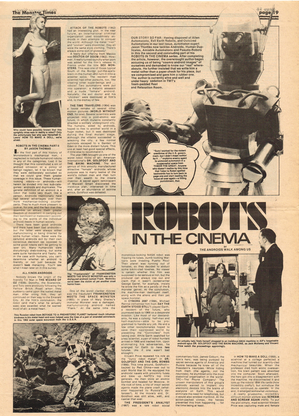 Gammera the Invincible kicks off this issue 37 of The Monster Times, while the Planet of the Apes television series is given due attention, as well as the X-rated Flesh Gordon, that naughty version of our favorite planet-tripping serial hero. I recall seeing this oddity in a somewhat scrubby looking theater. Ah, the 1970s! Oh, and director Brian Clemens is interviewed. On the comics-side, The Spectre Returns, and there's the nifty Con-Calendar giving the rundown on upcoming conventions ("As with most gatherings of fans, the conventions often border on the insane, but the people are friendly and there's always a good chance you'll pick up some rare item for your collection."). In the Lousy Film Department is The Killer Shrews. Articles like Robots in the Cinema and part 2 of The Gothic Tradition in Film by Professor John Tibett make this issue a class act (in spite of the Flesh Gordon blasting all over the Universe coverage, of course).