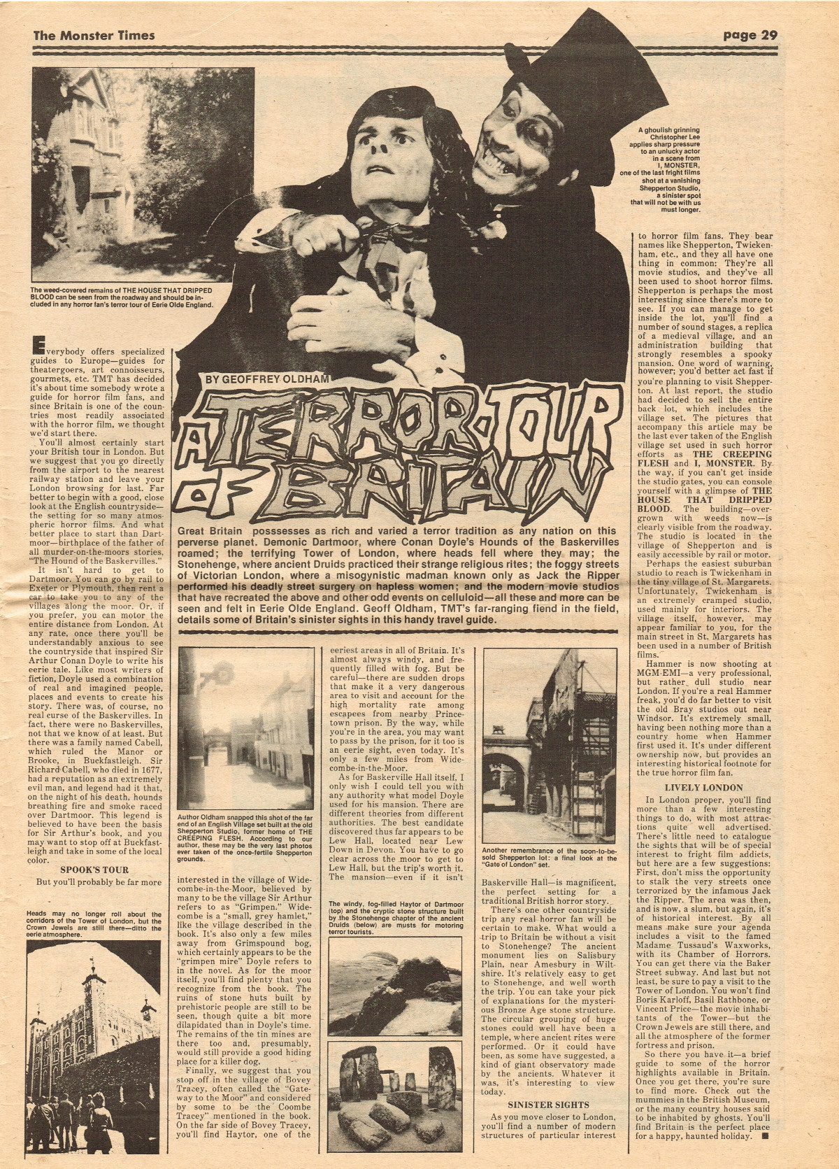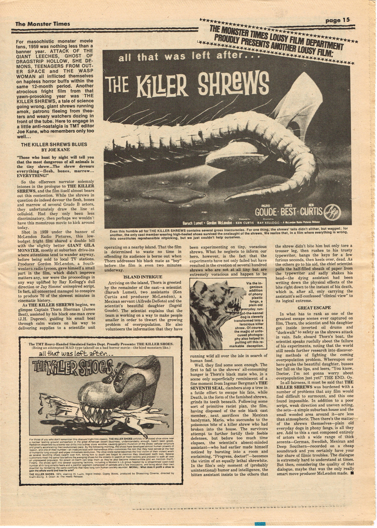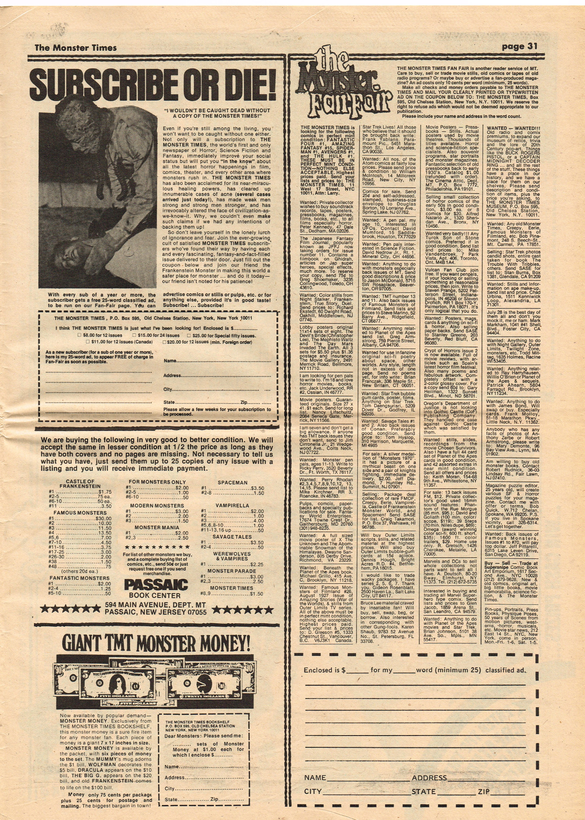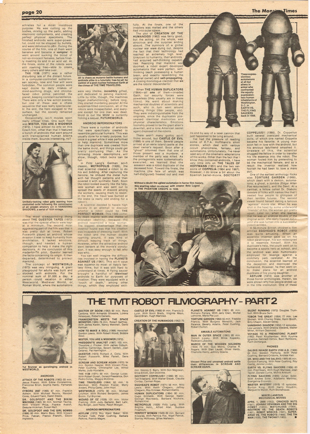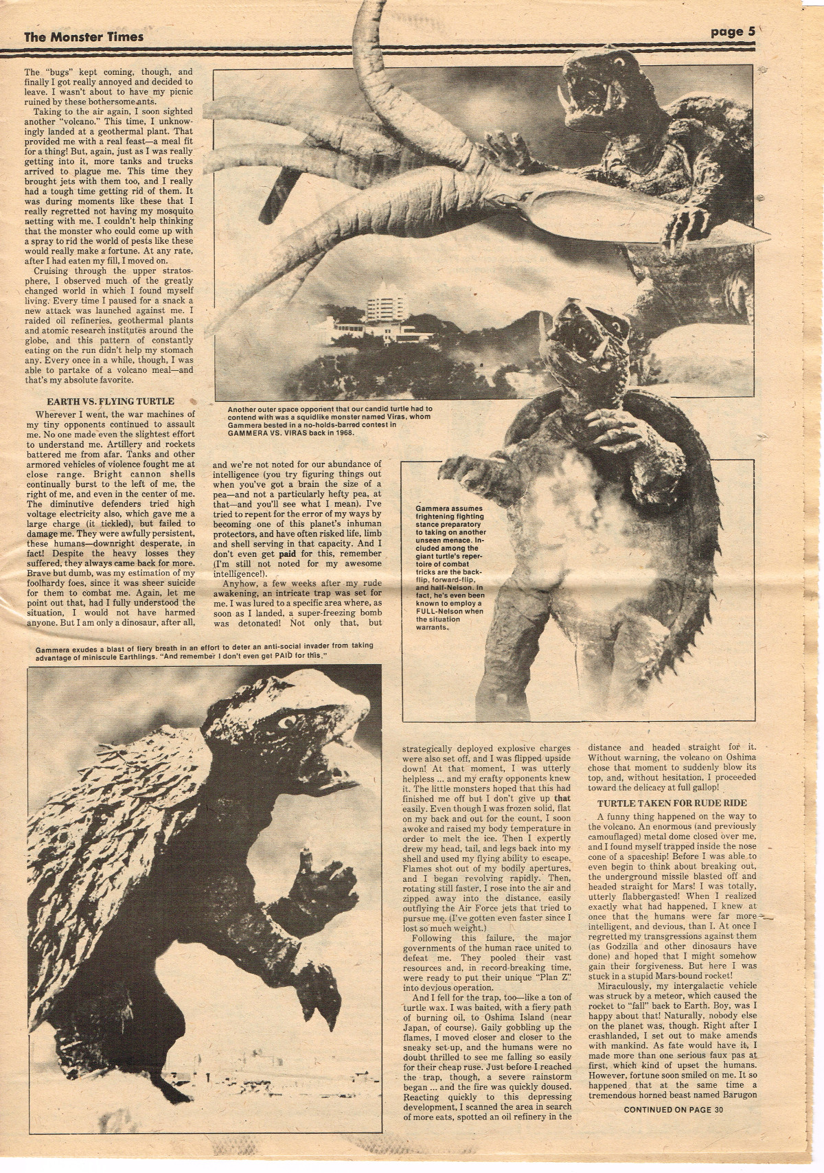 Gammera the Invincible kicks off this issue 37 of The Monster Times, while the Planet of the Apes television series is given due attention, as well as the X-rated Flesh Gordon, that naughty version of our favorite planet-tripping serial hero. I recall seeing this oddity in a somewhat scrubby looking theater. Ah, the 1970s! Oh, and director Brian Clemens is interviewed. On the comics-side, The Spectre Returns, and there's the nifty Con-Calendar giving the rundown on upcoming conventions ("As with most gatherings of fans, the conventions often border on the insane, but the people are friendly and there's always a good chance you'll pick up some rare item for your collection."). In the Lousy Film Department is The Killer Shrews. Articles like Robots in the Cinema and part 2 of The Gothic Tradition in Film by Professor John Tibett make this issue a class act (in spite of the Flesh Gordon blasting all over the Universe coverage, of course).