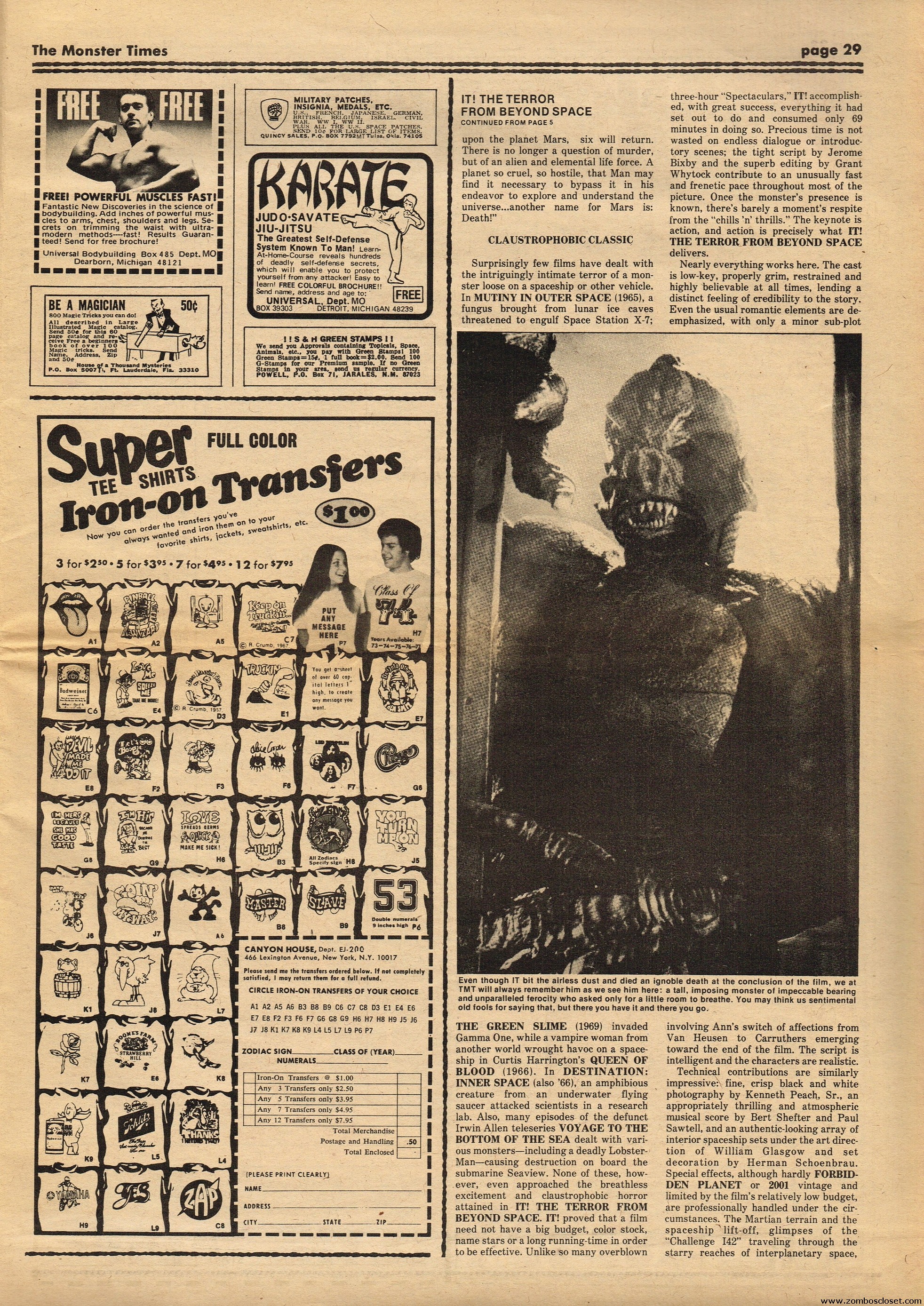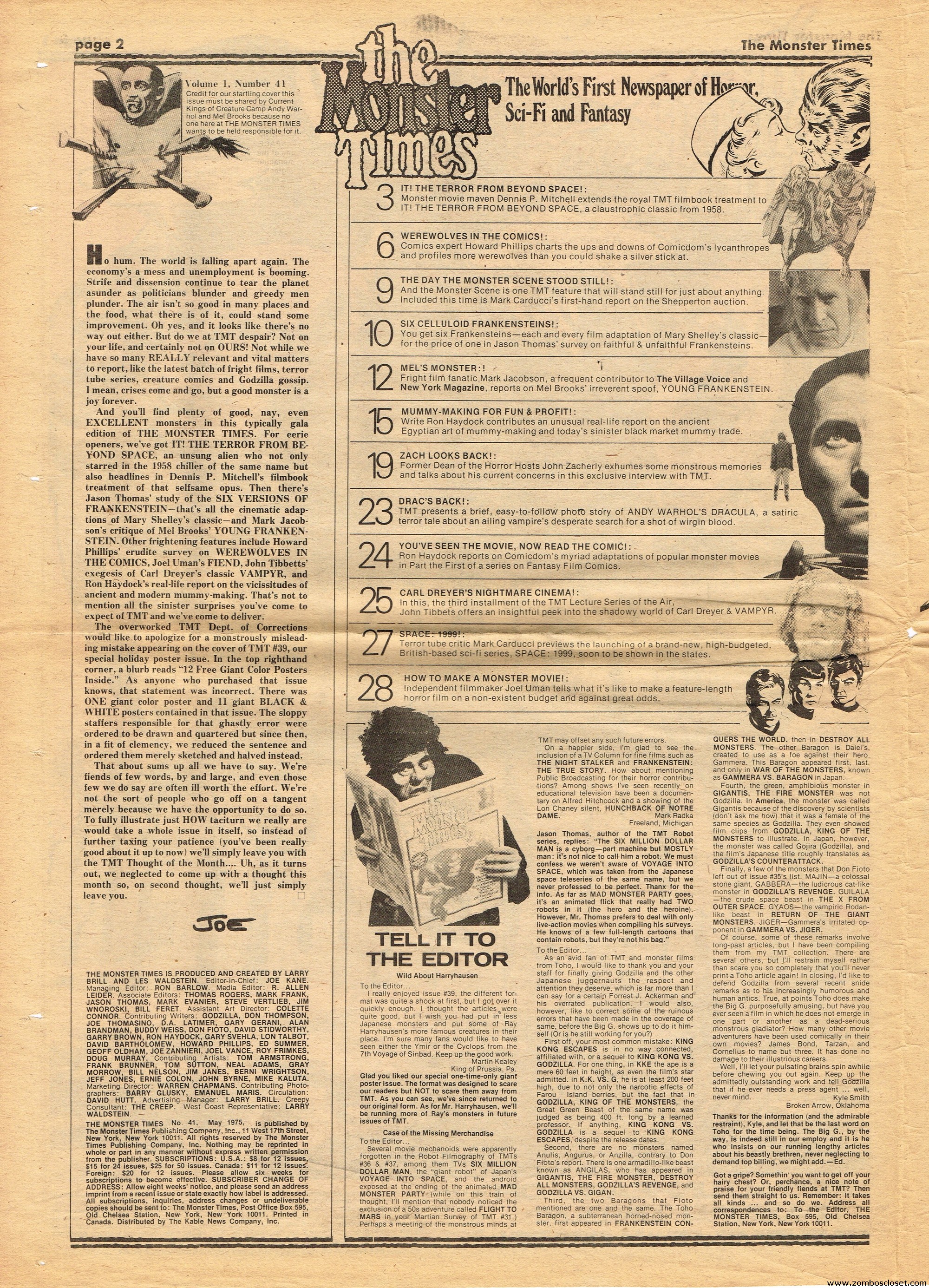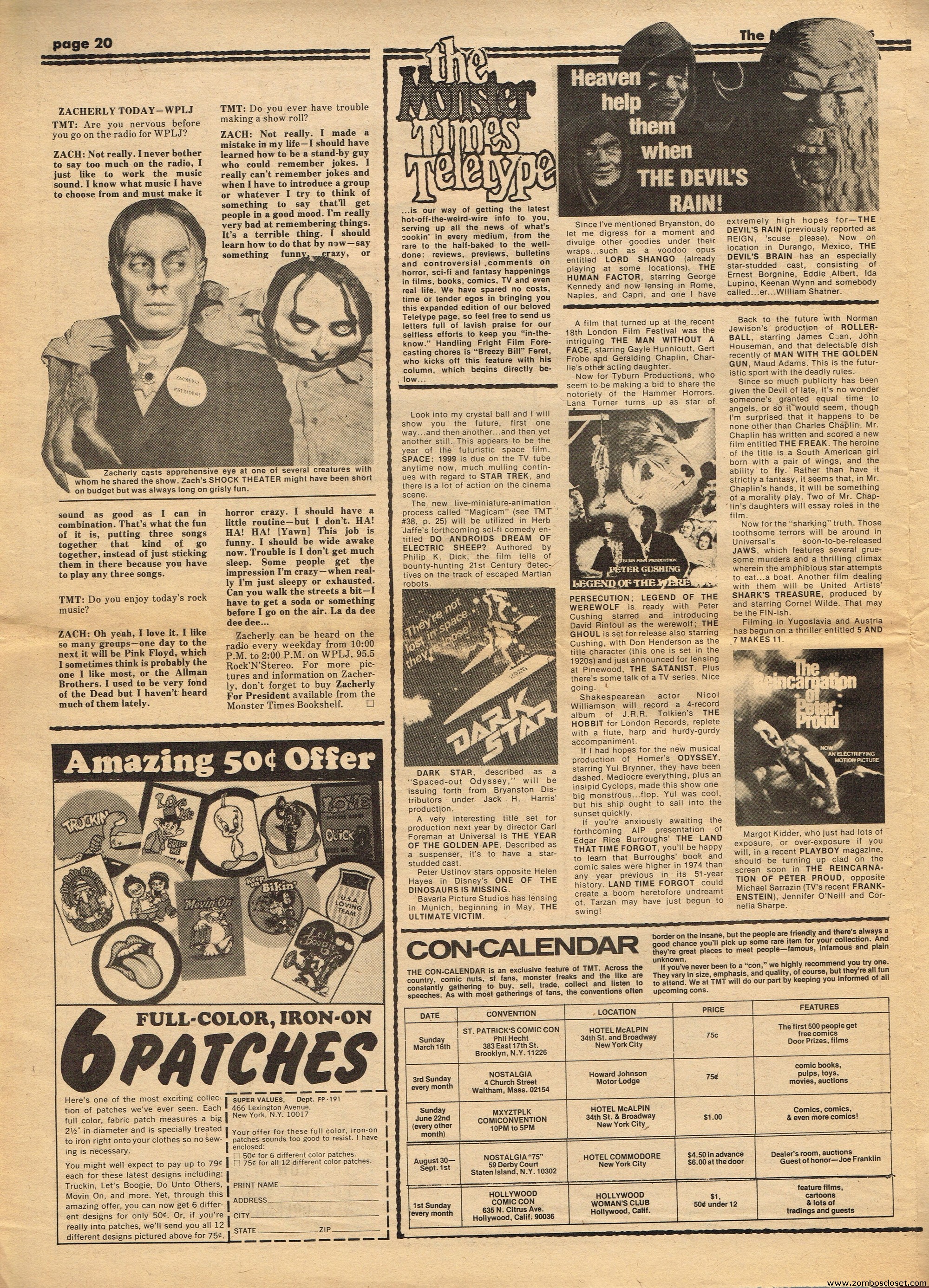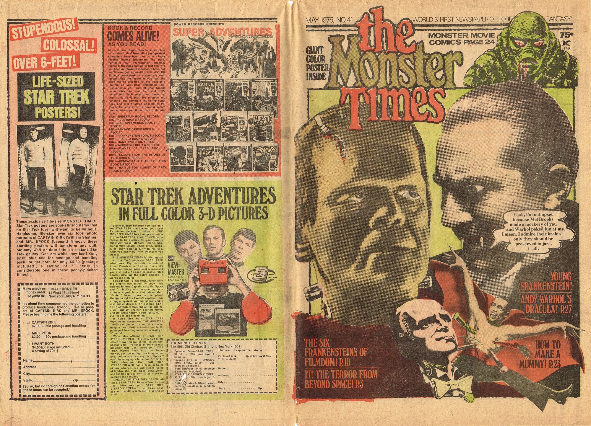 Issue 41 of The Monster Times has some monstrous coverage to sink your teeth into. There’s the wonderful low-budget It! The Terror From Beyond Space, Werewolf comic books are howled at, Six Versions of Frankenstein (up till then, of course) are counted, a mostly I’m-disappointed review of Young Frankenstein (now generally considered a comedy-horror classic), and How to Make a Mummy for Fun and Profit (which, disappointingly, is actually about the actual mummification process). The best part is Looking Back With Zach: An Interview With John Zacherly. One annoyance though: during the interview they showed Zackerly a photo of him with a very young Richard Thomas, taken out on Long Island, New York. “They” didn’t bother to actually include the photo, although Zacherly explains it. I’d love to have seen THE PHOTO. Space:1999 and How to Make a Monster Movie round out the issue.