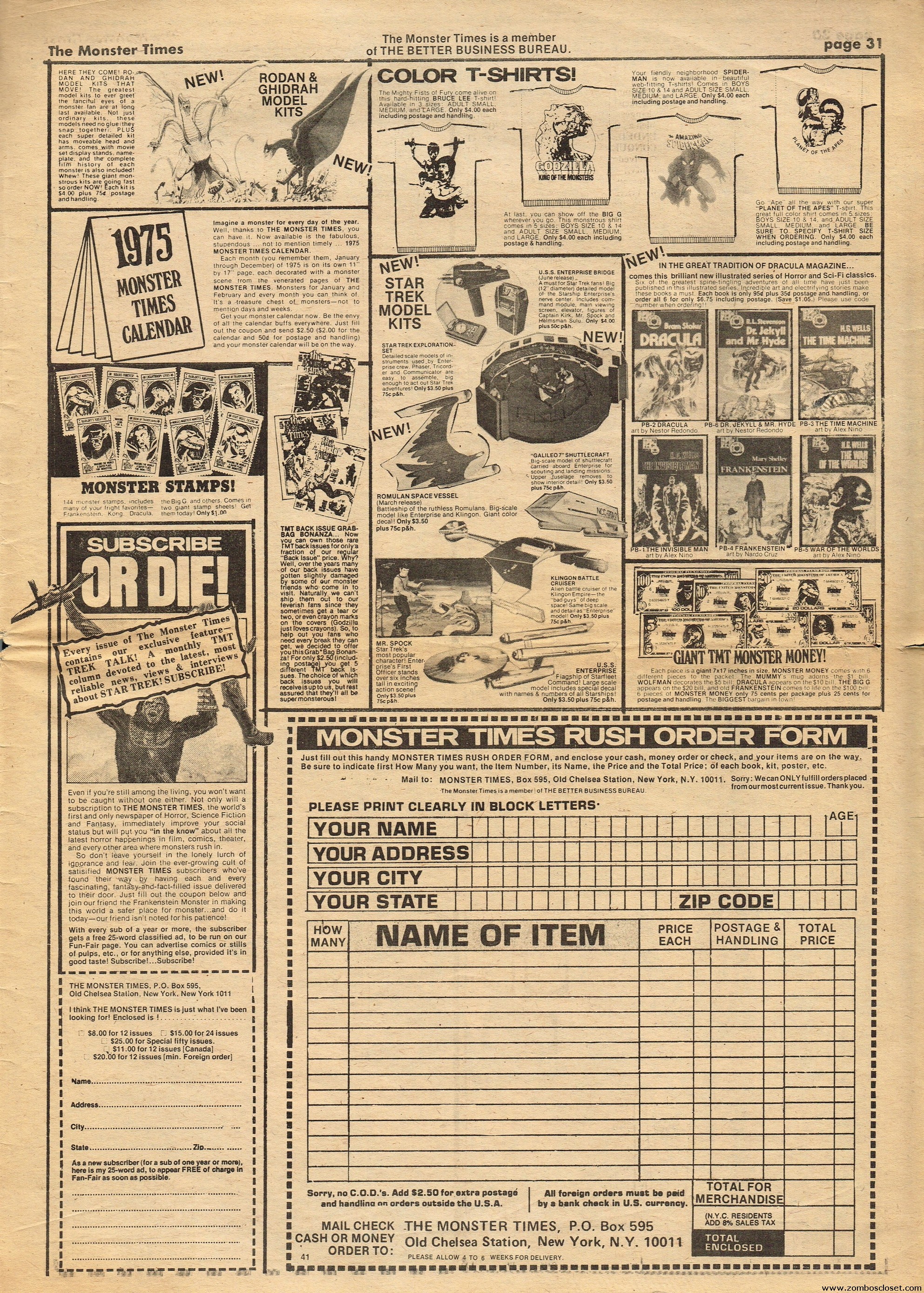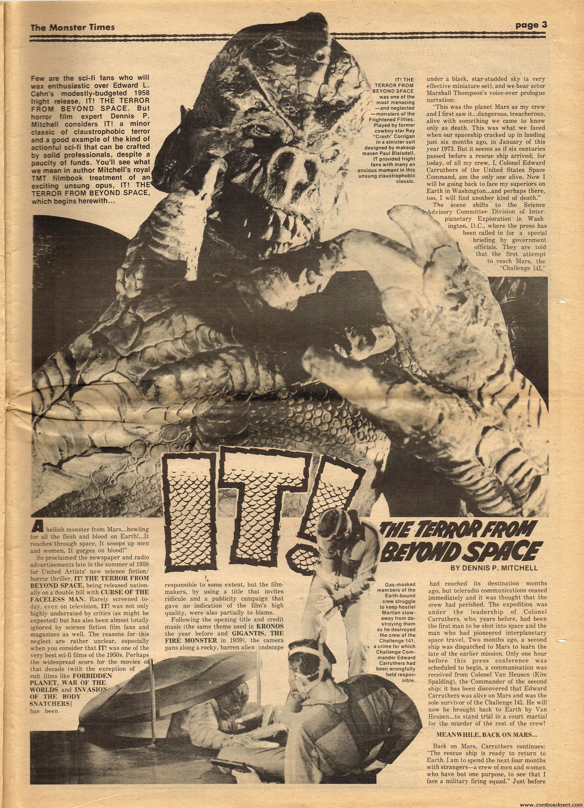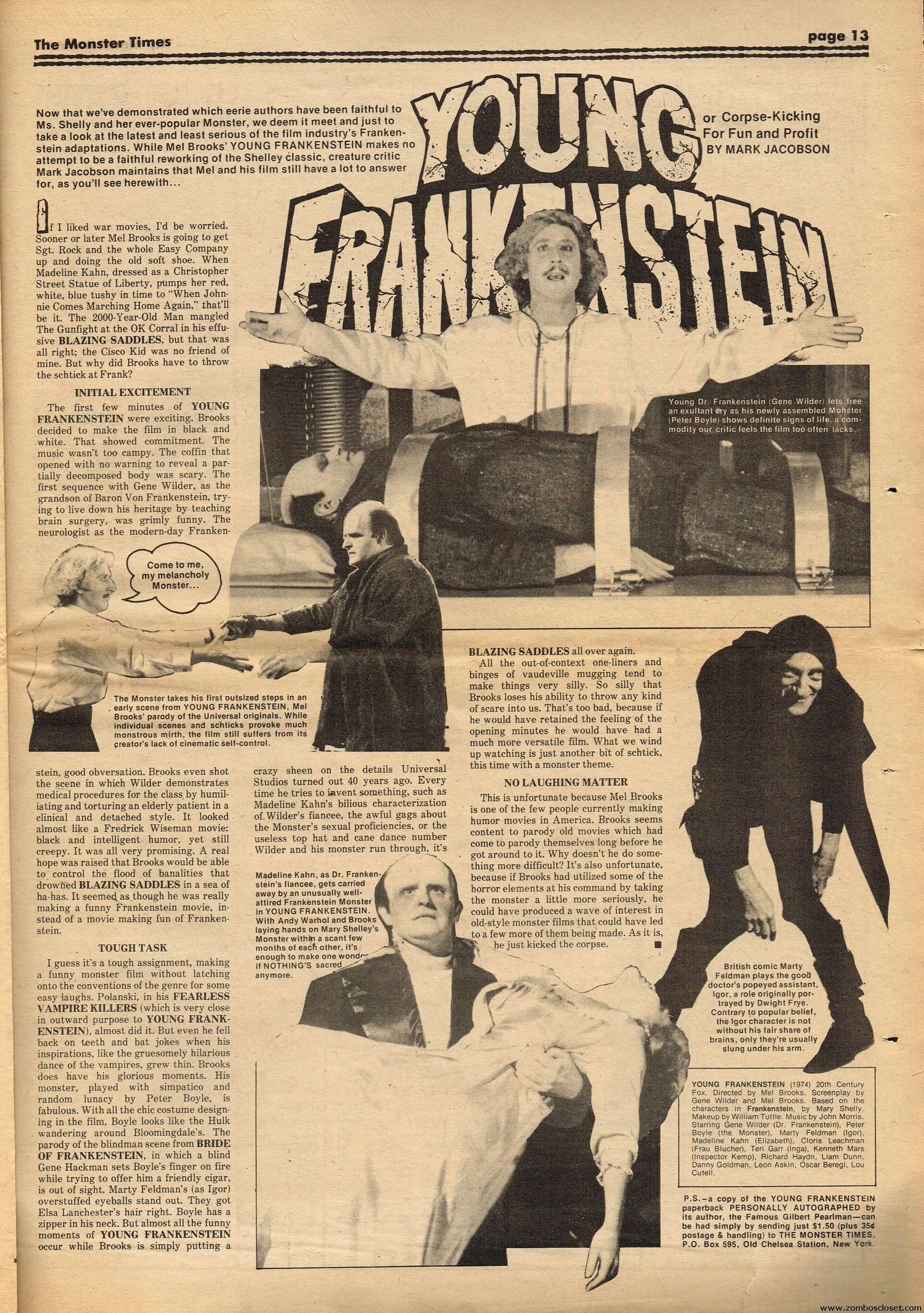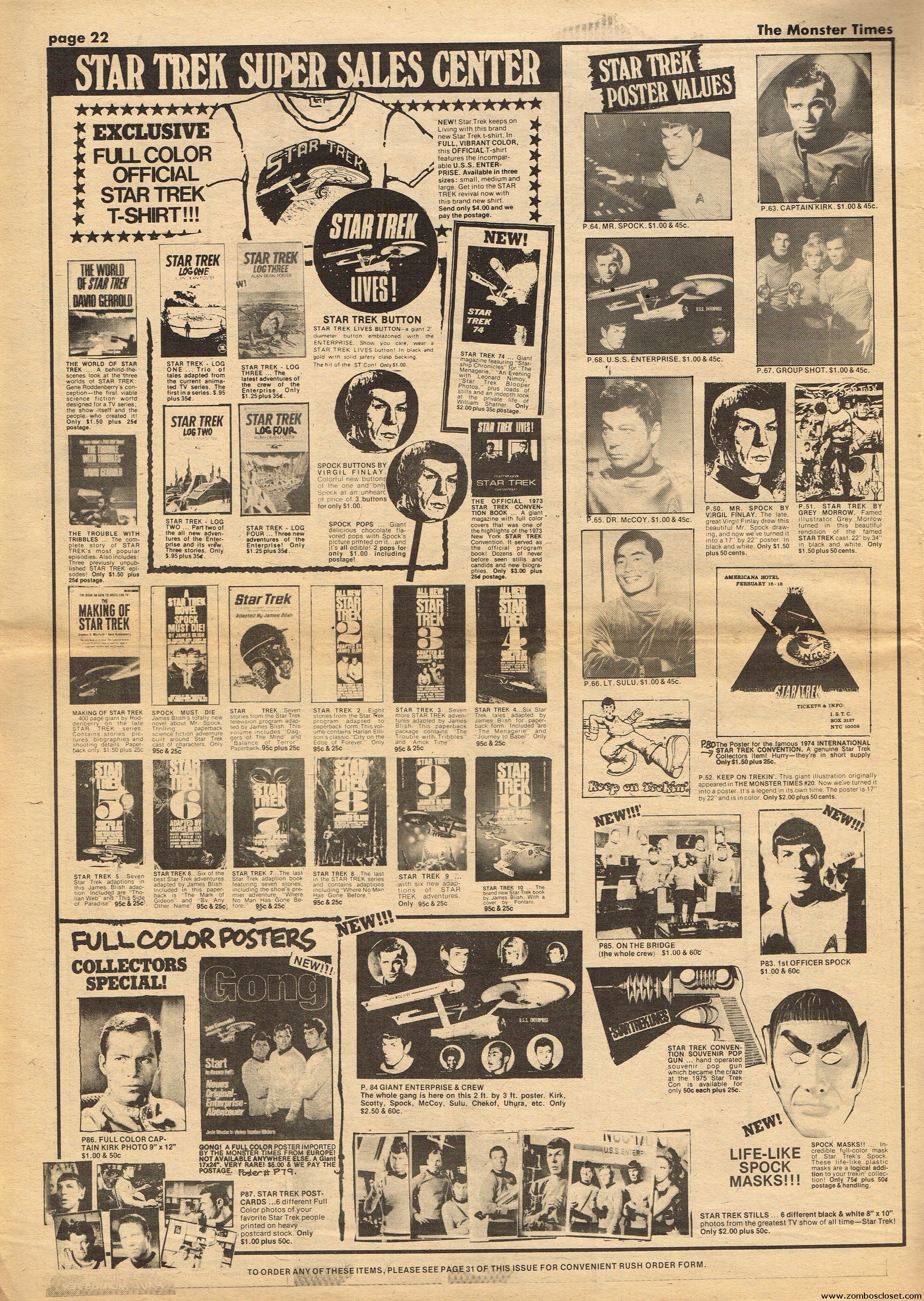 Issue 41 of The Monster Times has some monstrous coverage to sink your teeth into. There’s the wonderful low-budget It! The Terror From Beyond Space, Werewolf comic books are howled at, Six Versions of Frankenstein (up till then, of course) are counted, a mostly I’m-disappointed review of Young Frankenstein (now generally considered a comedy-horror classic), and How to Make a Mummy for Fun and Profit (which, disappointingly, is actually about the actual mummification process). The best part is Looking Back With Zach: An Interview With John Zacherly. One annoyance though: during the interview they showed Zackerly a photo of him with a very young Richard Thomas, taken out on Long Island, New York. “They” didn’t bother to actually include the photo, although Zacherly explains it. I’d love to have seen THE PHOTO. Space:1999 and How to Make a Monster Movie round out the issue.