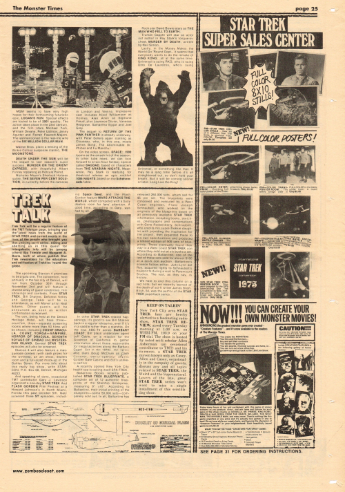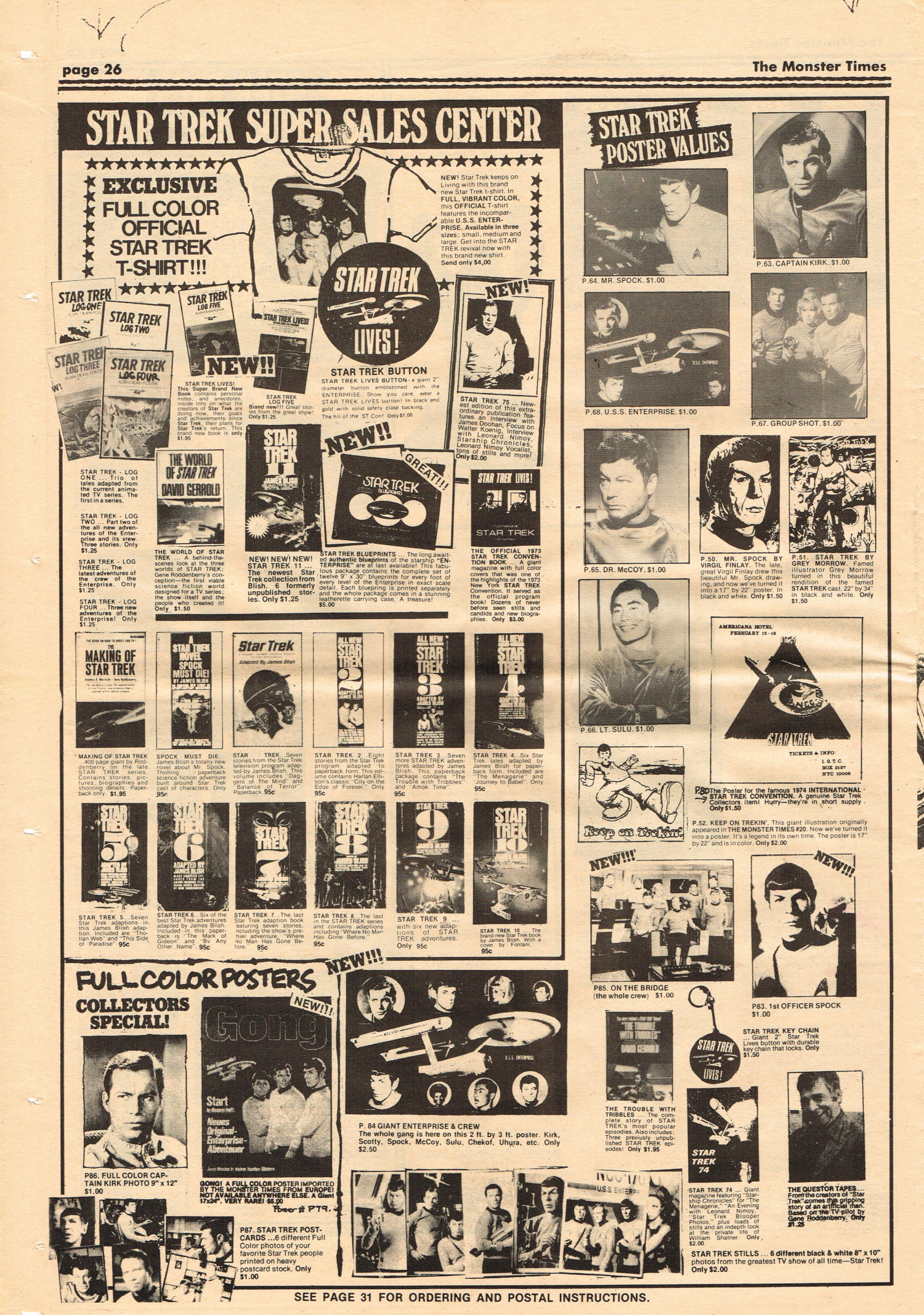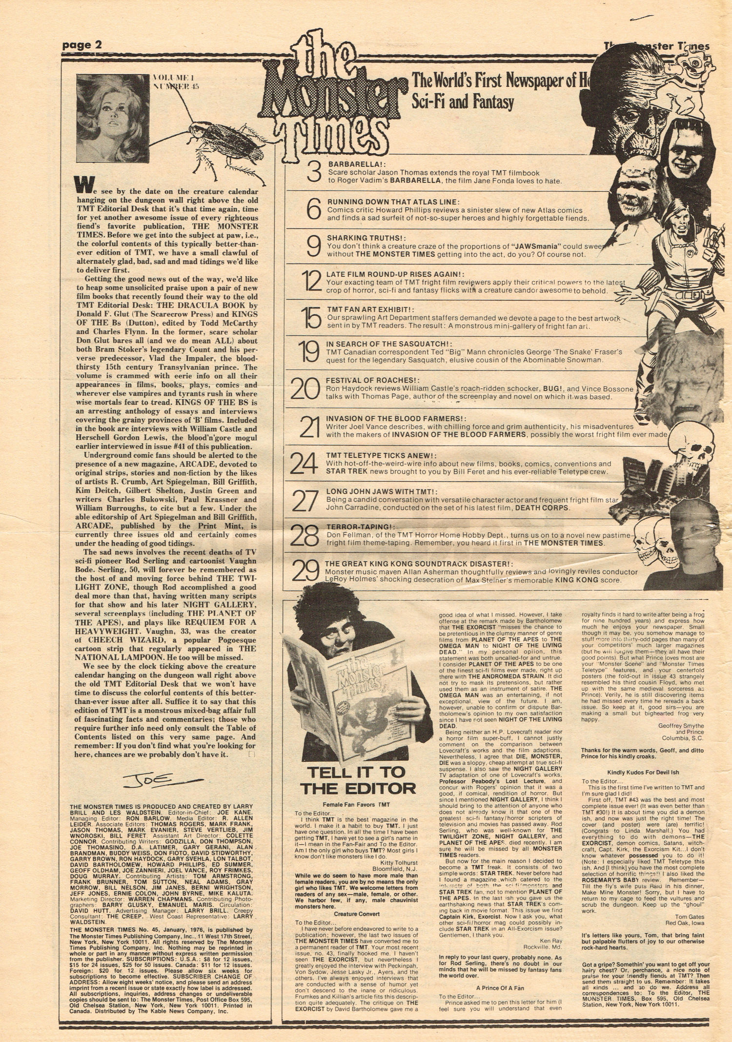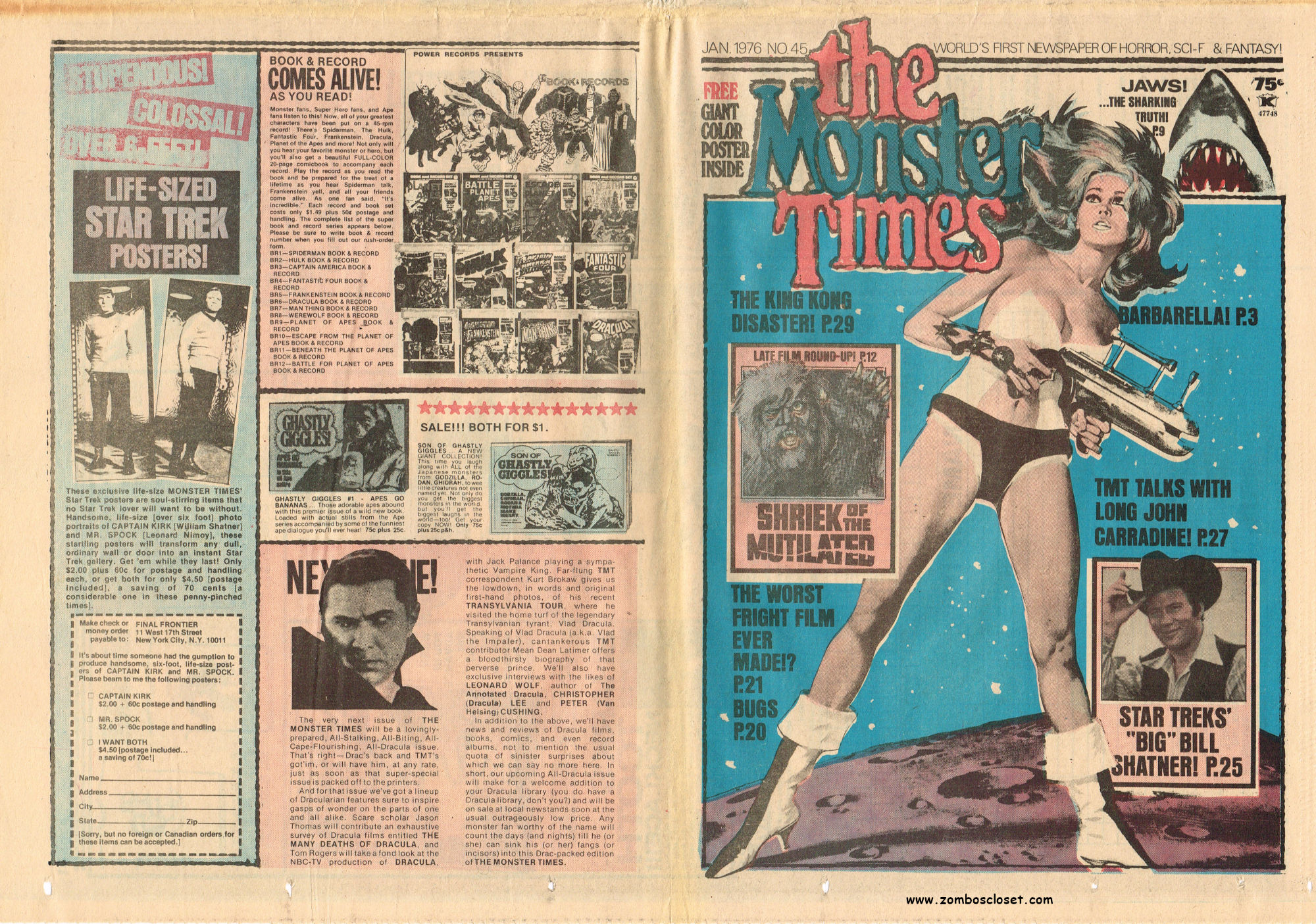 Issue 45 of The Monster Times has Horror Themes for the Taping, an interview with John Carradine, the Teletype and Trek Talk, and coverage on Bug! and Jaws mania. For horror comics fans, Atlas' Monsters and Heroes gives a good rundown on their horrific comics. Enjoy.