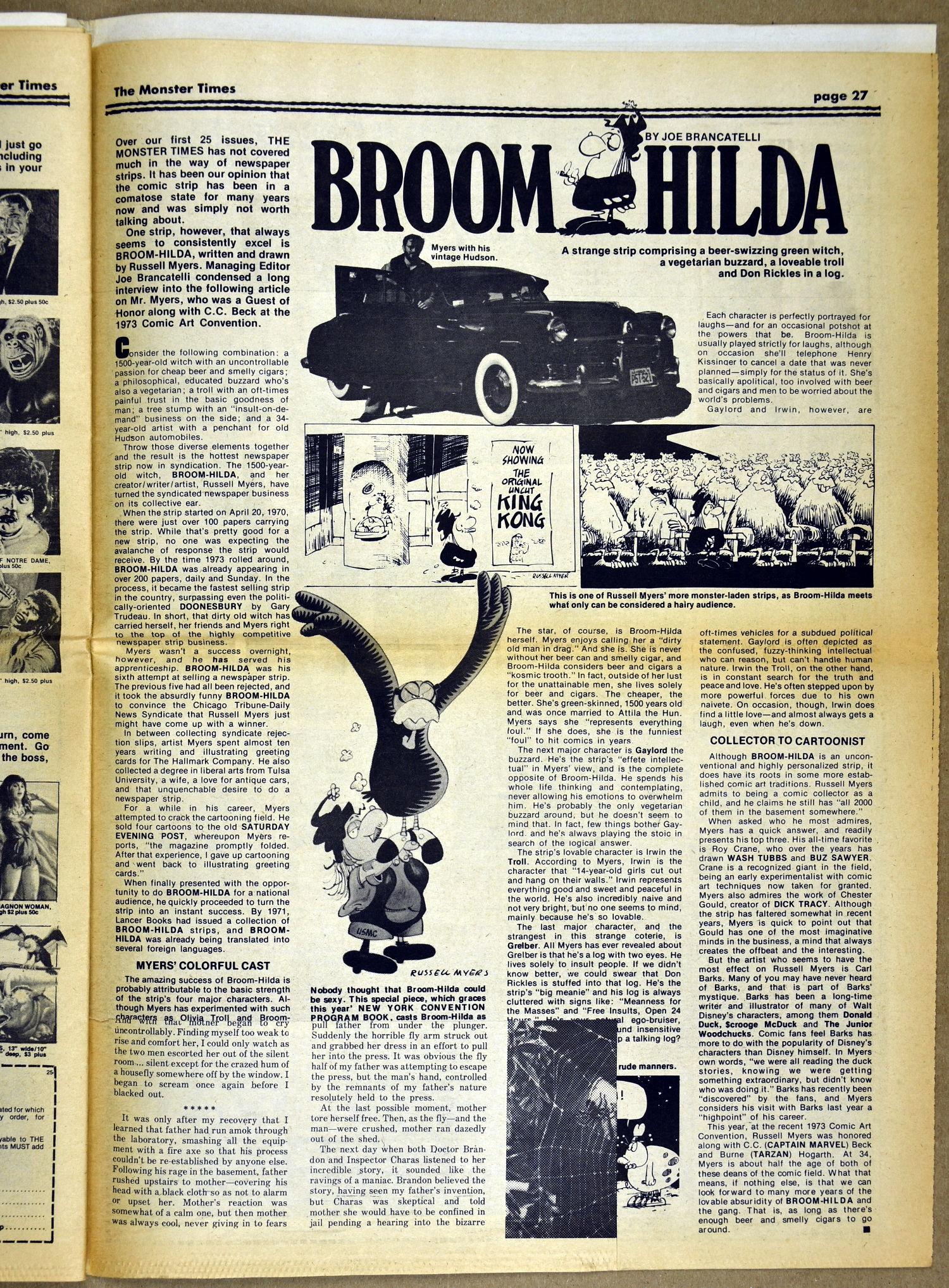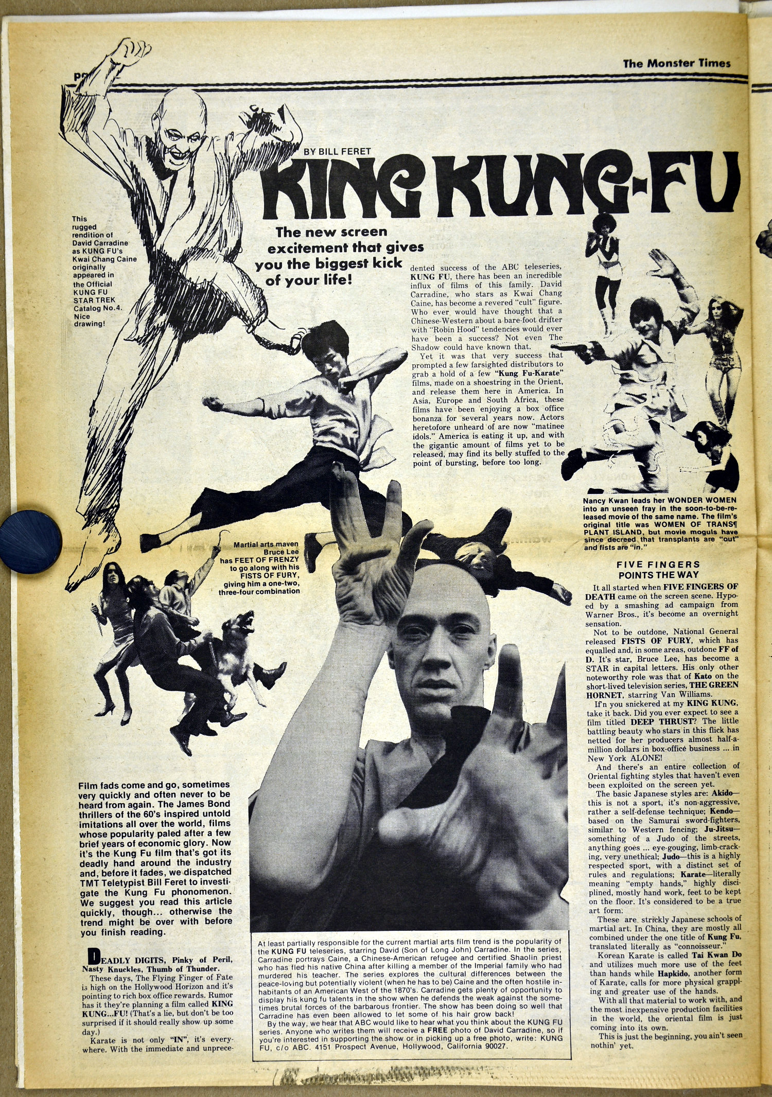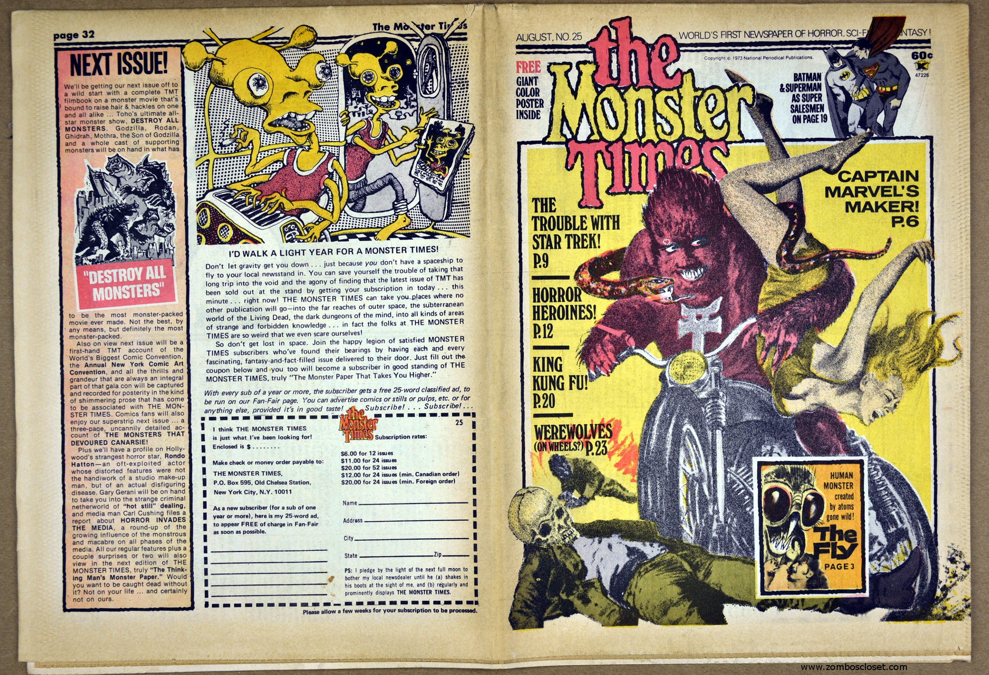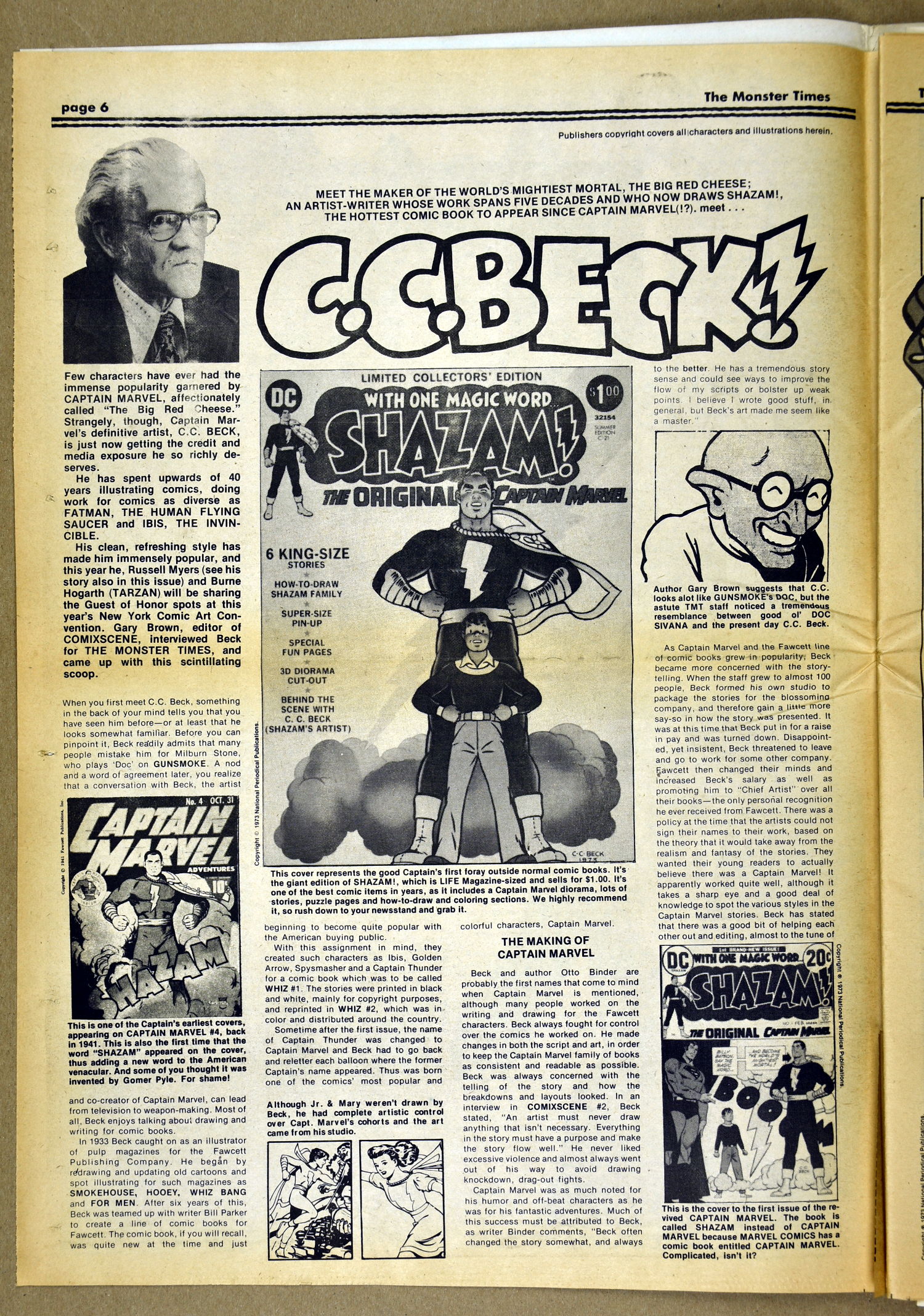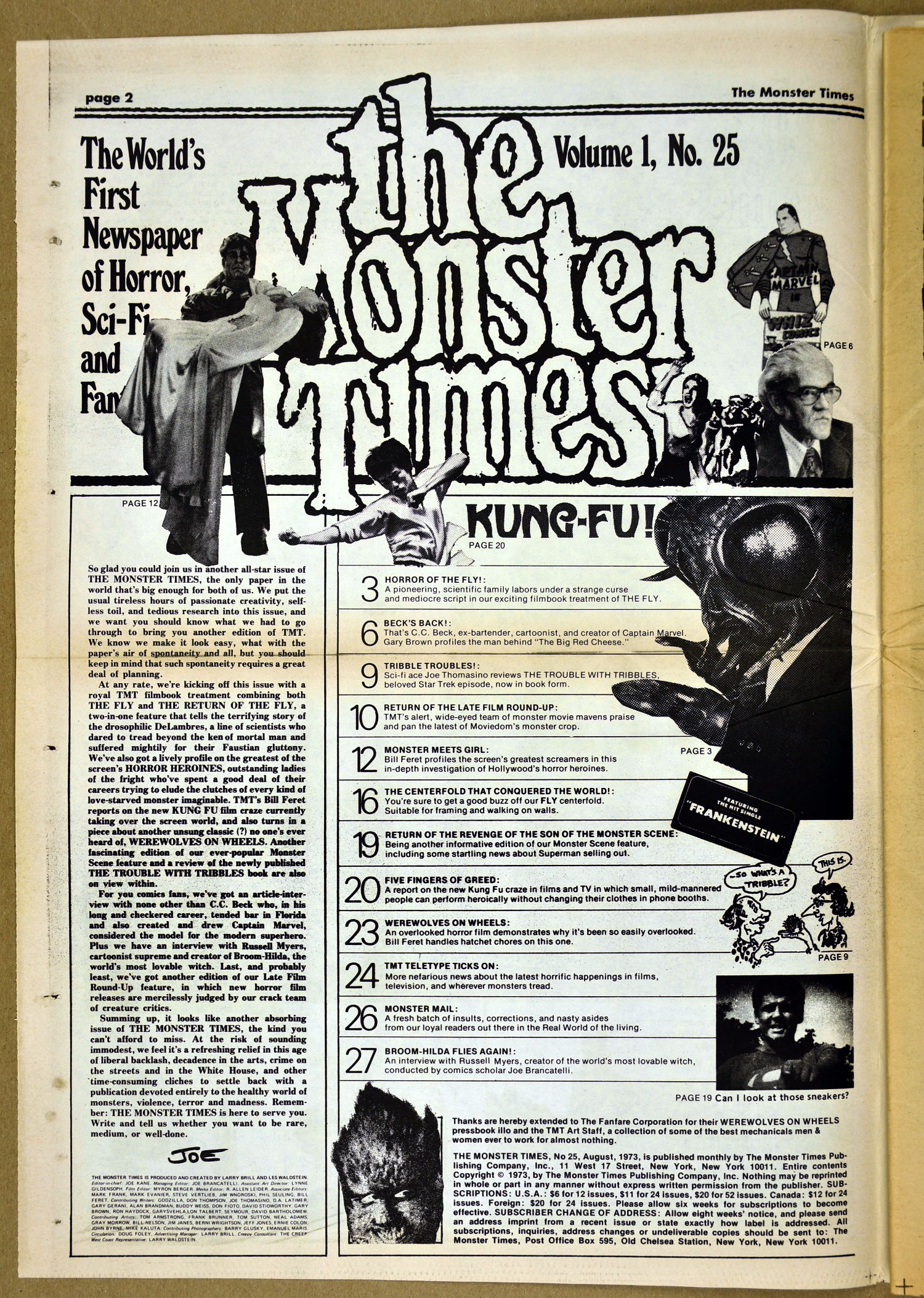 The Fly and Return of the Fly buzzes around issue 25 of The Monster Times as Jim Wnoroski takes a swat at the movies, and C.C. Beck is marveled for his artistic work on Captain Marvel. I recall seeing Mr. Beck at one of Phil Seuling's Comic Art Conventions. Beck's hobby was to create very realistic sword and sorcery weapons out of paper and cardboard. He auctioned off some of these at the convention. Seuling, a big fellow, let down his hair (he really did, as he let it grow long) and grabbed a mighty Beck-crafted axe, then posed a la Conan for photo ops. Hopefully, some of those pictures still exist. I also had picked up one of the weapons to check it out and was surprised to find it light as a feather, but very realistic in appearance. Also in this issue, horror heroines get some love, and the Kung Fu craze kicks up the action.