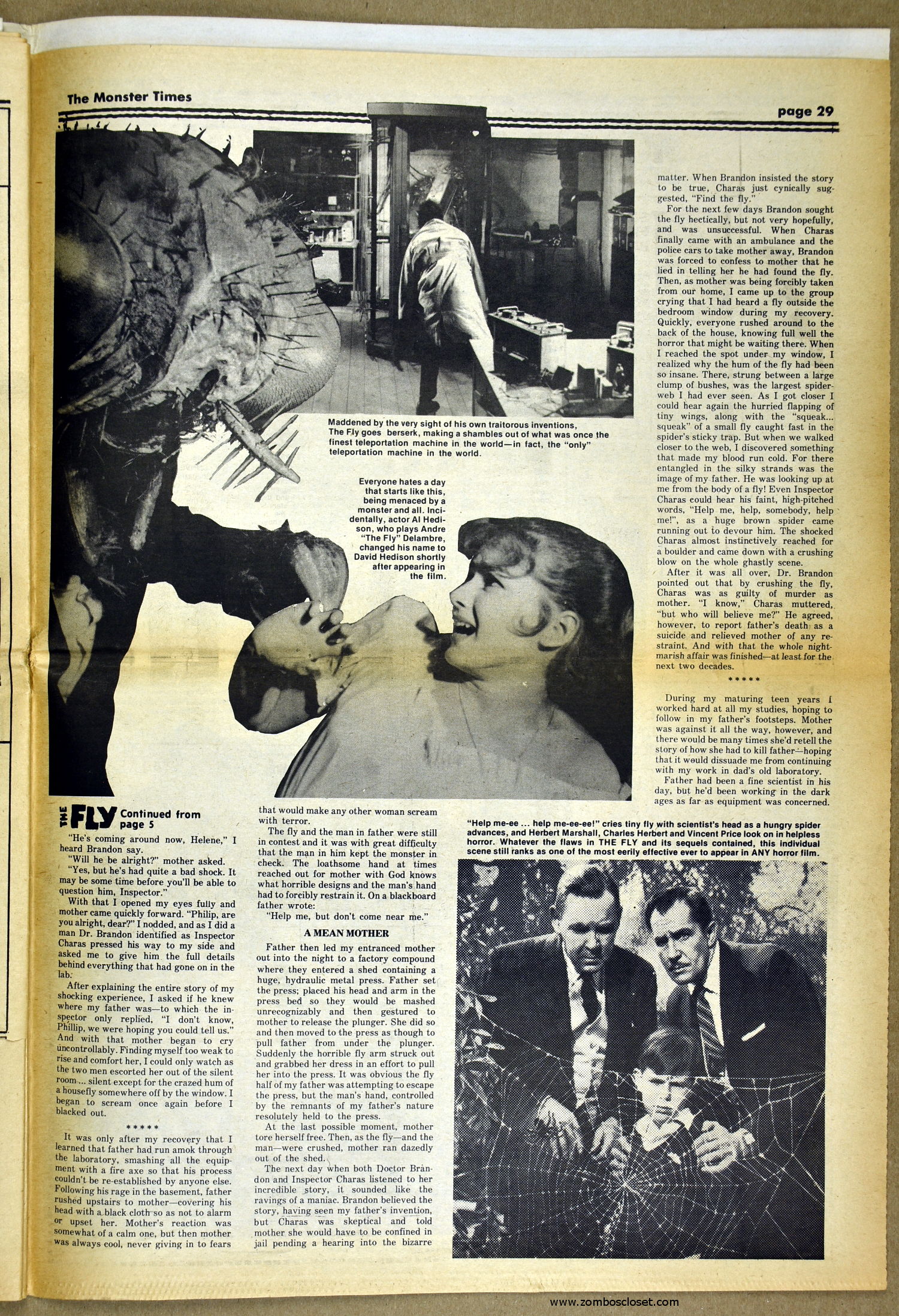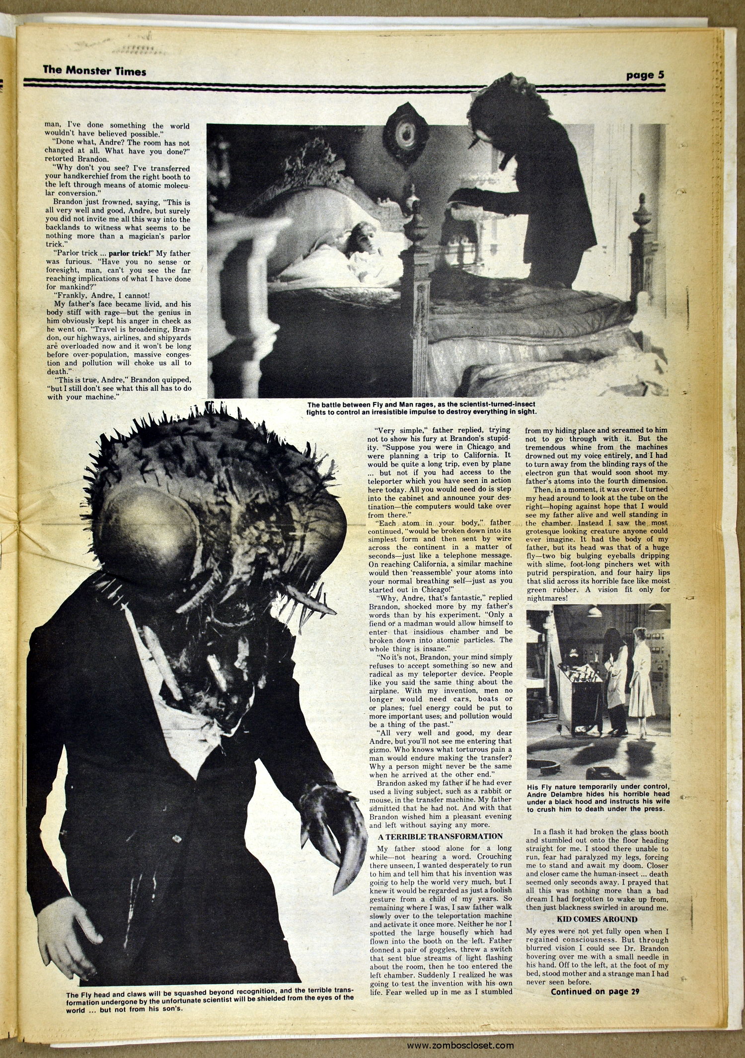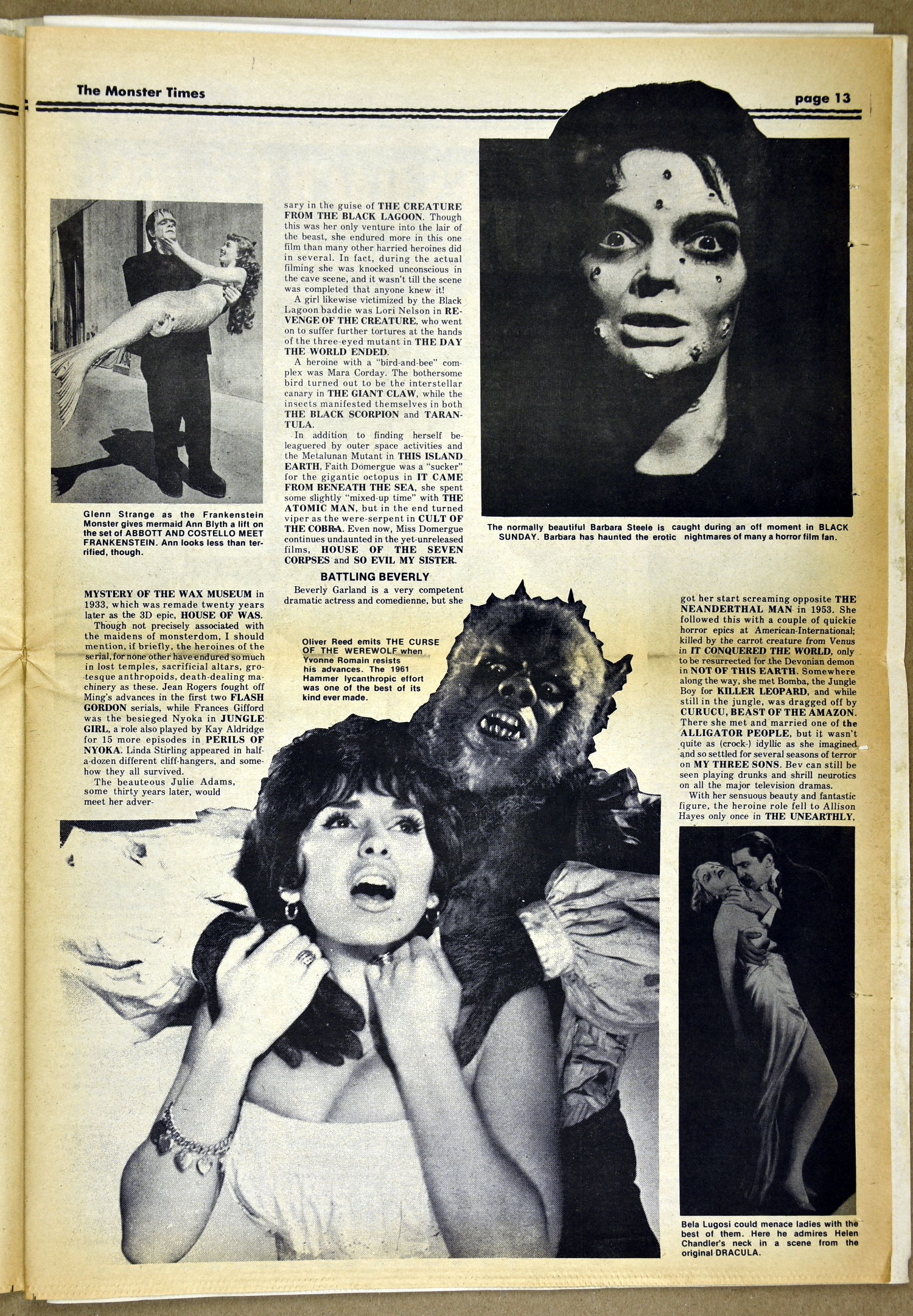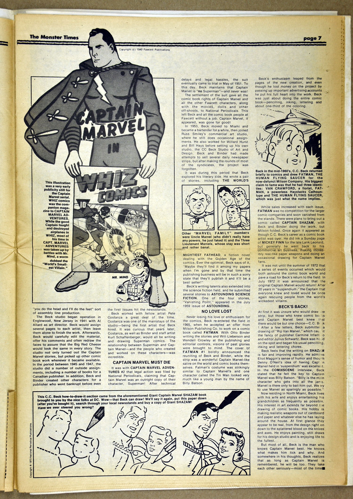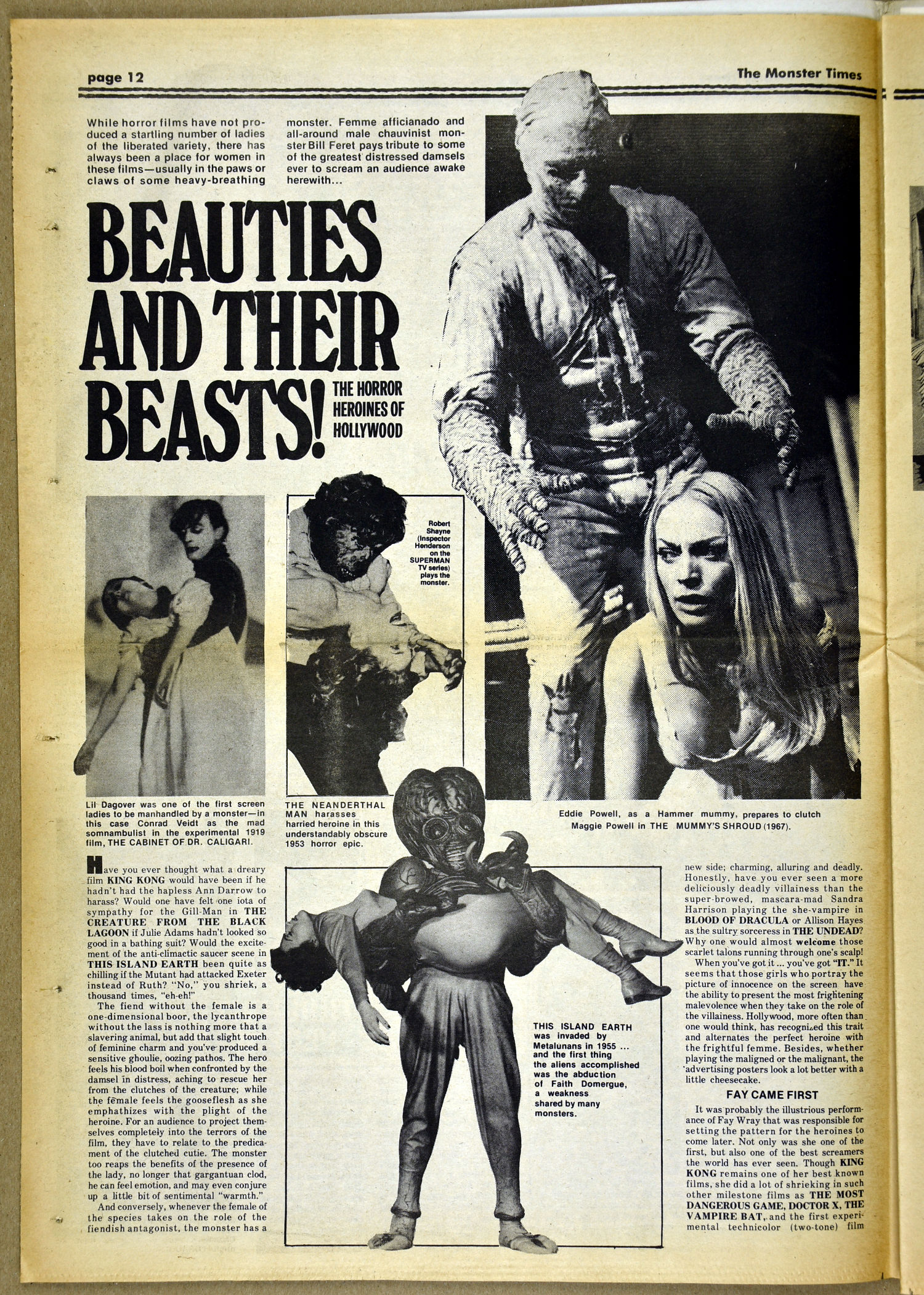 The Fly and Return of the Fly buzzes around issue 25 of The Monster Times as Jim Wnoroski takes a swat at the movies, and C.C. Beck is marveled for his artistic work on Captain Marvel. I recall seeing Mr. Beck at one of Phil Seuling's Comic Art Conventions. Beck's hobby was to create very realistic sword and sorcery weapons out of paper and cardboard. He auctioned off some of these at the convention. Seuling, a big fellow, let down his hair (he really did, as he let it grow long) and grabbed a mighty Beck-crafted axe, then posed a la Conan for photo ops. Hopefully, some of those pictures still exist. I also had picked up one of the weapons to check it out and was surprised to find it light as a feather, but very realistic in appearance. Also in this issue, horror heroines get some love, and the Kung Fu craze kicks up the action.