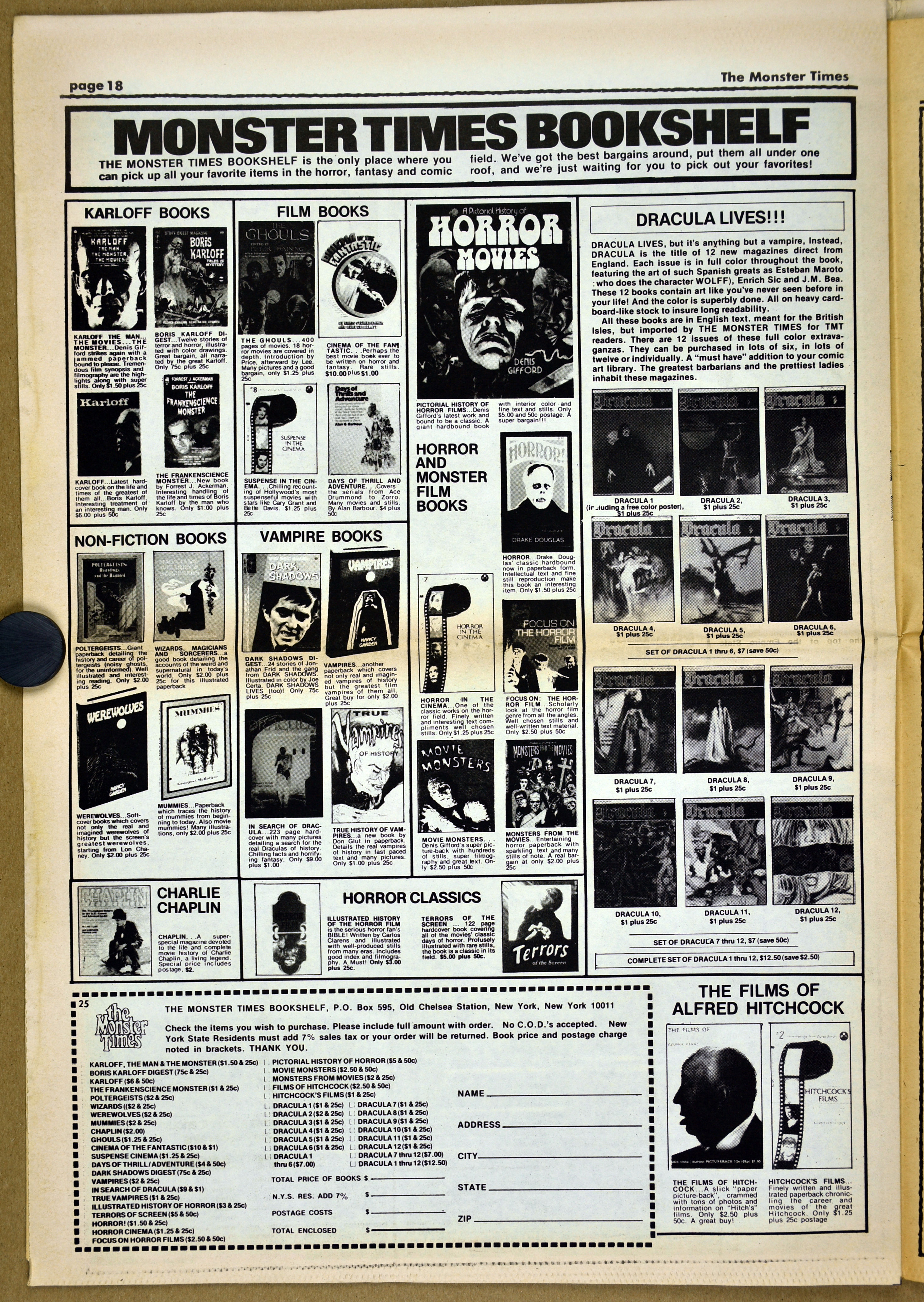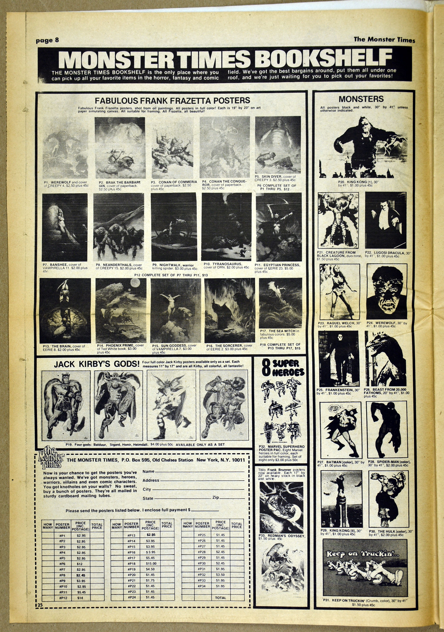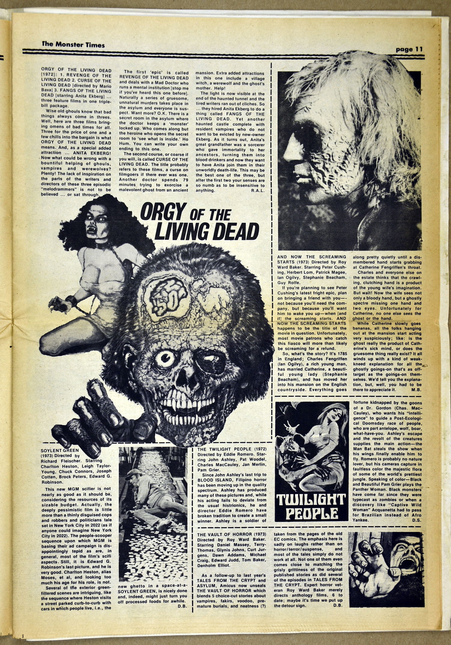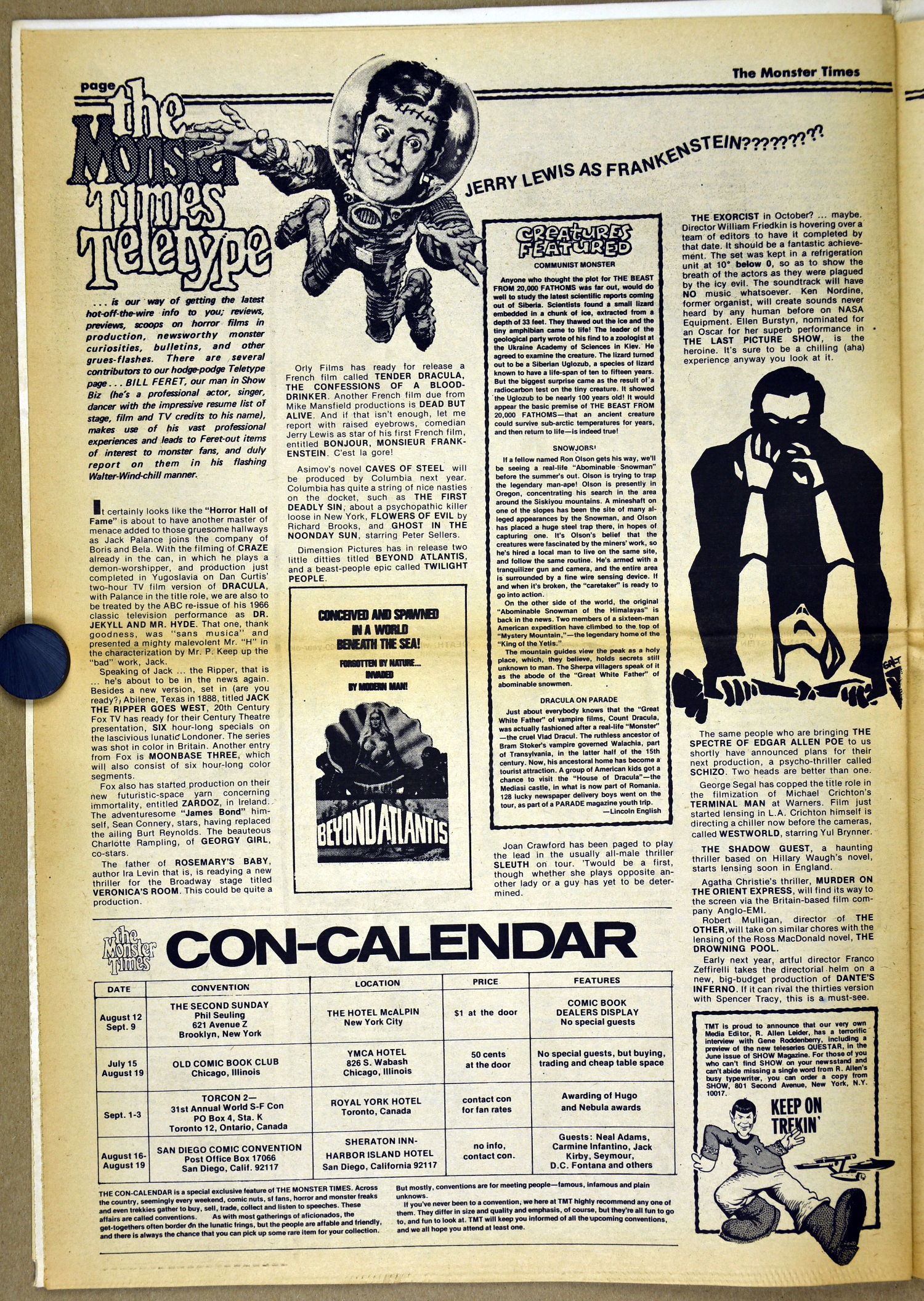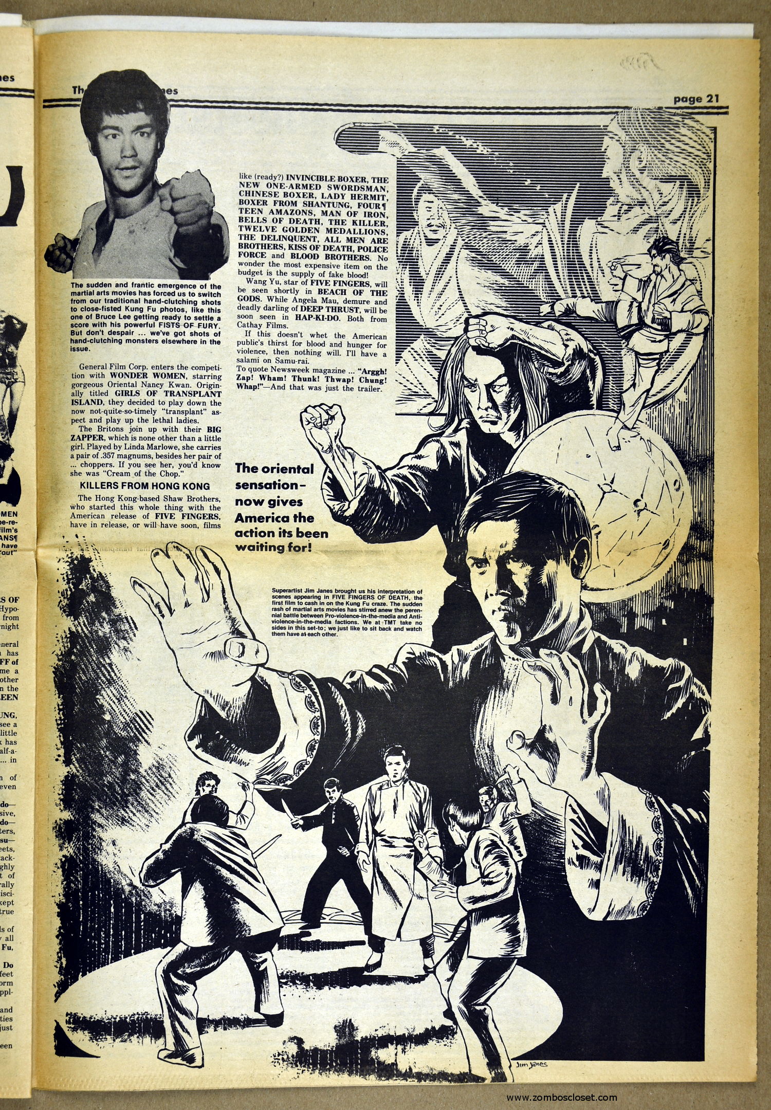 The Fly and Return of the Fly buzzes around issue 25 of The Monster Times as Jim Wnoroski takes a swat at the movies, and C.C. Beck is marveled for his artistic work on Captain Marvel. I recall seeing Mr. Beck at one of Phil Seuling's Comic Art Conventions. Beck's hobby was to create very realistic sword and sorcery weapons out of paper and cardboard. He auctioned off some of these at the convention. Seuling, a big fellow, let down his hair (he really did, as he let it grow long) and grabbed a mighty Beck-crafted axe, then posed a la Conan for photo ops. Hopefully, some of those pictures still exist. I also had picked up one of the weapons to check it out and was surprised to find it light as a feather, but very realistic in appearance. Also in this issue, horror heroines get some love, and the Kung Fu craze kicks up the action.