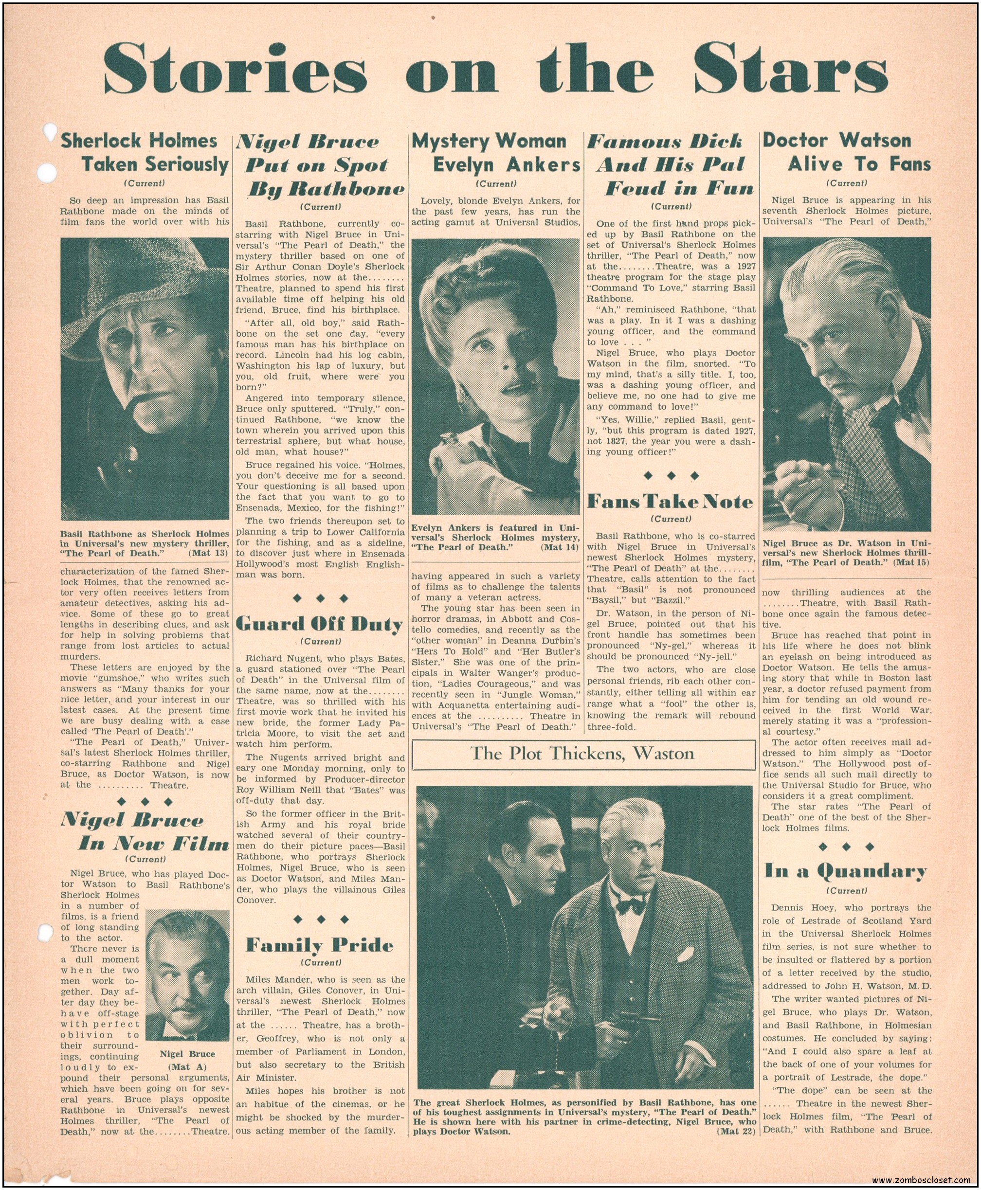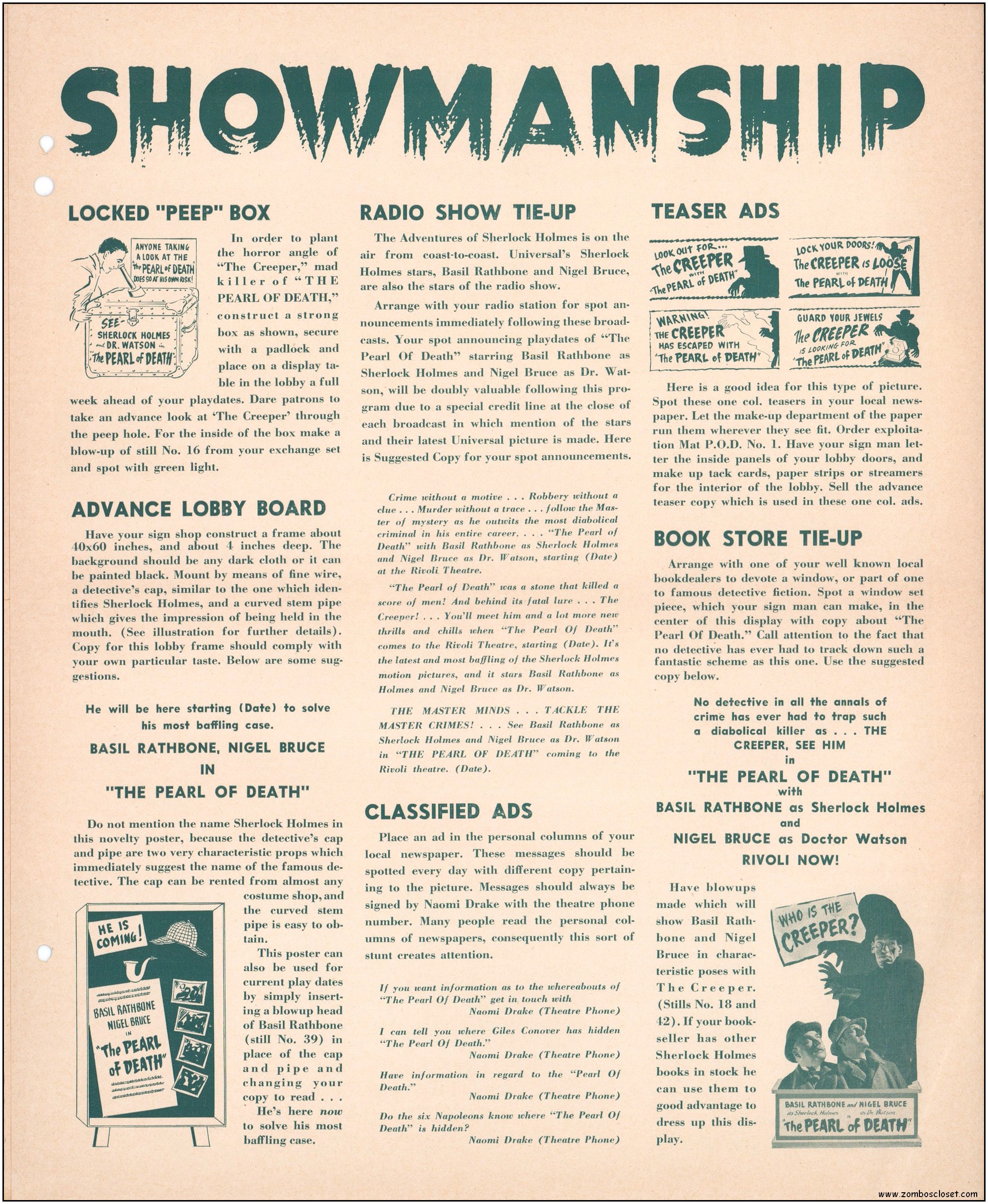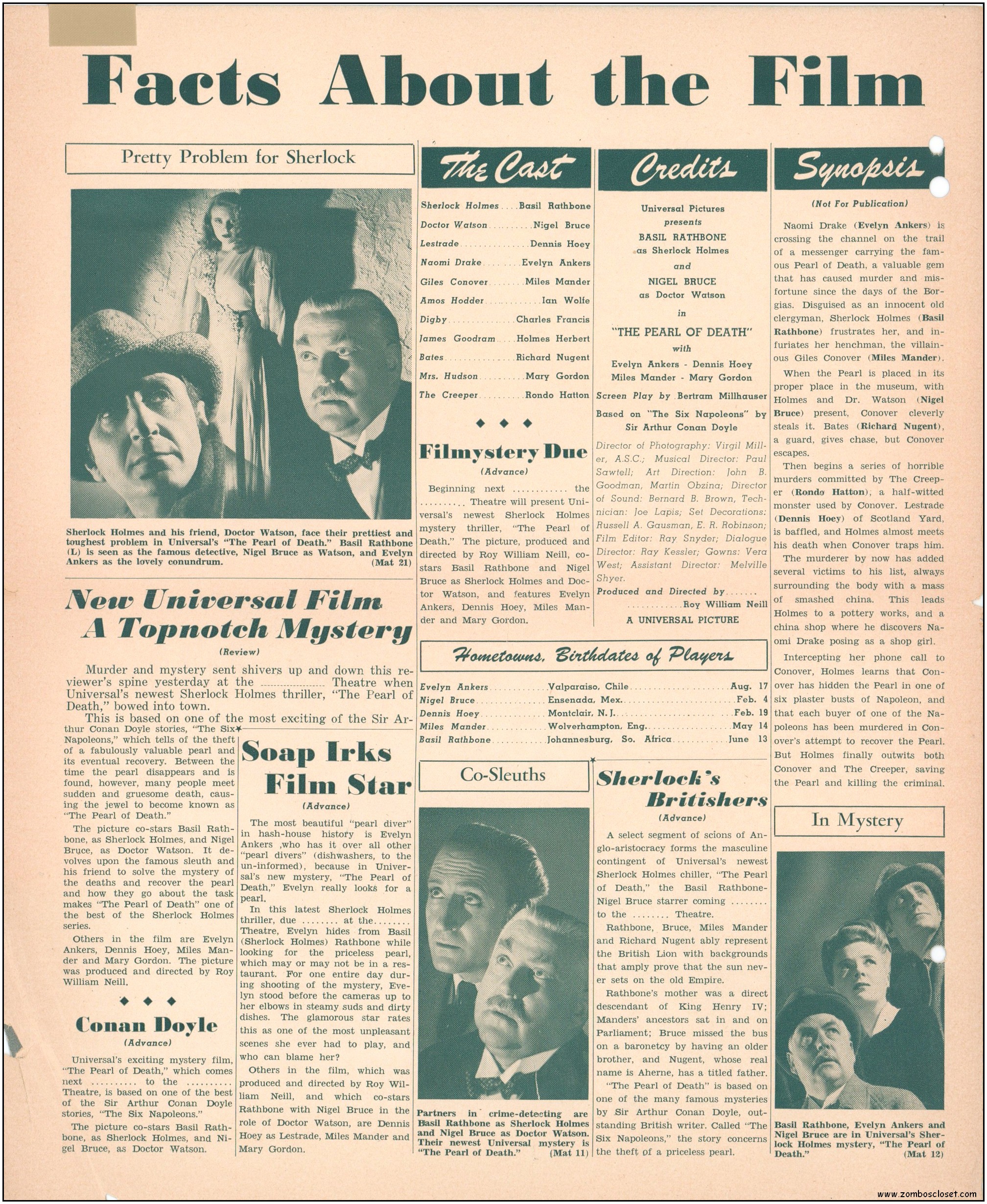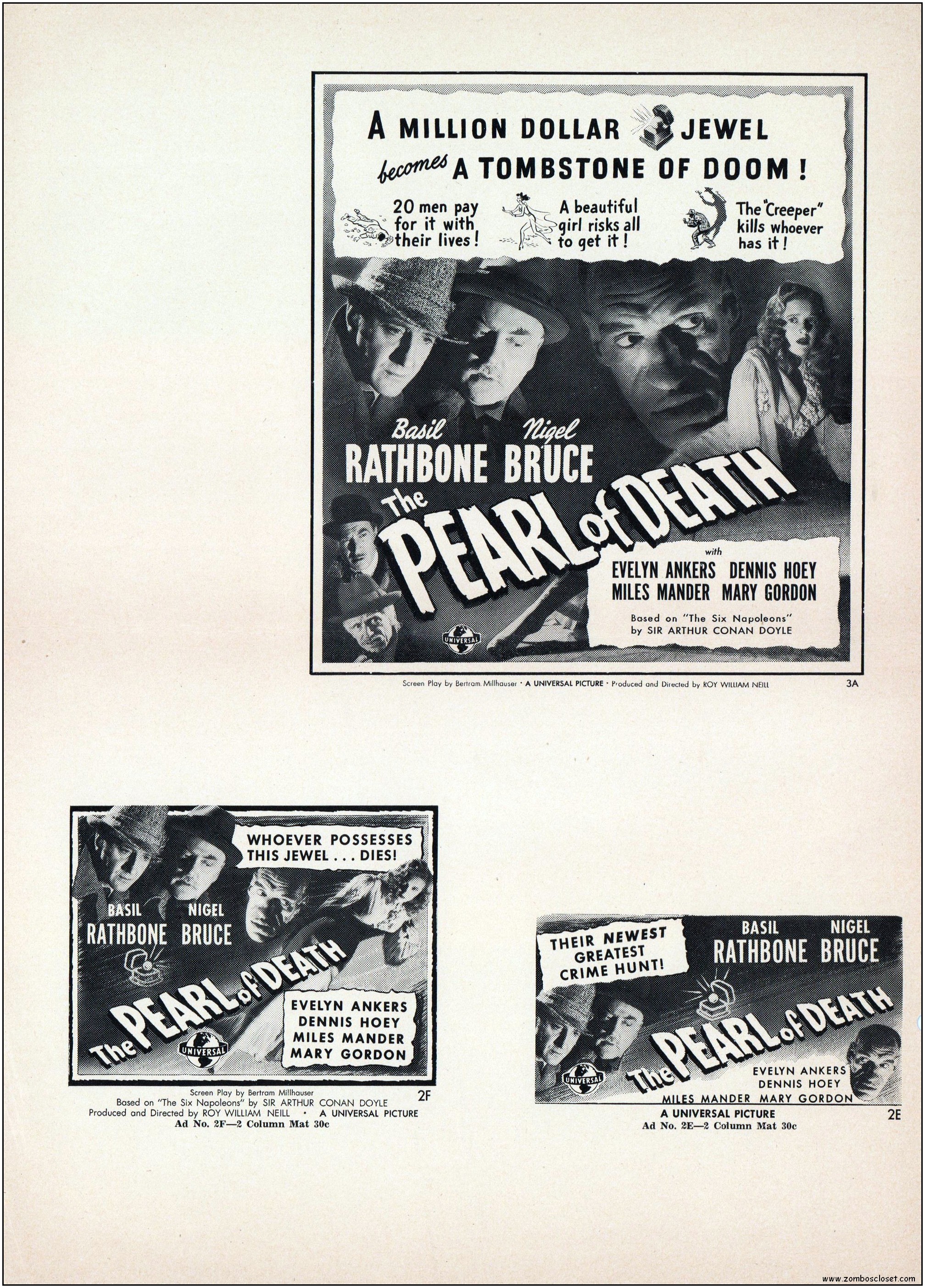 This, The Pearl of Death, pressbook comes courtesy of director Joe Dante (Trailers from Hell, Gremlins, The ‘Burbs, The Howling, and more). Interesting story: I received an email from Charlie Largent asking if I’d like a bunch of pressbooks from Mr. Dante. Me, I’m thinking I’m being punked or scammed, but it turned out to be true. We worked out the logistics and, well, here we are. I’m always happy to hear from anyone who likes what I post, but when it comes from people like Joe Dante and Charlie Largent, it makes it especially pleasant. And I could never turn down an offer of pressbooks. Never.
