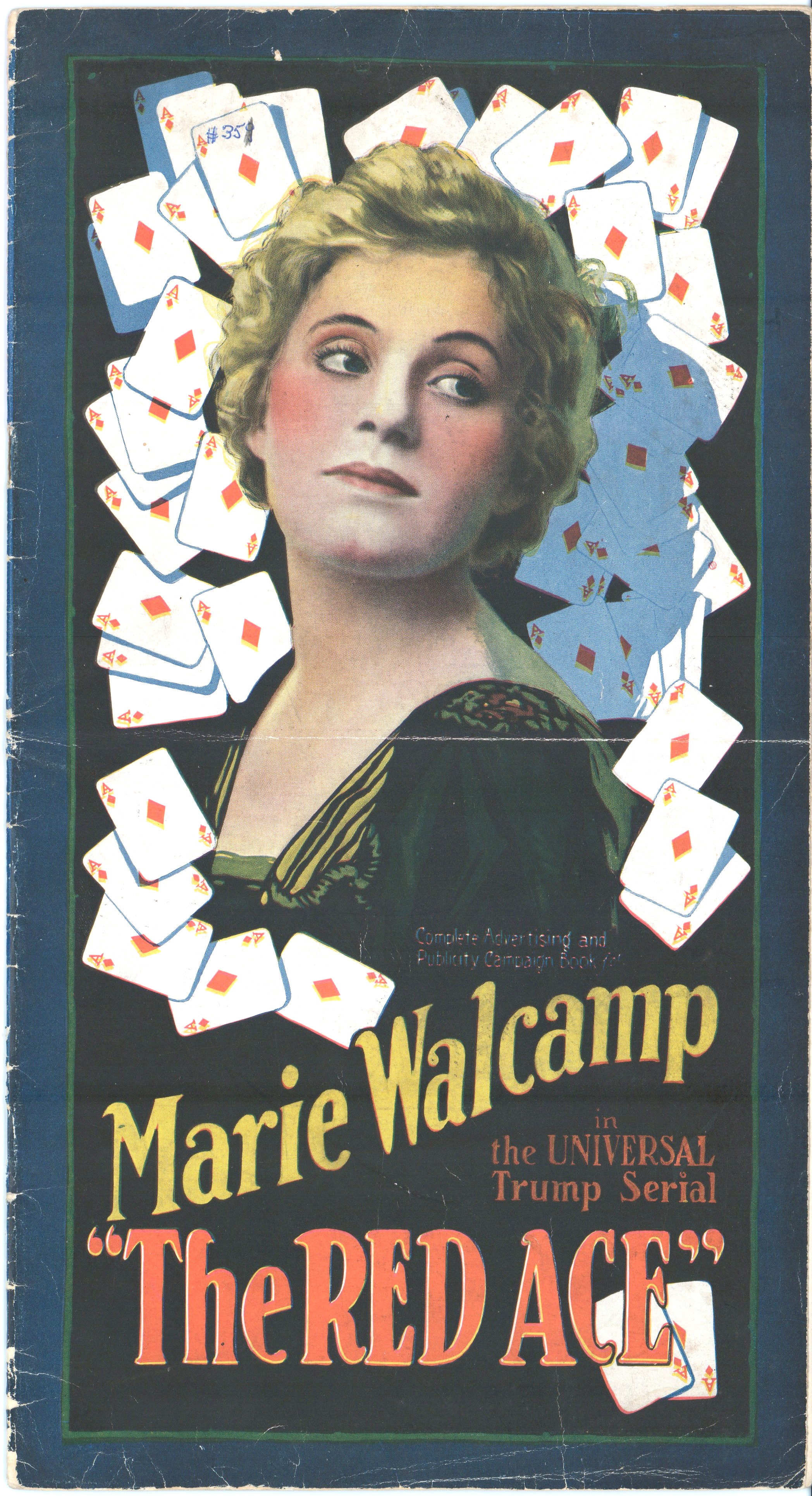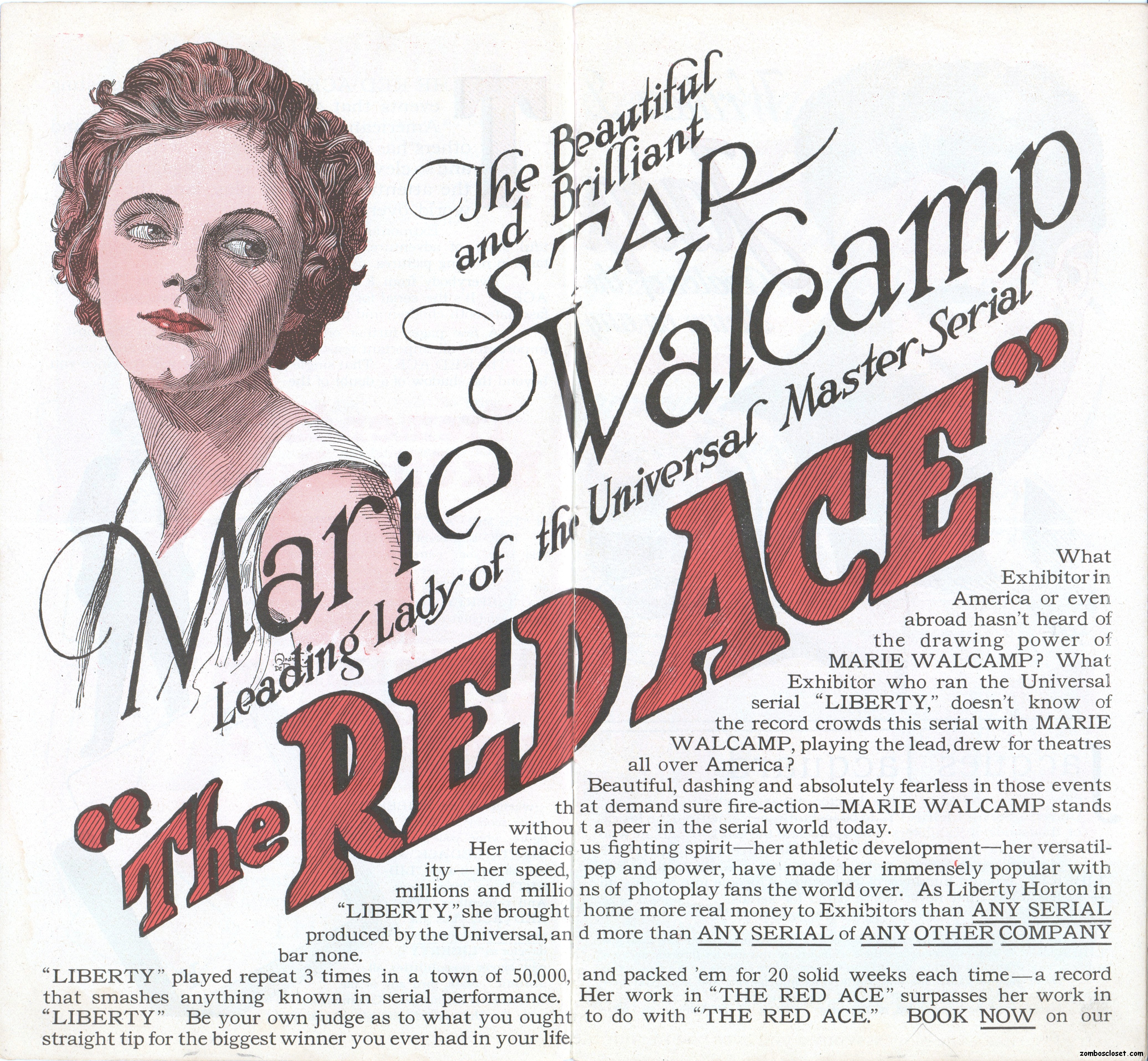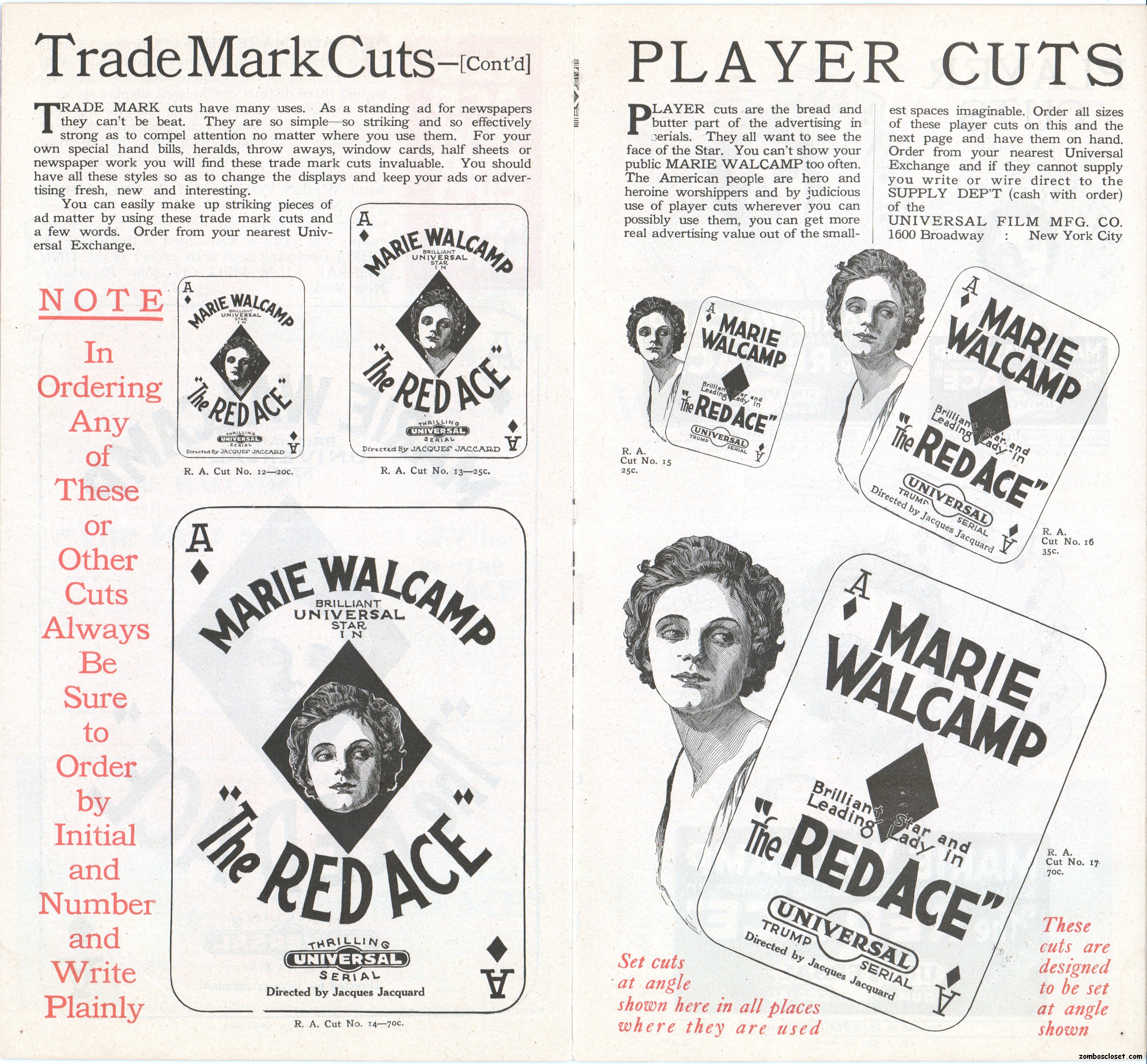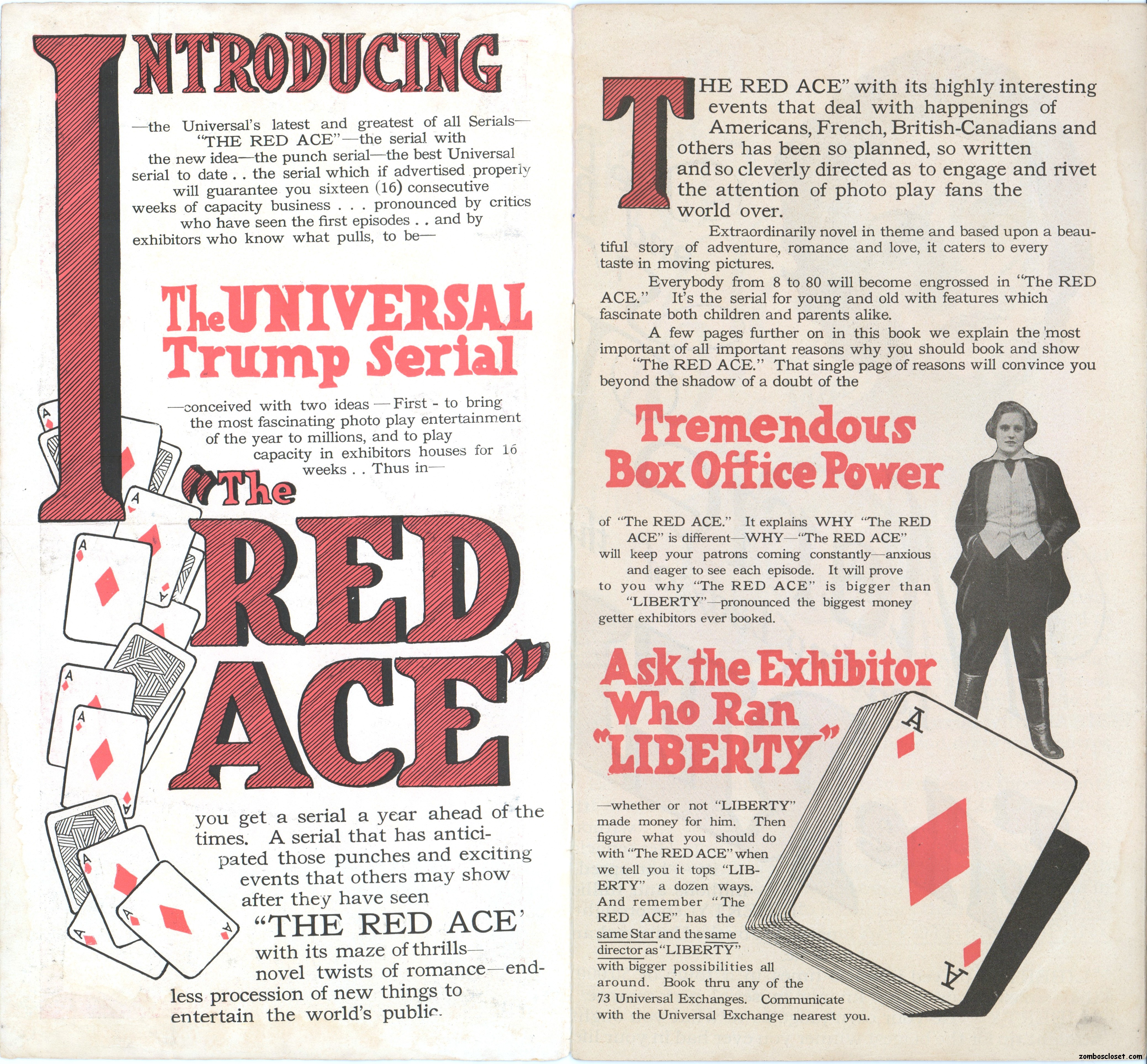 The Red Ace pressbook, which is the oldest one in my collection so far (from 1917), is one of the most beautifully conceived pressbooks I’ve seen, with wonderful use of color, graphics, and text fonts. Size-wise, it’s rather small at 12.5 x 7 inches, but it packs quite a visual wallop; and, certainly, that old world, flourishy, charm in its design is nostalgic.