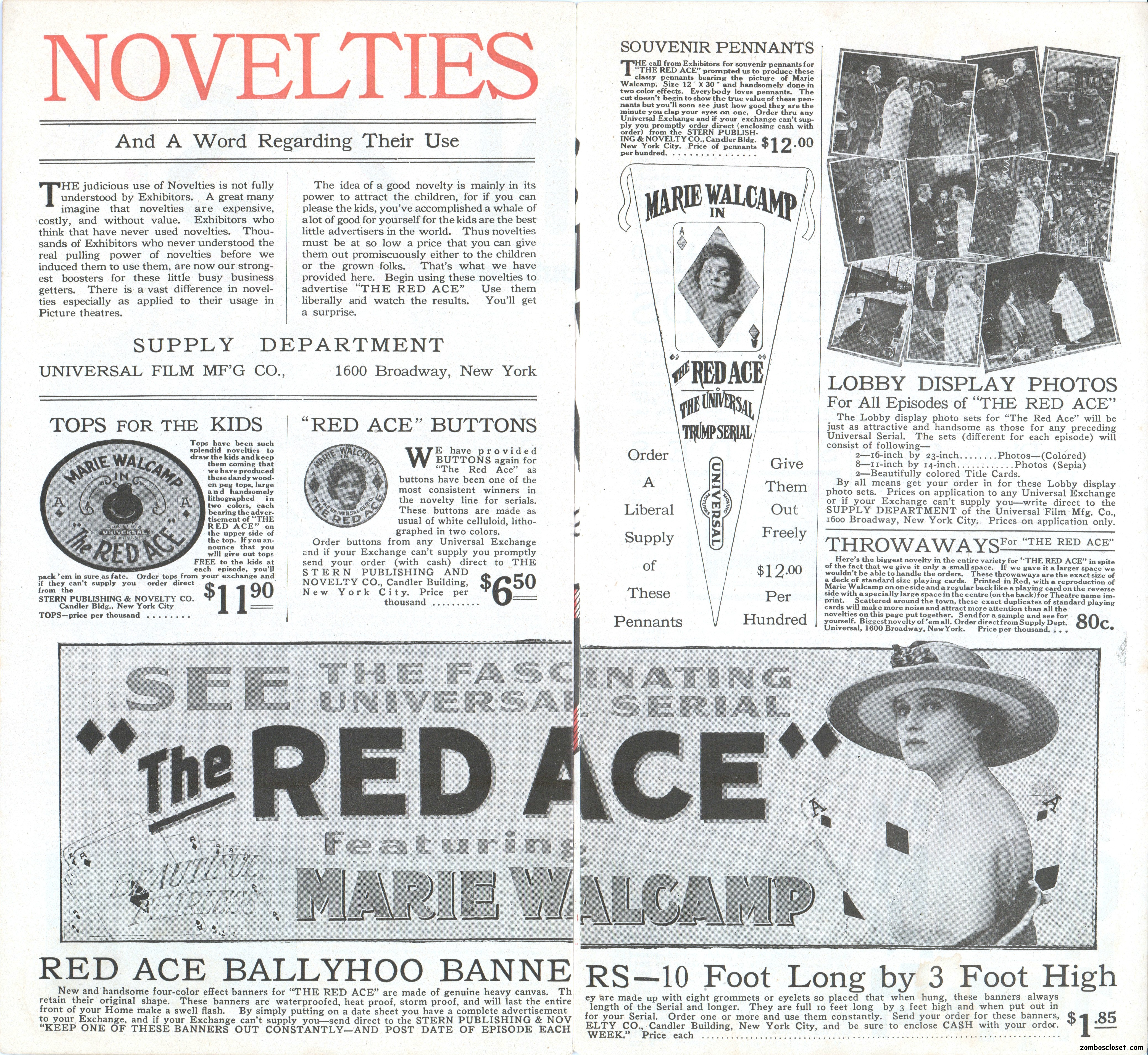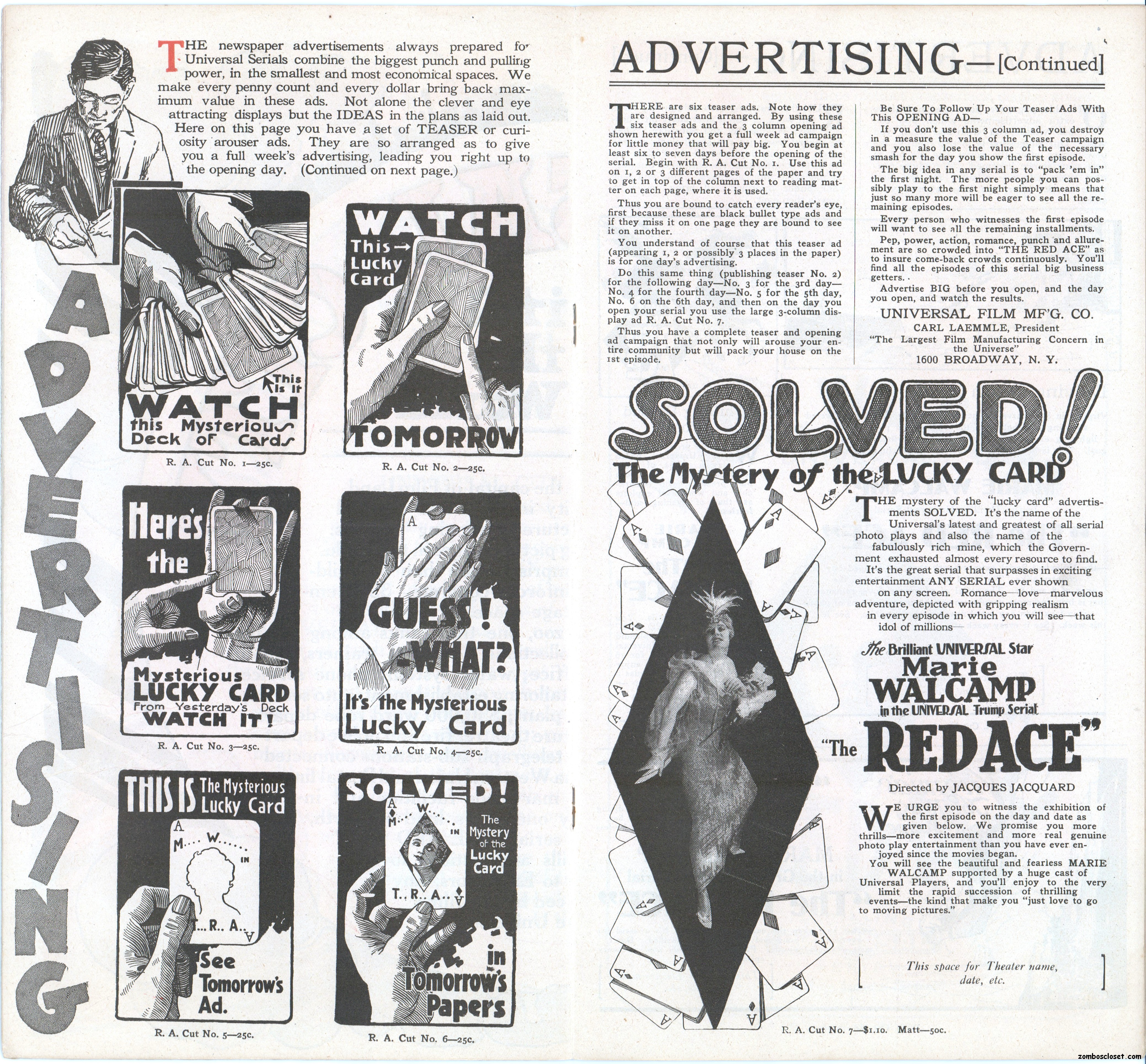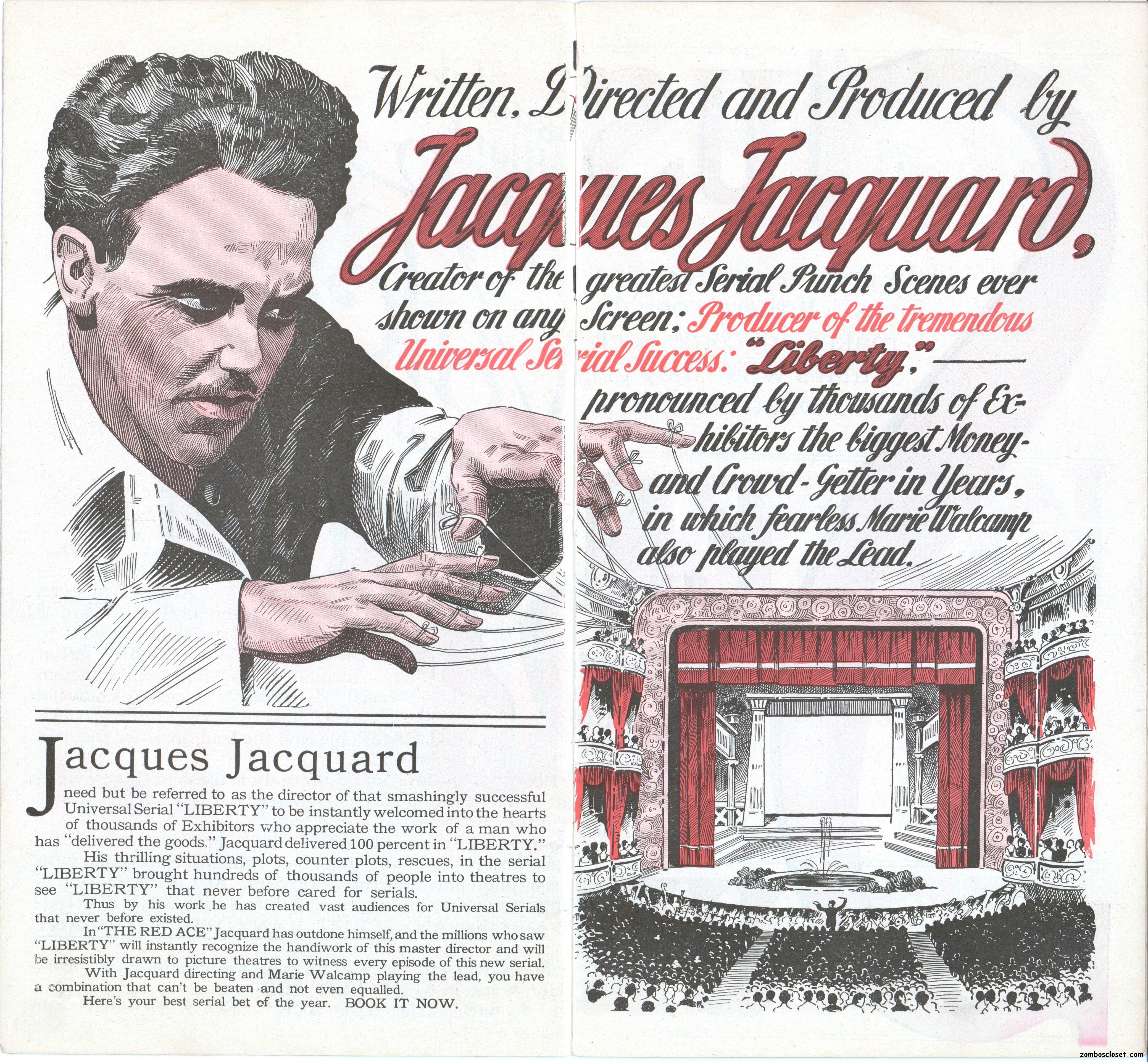 The Red Ace pressbook, which is the oldest one in my collection so far (from 1917), is one of the most beautifully conceived pressbooks I’ve seen, with wonderful use of color, graphics, and text fonts. Size-wise, it’s rather small at 12.5 x 7 inches, but it packs quite a visual wallop; and, certainly, that old world, flourishy, charm in its design is nostalgic.