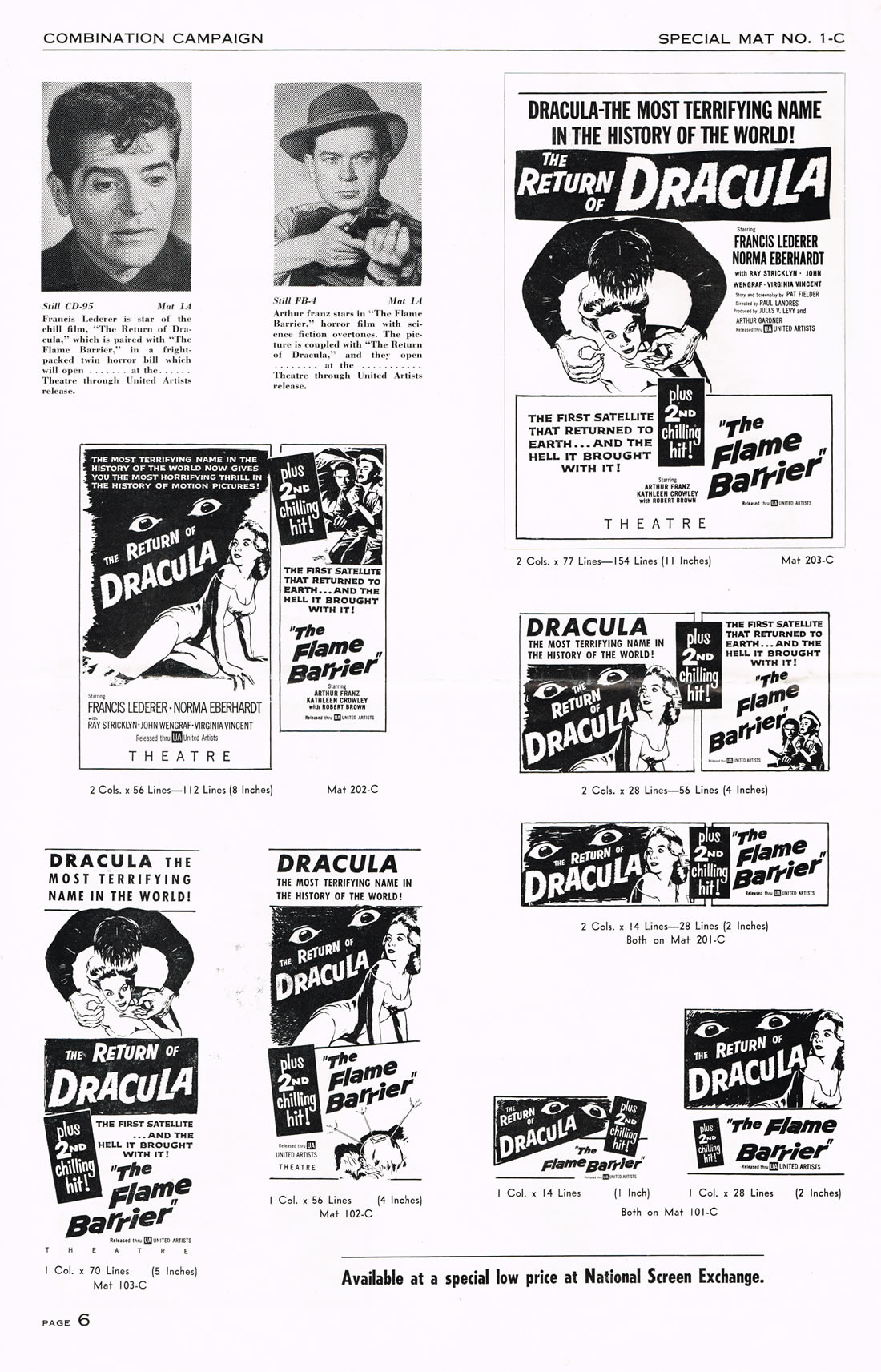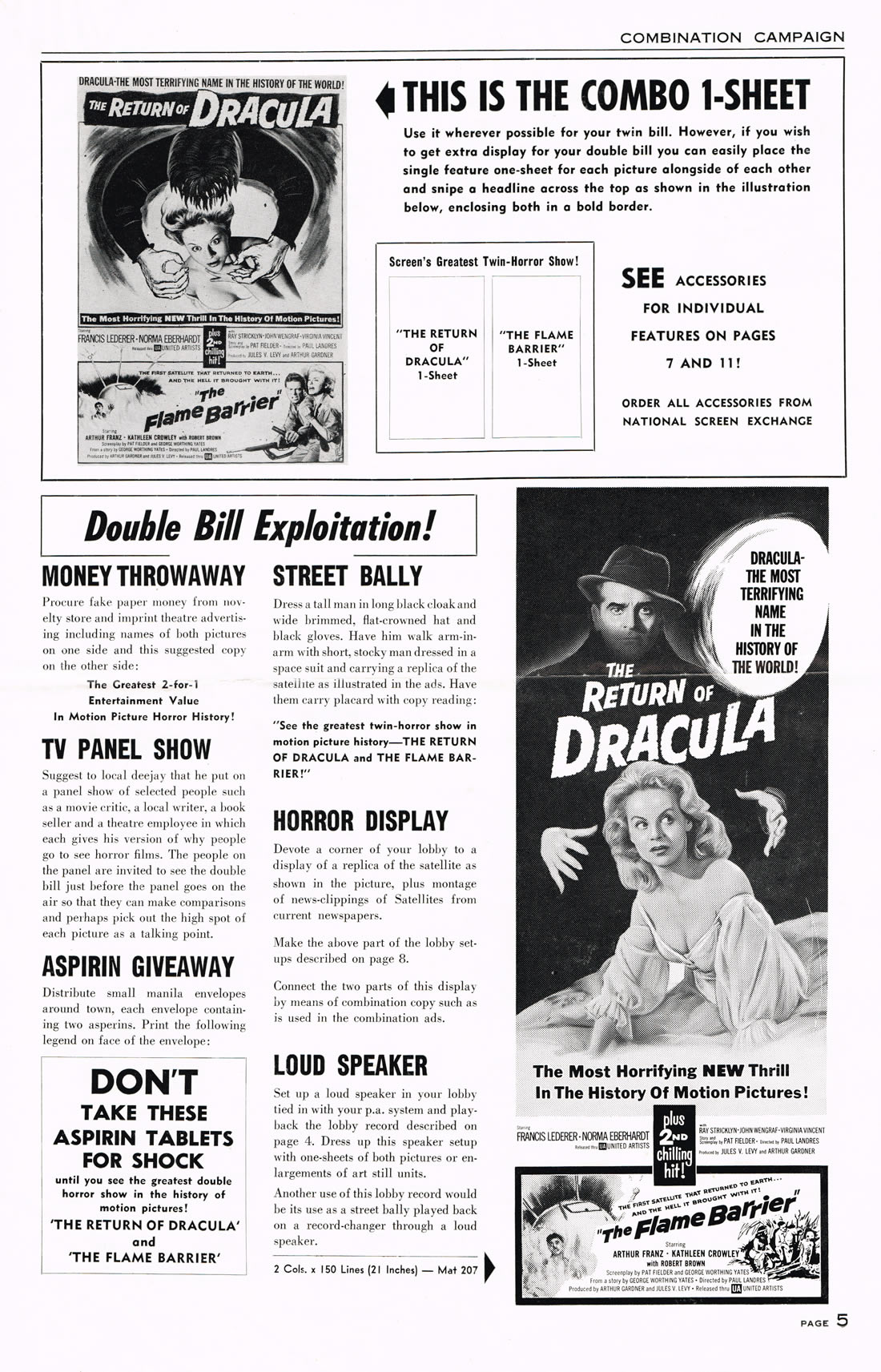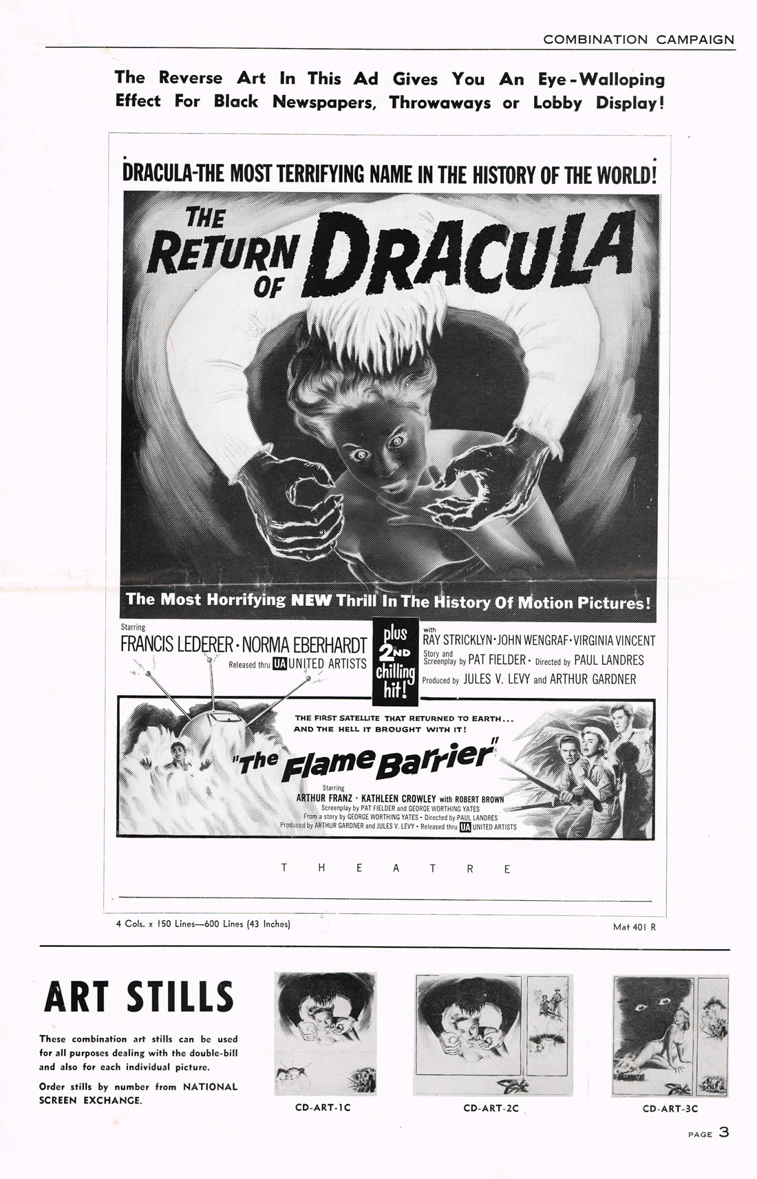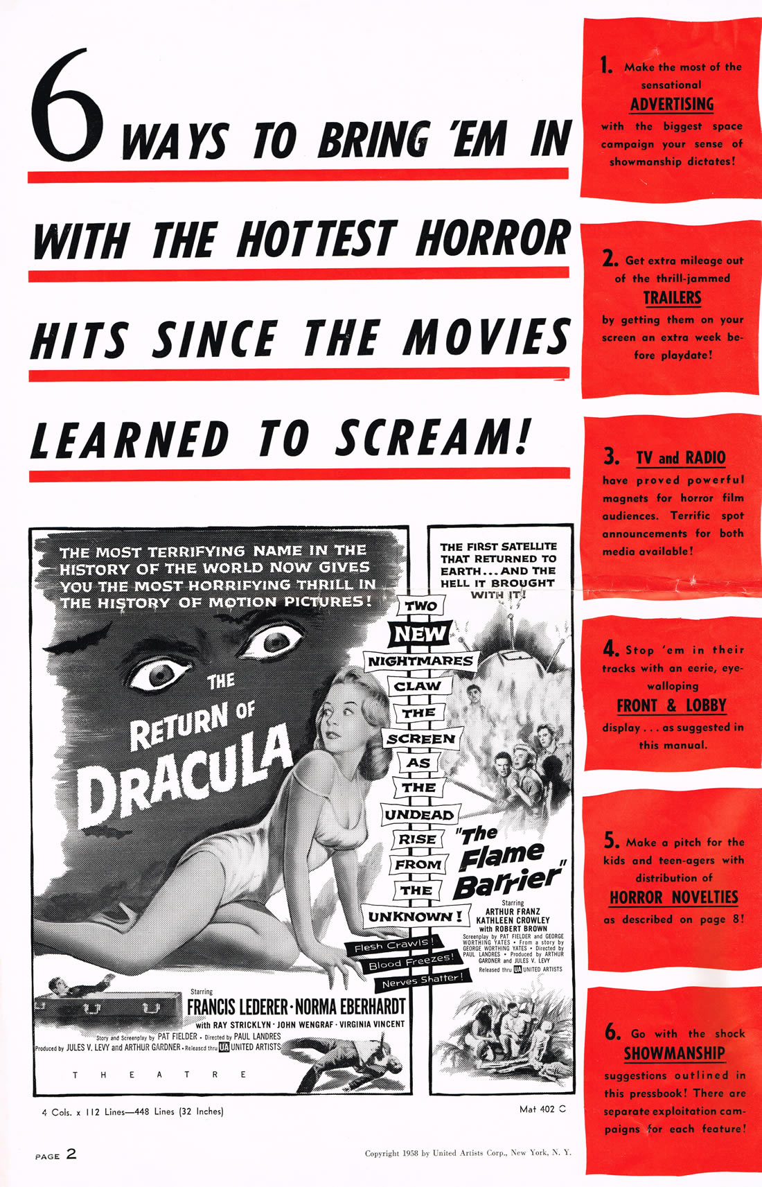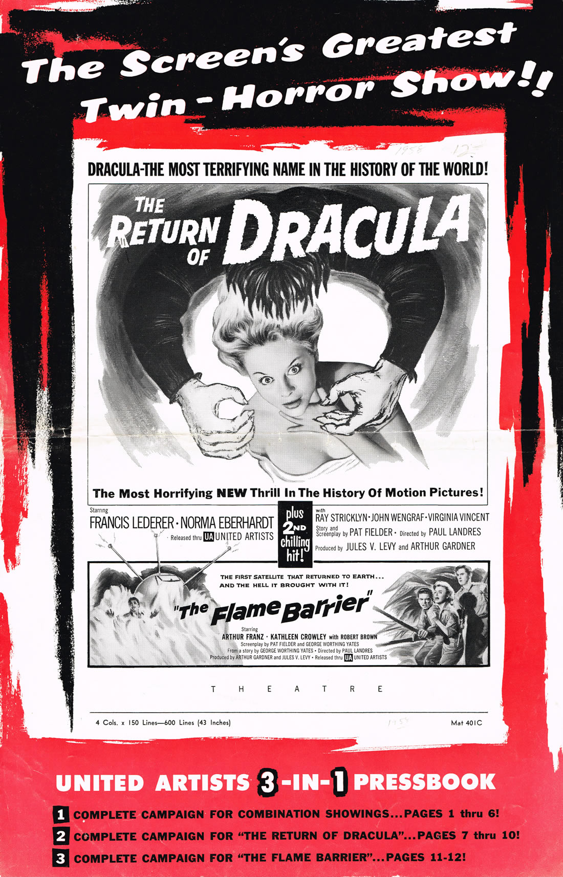 Here is an exuberant double bill pressbook for The Return of Dracula and The Flame Barrier. Notice how most of the box office promotion is geared toward Dracula and the vampire theme. The Return took a beating from Hammer's Horror of Dracula the same year (1958), but Francis Lederer and this United Artists release is not bad.