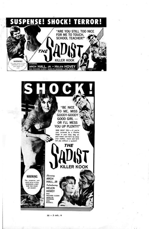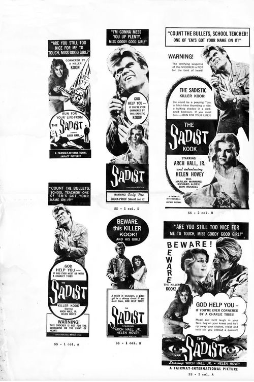 Movie Pressbook: The Sadist (1963) Leave a Comment / Pressbooks (Horror, Sci Fi, Fantasy) / By JM Cozzoli From Tony Rivers, who notes: “One of my favorite movies from the 1960’s is The Sadist and here’s the complete pressbook for this film. Usually only 4 pages are sold by dealers because they miss the two ad pages.” Those are included here. Like this:Like Loading... Share this post Facebook Twitter Pinterest Linkedin