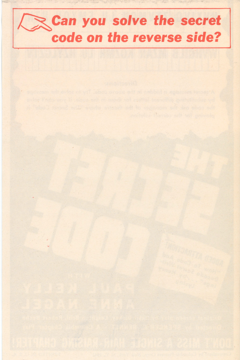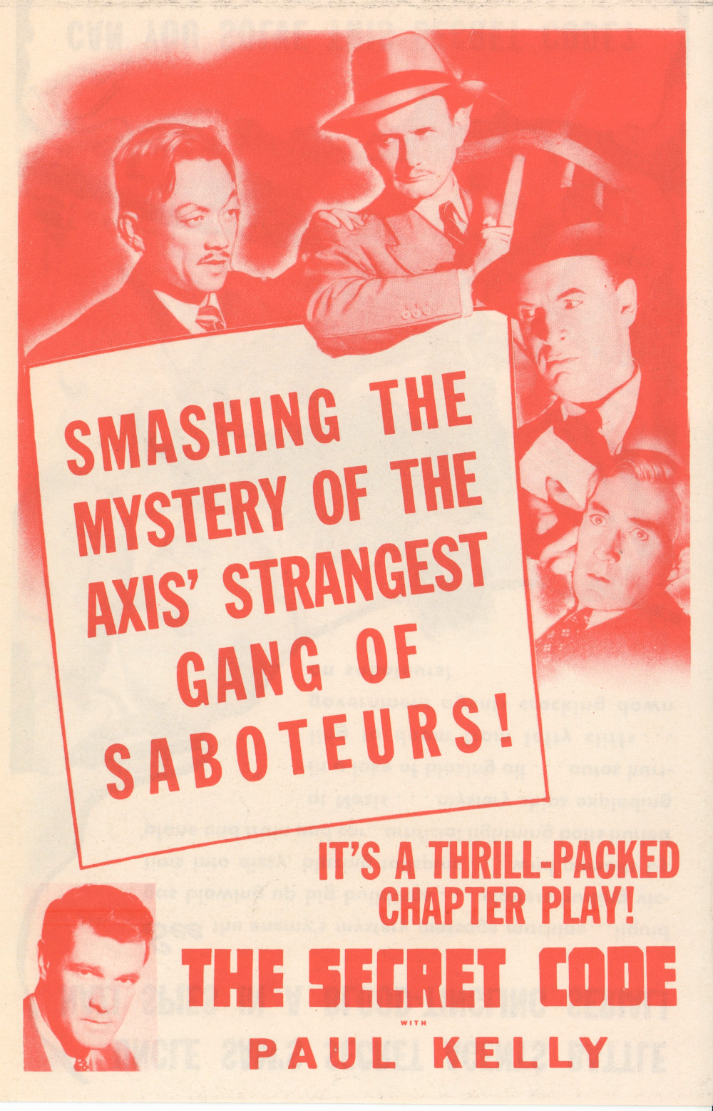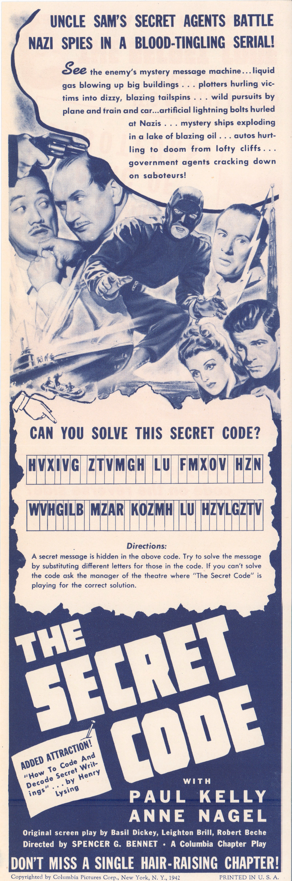 Here is the theater herald for The Secret Code (1942) Columbia serial. The Black Commando, a competing action hero to Republic’s Spy Smasher, fights Nazis through fifteen chapters. See The Files of Jerry Blake for a detailed decoding of the serial. Interestingly, especially for a kid into cool stuff, the code tutorials at the end of each chapter were informative. I wonder how many kids sent around coded notes in their classrooms after seeing The Secret Code?