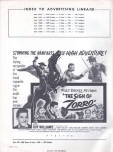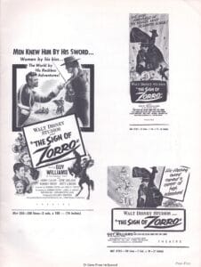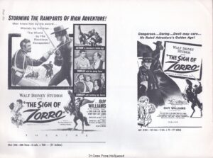 Being a Disney pressbook, it is filled with merchandizing and promotional content galore. Guy Williams (Armando Joseph Catalano) also made a very dashing Zorror, too. His two notable roles were as Zorror and John Robinson (Lost in Space).