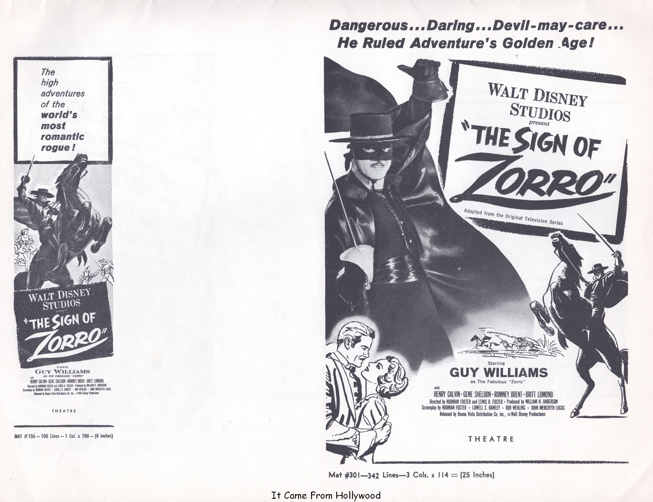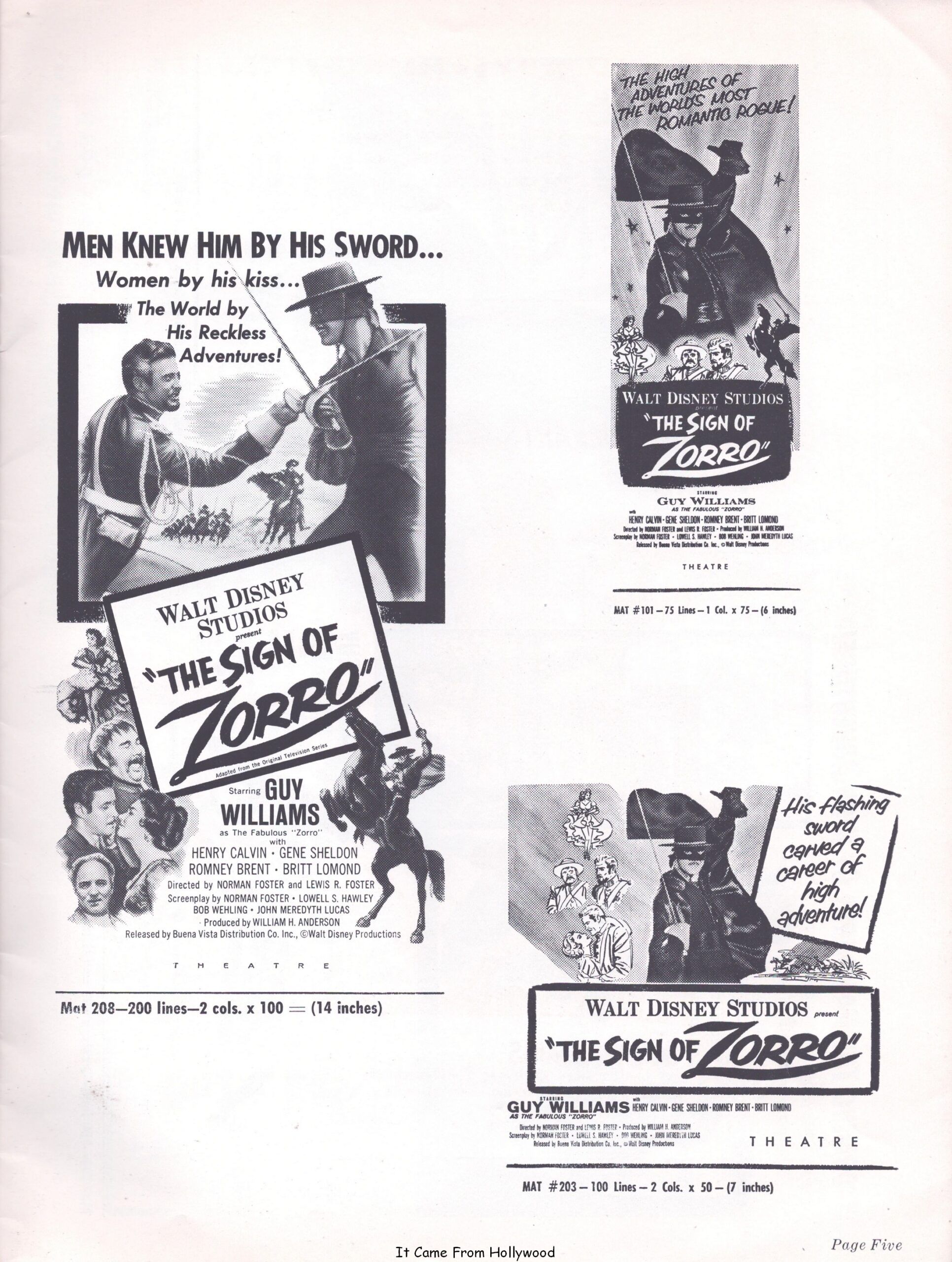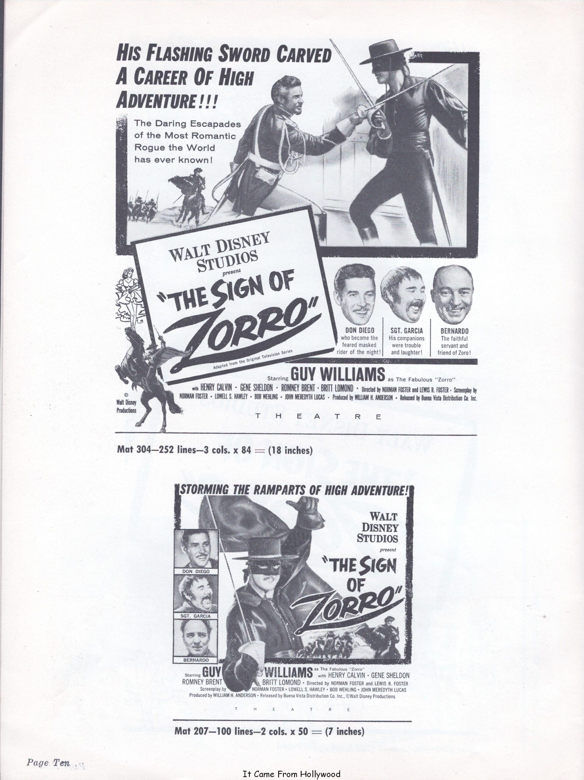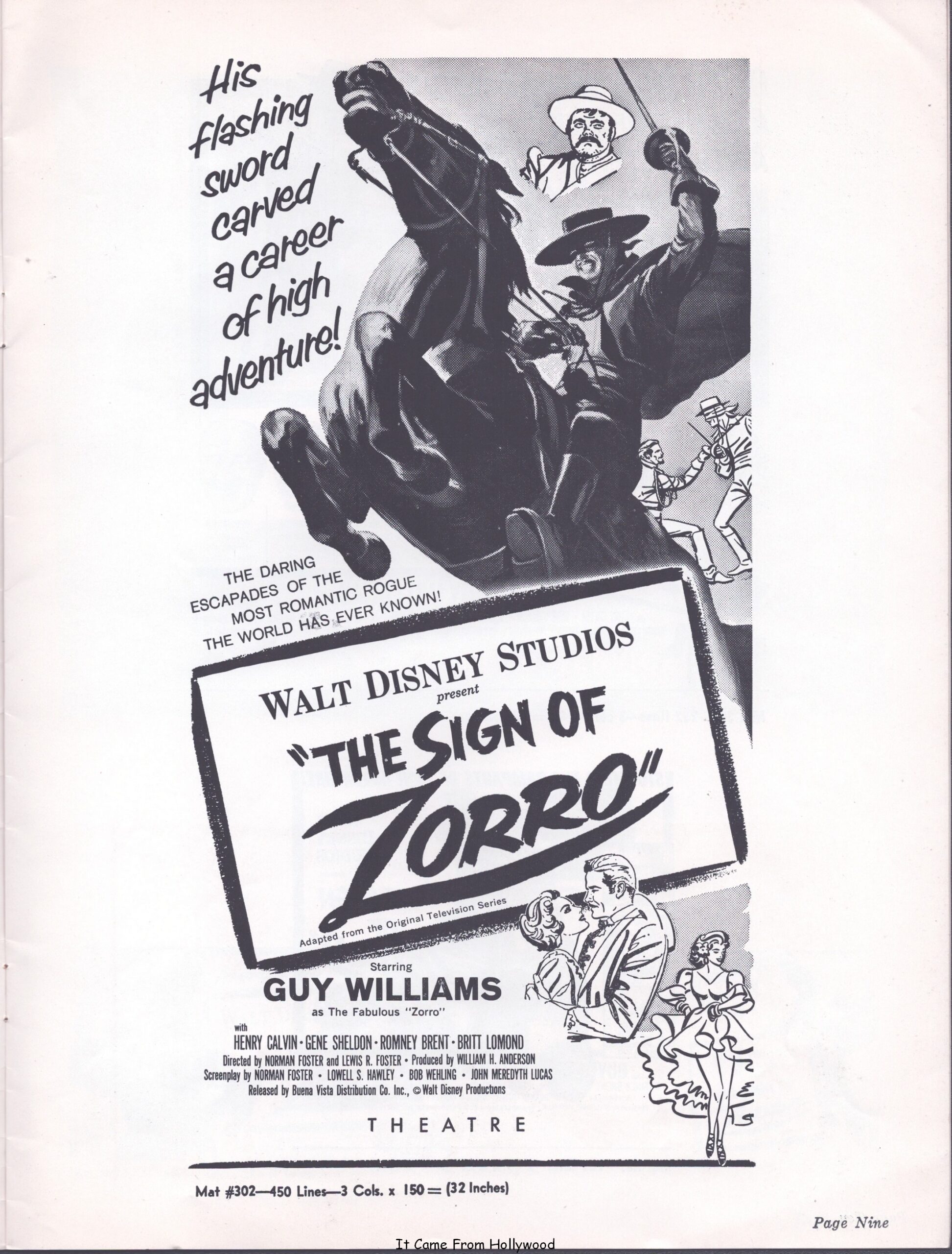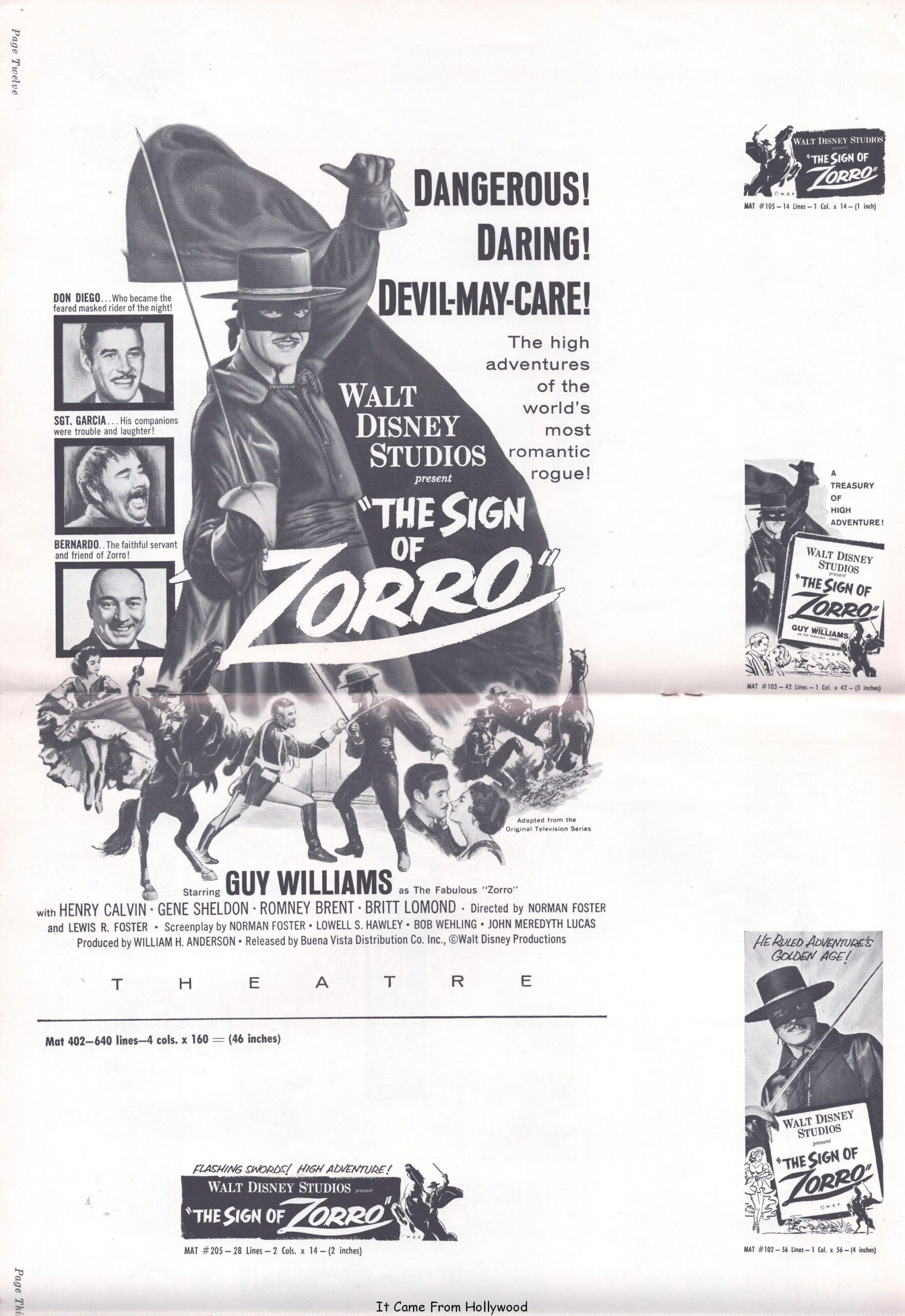 Being a Disney pressbook, it is filled with merchandizing and promotional content galore. Guy Williams (Armando Joseph Catalano) also made a very dashing Zorror, too. His two notable roles were as Zorror and John Robinson (Lost in Space).