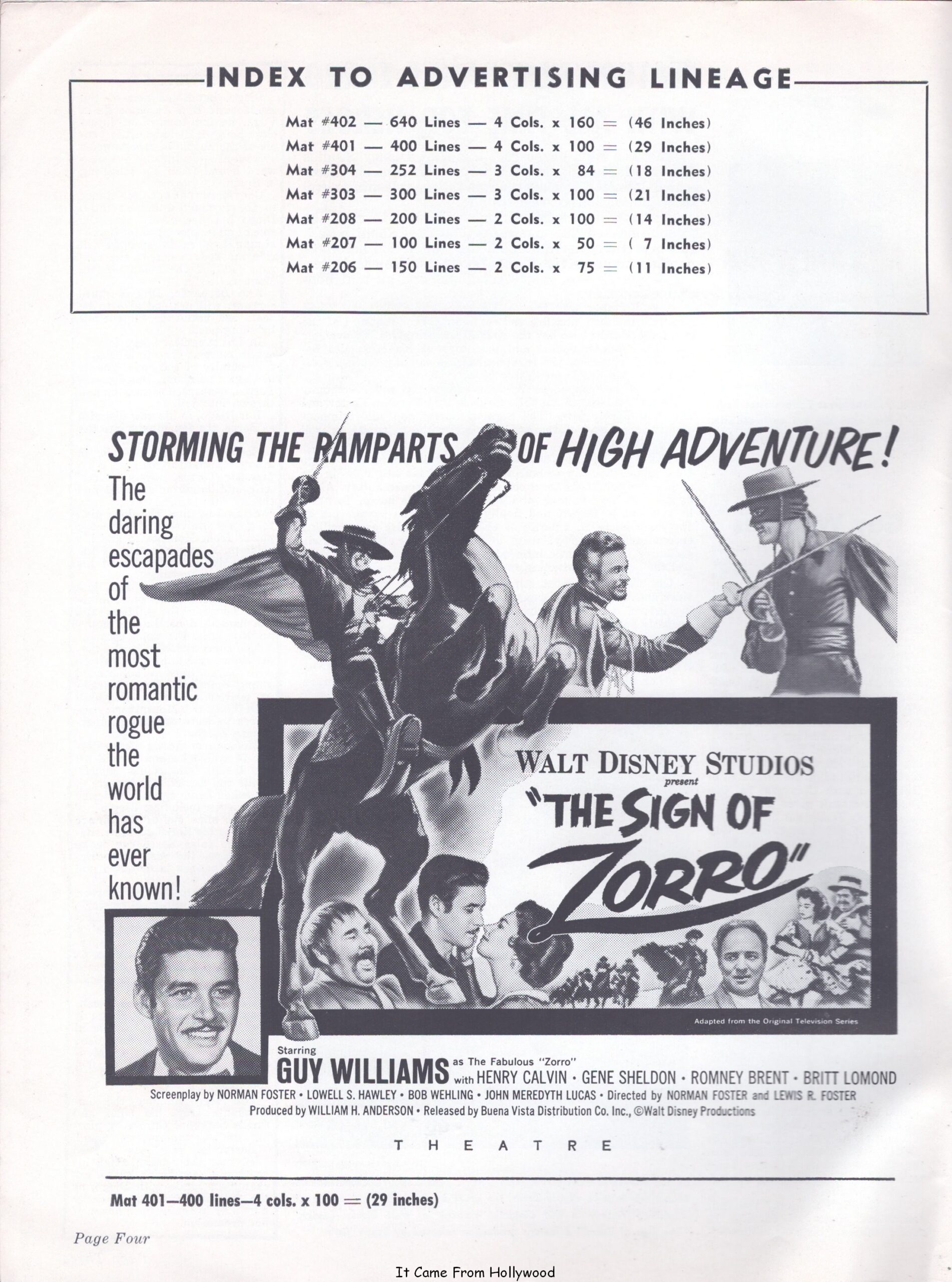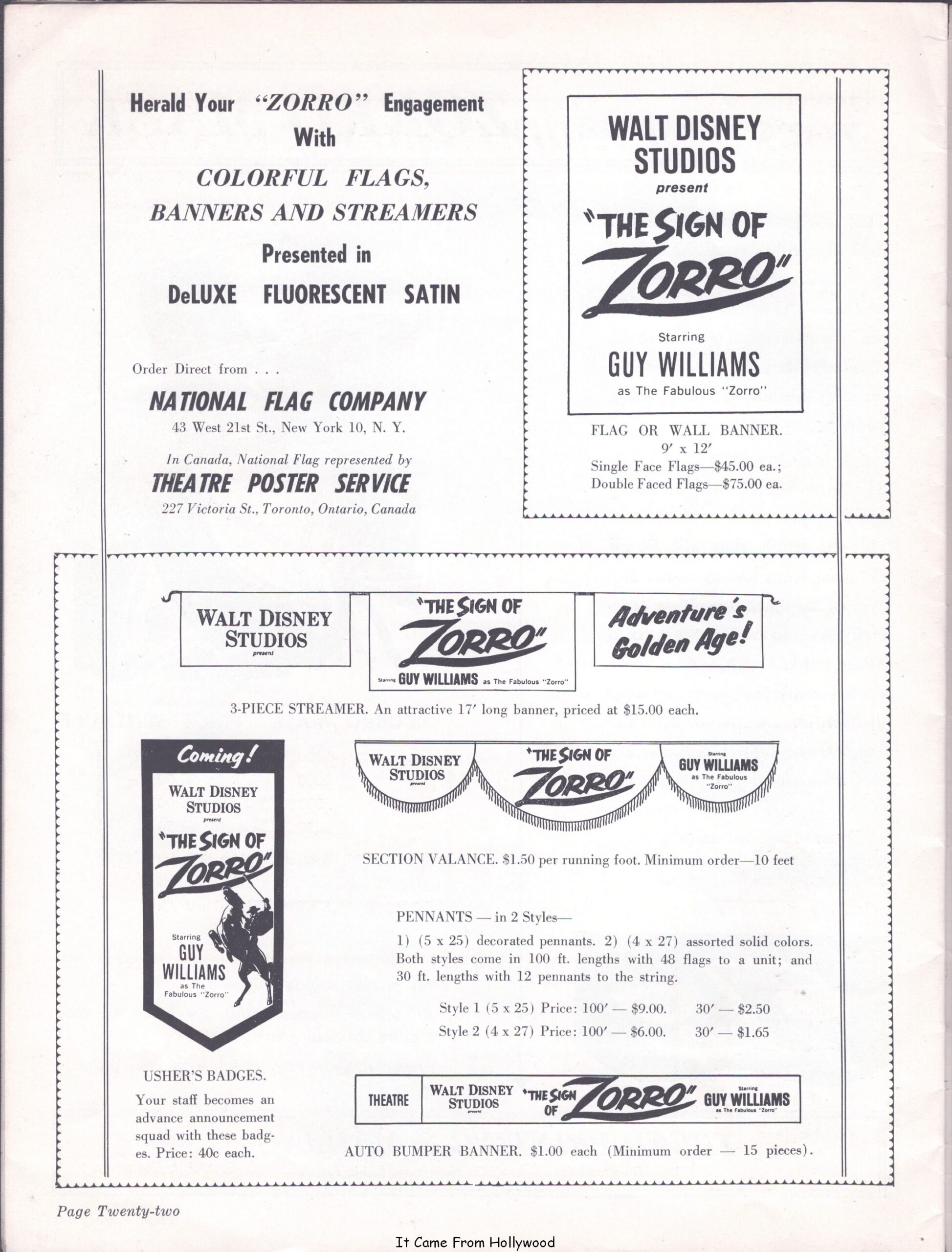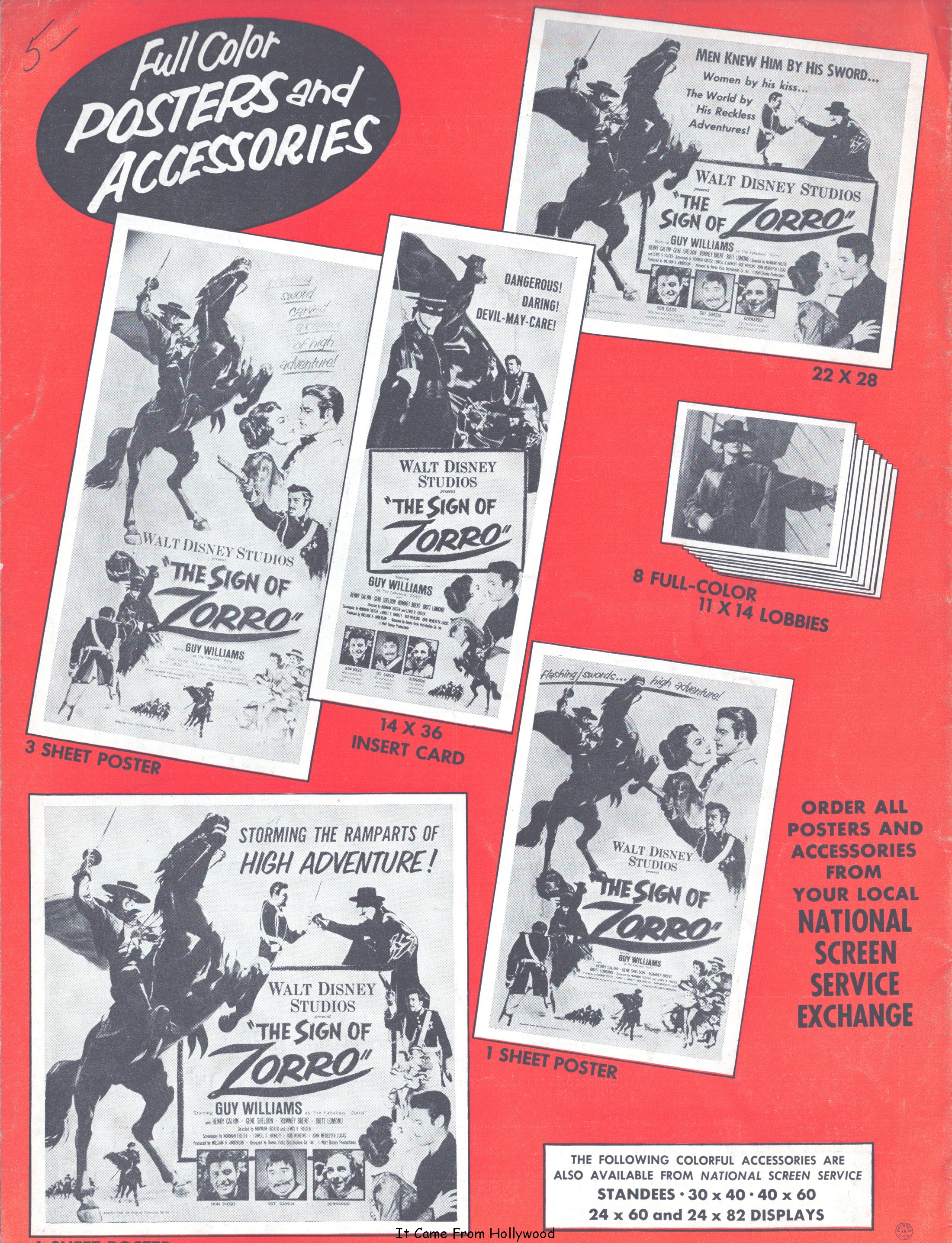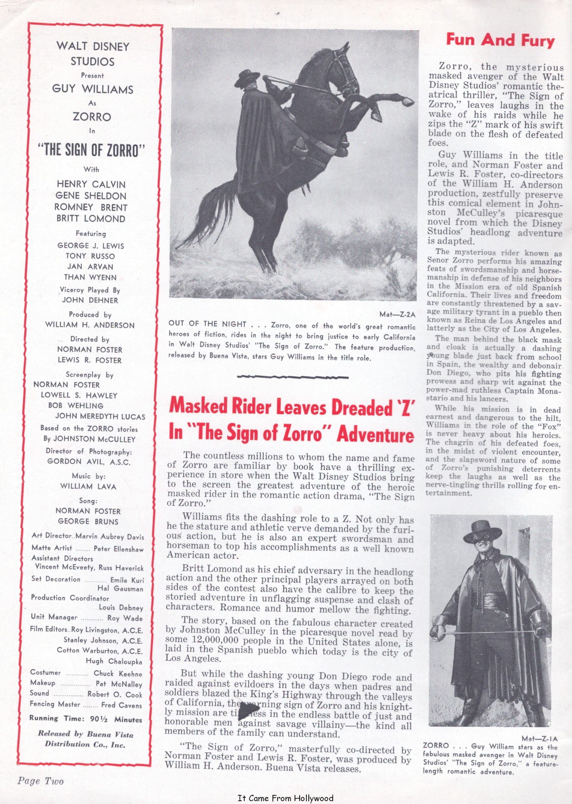 Being a Disney pressbook, it is filled with merchandizing and promotional content galore. Guy Williams (Armando Joseph Catalano) also made a very dashing Zorror, too. His two notable roles were as Zorror and John Robinson (Lost in Space).