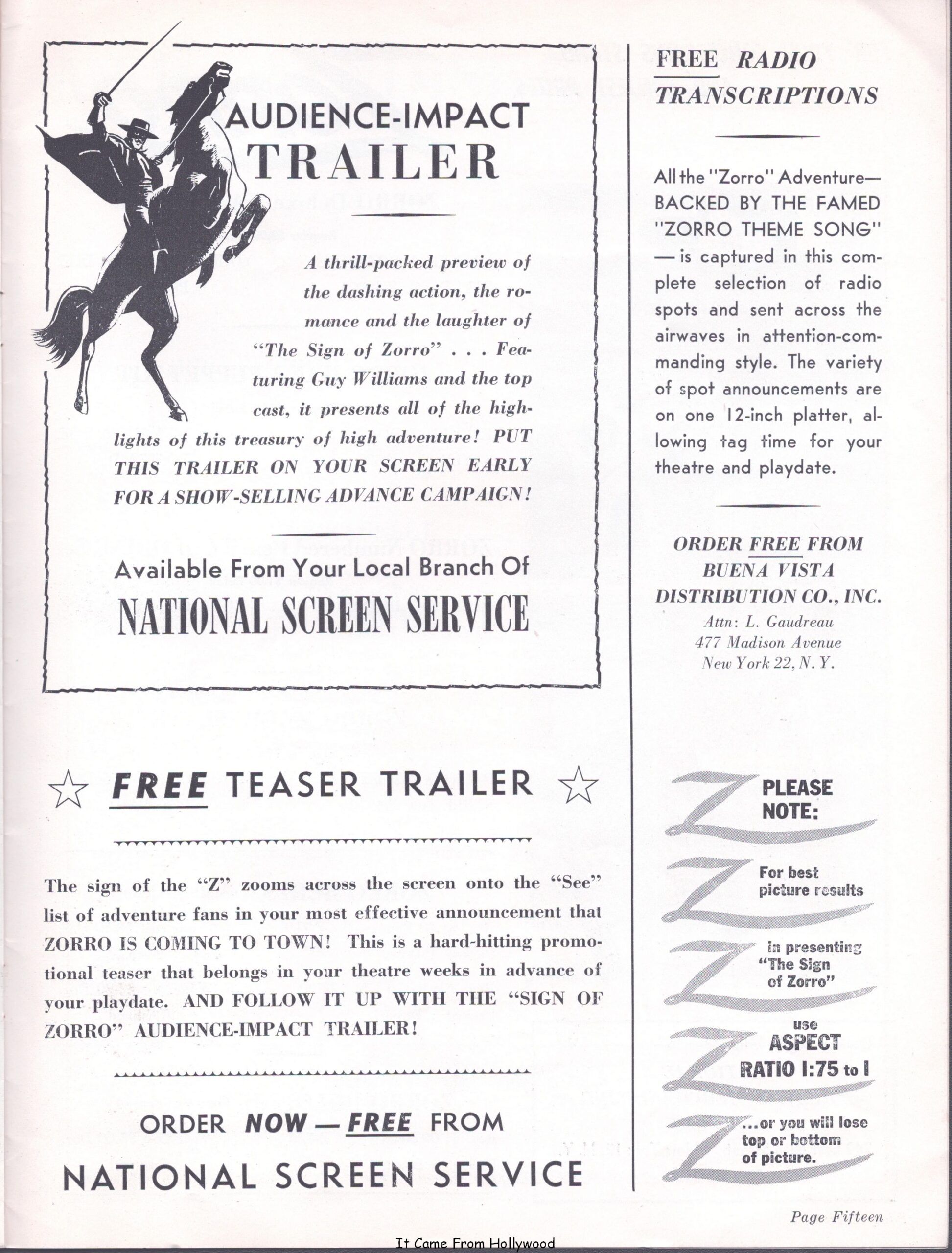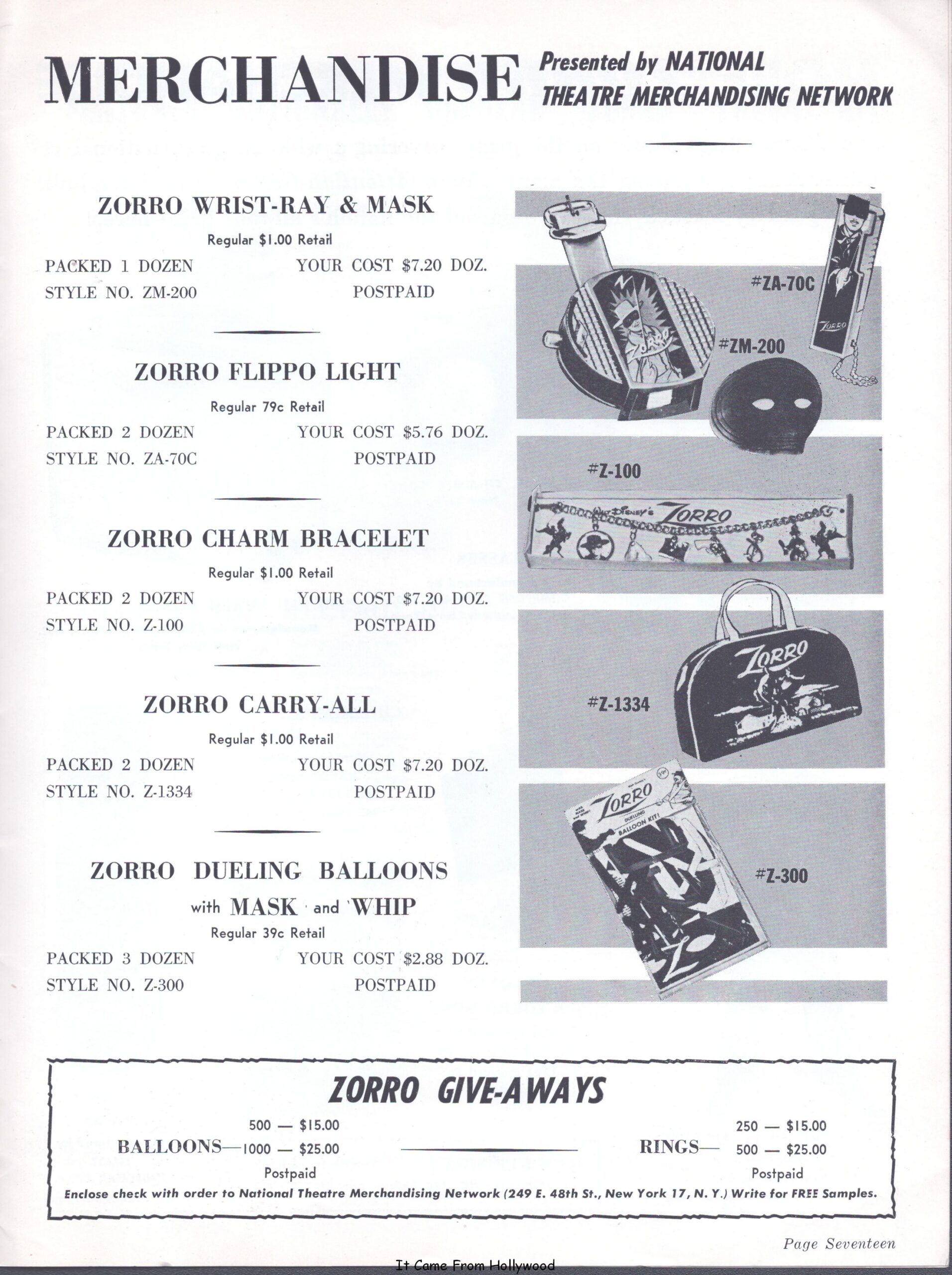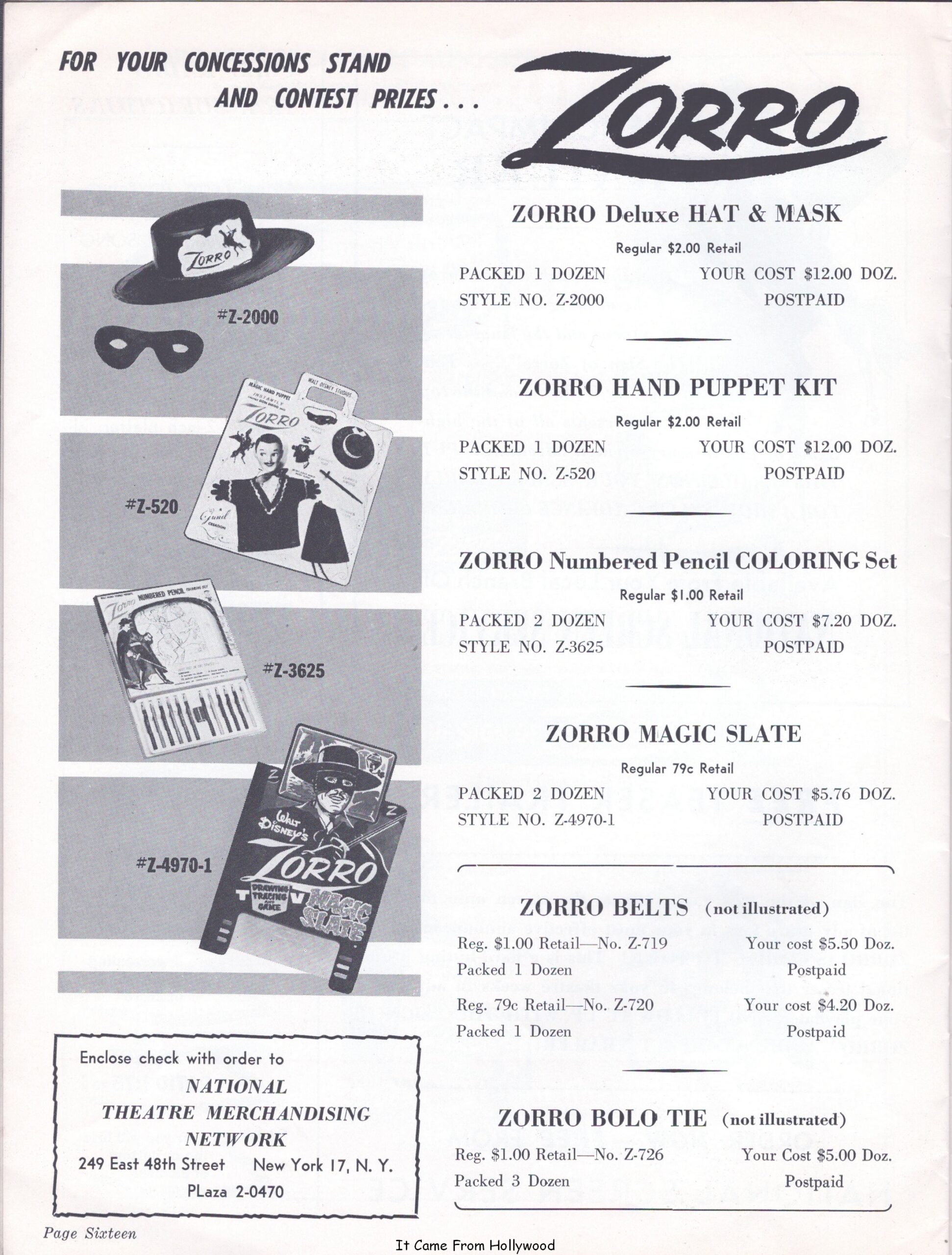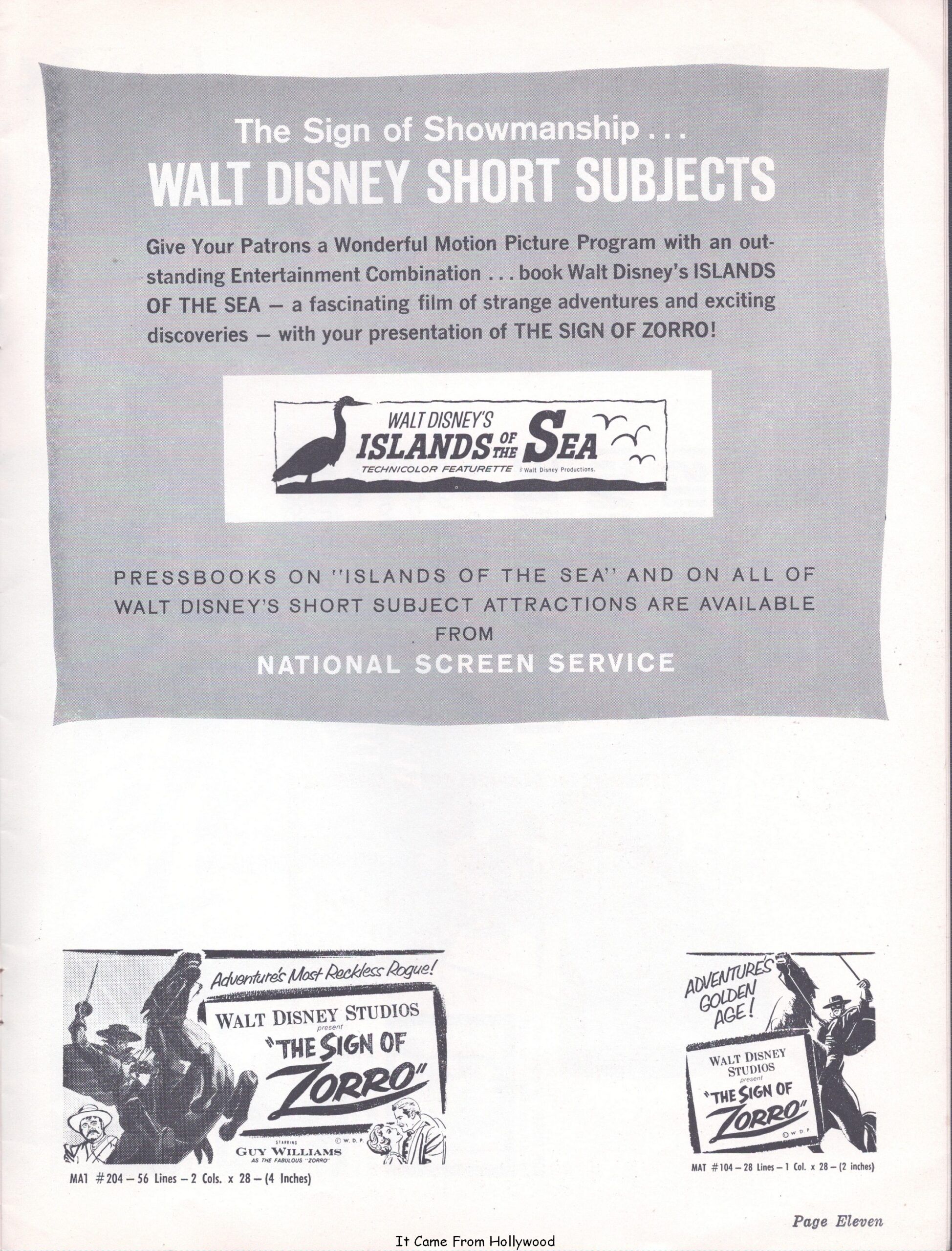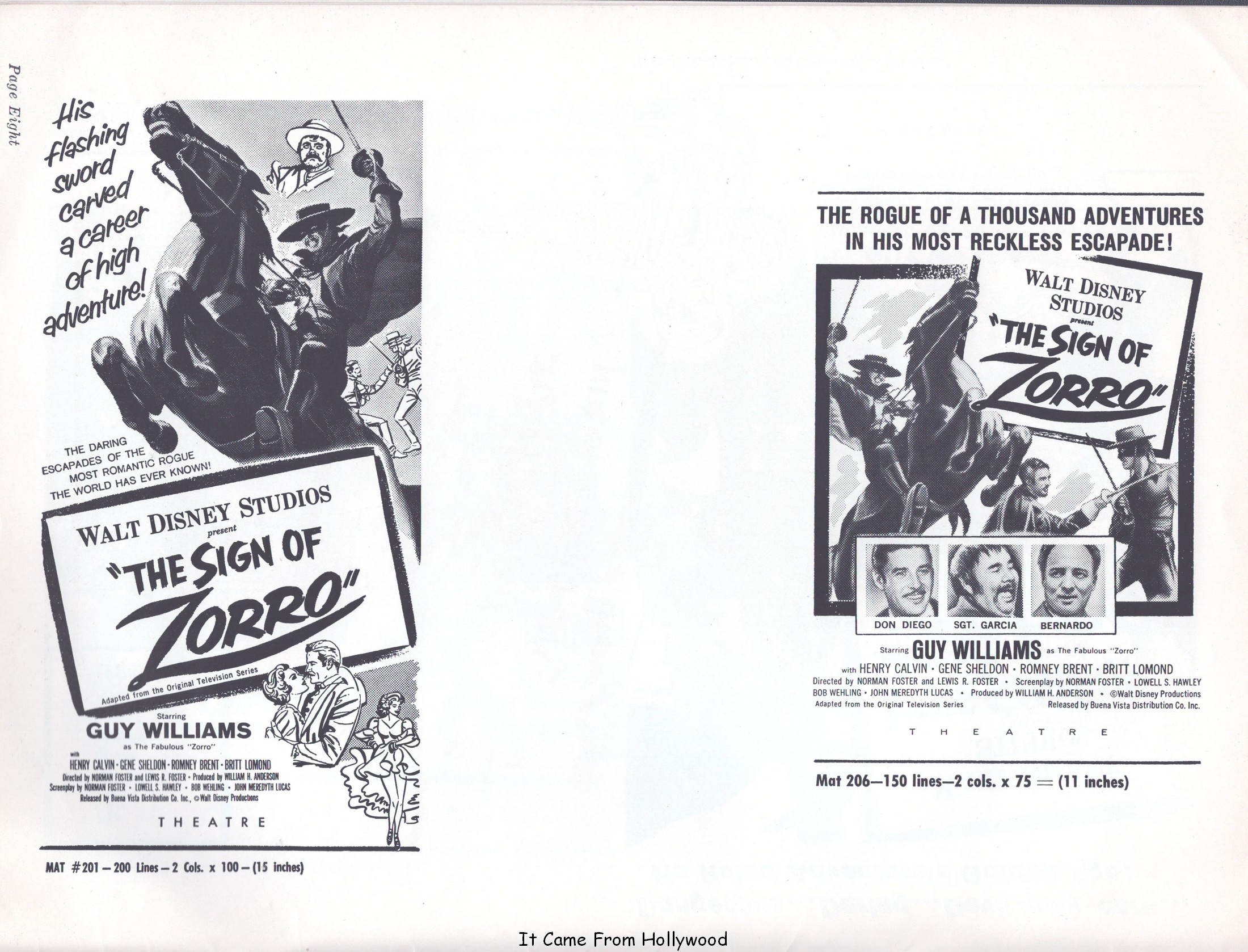 Being a Disney pressbook, it is filled with merchandizing and promotional content galore. Guy Williams (Armando Joseph Catalano) also made a very dashing Zorror, too. His two notable roles were as Zorror and John Robinson (Lost in Space).