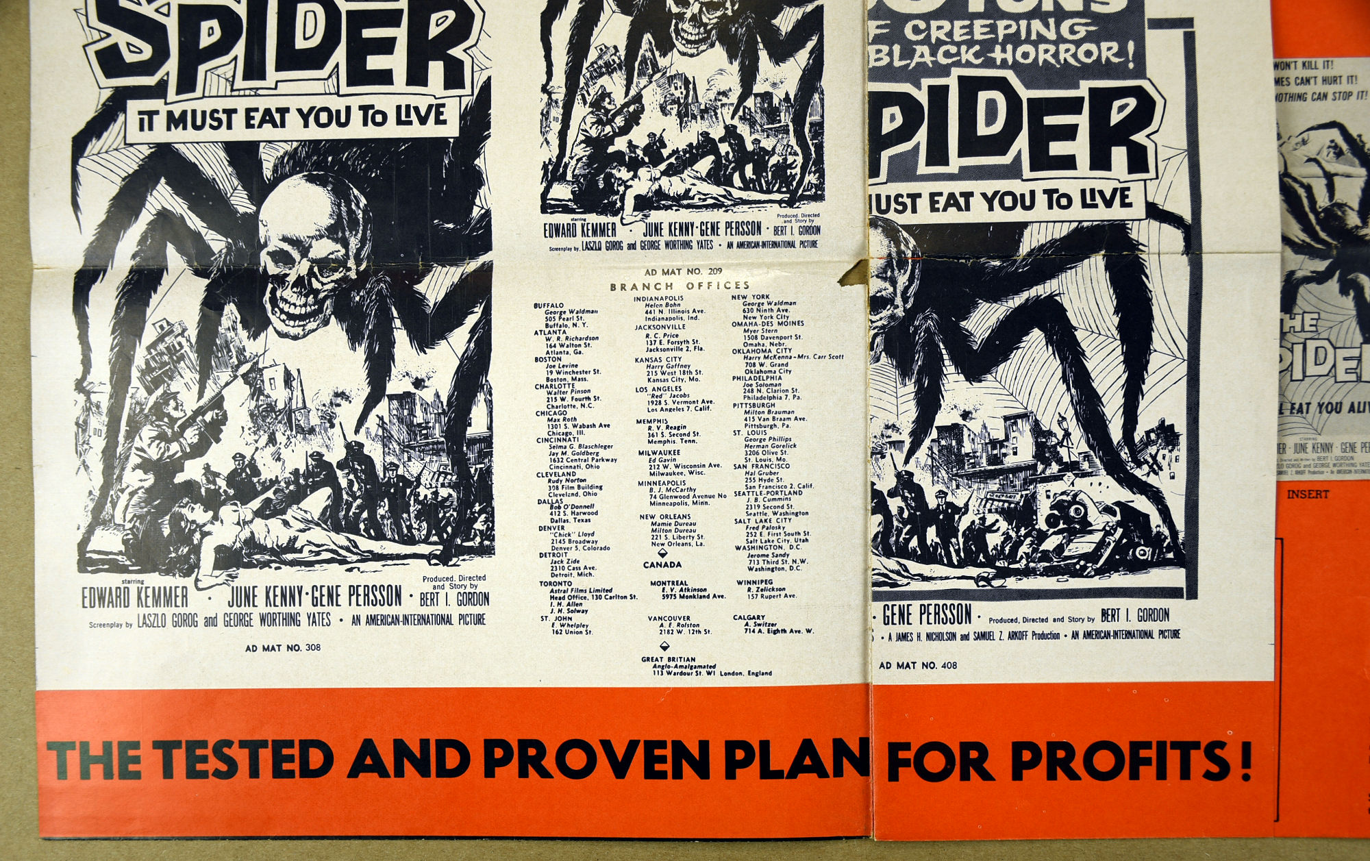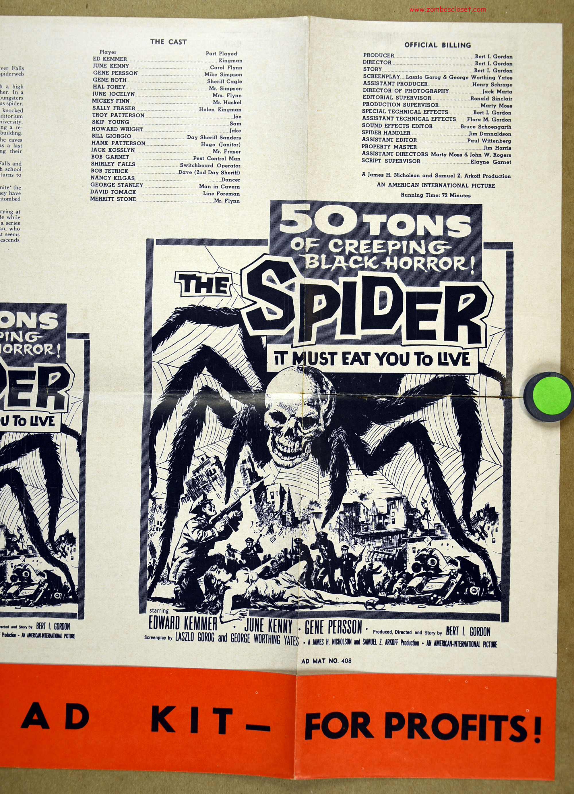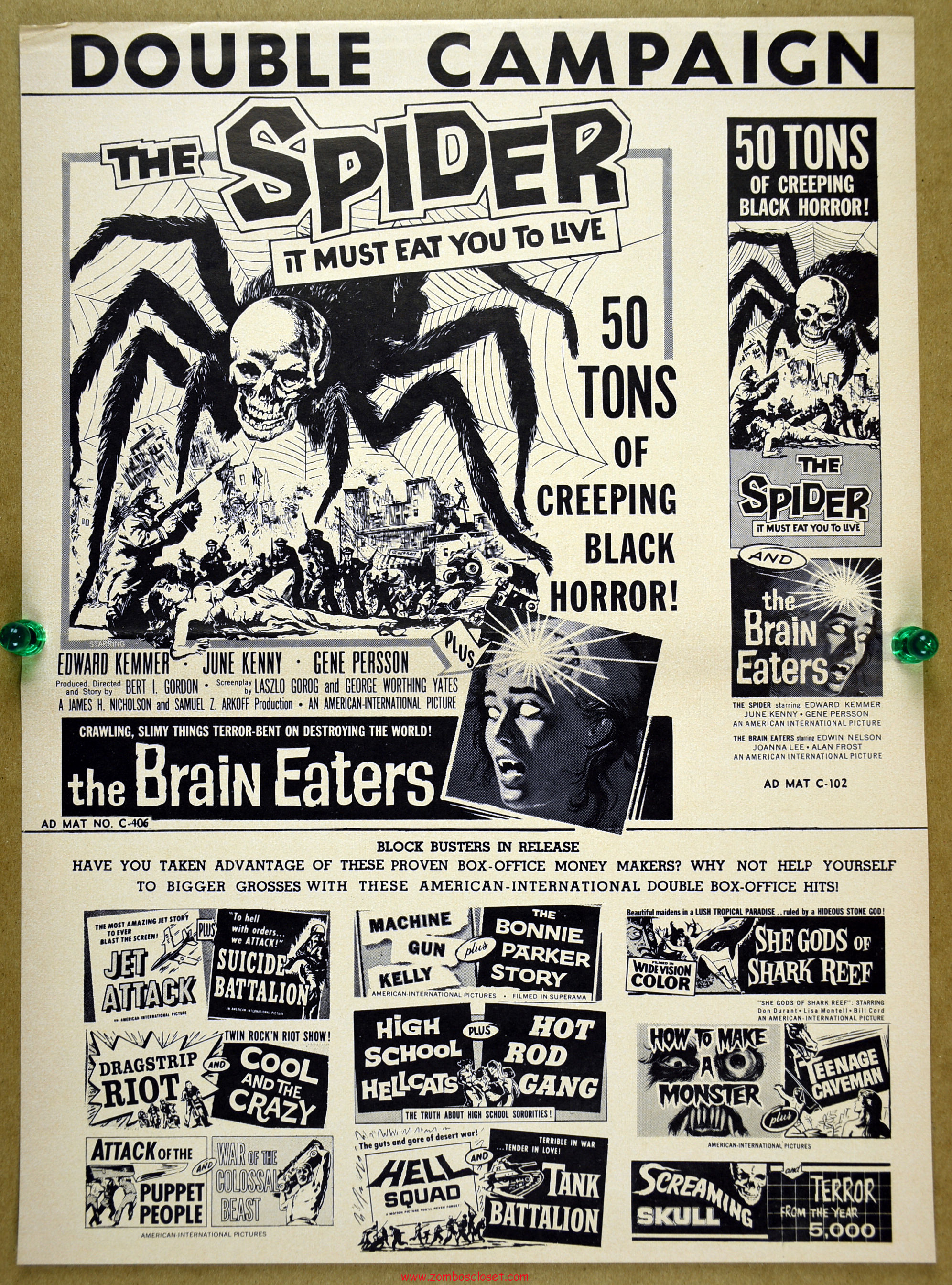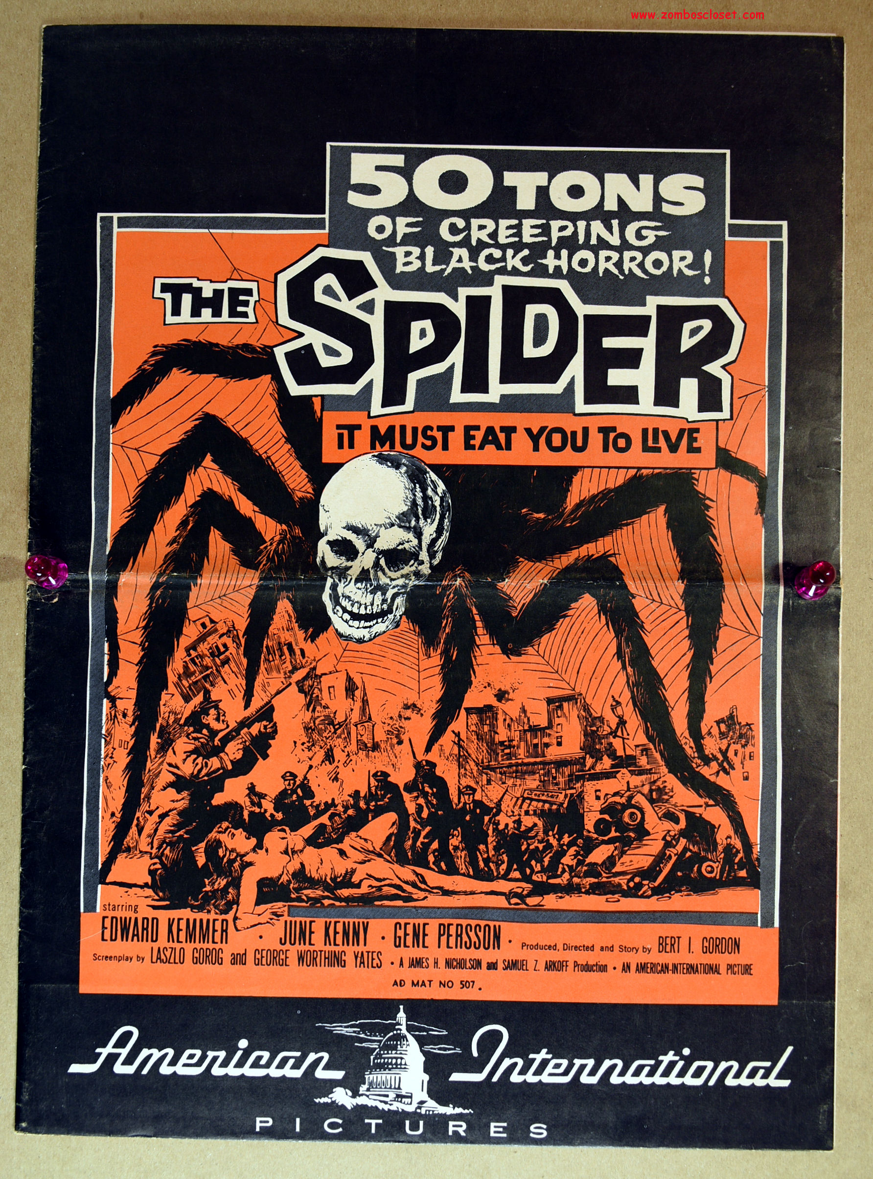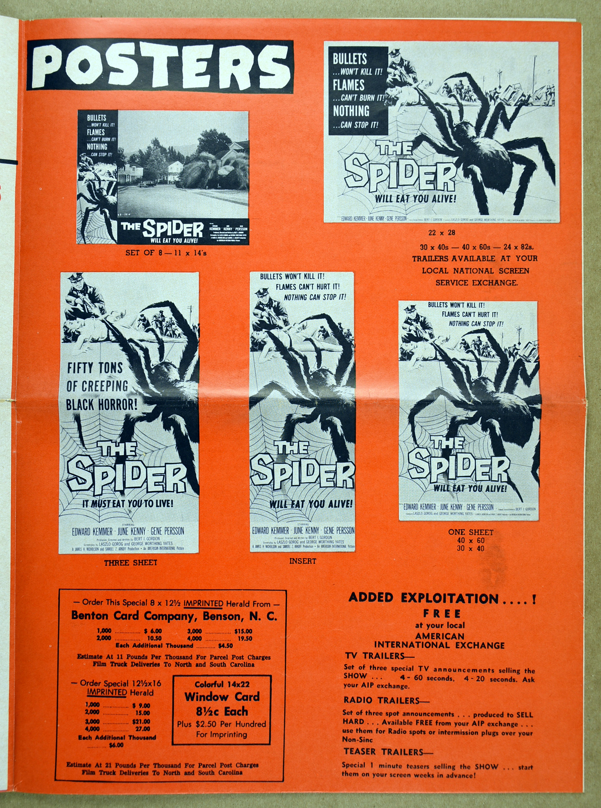 Movies with spiders always creep me out. Originally titled Earth vs. the Spider, after The Fly successfully buzzed theaters, AIP honchos decided to shorten the title to The Spider. Now that would have made a nice midnight double bill showing, don’t you think? The poster art shows more verve than the movie, but it’s still enjoyable: big spiders and small towns always work well together.