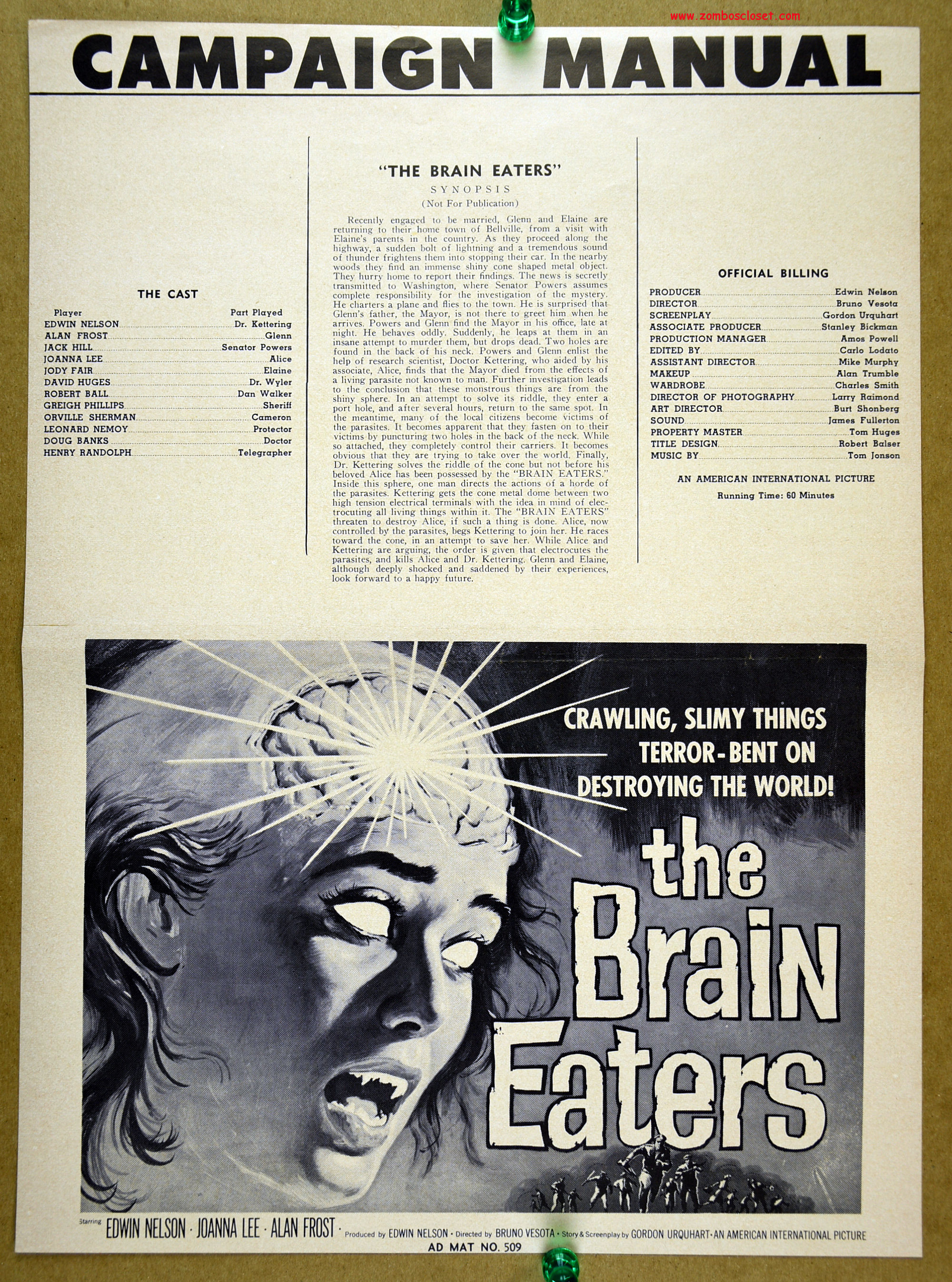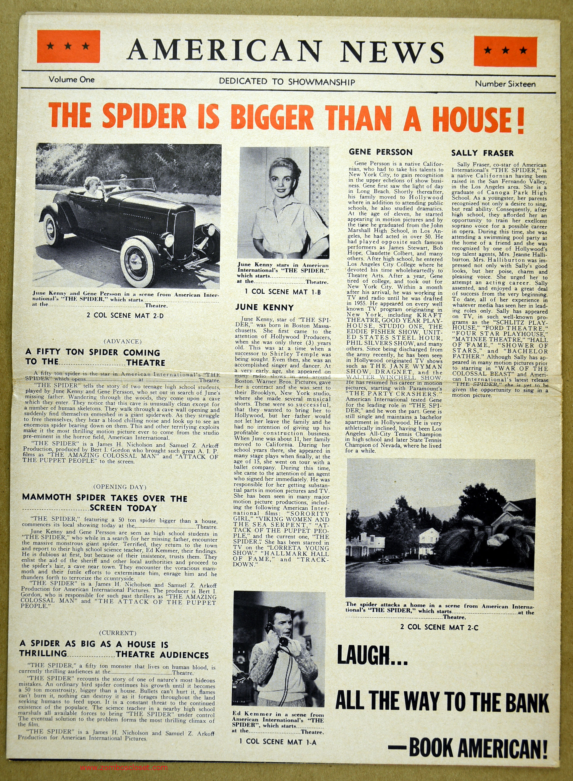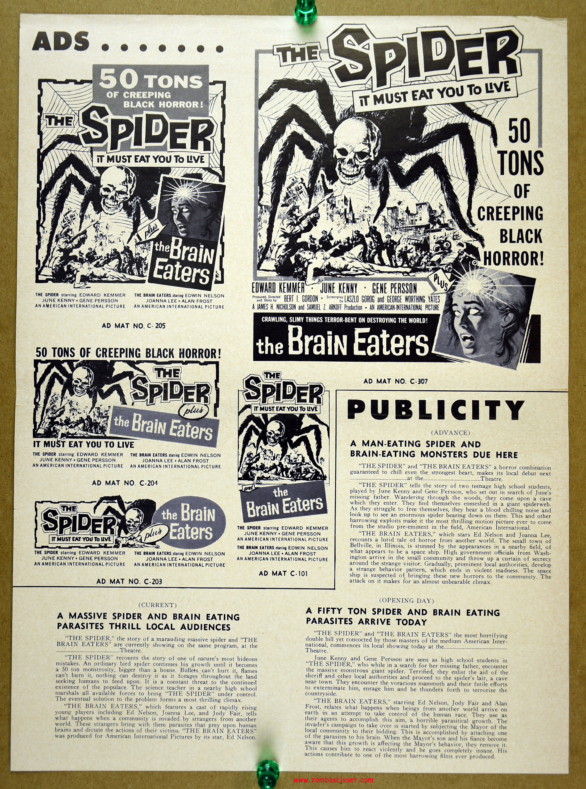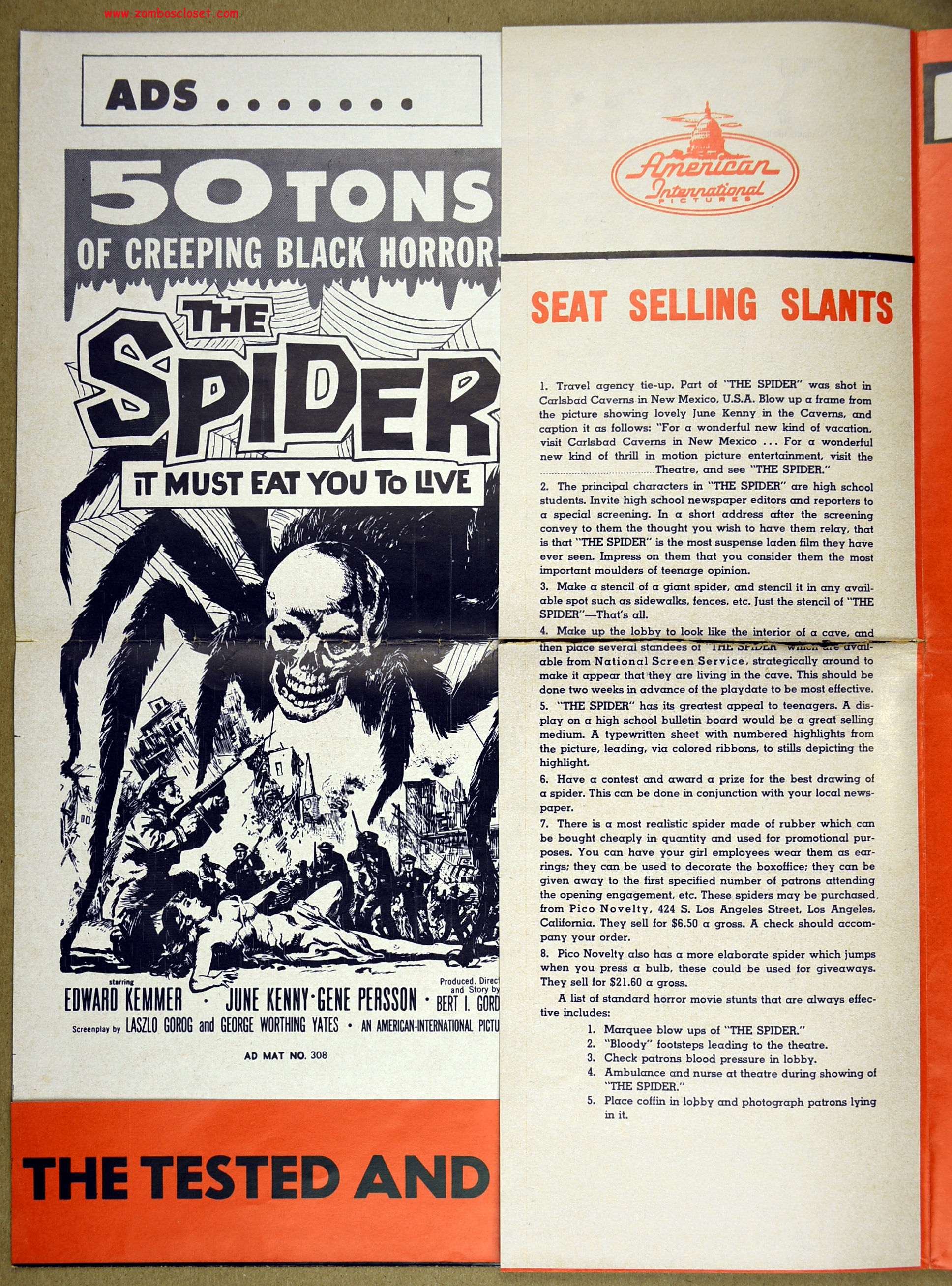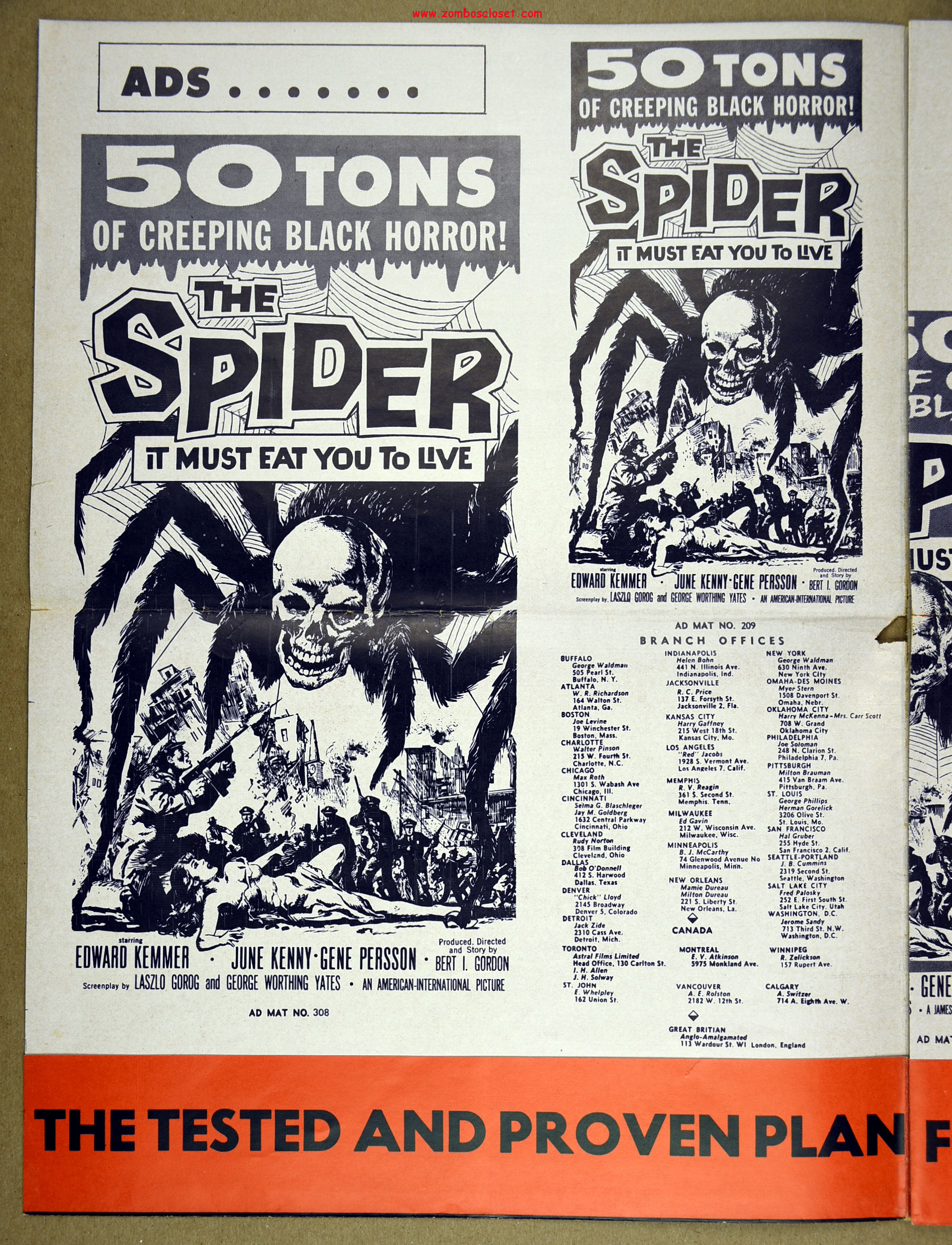 Movies with spiders always creep me out. Originally titled Earth vs. the Spider, after The Fly successfully buzzed theaters, AIP honchos decided to shorten the title to The Spider. Now that would have made a nice midnight double bill showing, don’t you think? The poster art shows more verve than the movie, but it’s still enjoyable: big spiders and small towns always work well together.