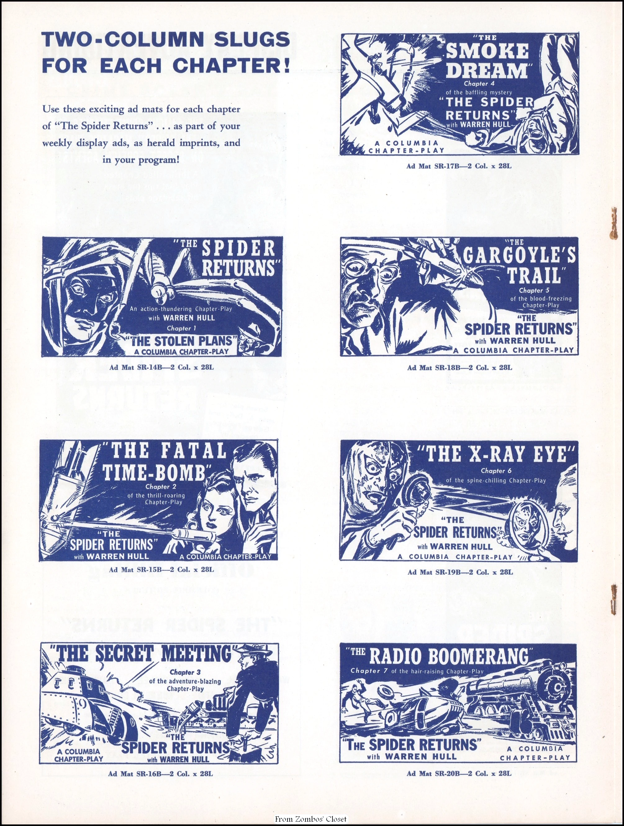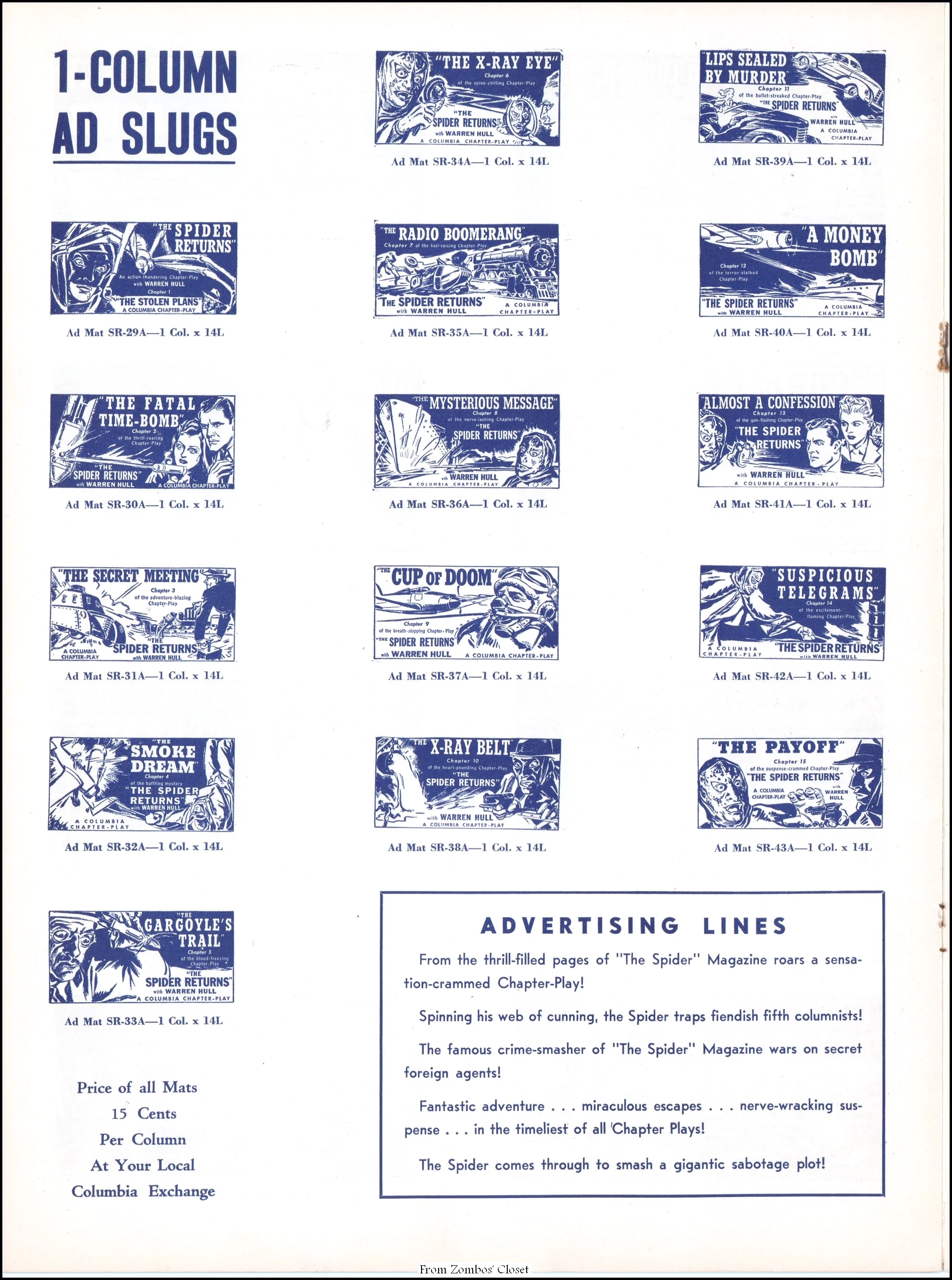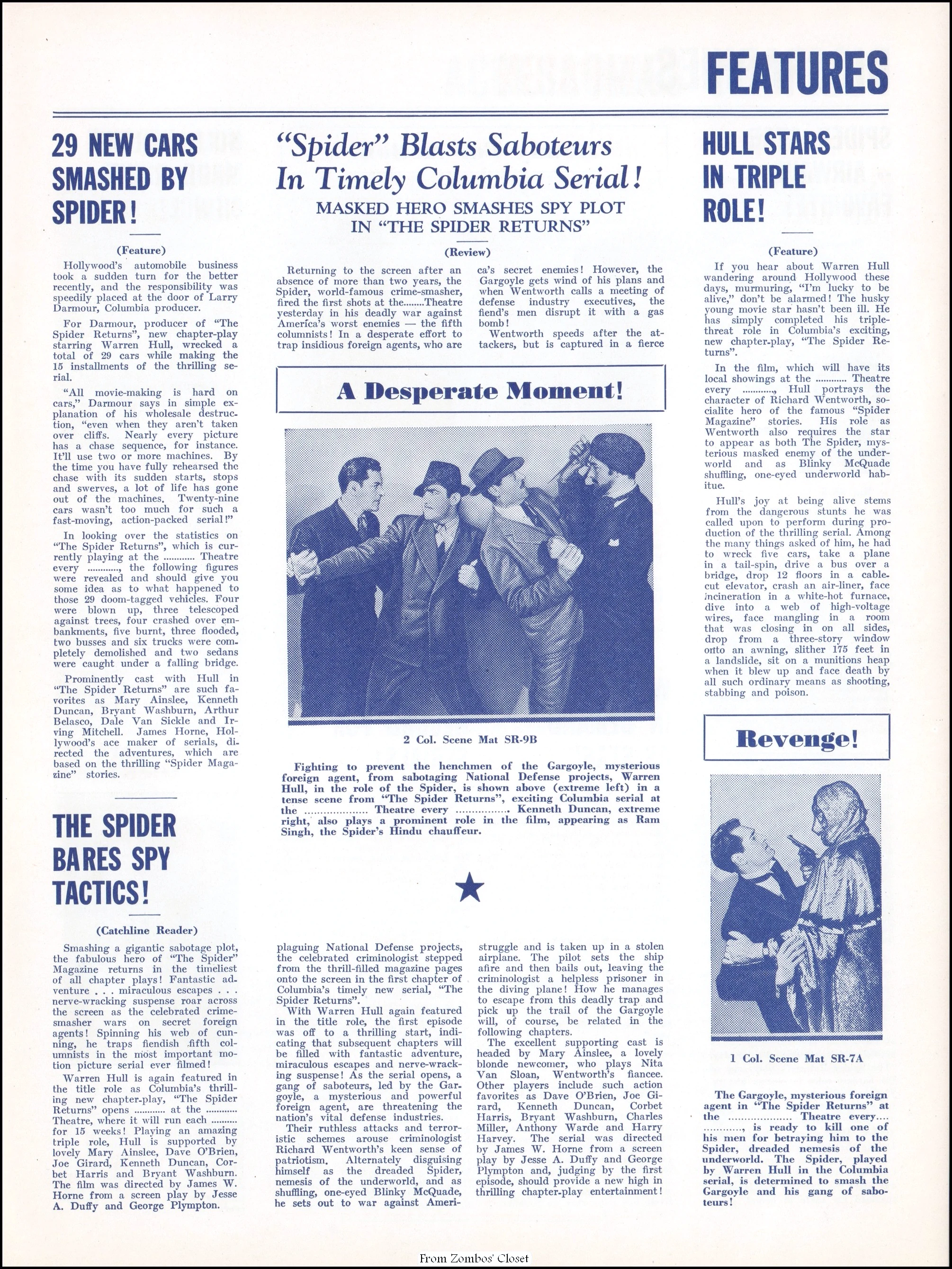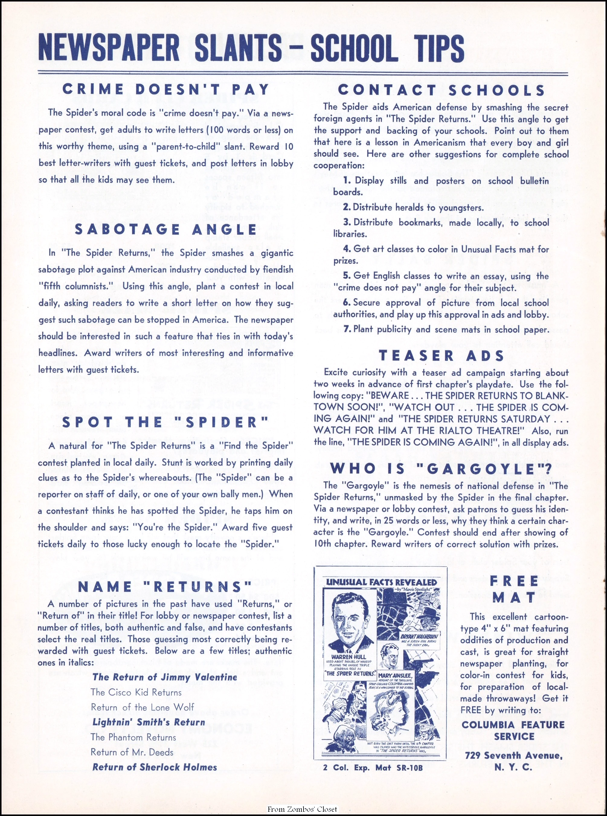 The Spider Returns 15-chapter serial brings the pulp hero, The Spider, to the big screen for a second time. This sequel to 1938’s The Spiders Web, is a bit more tongue-in-cheek with the usual fisticuffs and mayhem delivered by the Gargoyle, another crimelord with Fifth Column connections, with his usual assortment of ruffians to do his bidding. The movies embellished on The Spider’s (played by Warren Hull) wardrobe by giving him a spiderweb pattern across his cape and head disguise. Otherwise, he’d be the spitting image of The Shadow, another popular pulp hero dressed all in black, who hit the movies starting in 1941. It is interesting to note the Newspaper Slants – School Tips page suggests contacting schools to hype the movie.