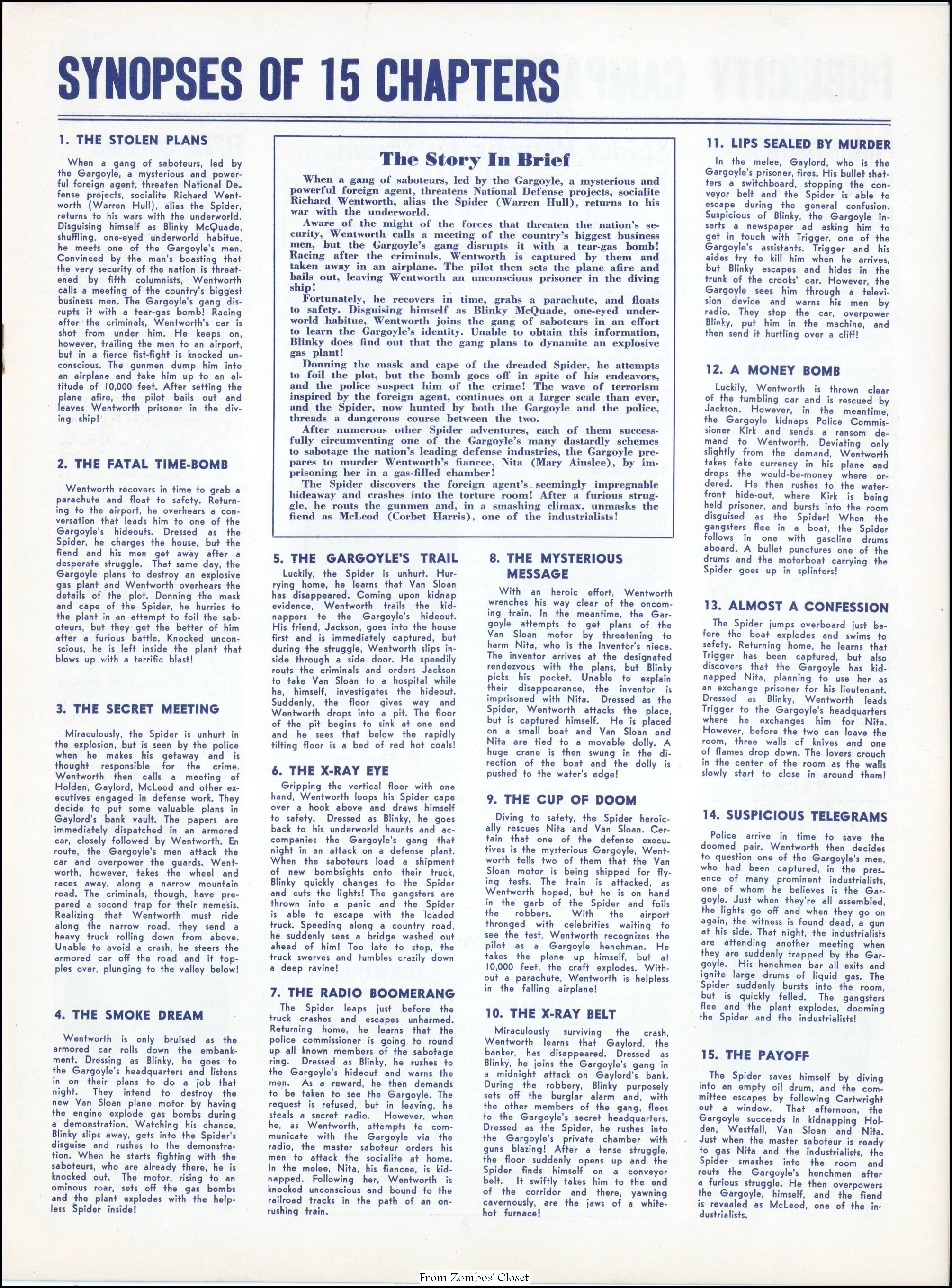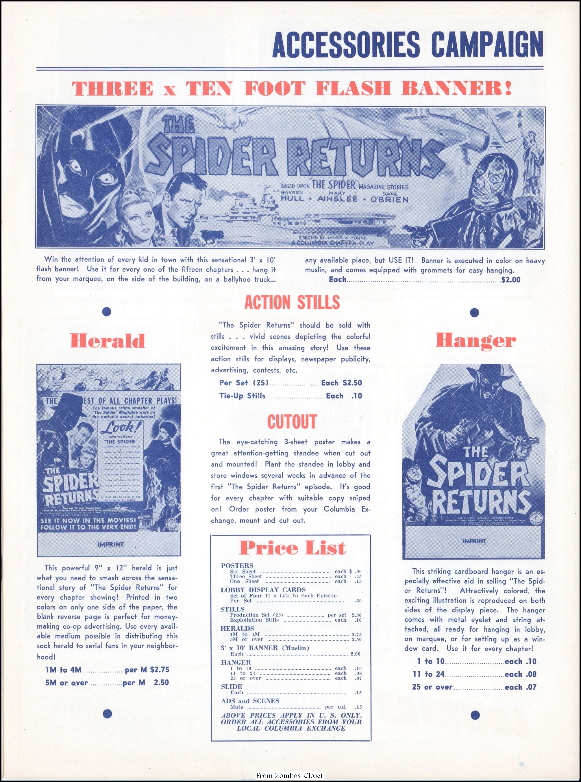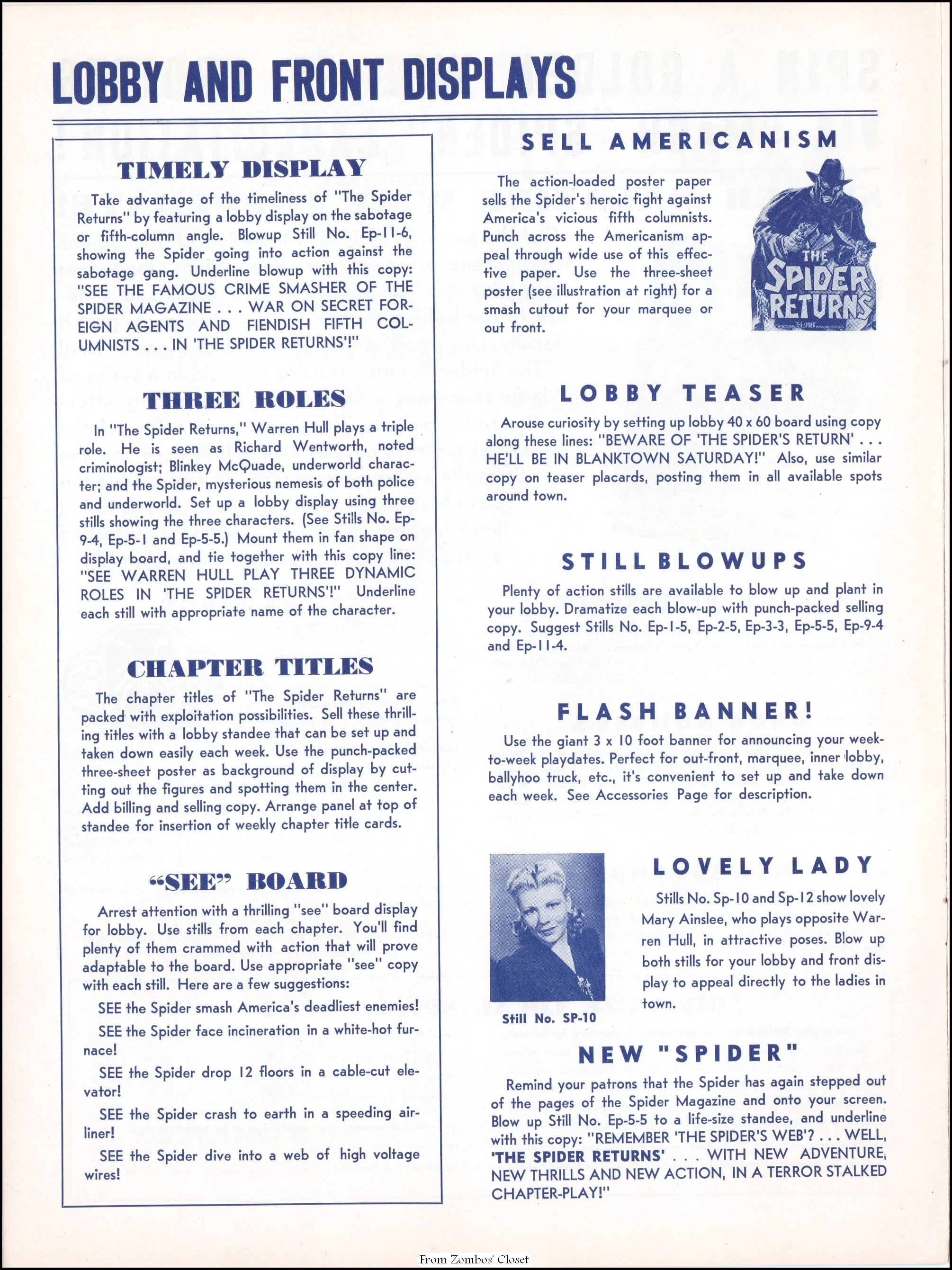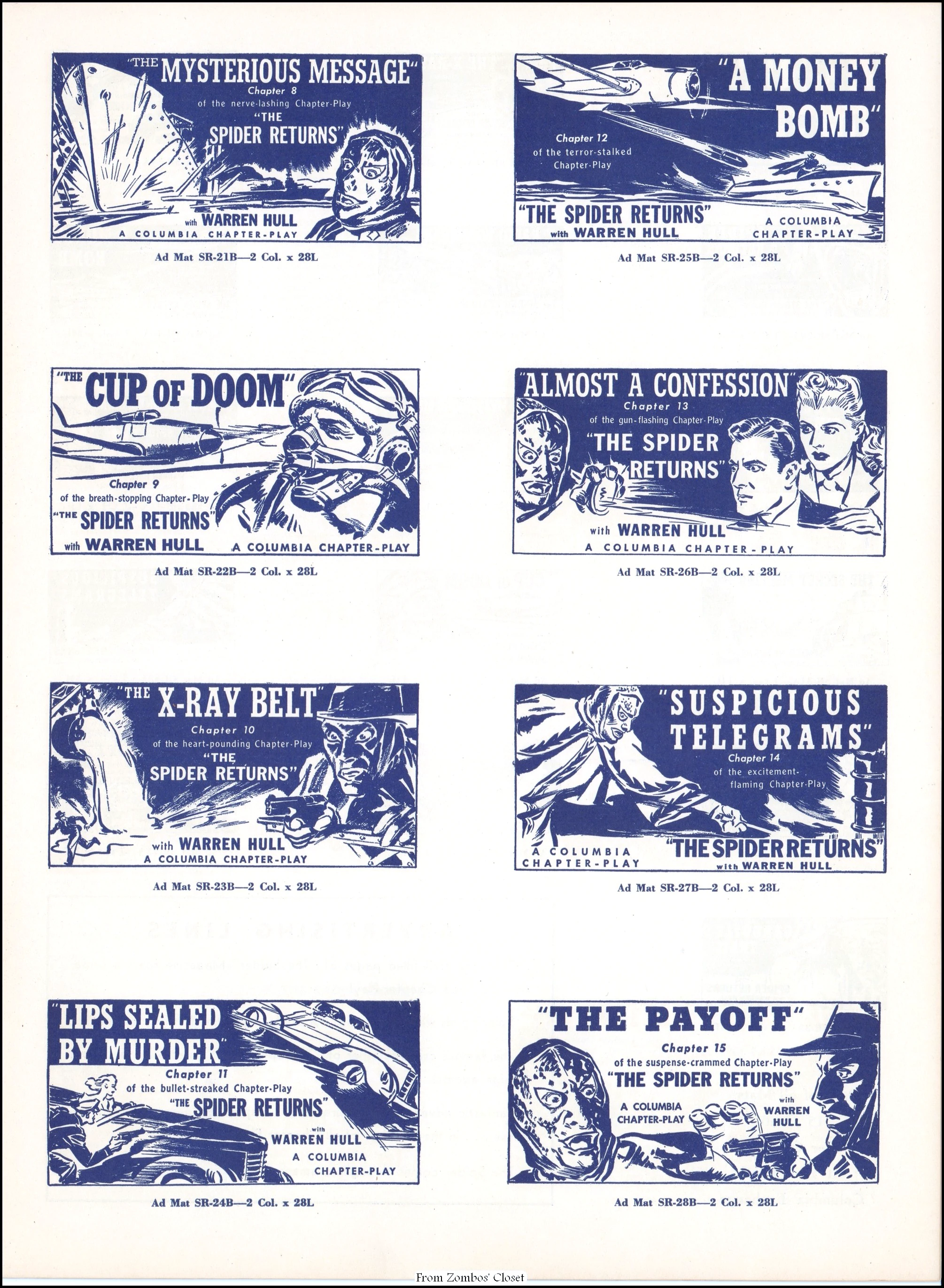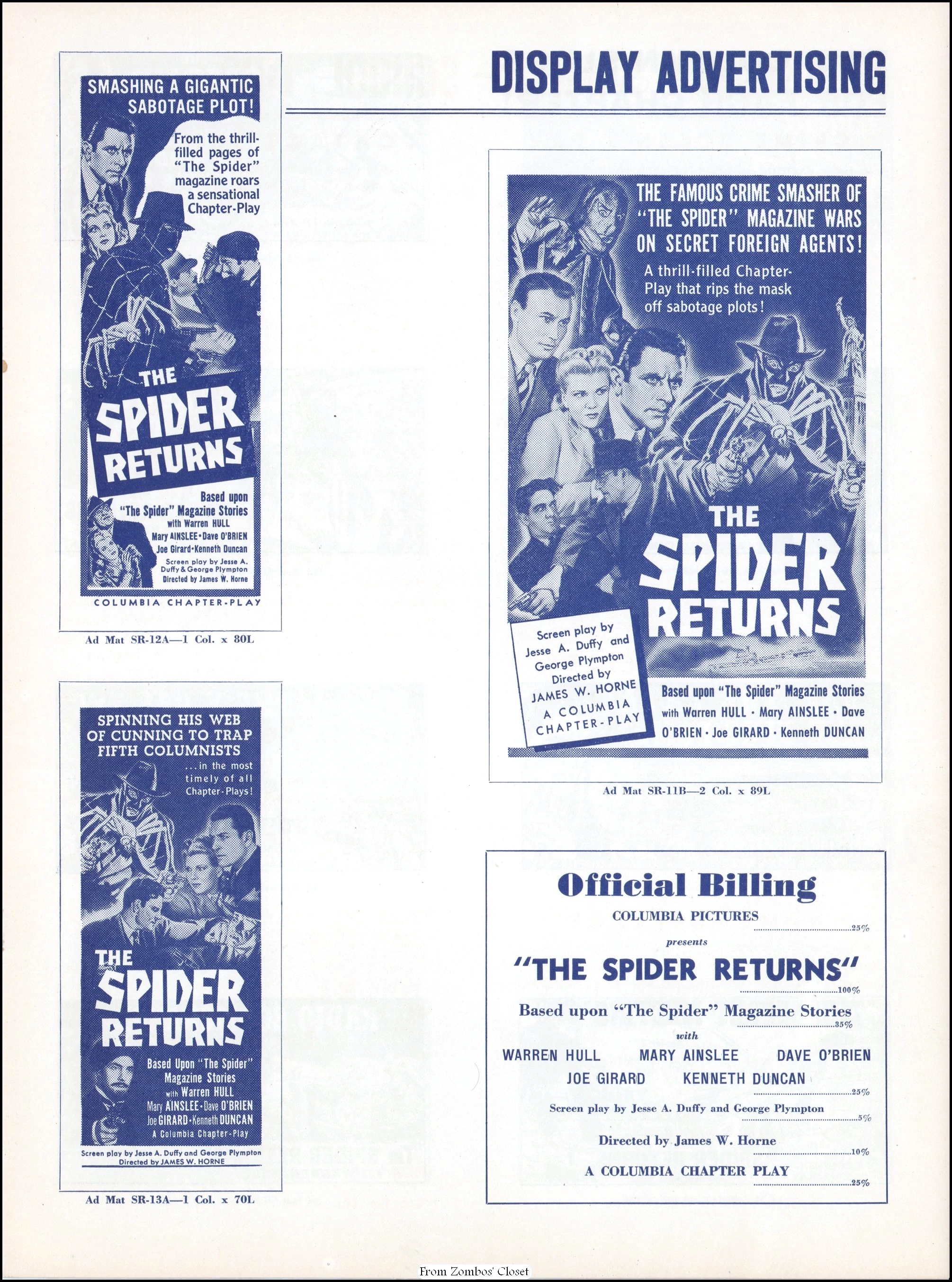 The Spider Returns 15-chapter serial brings the pulp hero, The Spider, to the big screen for a second time. This sequel to 1938’s The Spiders Web, is a bit more tongue-in-cheek with the usual fisticuffs and mayhem delivered by the Gargoyle, another crimelord with Fifth Column connections, with his usual assortment of ruffians to do his bidding. The movies embellished on The Spider’s (played by Warren Hull) wardrobe by giving him a spiderweb pattern across his cape and head disguise. Otherwise, he’d be the spitting image of The Shadow, another popular pulp hero dressed all in black, who hit the movies starting in 1941. It is interesting to note the Newspaper Slants – School Tips page suggests contacting schools to hype the movie.