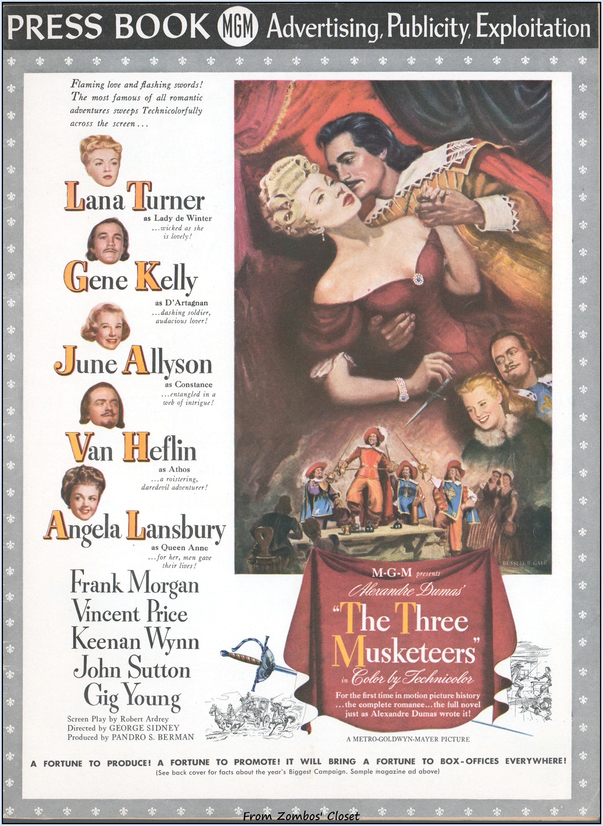 Here’s The Three Musketeers pressbook portion that covered advertising. “The Three Musketeers was an extremely personal project for [Gene] Kelly for two reasons” (from the TCM article on the movie). “The first was the fact that he was recreating the character (D’Artagnan) played by his favorite star (Douglas Fairbanks) in his favorite movie (the 1921 version of The Three Musketeers). Kelly was later quoted in Tony Thomas’ The Films of Gene Kelly: Song and Dance saying “I loved playing this part. As a boy I idolized Fairbanks, Sr. and I raised myself to be a gymnast.” The second reason is that Kelly was hoping his performance in The Three Musketeers would convince MGM to let him do a musical version of Edmond Rostand’s Cyrano De Bergerac.. Regardless of his energetic performance in The Three Musketeers, the studio brass wouldn’t go for a musical Cyrano even though Kelly pestered them for years about it.”