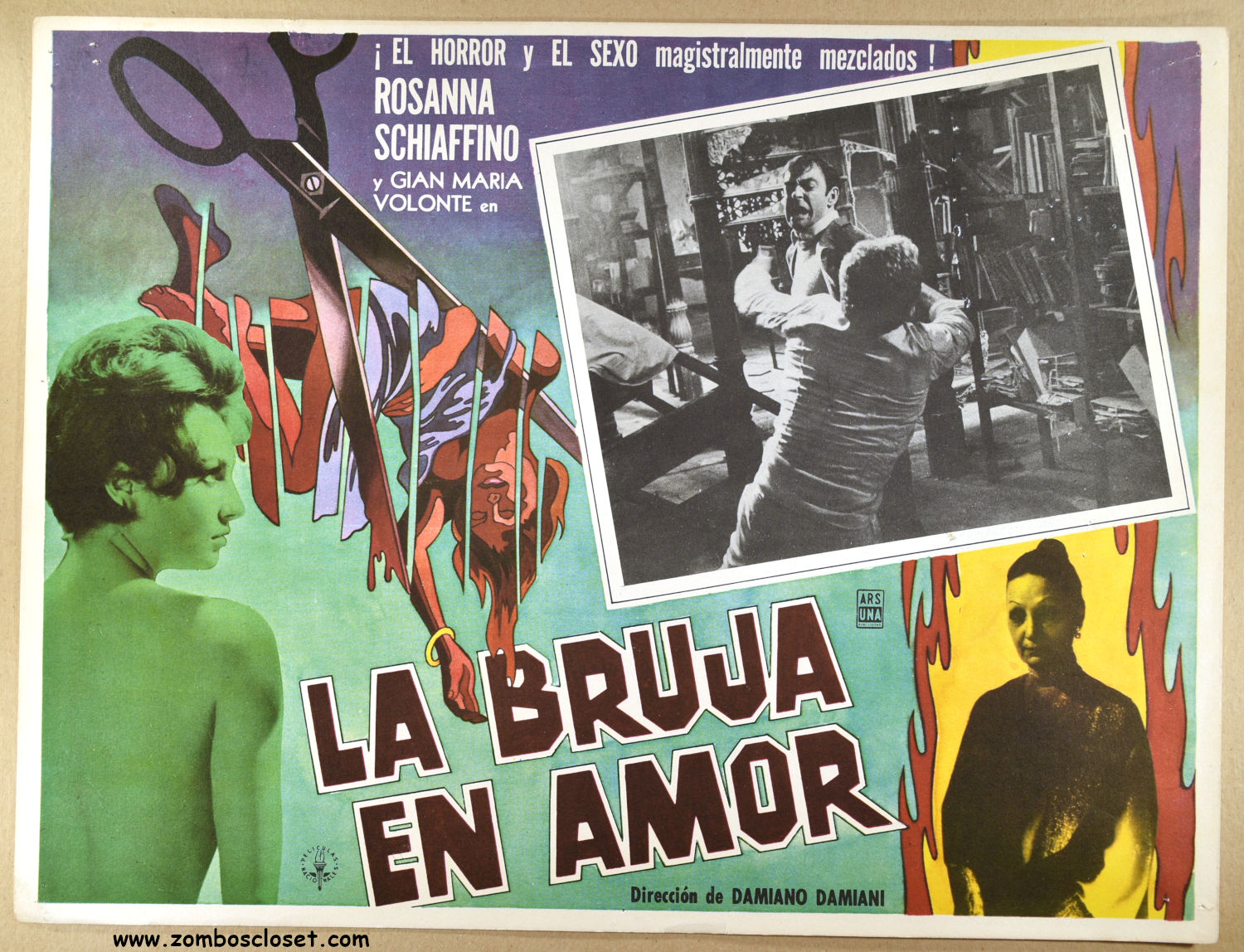 A very ominous Mexican lobby card for Damiano Damiani’s The Witch in Love (La strega in amore). This is a good example of how a simple layout can add subtle and not so subtle themes: the main scissor illustration showing violence and death; the younger woman on the left showing erotic fantasy but also foreboding as she faces toward the woman on the right; and the flaming passion or ill-intent shown by that older woman on the right. The eyes are drawn to each of these three visual statements in that order. The inset scene is one of action, too, which keeps the level of tension across this lobby card quite high.