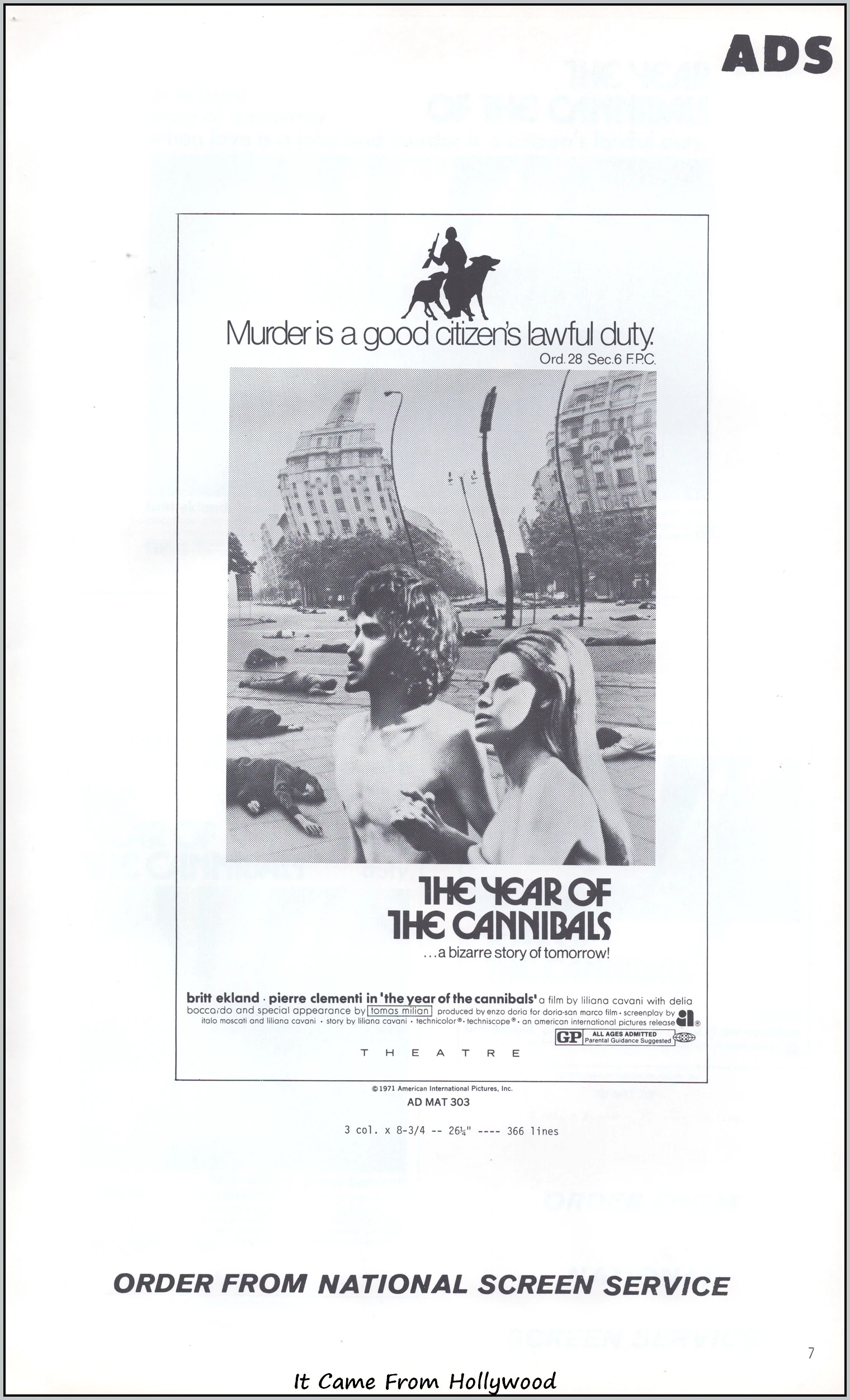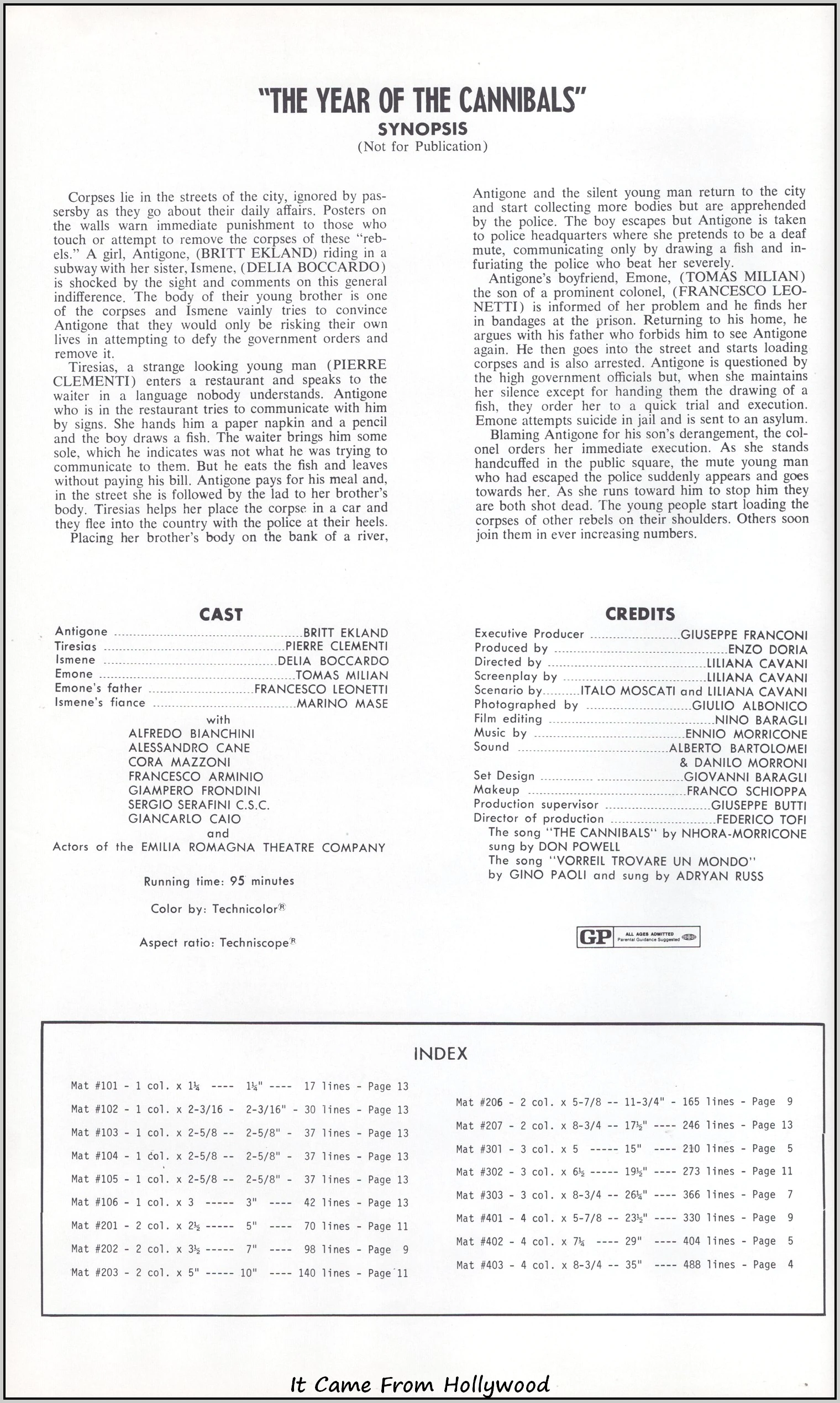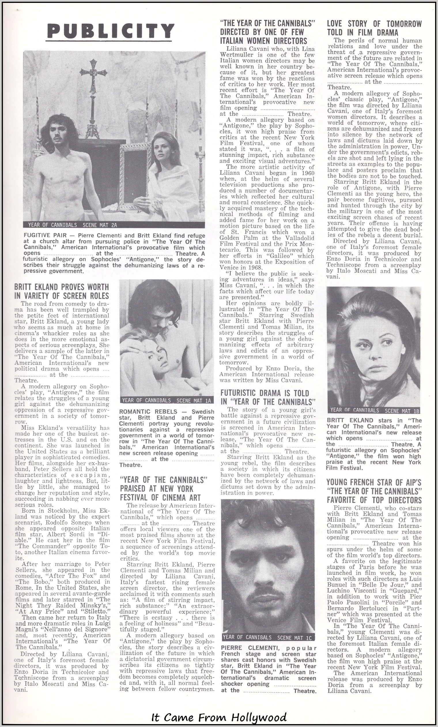 The Year of the Cannibals is an updated retelling of Antigone, the Greek play by Sophocles, where two warring factions leave the dead in their wake. Britt Ekland plays Antigone. In this version, bodies are left openly in the streets and young people start to defy authorities to bury them. AIP distributed the dubbed movie in 1971 (IMDb).