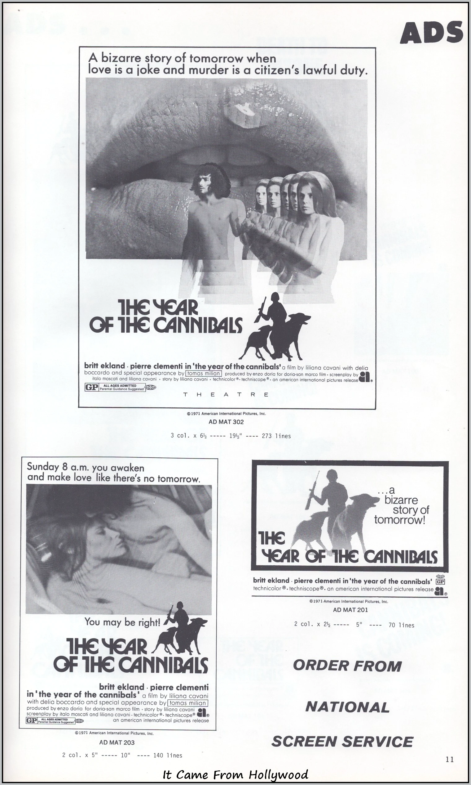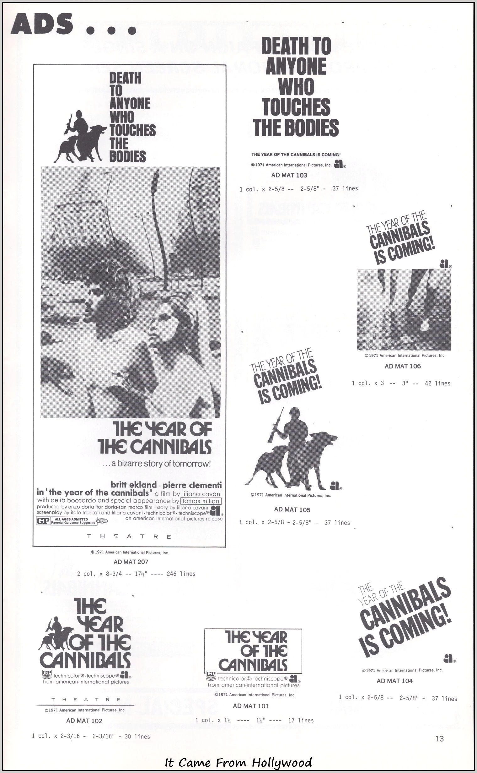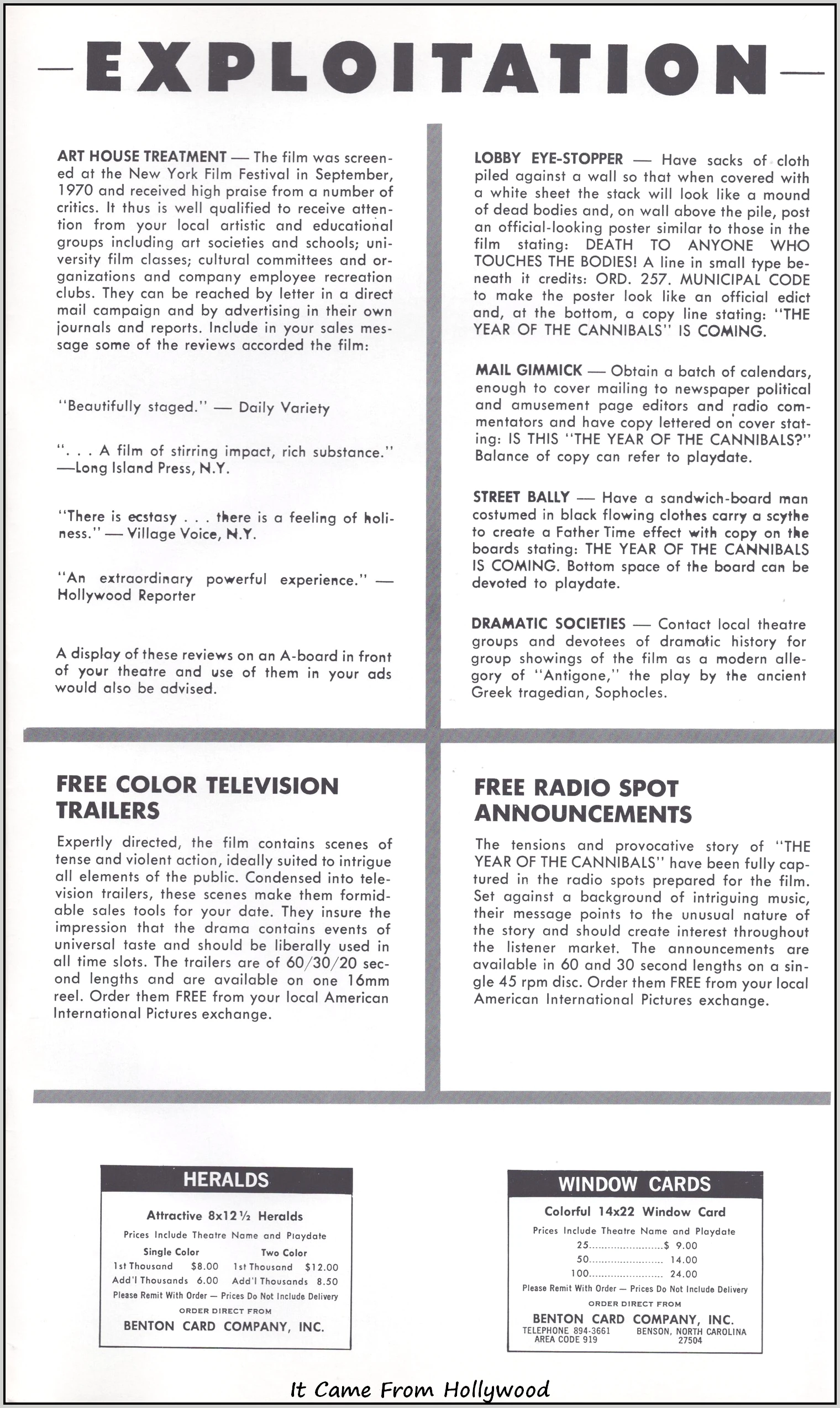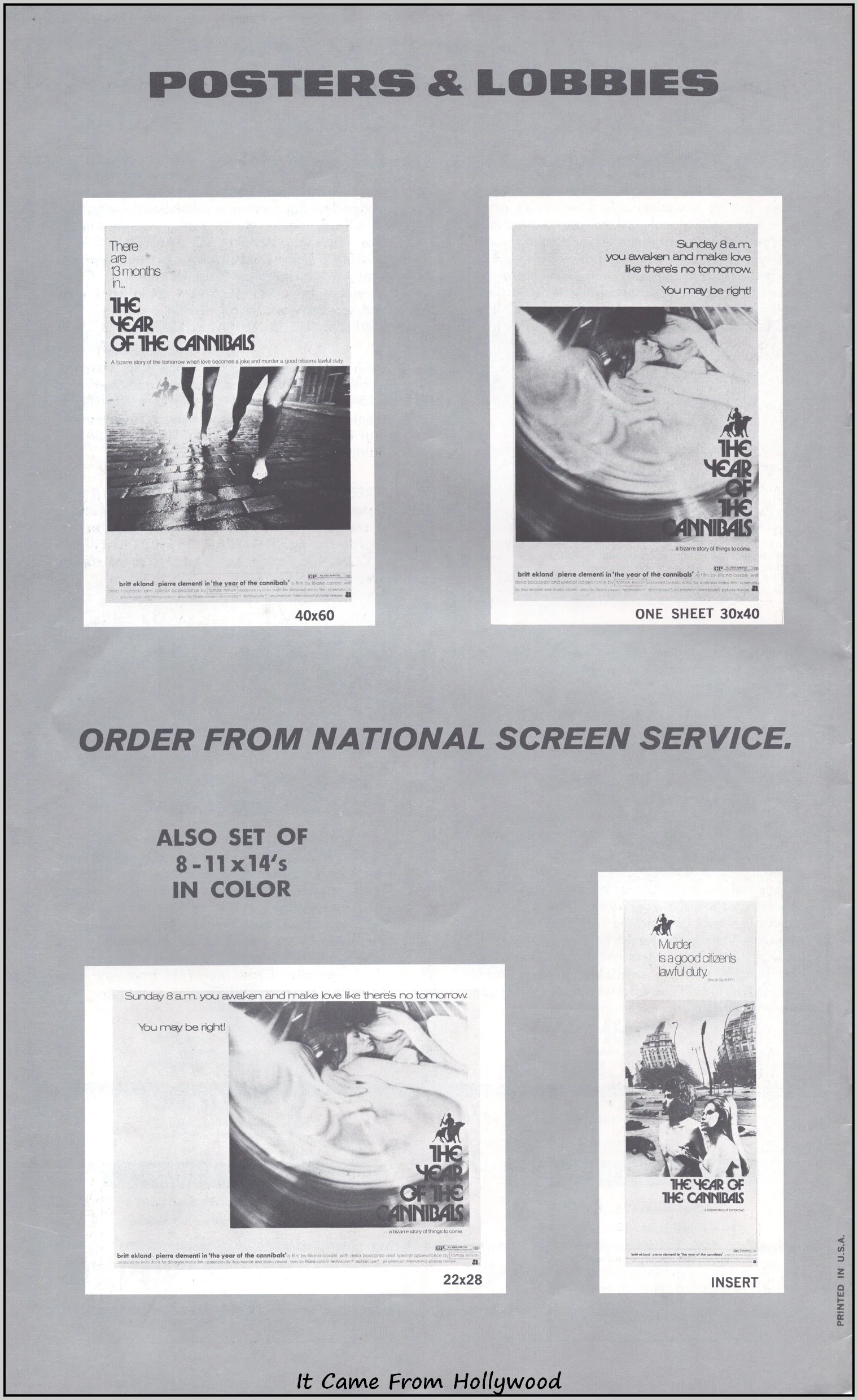 The Year of the Cannibals is an updated retelling of Antigone, the Greek play by Sophocles, where two warring factions leave the dead in their wake. Britt Ekland plays Antigone. In this version, bodies are left openly in the streets and young people start to defy authorities to bury them. AIP distributed the dubbed movie in 1971 (IMDb).