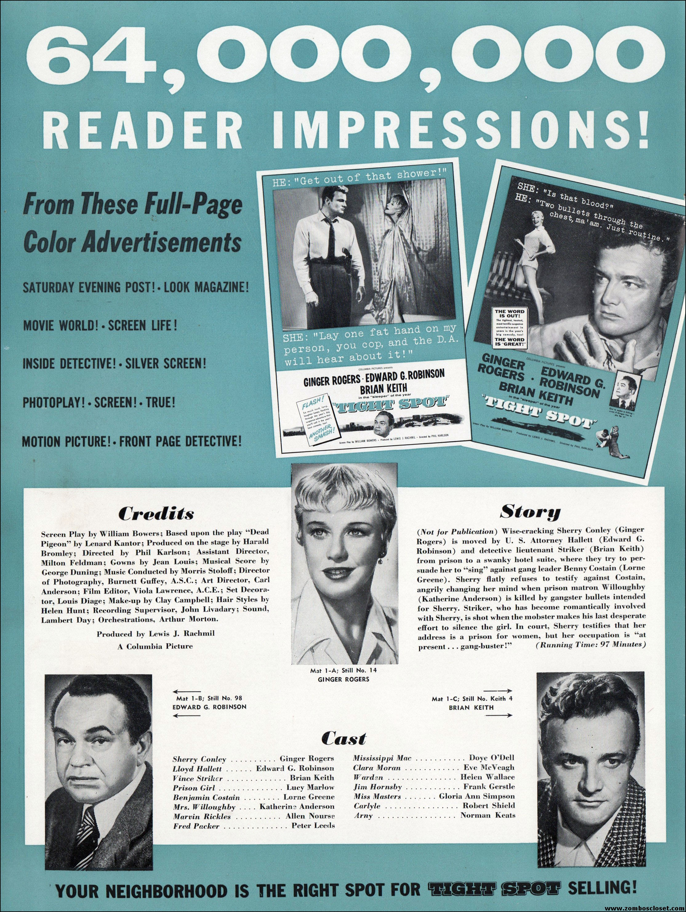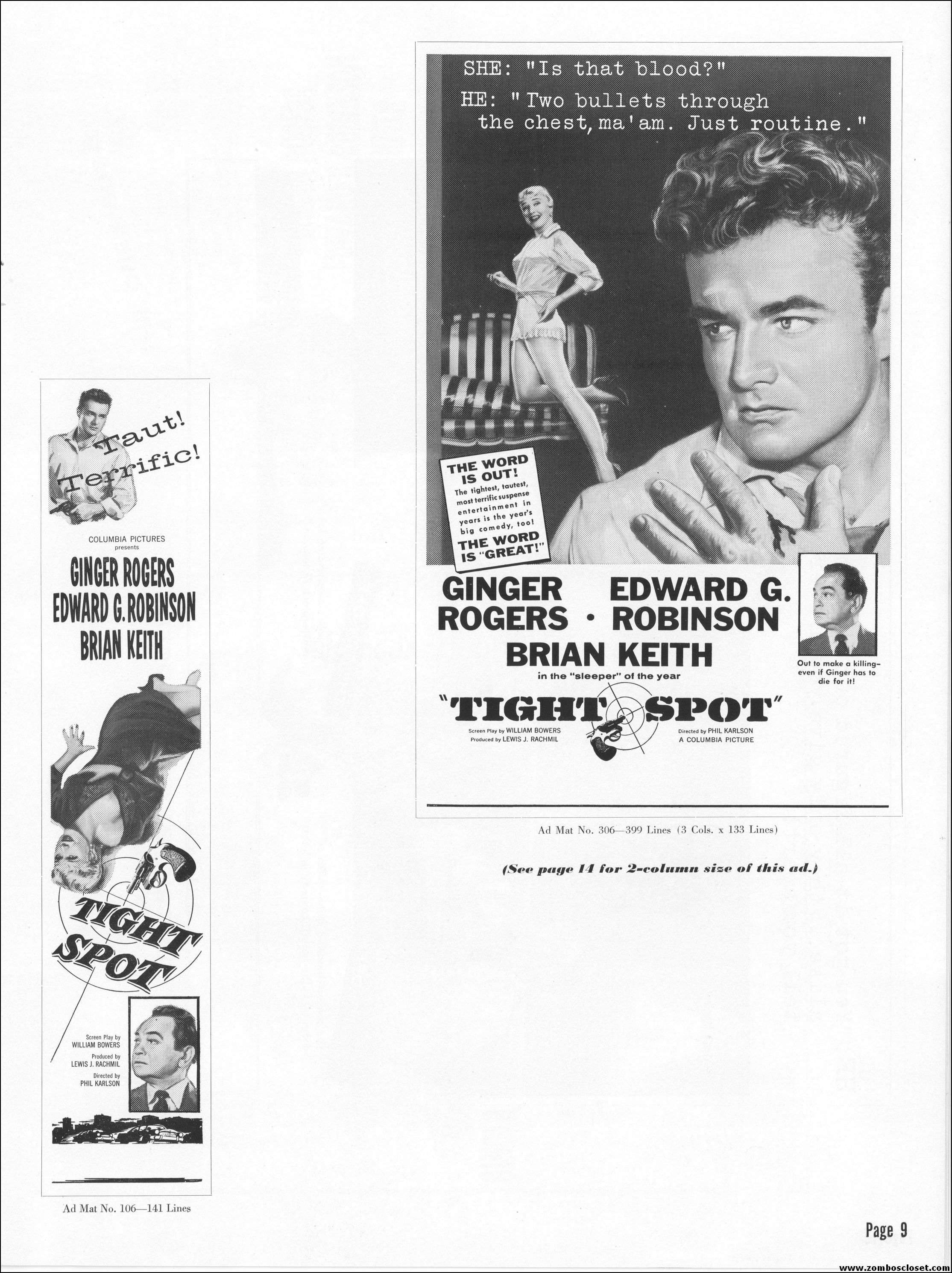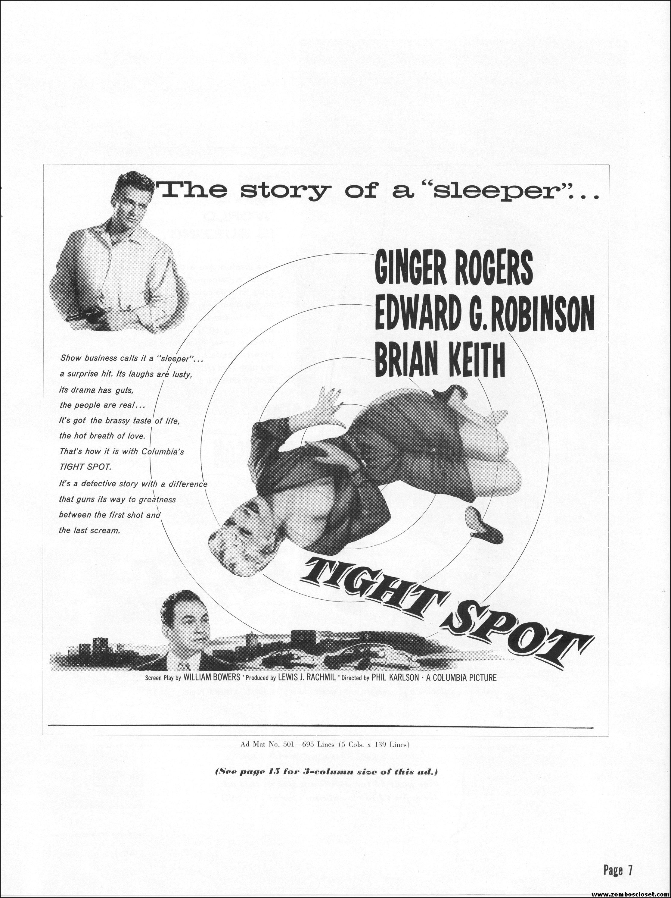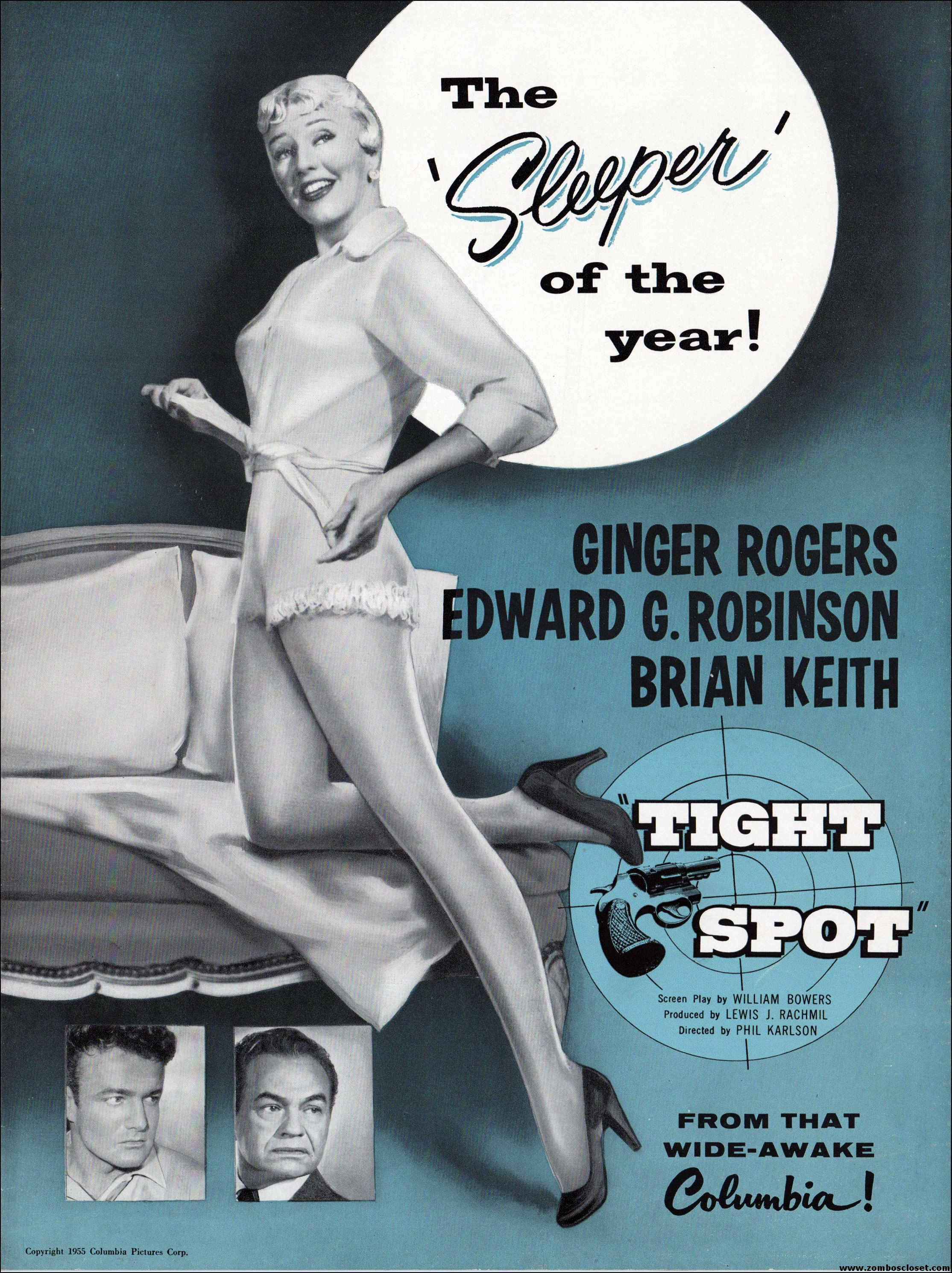Like a little ginger cheesecake with your film noir? Here’s Ginger Rogers in Tight Spot, a movie with some kick as she’s manhandled by the cops and the criminals. Brian Keith plays the big lug who falls for her tight legs and snippy personality. Edward G. Robinson looks short in every scene but acts big as usual. The cast is gold, the dialog a bit too sappy, but this one’s a keeper even without the dancing.