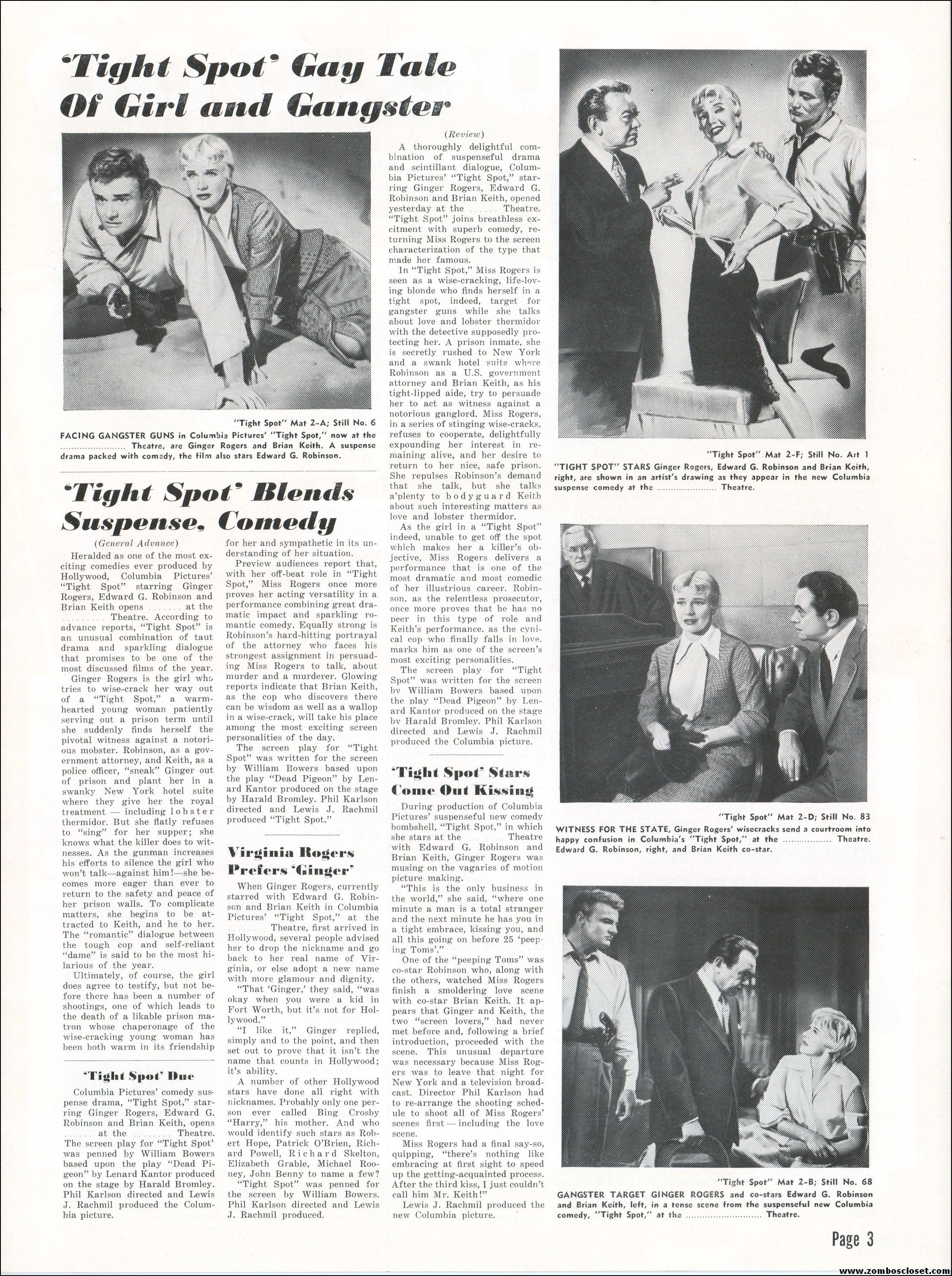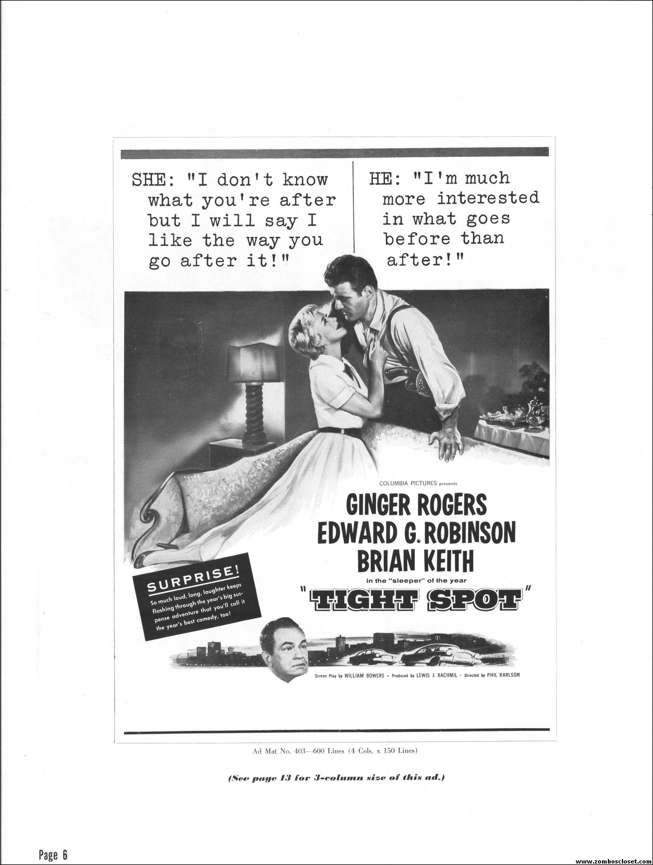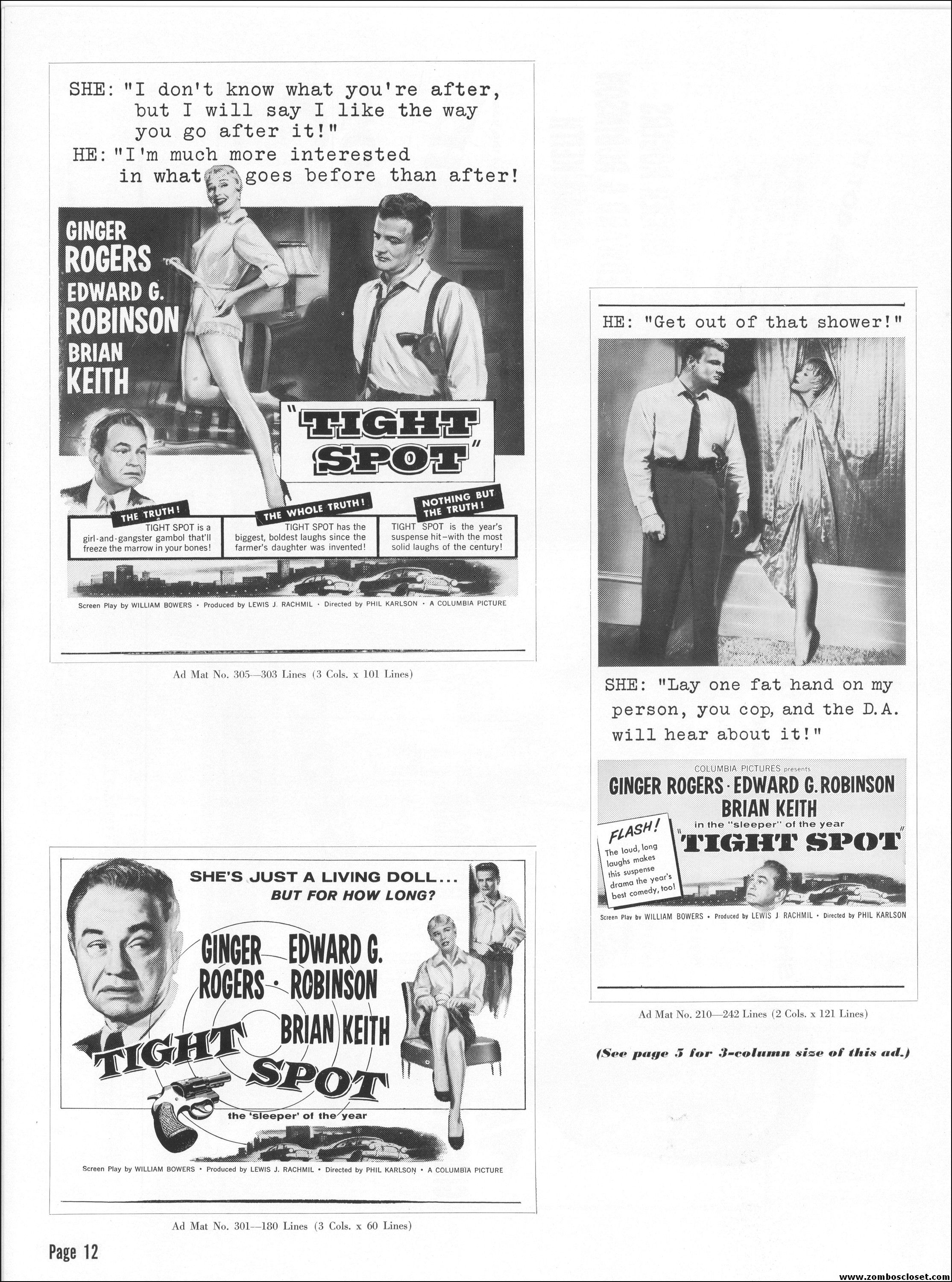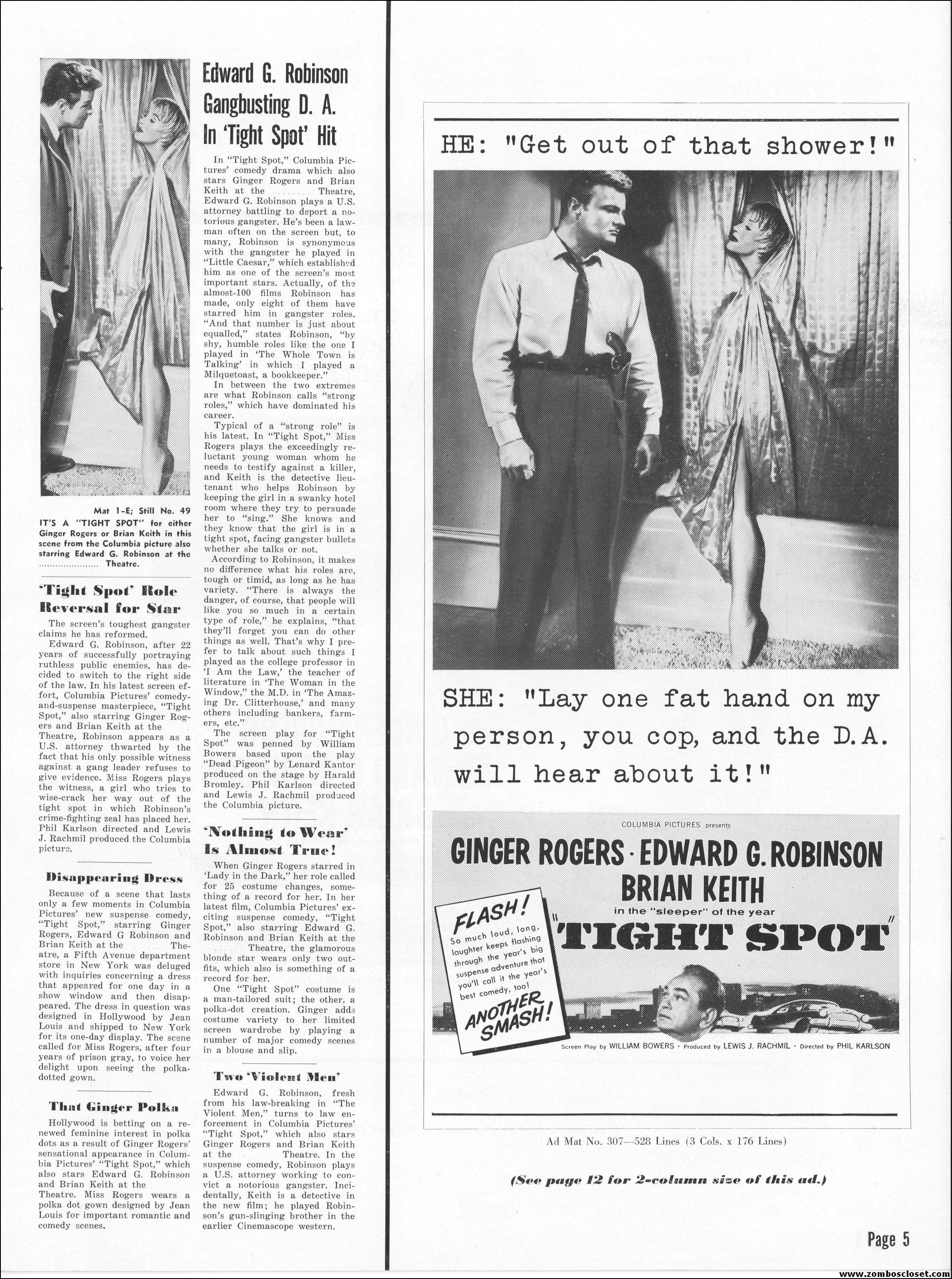 Like a little ginger cheesecake with your film noir? Here’s Ginger Rogers in Tight Spot, a movie with some kick as she’s manhandled by the cops and the criminals. Brian Keith plays the big lug who falls for her tight legs and snippy personality. Edward G. Robinson looks short in every scene but acts big as usual. The cast is gold, the dialog a bit too sappy, but this one’s a keeper even without the dancing.