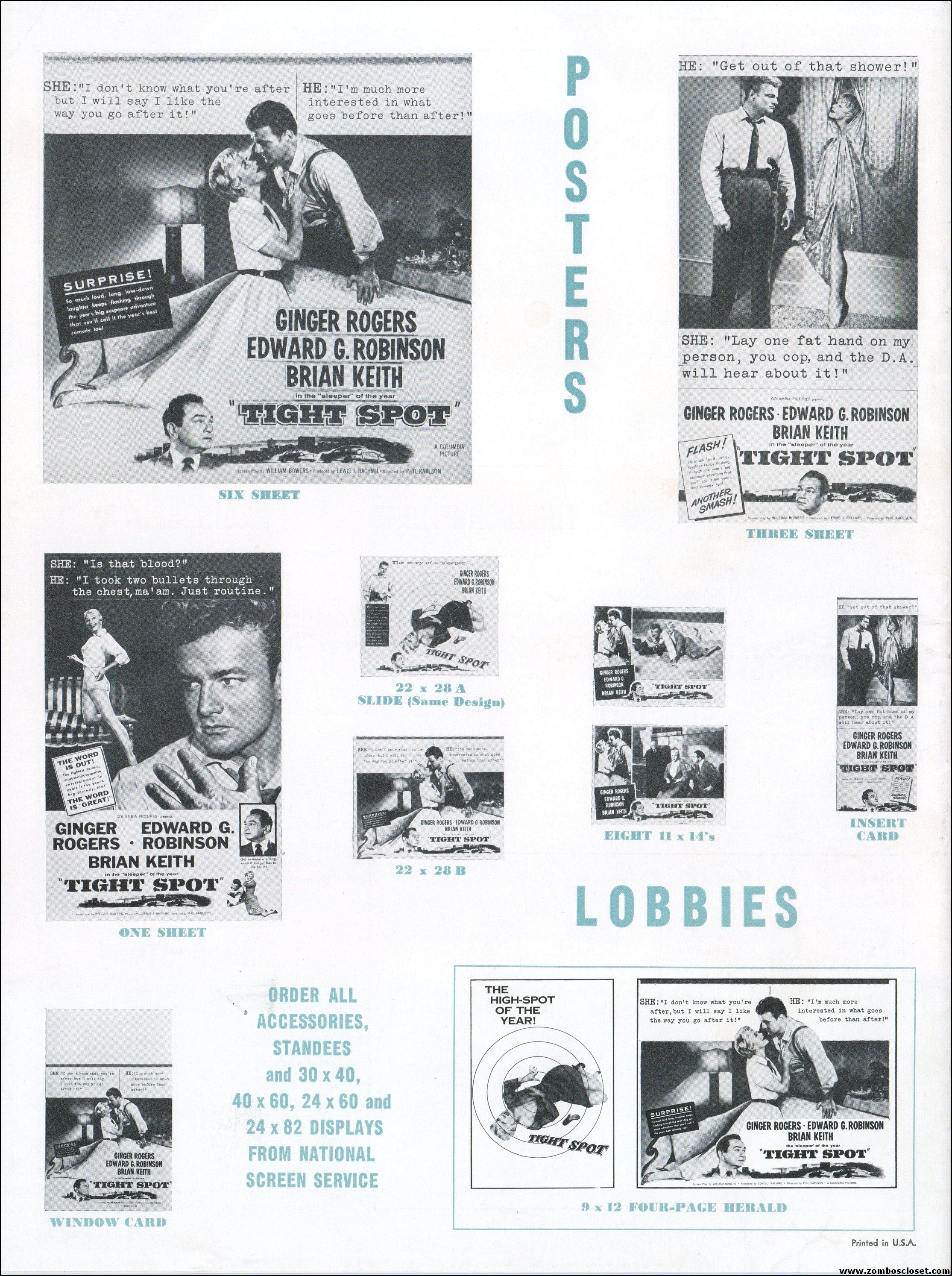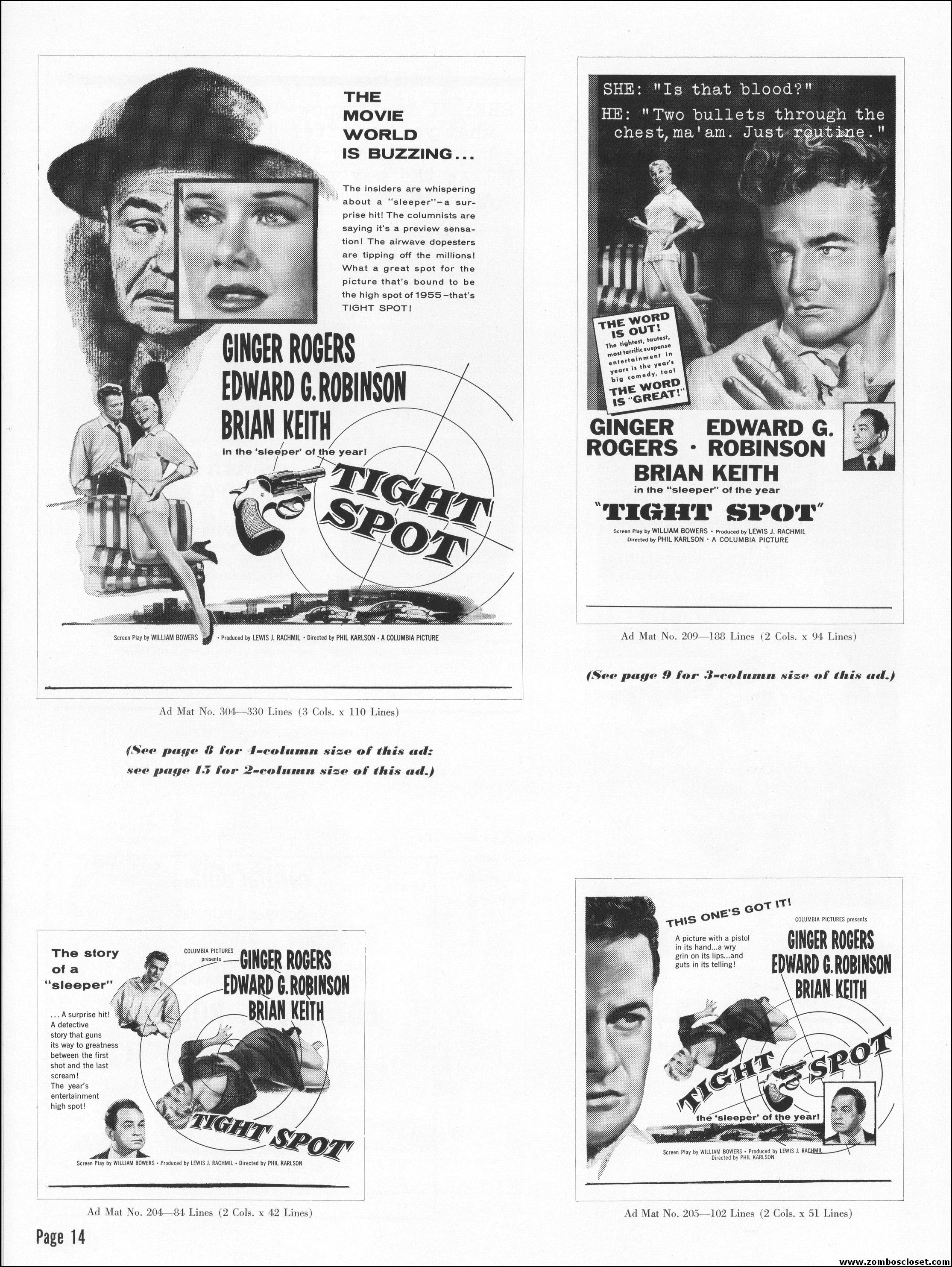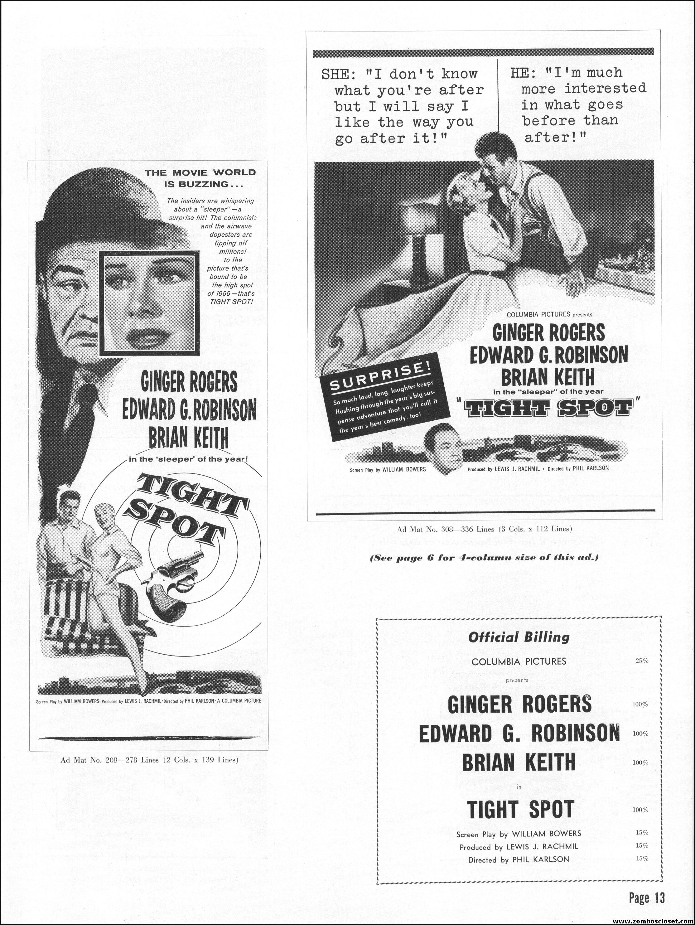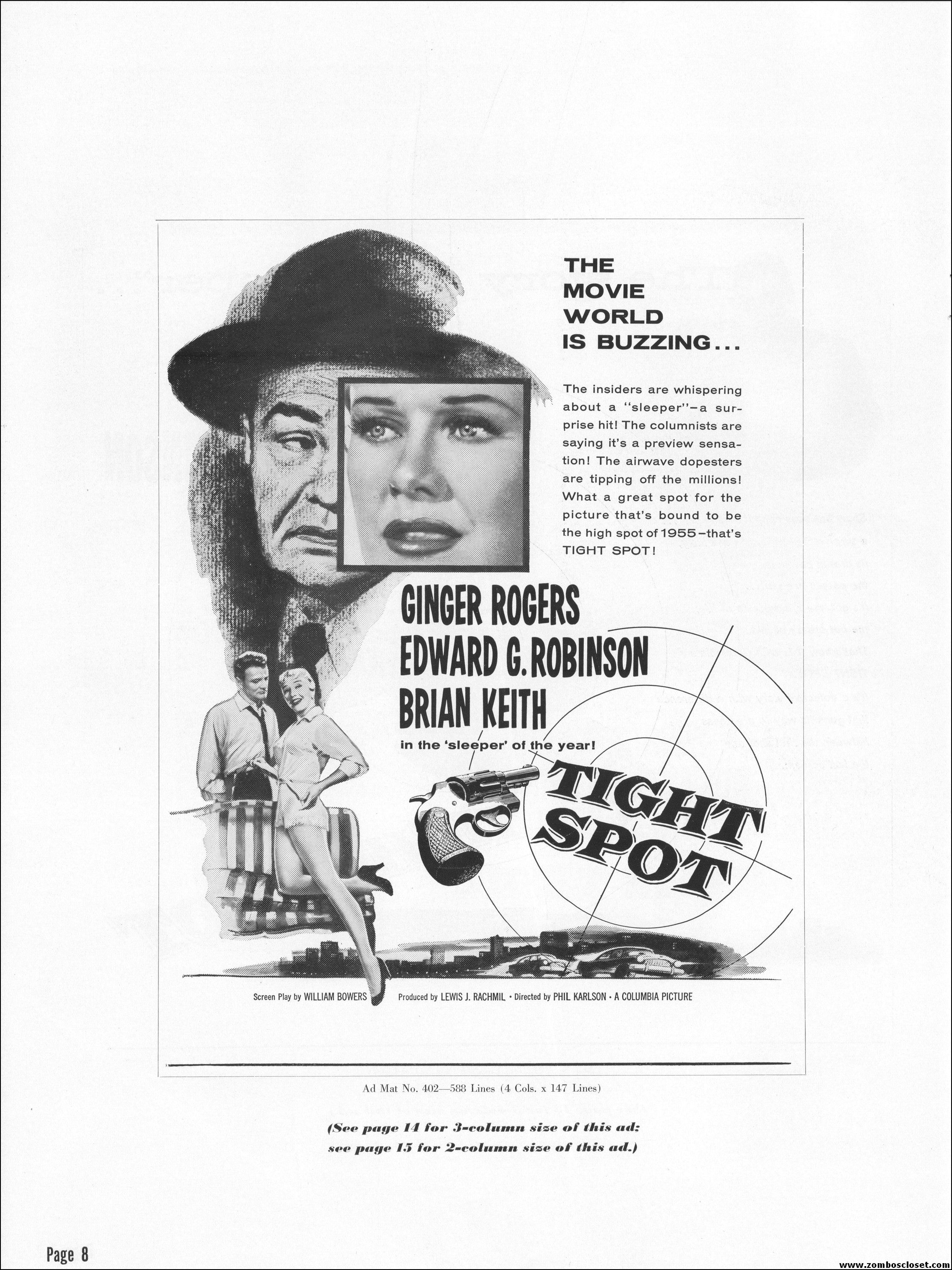 Like a little ginger cheesecake with your film noir? Here’s Ginger Rogers in Tight Spot, a movie with some kick as she’s manhandled by the cops and the criminals. Brian Keith plays the big lug who falls for her tight legs and snippy personality. Edward G. Robinson looks short in every scene but acts big as usual. The cast is gold, the dialog a bit too sappy, but this one’s a keeper even without the dancing.
