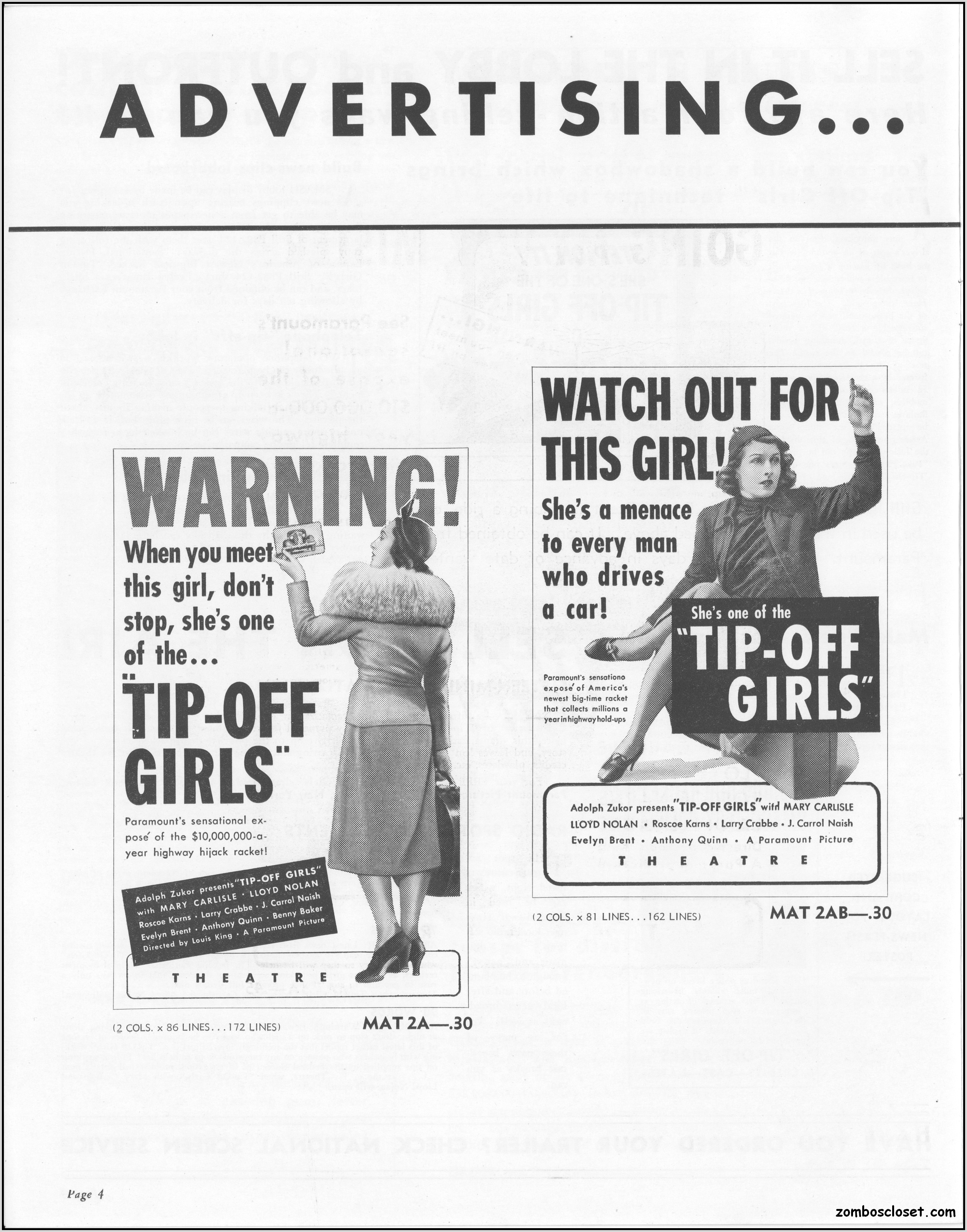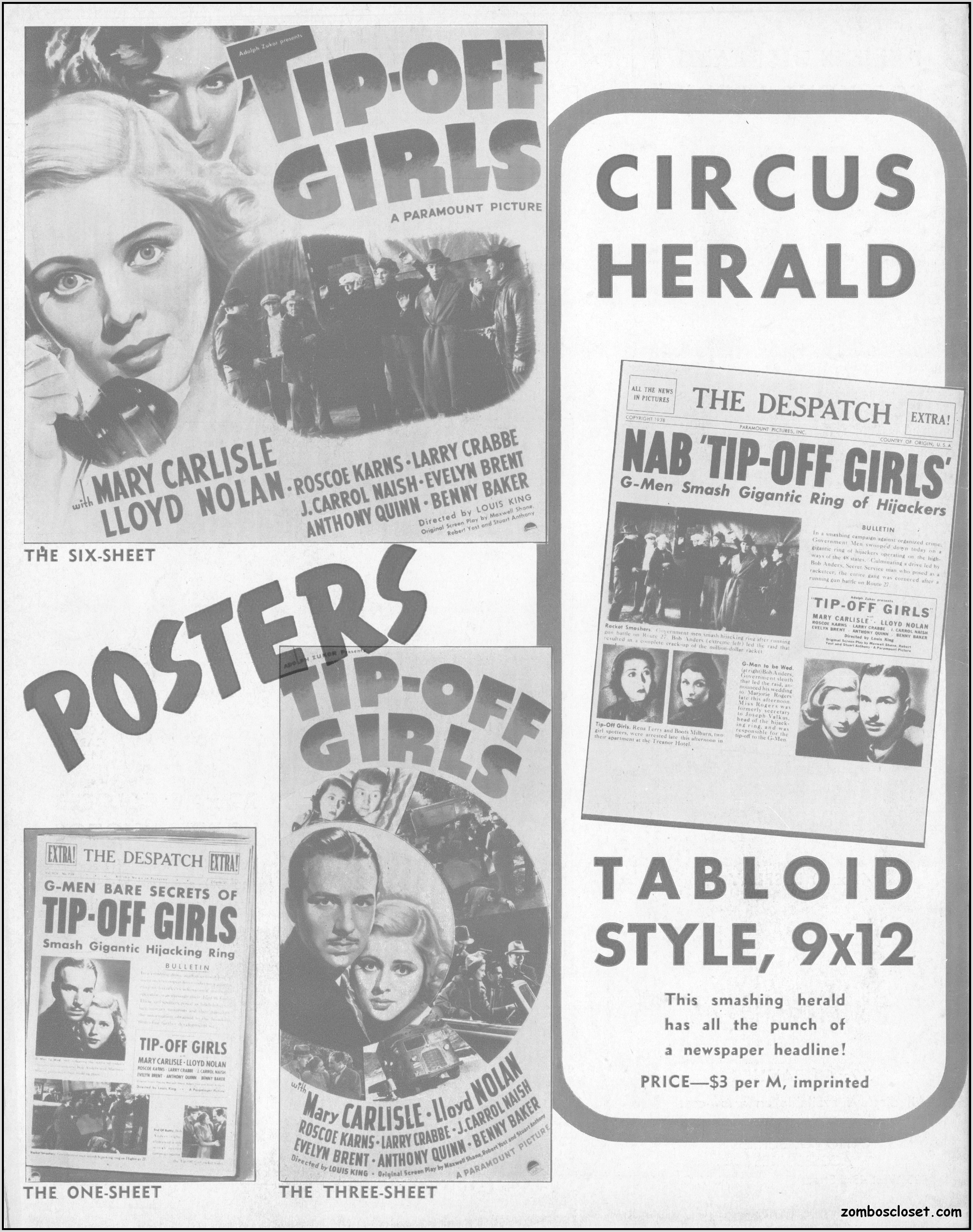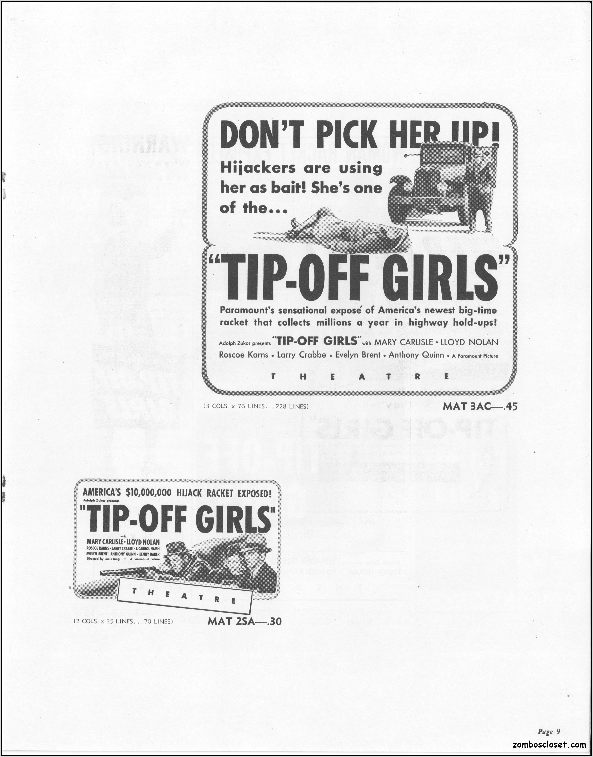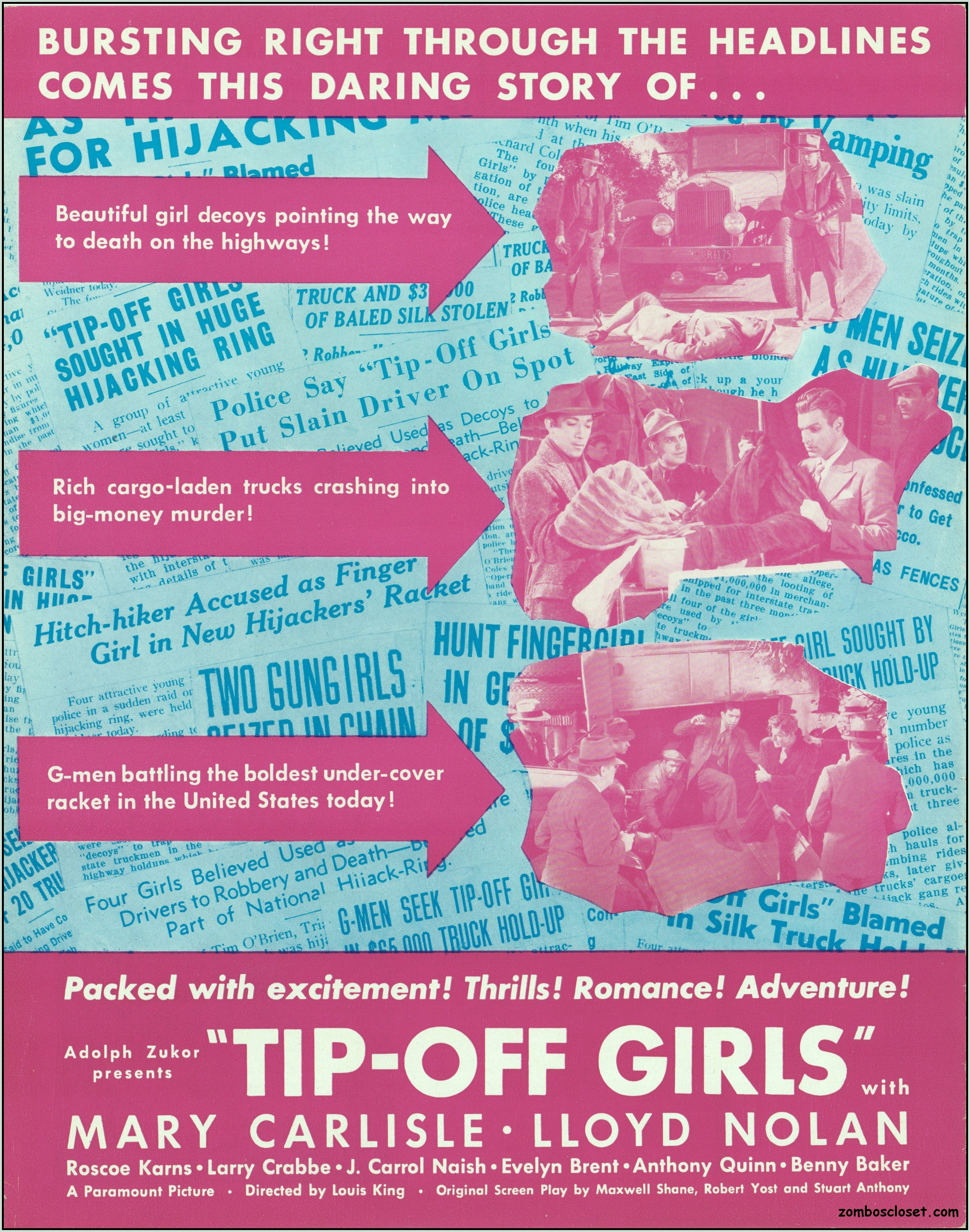 One does not live by horror movies alone. Sometimes a good crime melodrama, noir, western, fantasy, science fiction, guy movie, girl movie, kid movie, or documentary will do. This time around it's crime! The reason I found this pressbook so interesting was its use of pink and blue tones, and the fact that I like crime movies from the 1930s to 1950s. This one boasts a good cast with Larry "Buster" Crabbe, Anthony Quinn, Lloyd Nolan, Evelyn Brent, Mary Carlisle, and J. Carol Naish. The premise is bad girls helping rob trucks of their cargo. Shame on them!