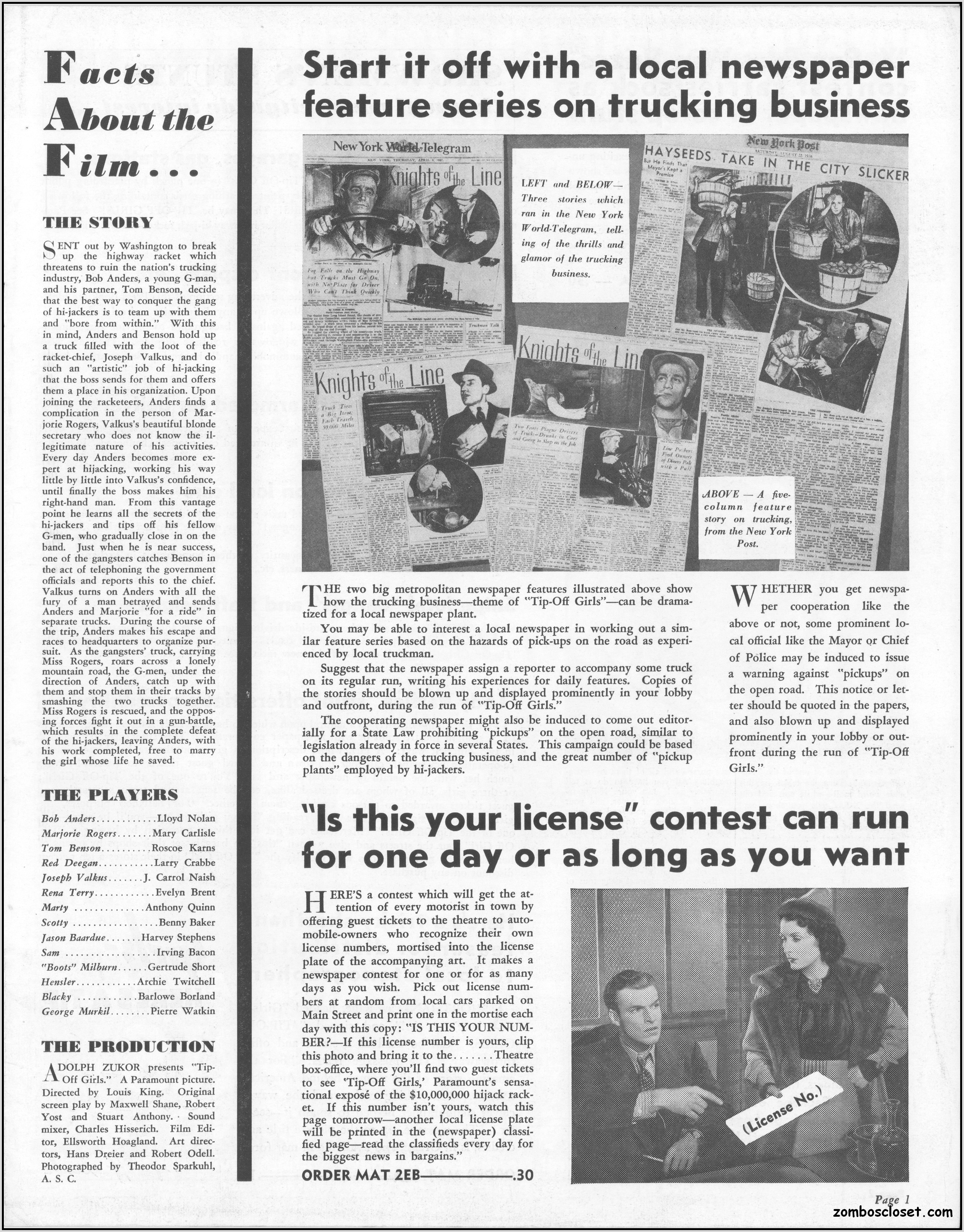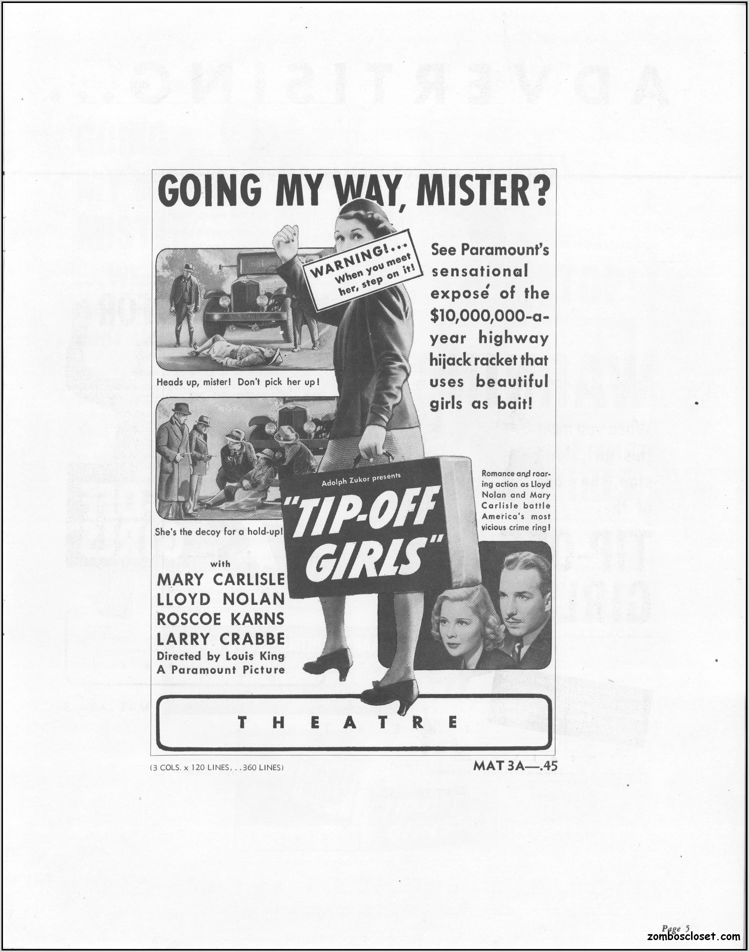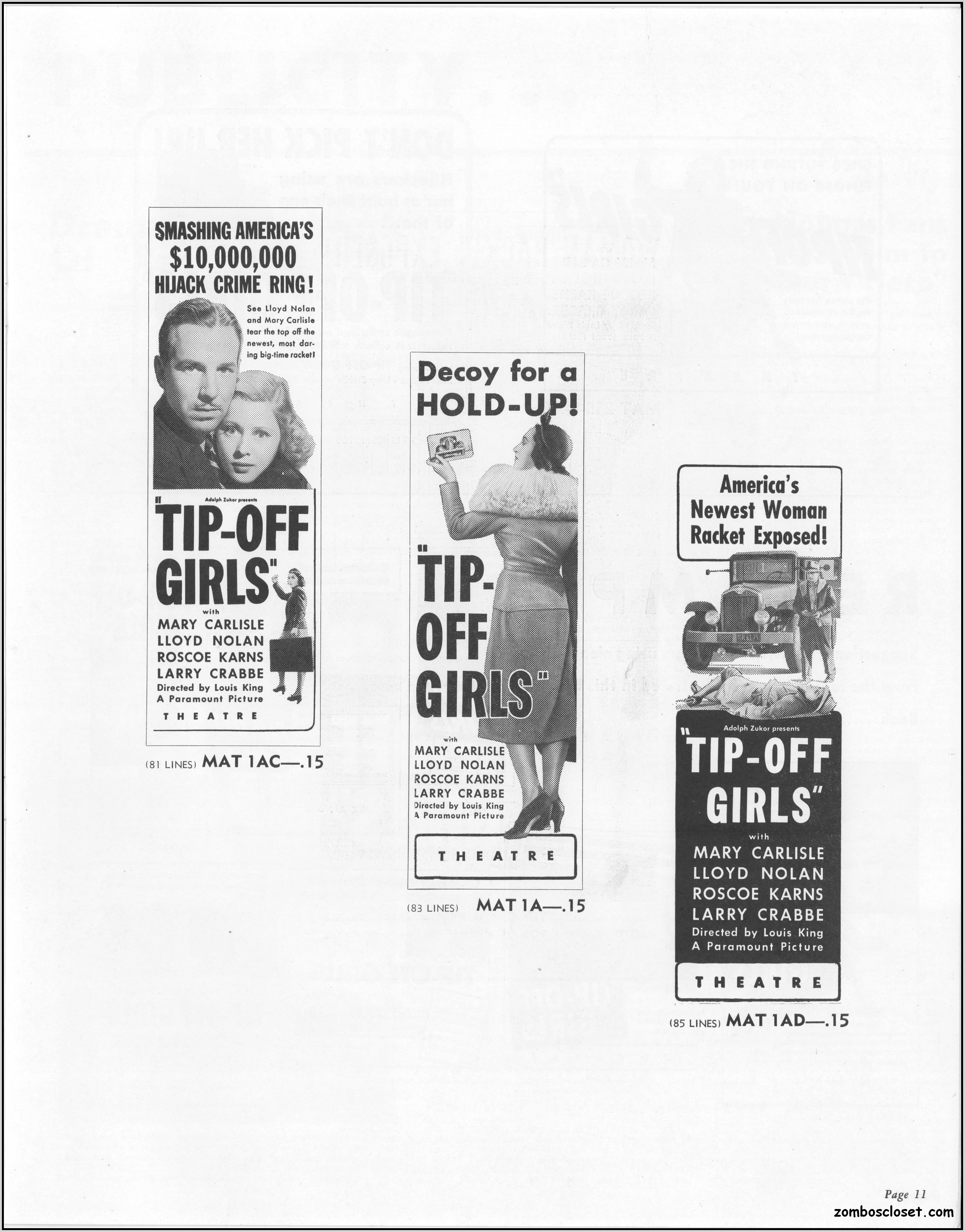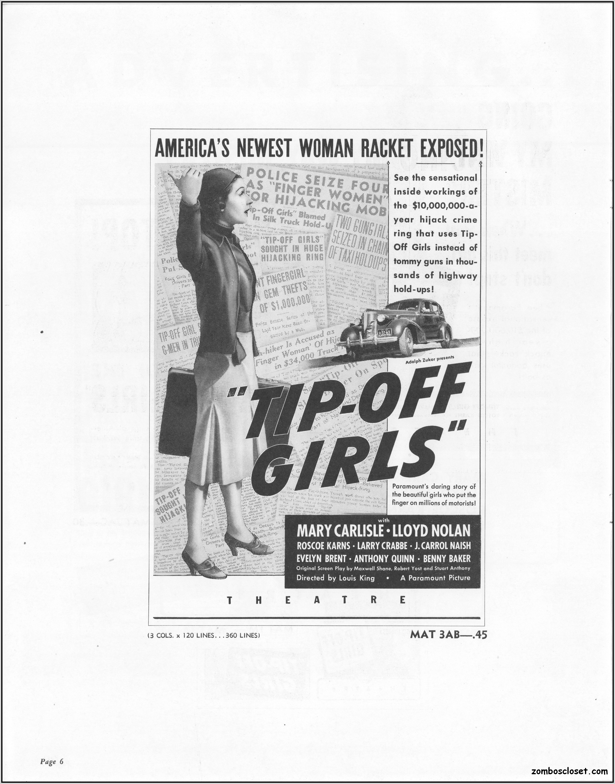 One does not live by horror movies alone. Sometimes a good crime melodrama, noir, western, fantasy, science fiction, guy movie, girl movie, kid movie, or documentary will do. This time around it's crime! The reason I found this pressbook so interesting was its use of pink and blue tones, and the fact that I like crime movies from the 1930s to 1950s. This one boasts a good cast with Larry "Buster" Crabbe, Anthony Quinn, Lloyd Nolan, Evelyn Brent, Mary Carlisle, and J. Carol Naish. The premise is bad girls helping rob trucks of their cargo. Shame on them!