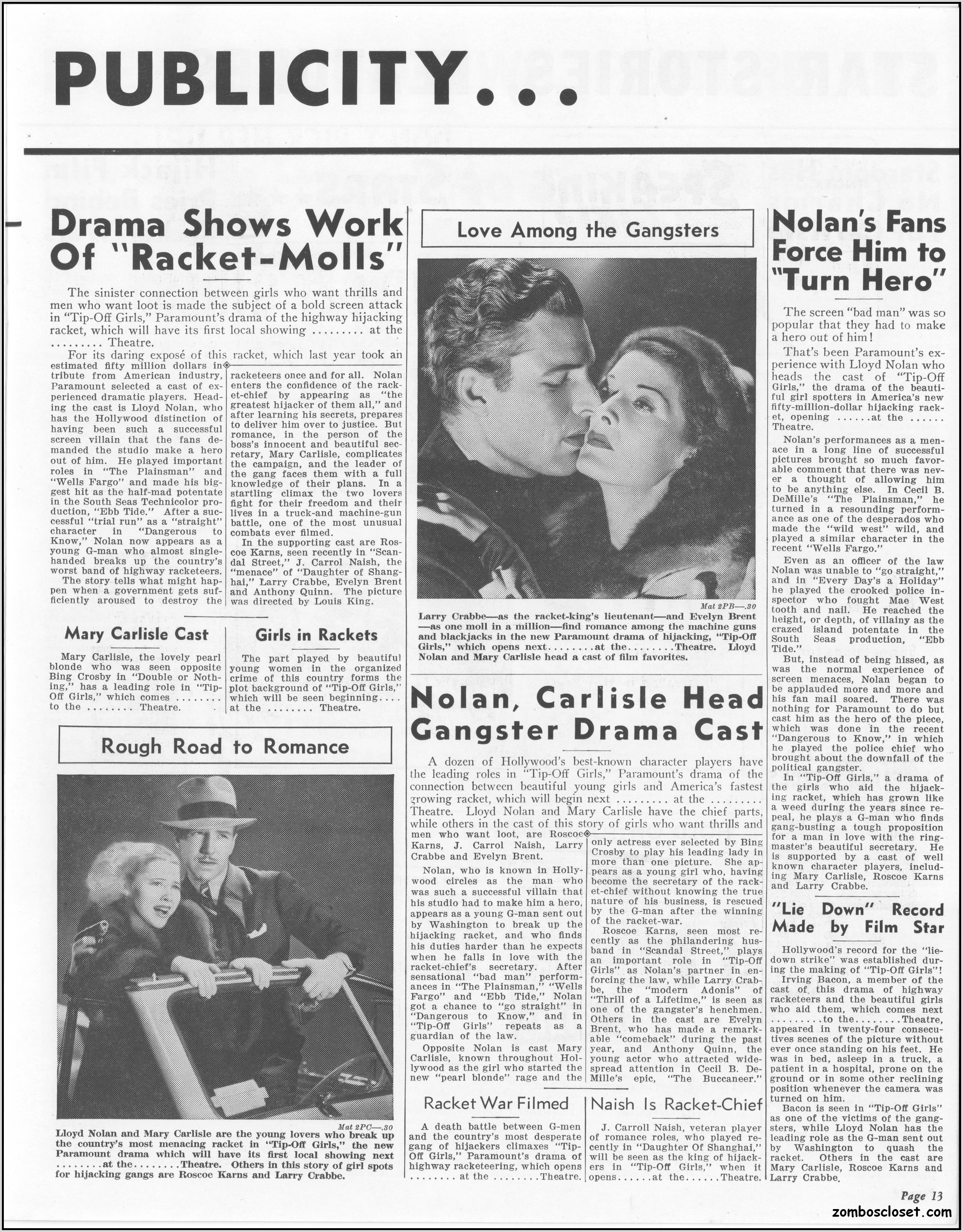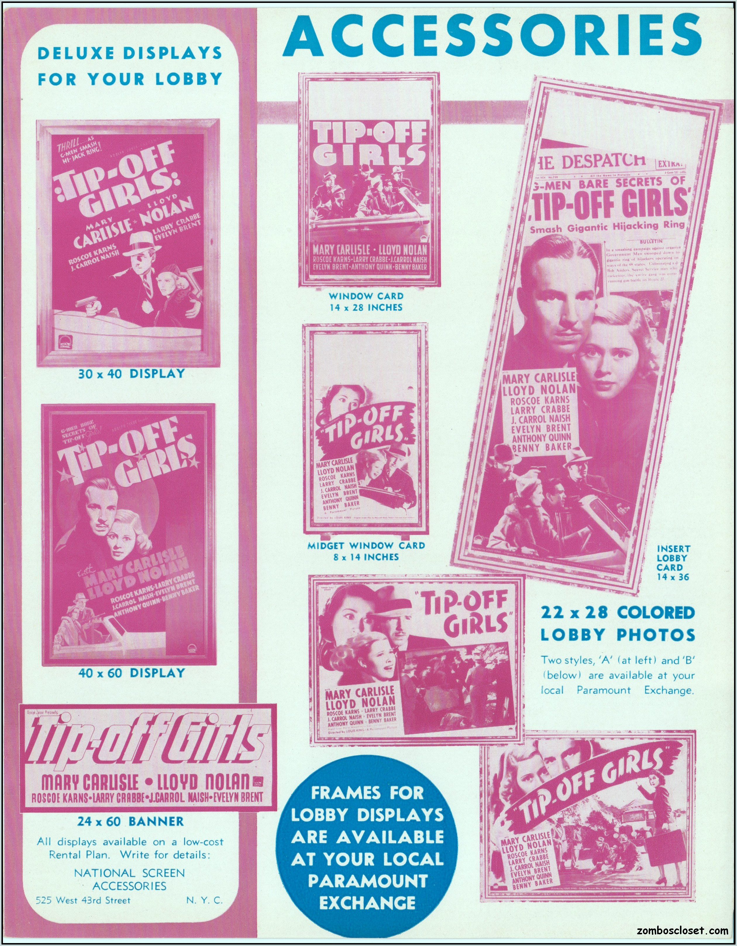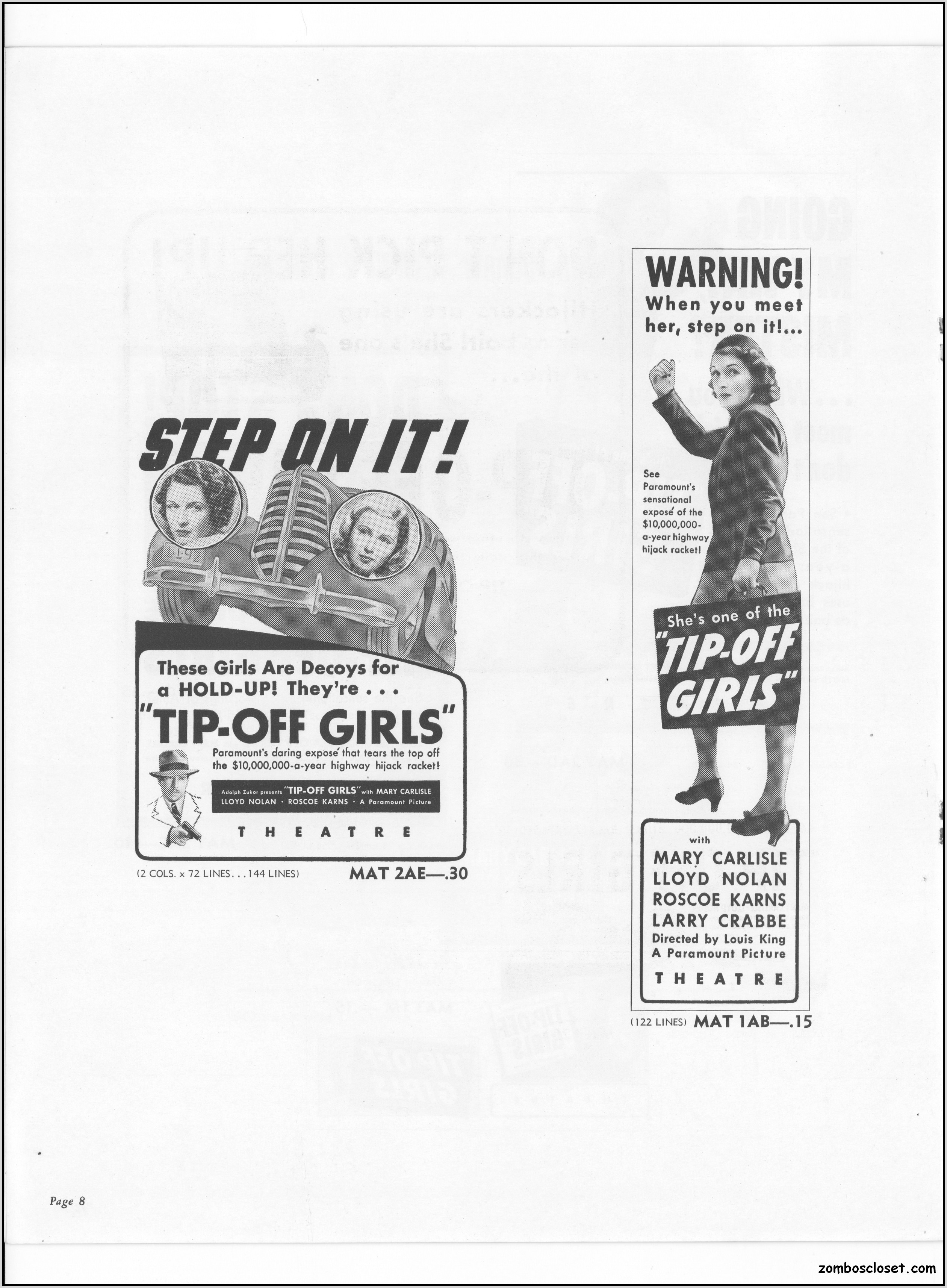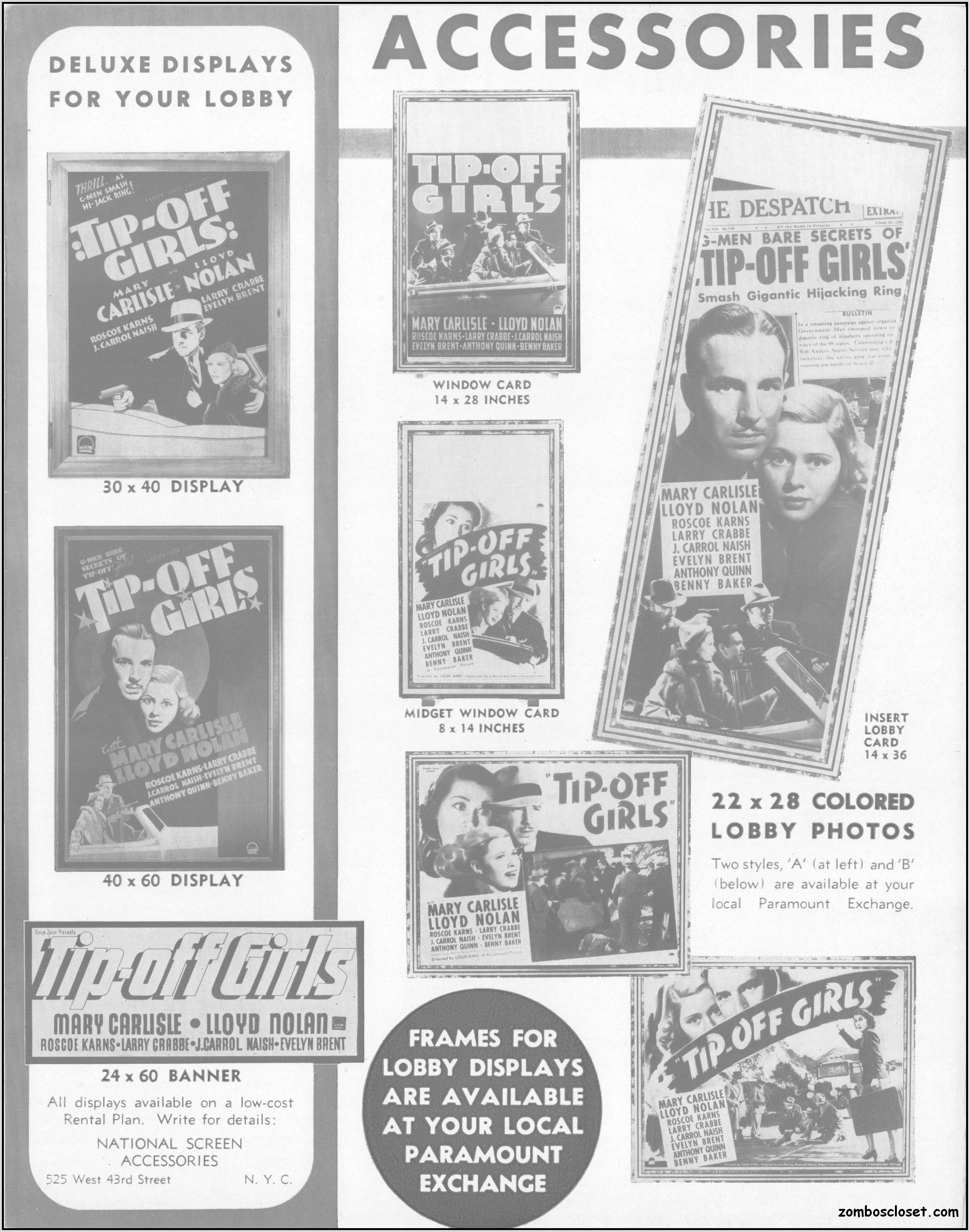 One does not live by horror movies alone. Sometimes a good crime melodrama, noir, western, fantasy, science fiction, guy movie, girl movie, kid movie, or documentary will do. This time around it's crime! The reason I found this pressbook so interesting was its use of pink and blue tones, and the fact that I like crime movies from the 1930s to 1950s. This one boasts a good cast with Larry "Buster" Crabbe, Anthony Quinn, Lloyd Nolan, Evelyn Brent, Mary Carlisle, and J. Carol Naish. The premise is bad girls helping rob trucks of their cargo. Shame on them!
