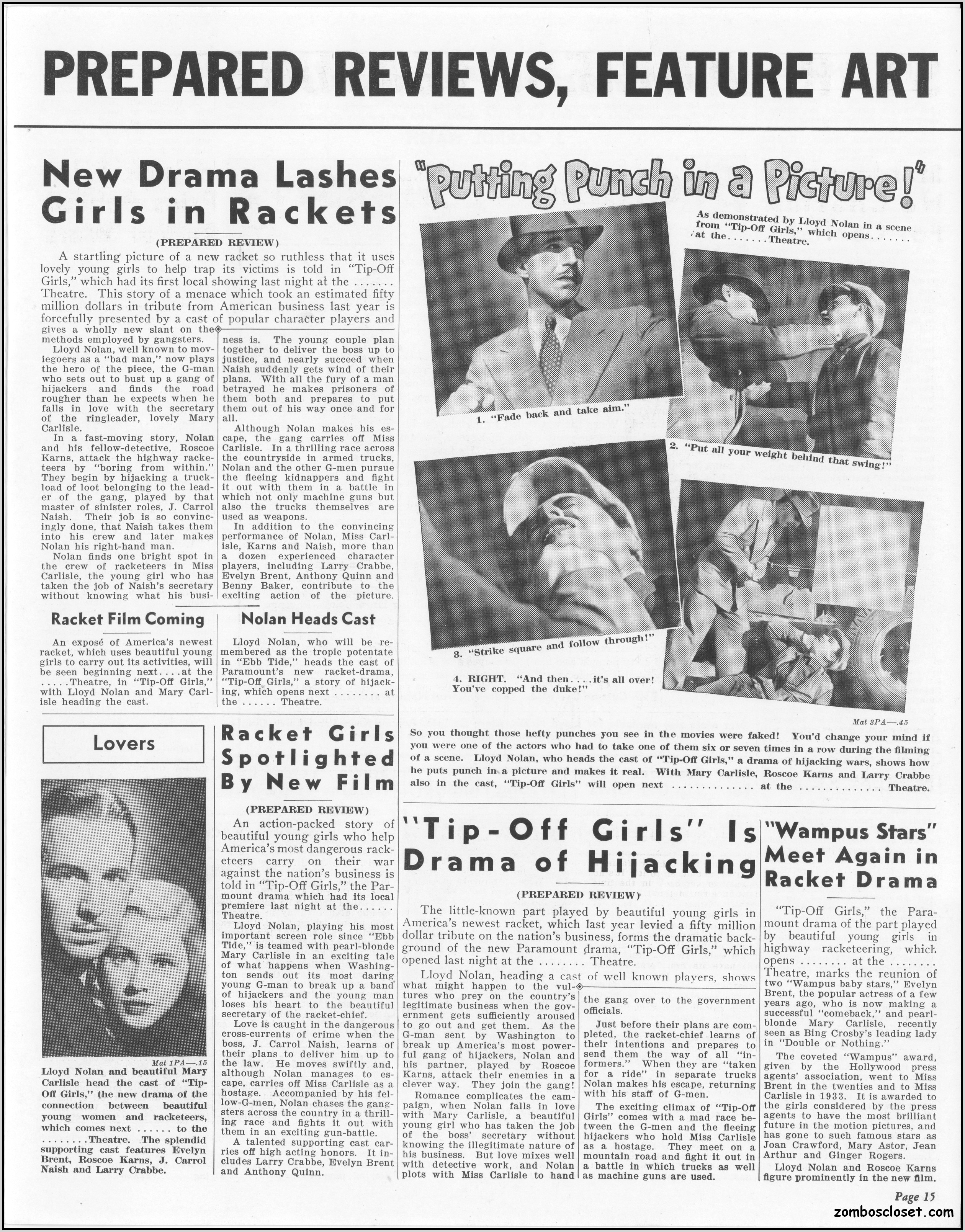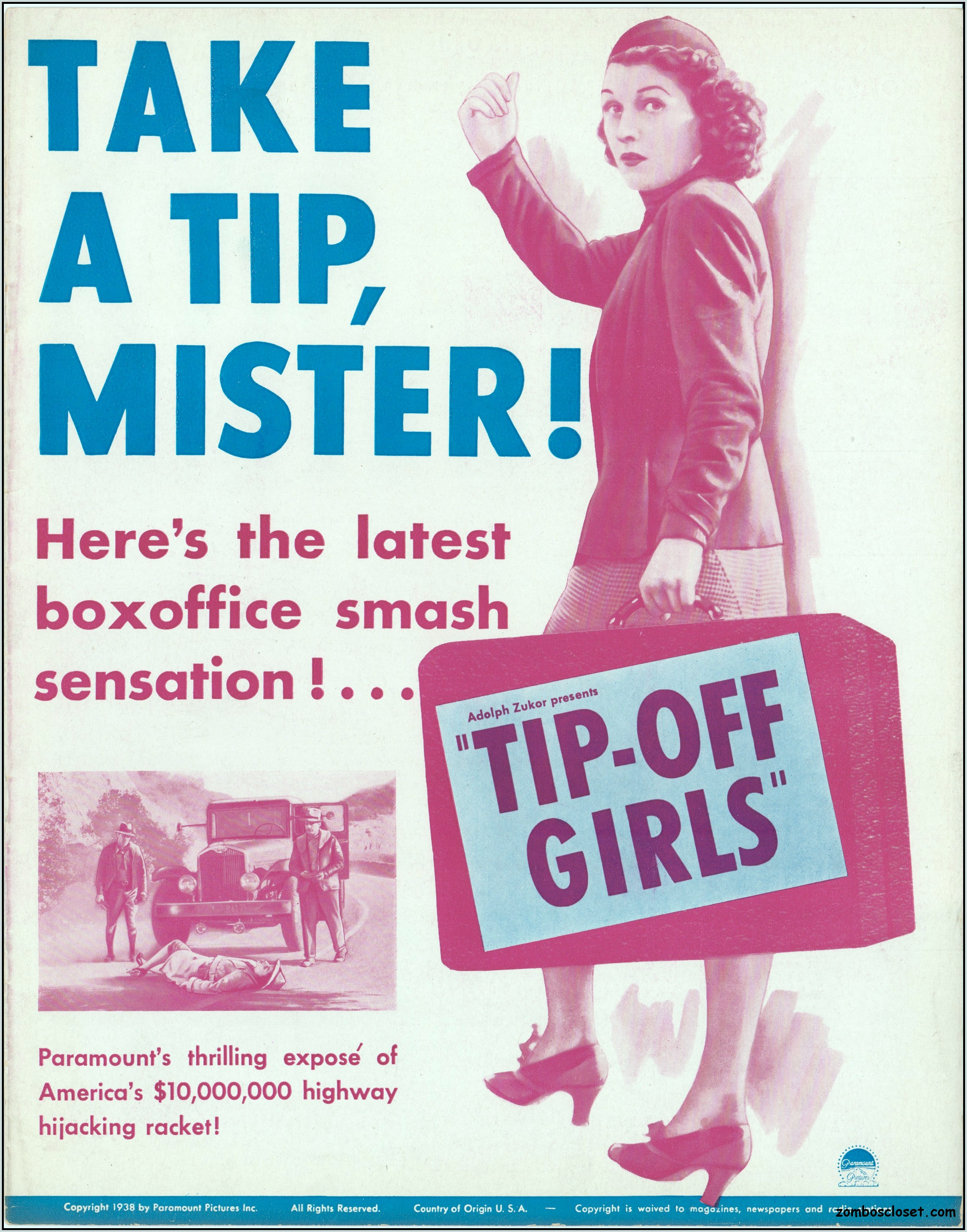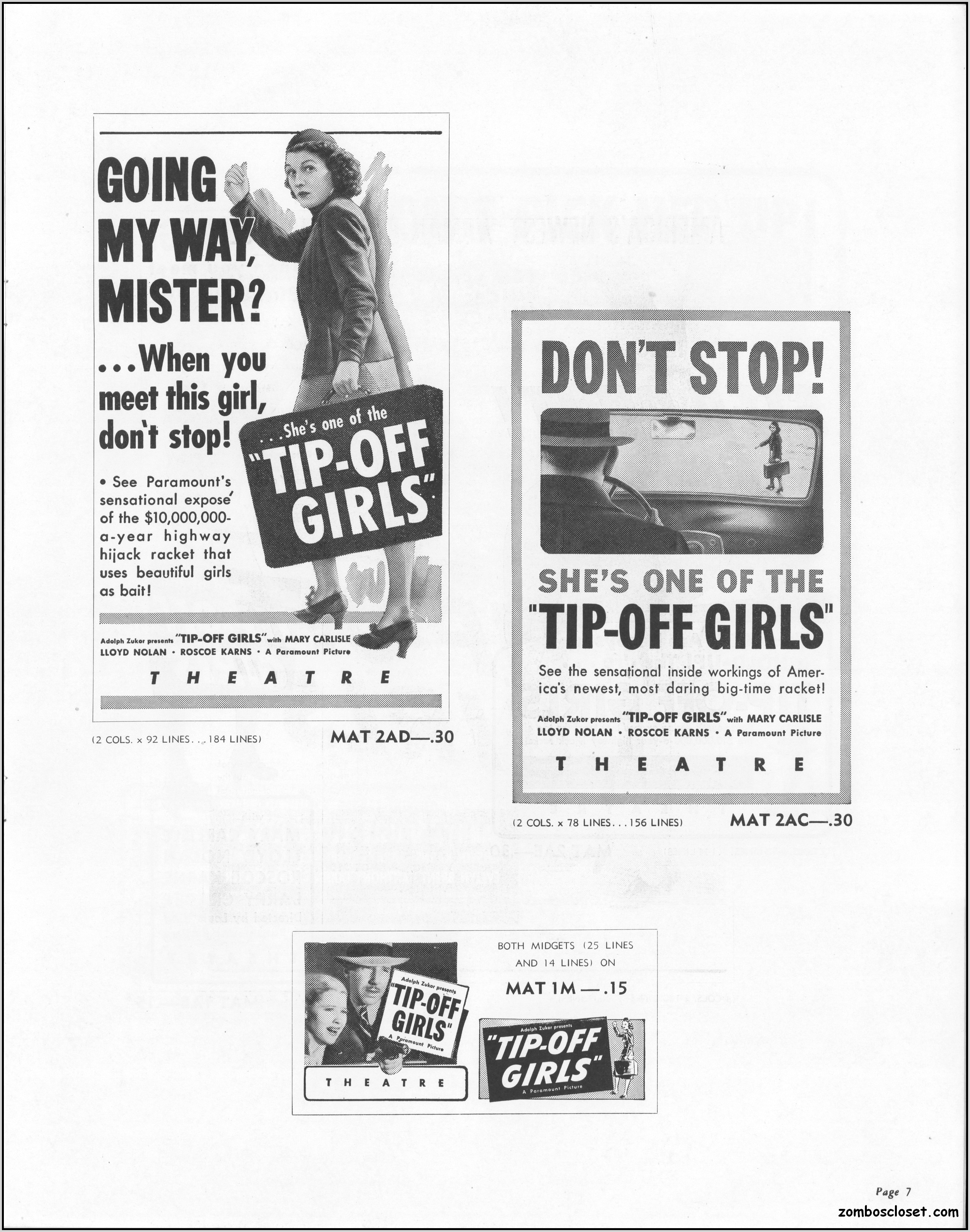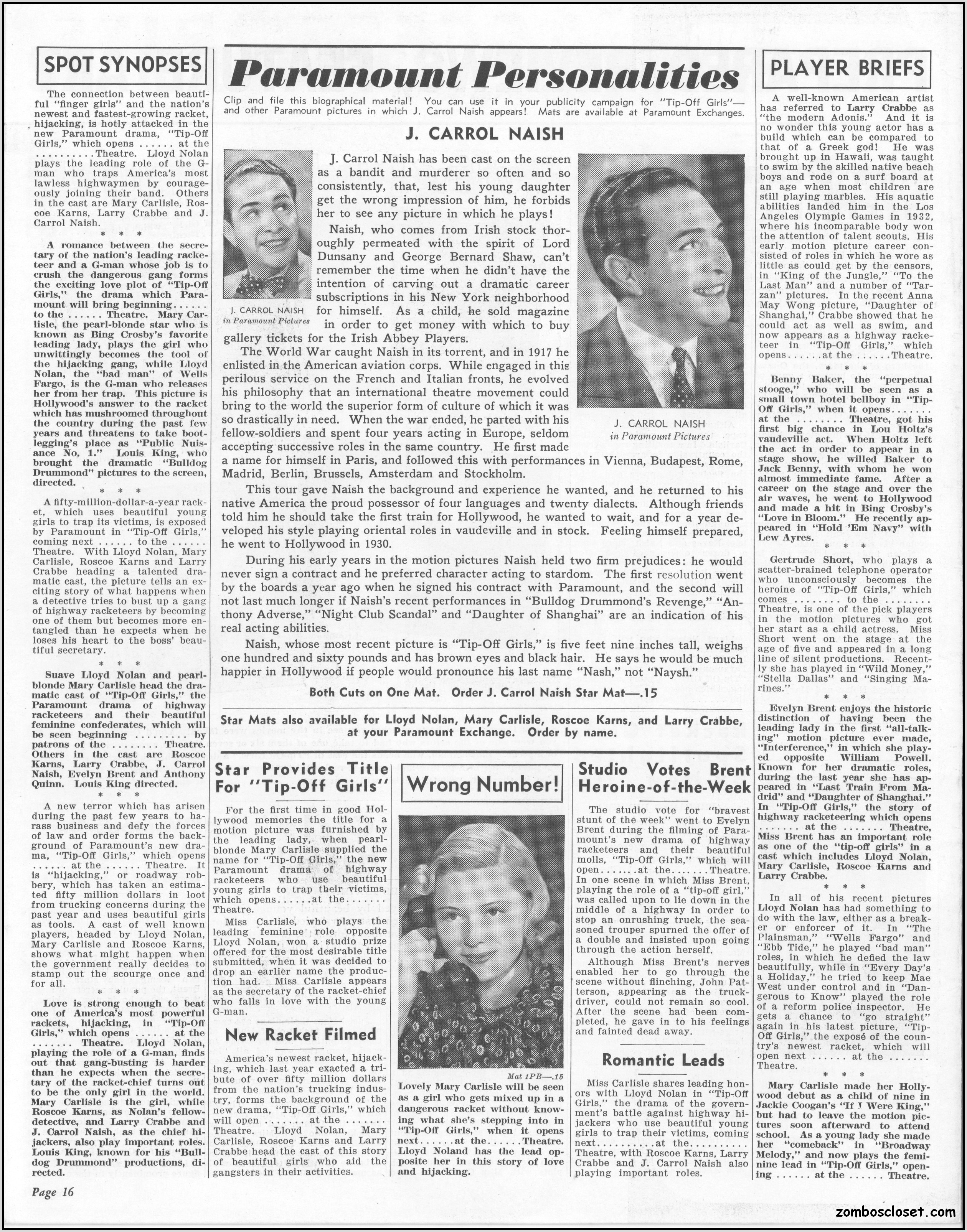 One does not live by horror movies alone. Sometimes a good crime melodrama, noir, western, fantasy, science fiction, guy movie, girl movie, kid movie, or documentary will do. This time around it's crime! The reason I found this pressbook so interesting was its use of pink and blue tones, and the fact that I like crime movies from the 1930s to 1950s. This one boasts a good cast with Larry "Buster" Crabbe, Anthony Quinn, Lloyd Nolan, Evelyn Brent, Mary Carlisle, and J. Carol Naish. The premise is bad girls helping rob trucks of their cargo. Shame on them!