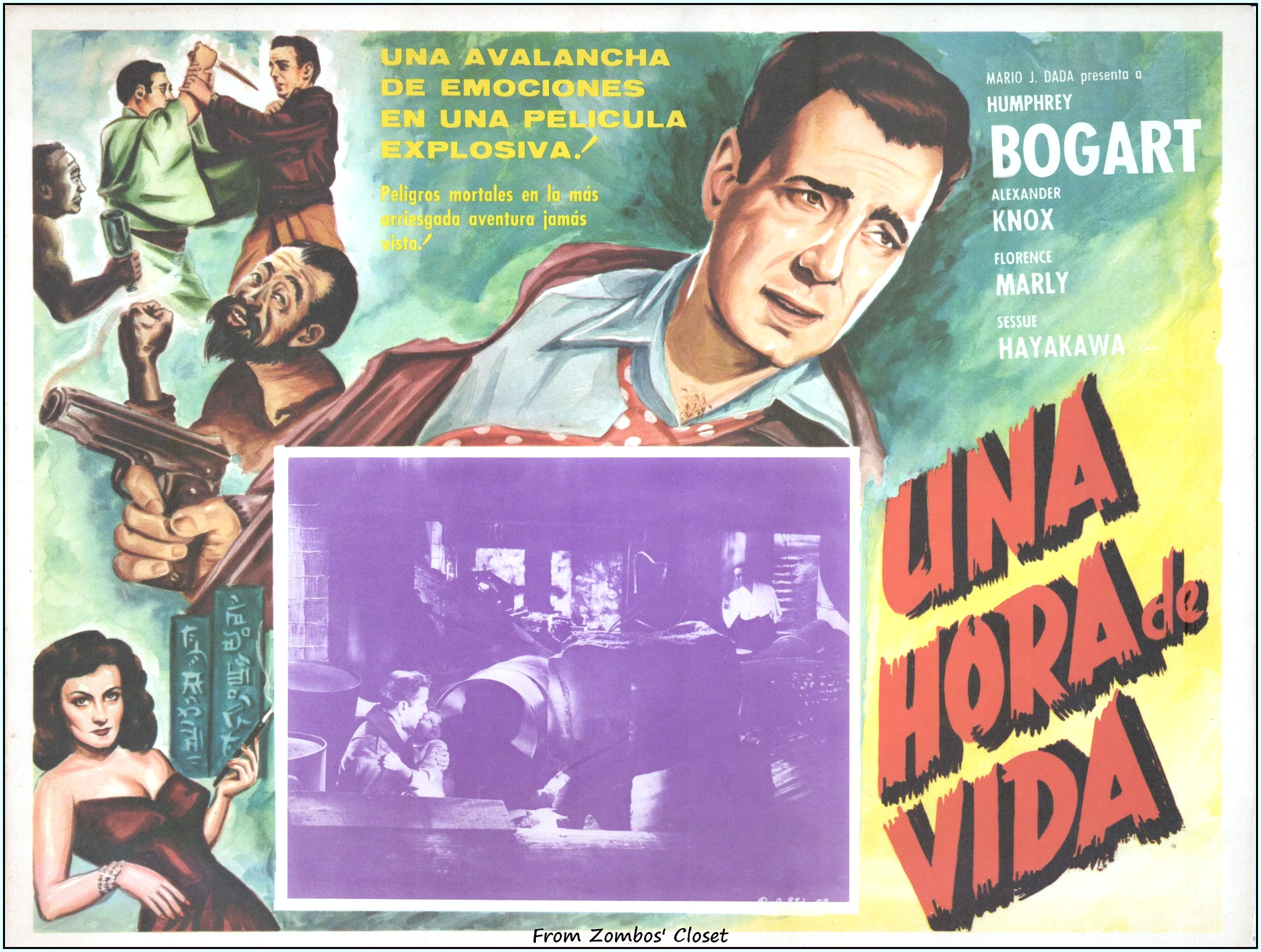Not to be confused with 1950’s Una Hora de Vida, this Mexican lobby card is for Tokyo Joe with Humphrey Bogart. His shirt is unbuttoned and his gun is ready for action in this small but intriguing movie entry. Bogart could play the super tough guy like Sam Spade or the everyman–or average Joe–depending on the script. This movie was the first to be filmed in post-war Japan (ah, those wonderful TCM notes), and the second unit director, Arthur Black, had quite a time of it on location. Between a week’s rain delaying shooting and the army supplying a different “Bogart” every day, he had to make due as best he could. Sessue Hayakawa’s return to the screen had him as the menacing villain.