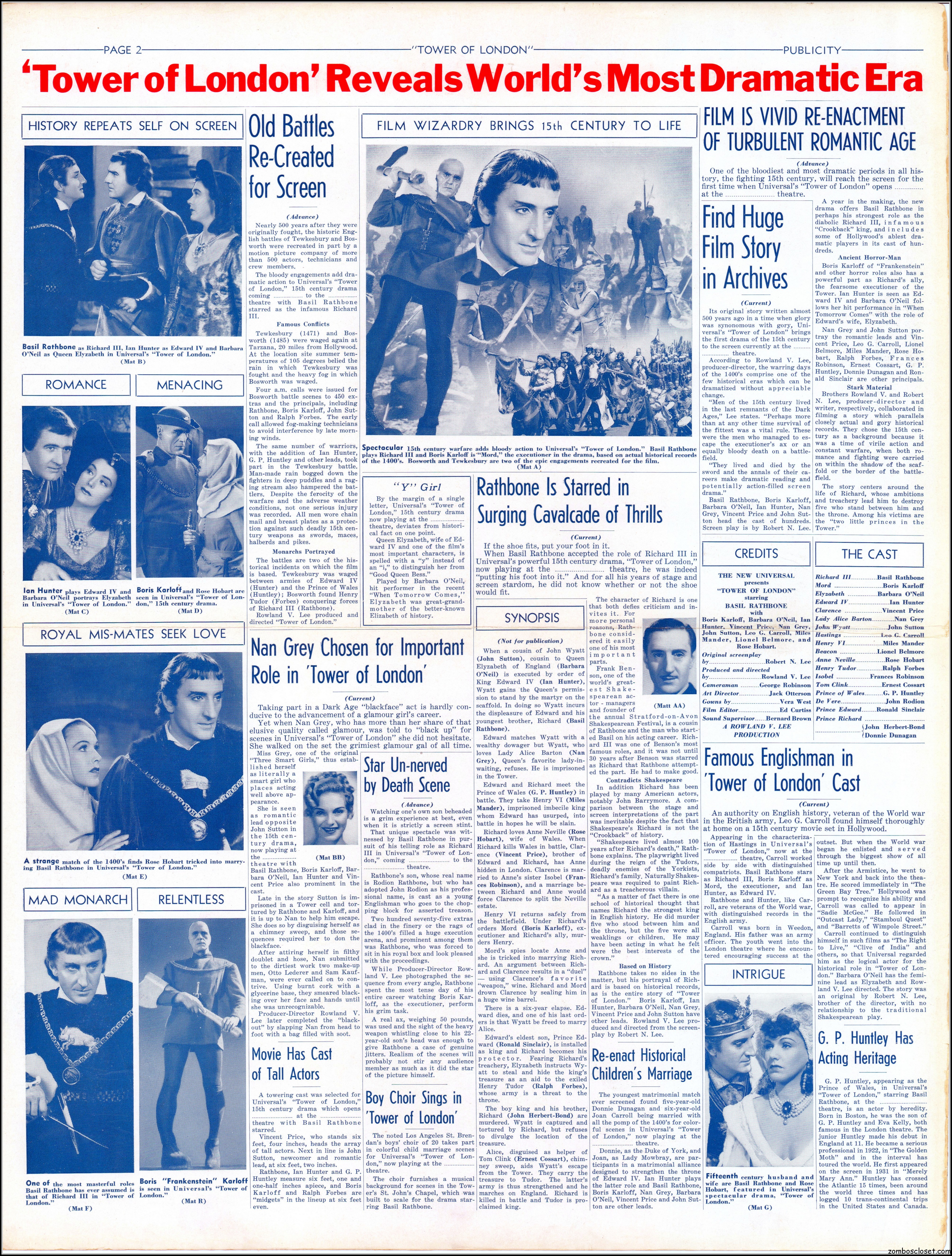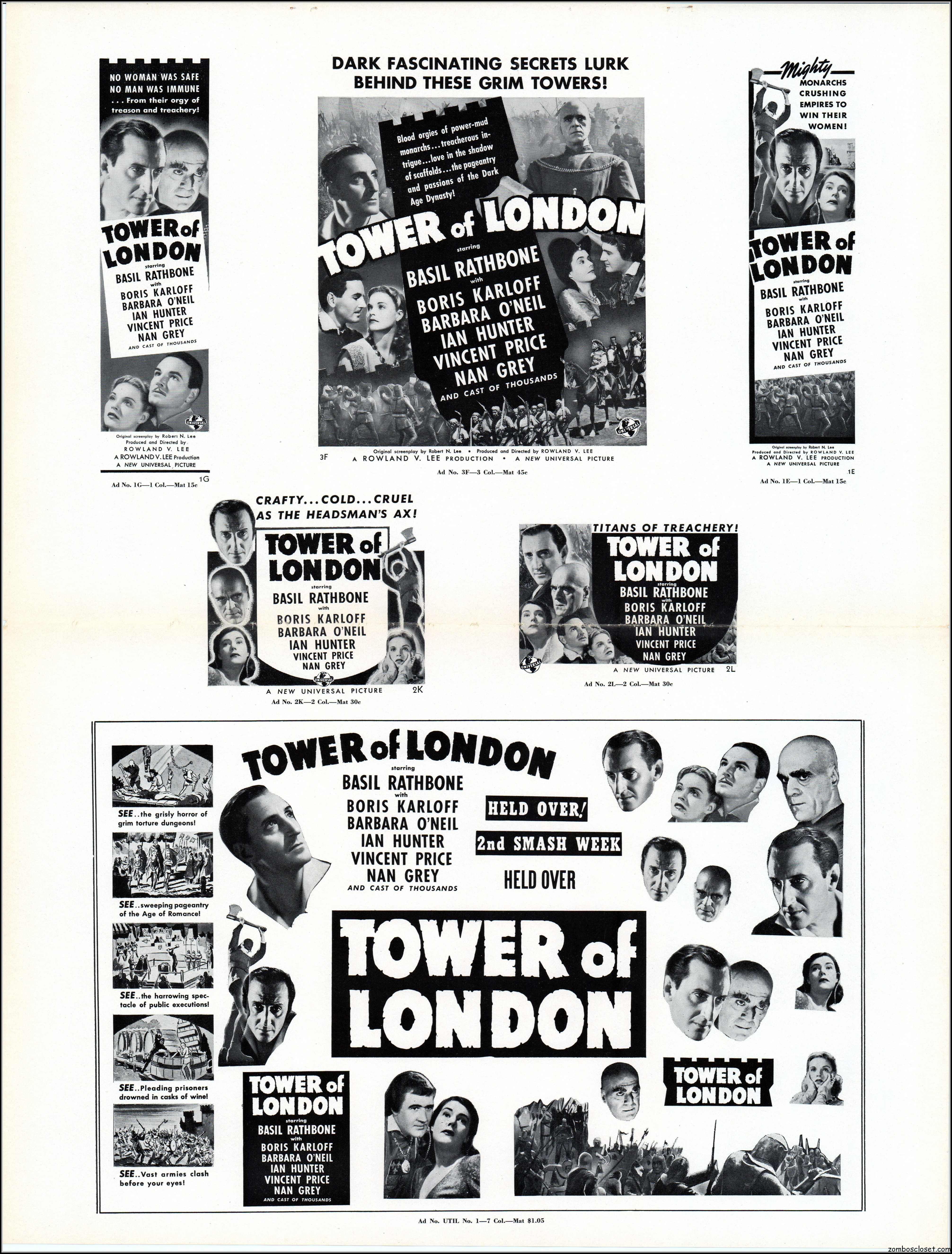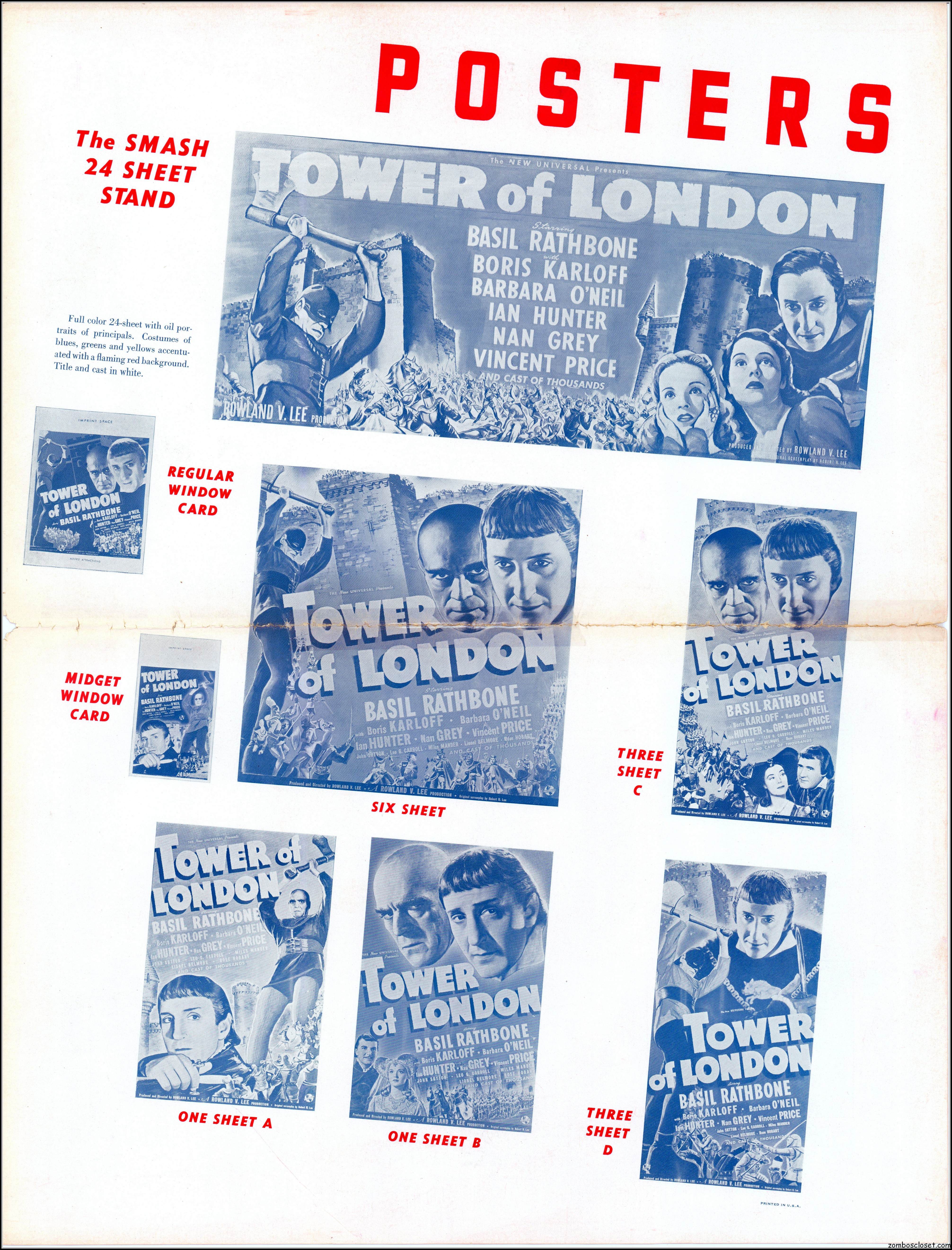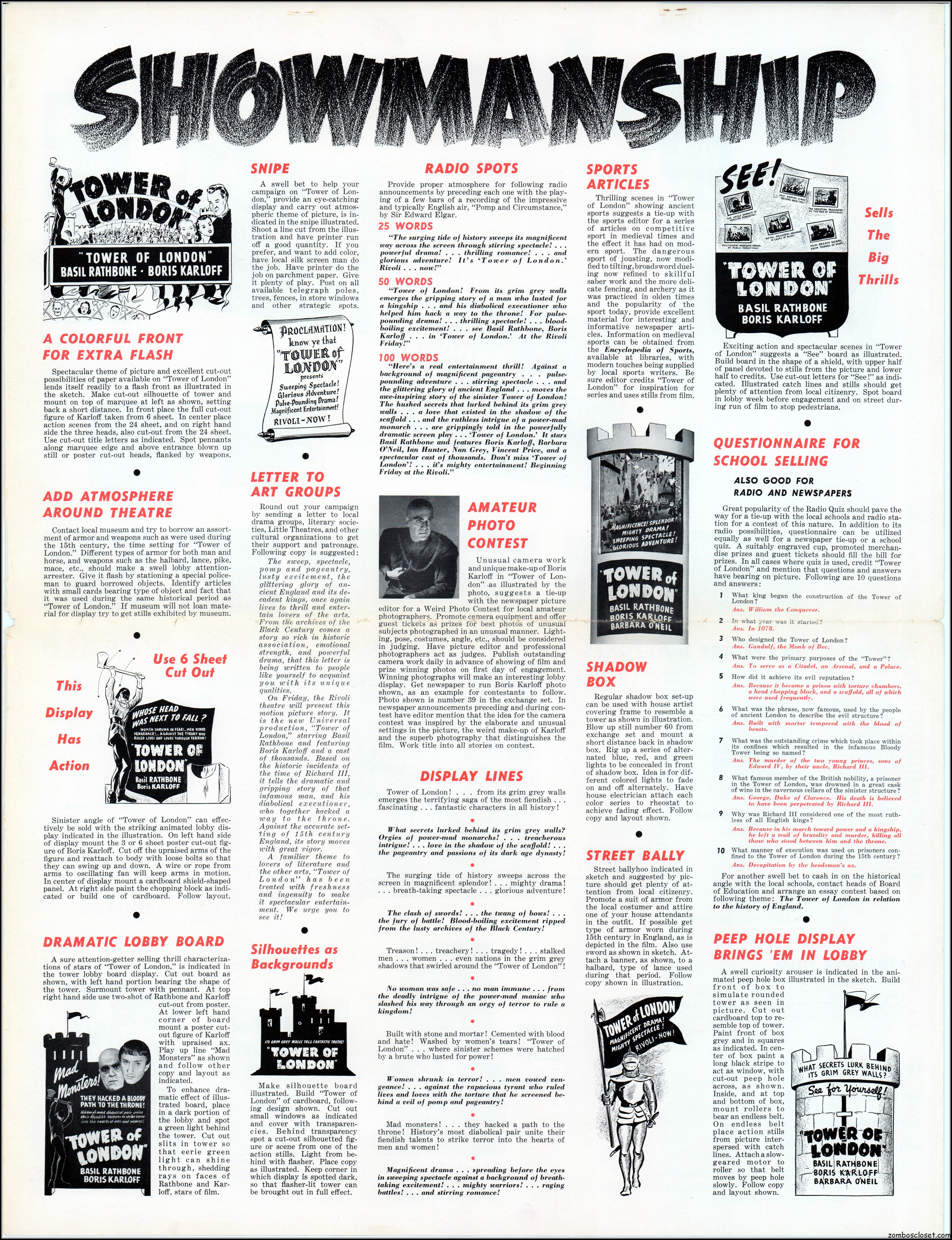 Here’s another rare pressbook: Tower of London with Boris Karloff and Basil Rathbone. A wild and wonderful 17.5 x 23 inches when opened to read. I’m not sure if any pages are missing as I found this one in loose sheets. But what’s here is still stellar. Aside from the auctions selling the covers alone, this original release pressbook has not been shown before. You lucky devils. Universal really overdid themselves with this one. The Showmanship page lists really cool theater lobby promos. You will need a big screen to view this beauty in all its glory.