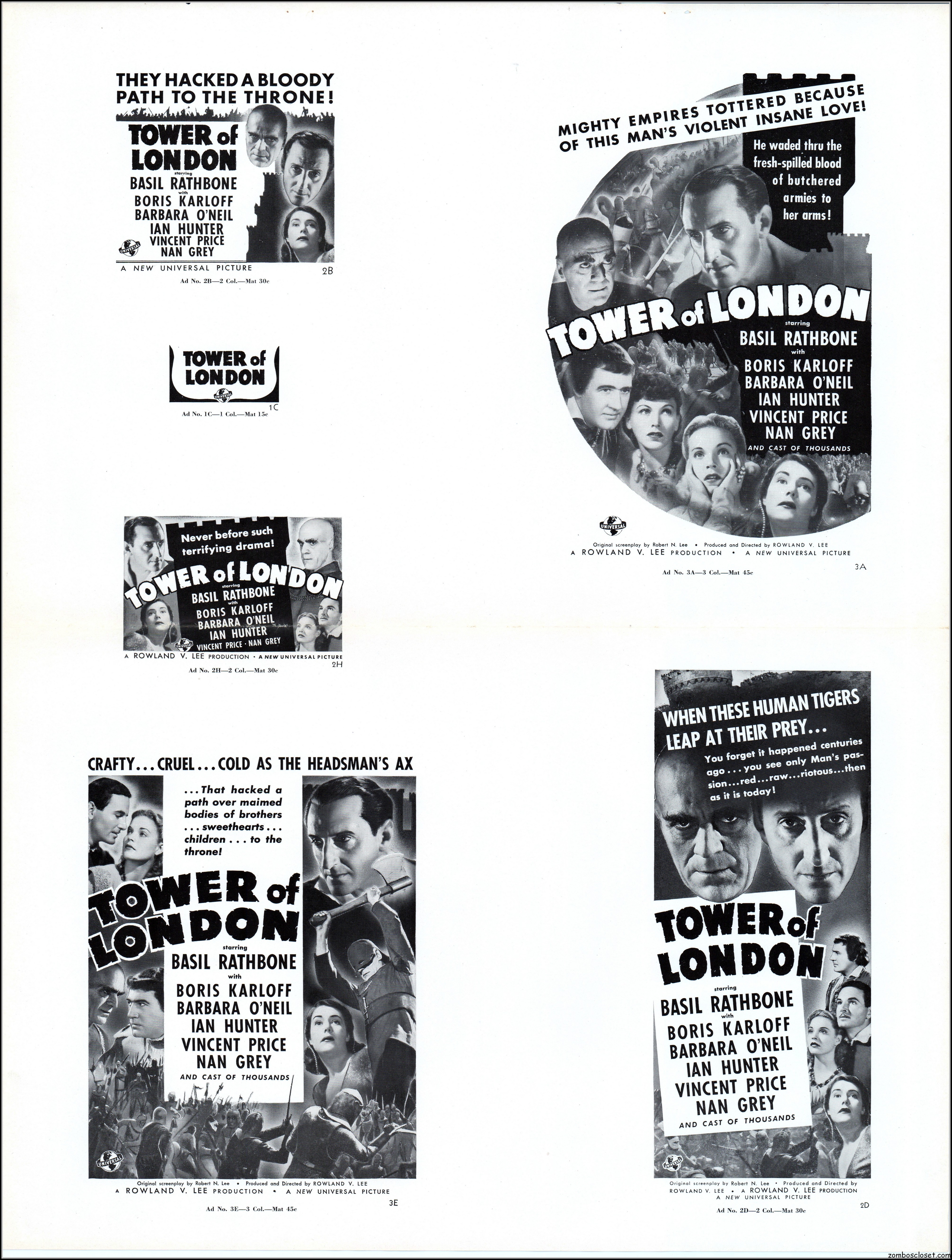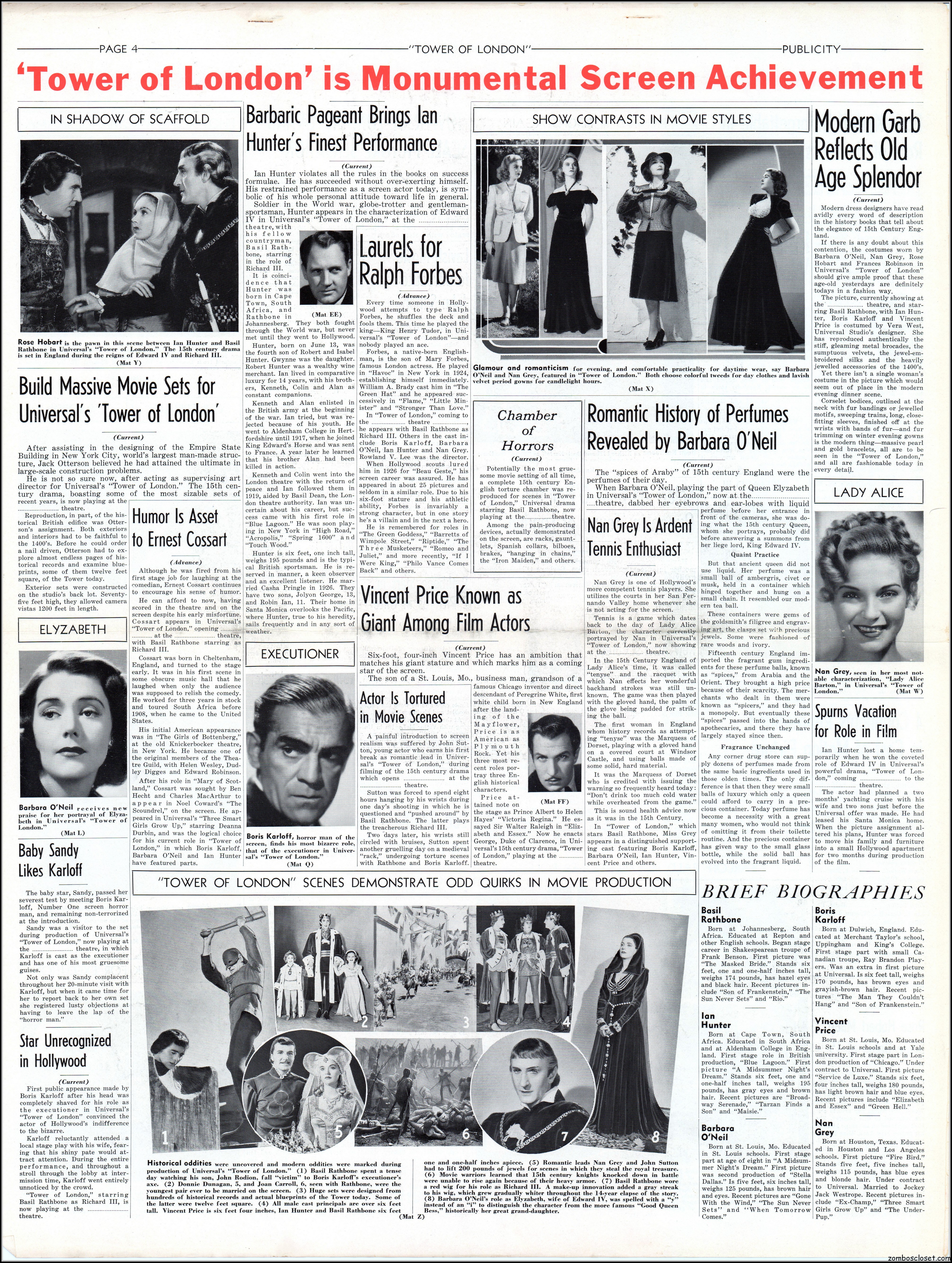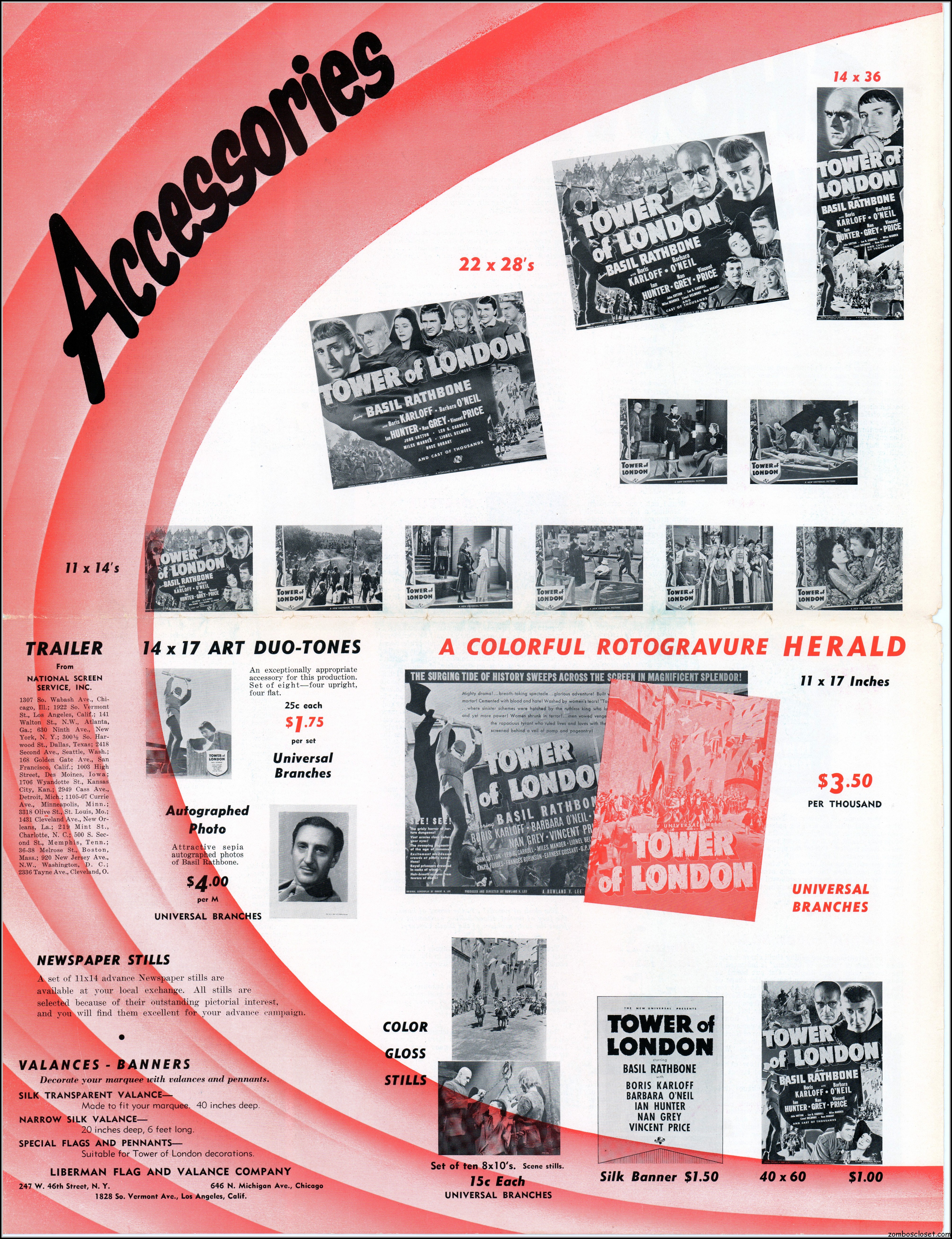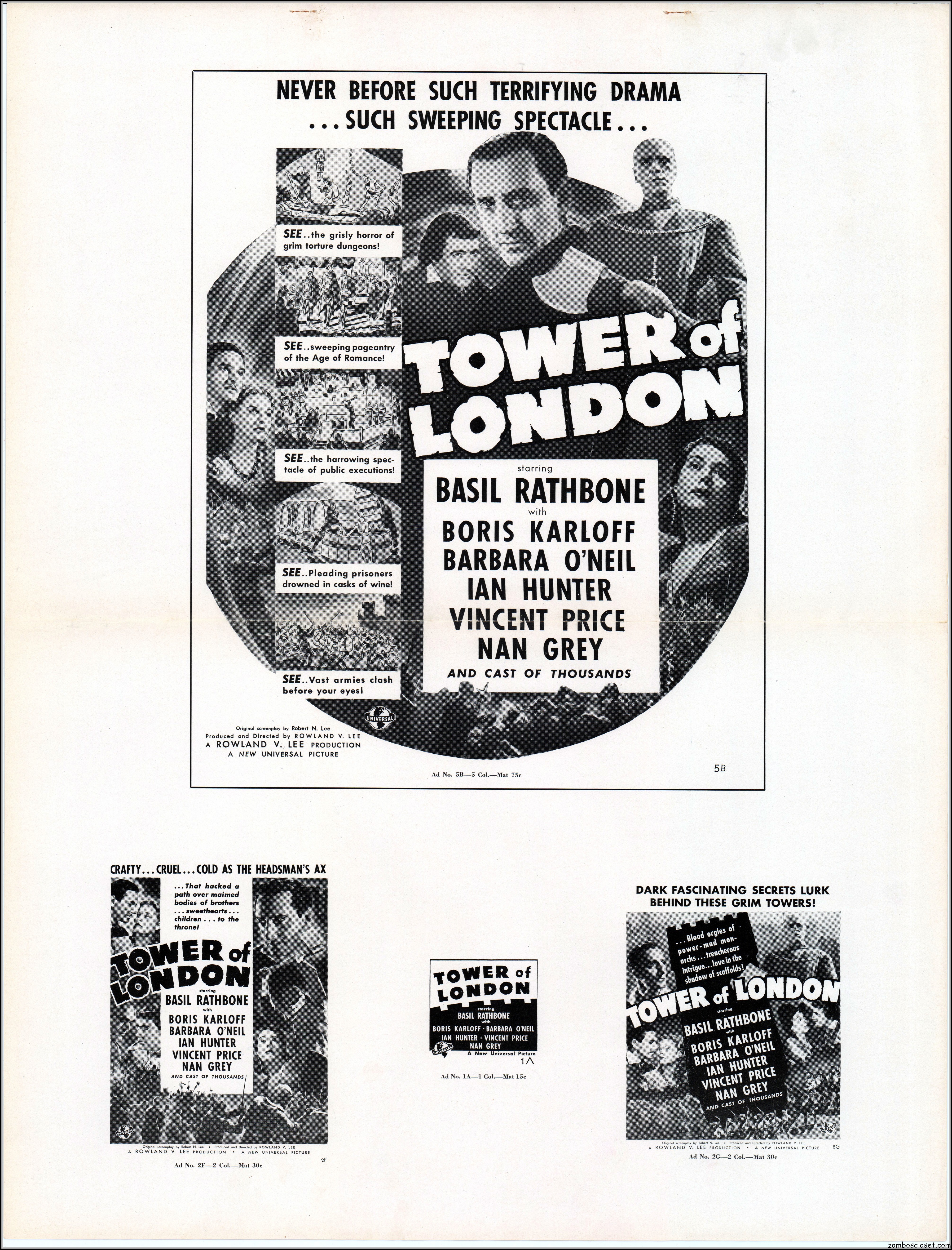 Here’s another rare pressbook: Tower of London with Boris Karloff and Basil Rathbone. A wild and wonderful 17.5 x 23 inches when opened to read. I’m not sure if any pages are missing as I found this one in loose sheets. But what’s here is still stellar. Aside from the auctions selling the covers alone, this original release pressbook has not been shown before. You lucky devils. Universal really overdid themselves with this one. The Showmanship page lists really cool theater lobby promos. You will need a big screen to view this beauty in all its glory.