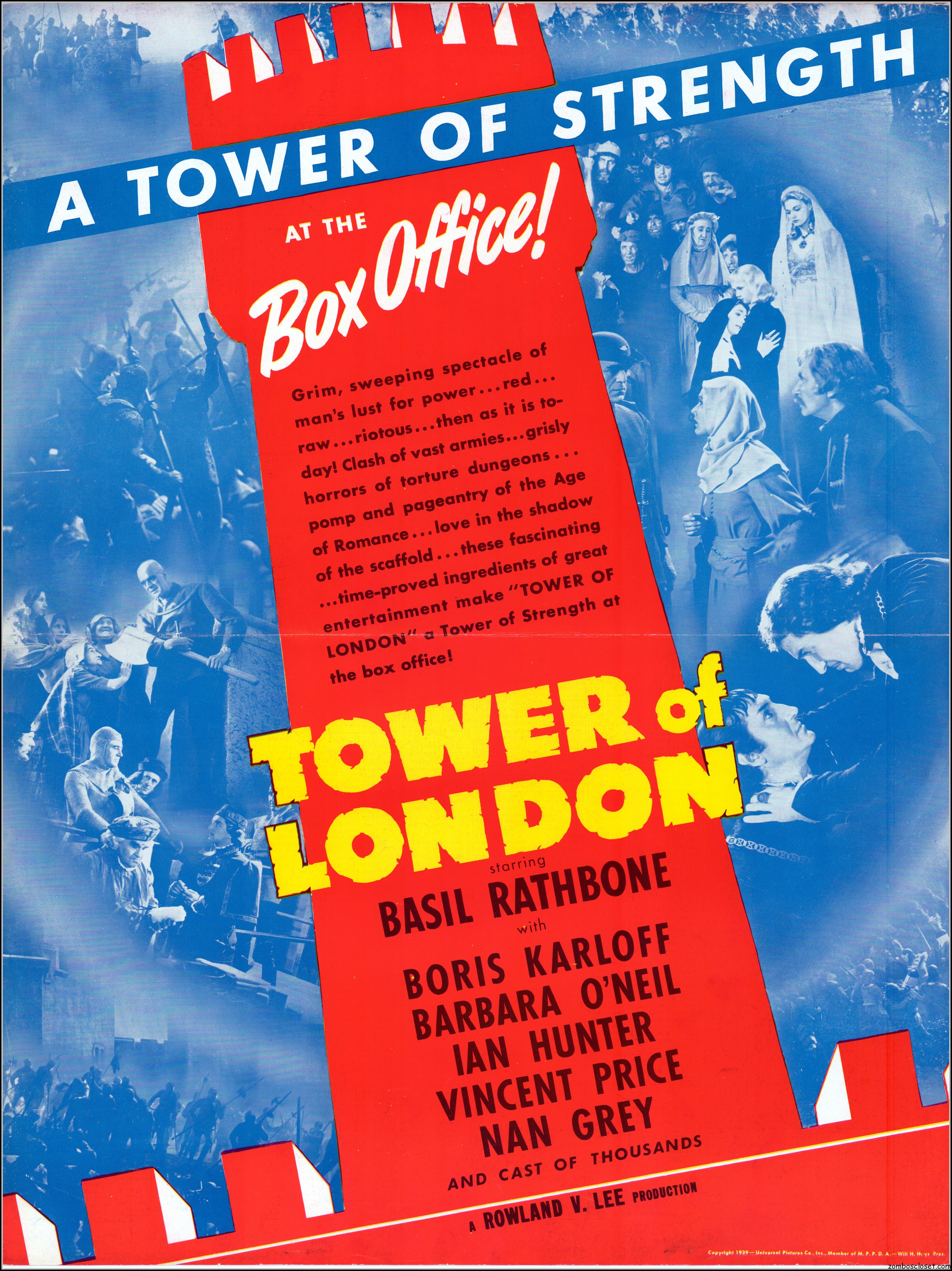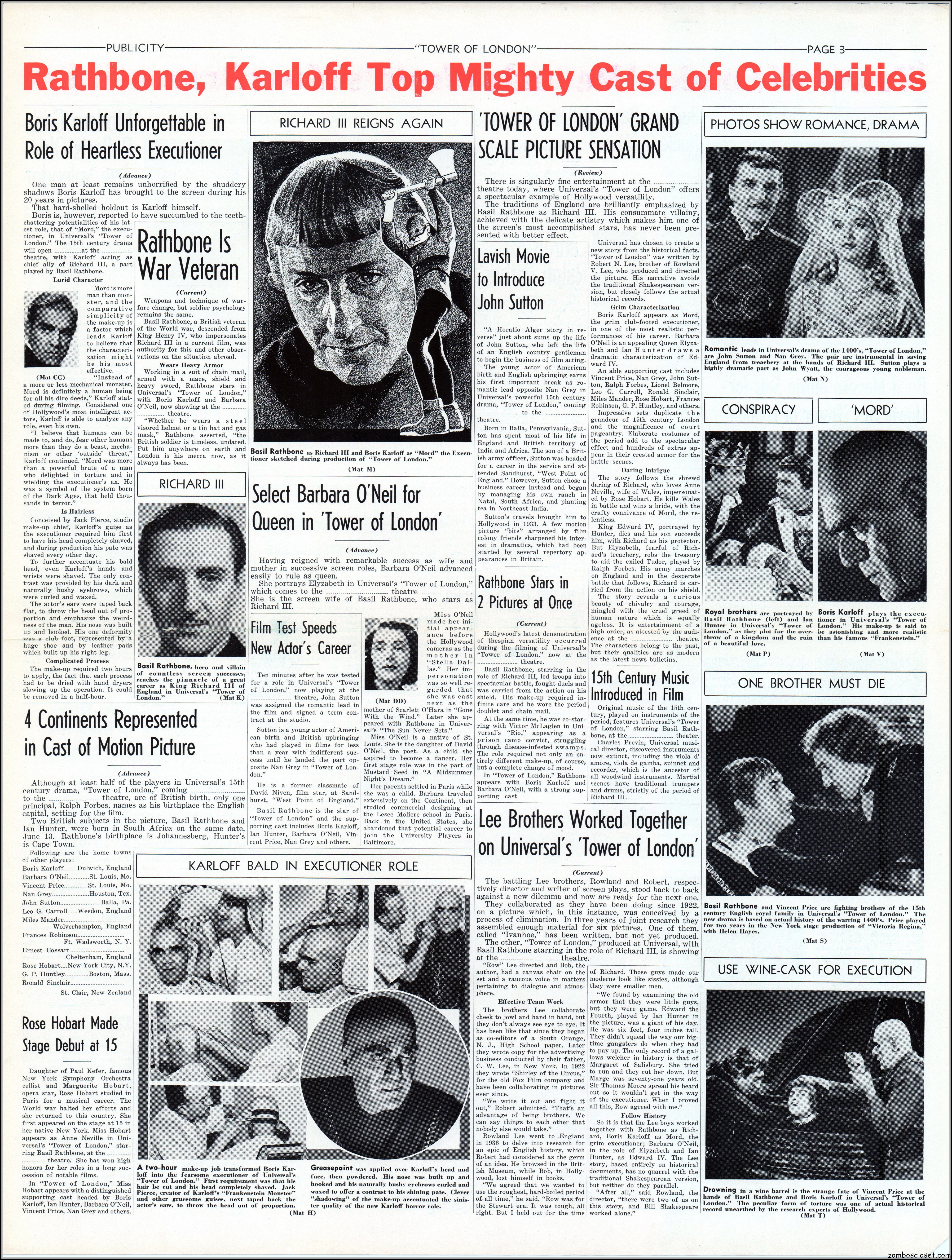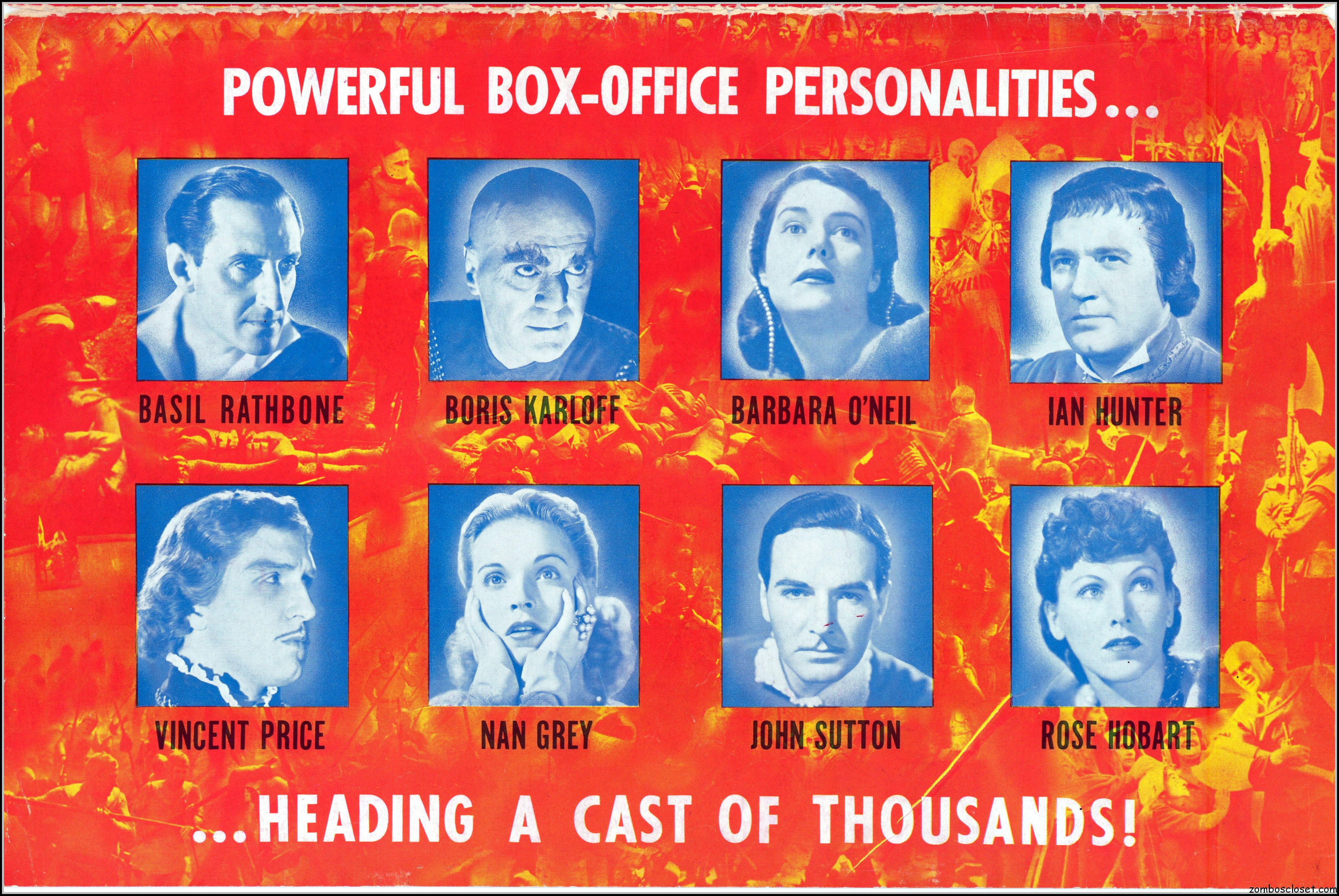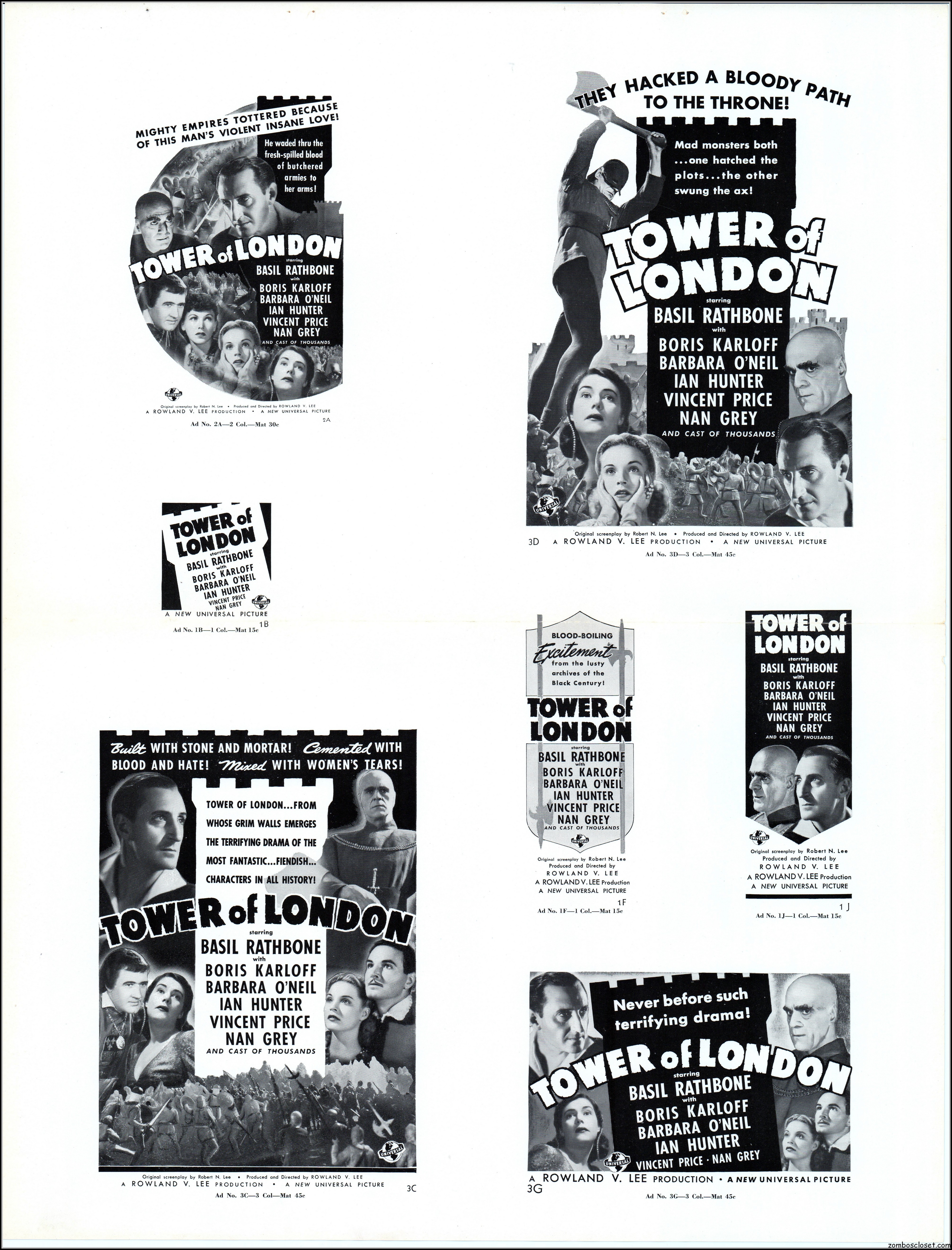 Here’s another rare pressbook: Tower of London with Boris Karloff and Basil Rathbone. A wild and wonderful 17.5 x 23 inches when opened to read. I’m not sure if any pages are missing as I found this one in loose sheets. But what’s here is still stellar. Aside from the auctions selling the covers alone, this original release pressbook has not been shown before. You lucky devils. Universal really overdid themselves with this one. The Showmanship page lists really cool theater lobby promos. You will need a big screen to view this beauty in all its glory.