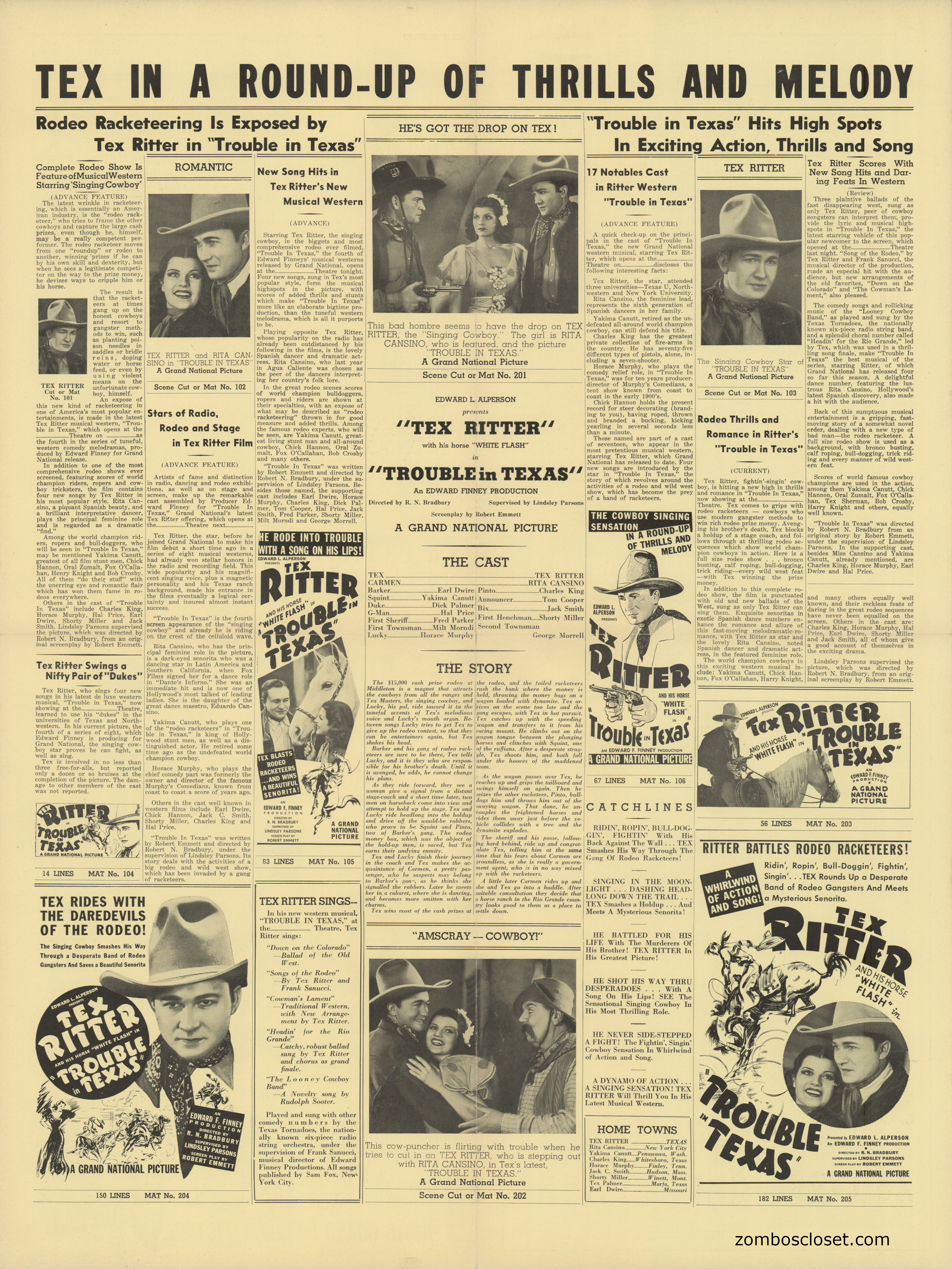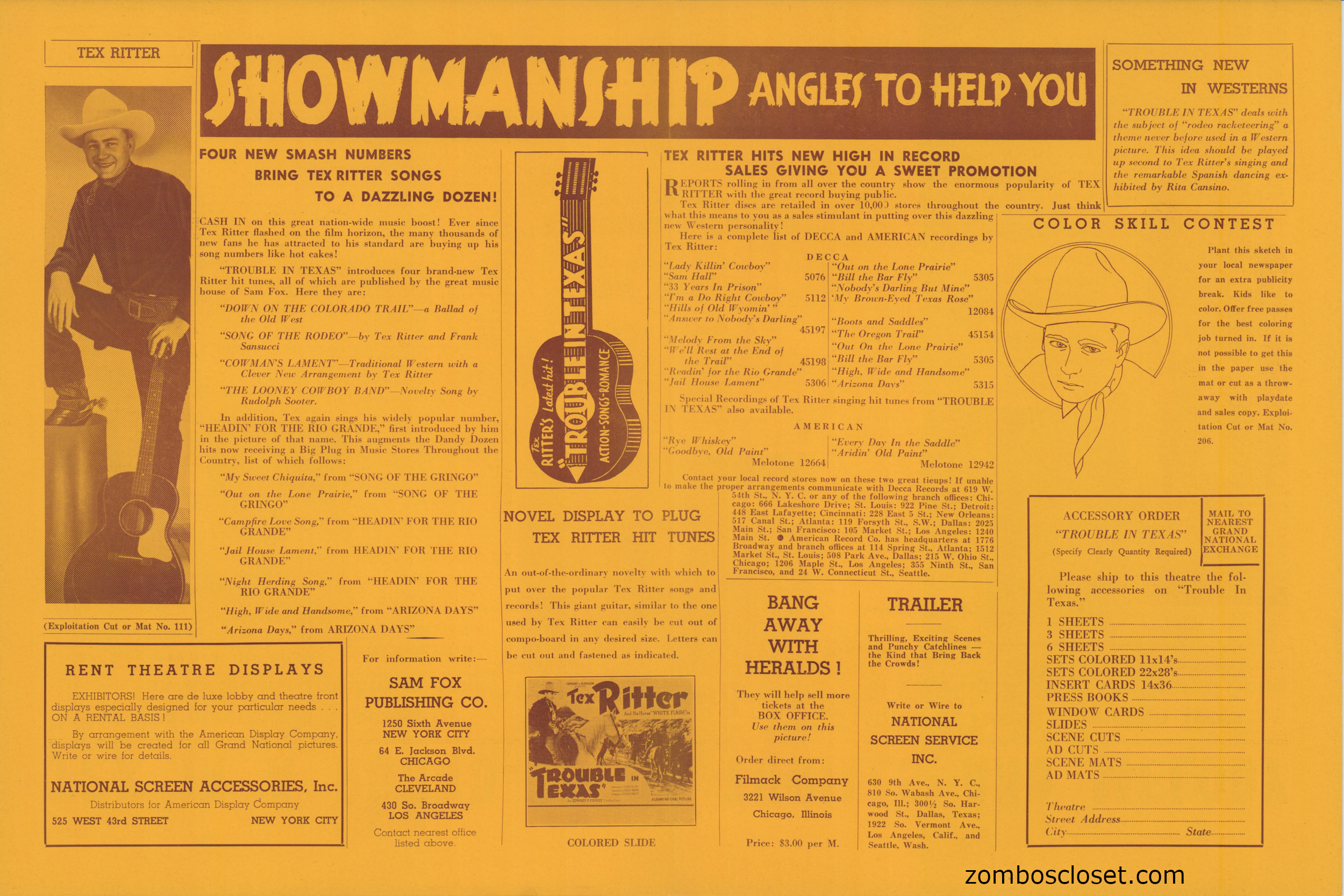 This pressbook is as big as Tex Ritter's hat, when unfolded to show the centerfold, all of 24 inches by 18 inches. The page color, except for the centerfold, is a bit eye-popping, but lots of showmanship can be found, especially around the songs. The singing cowboy was pretty big early on in Westerns, giving way to the more gritty realism (or outlandishness) of the American and Italian films that followed, beyond the 1930s and 1940s strumming cowpokes.